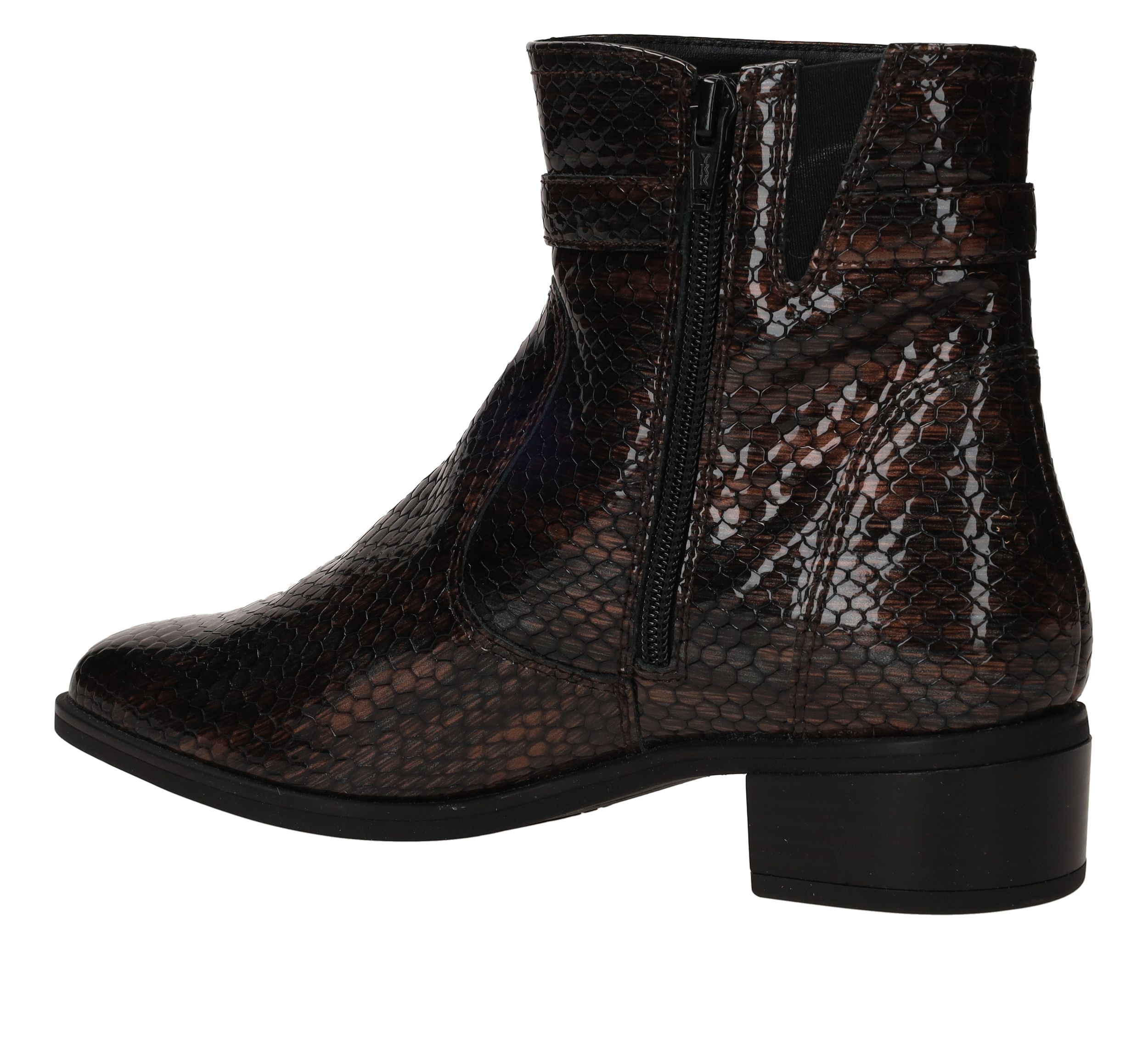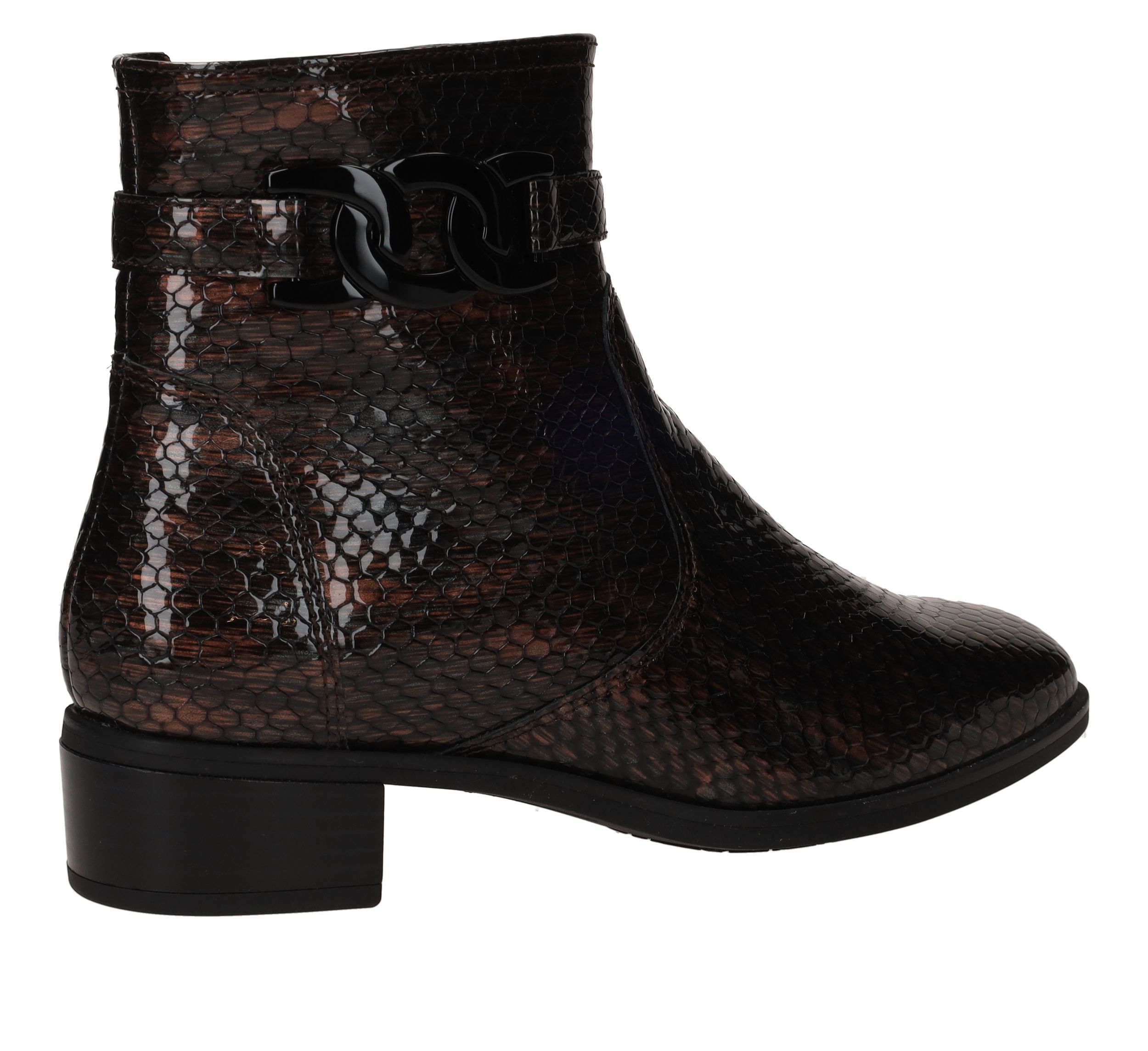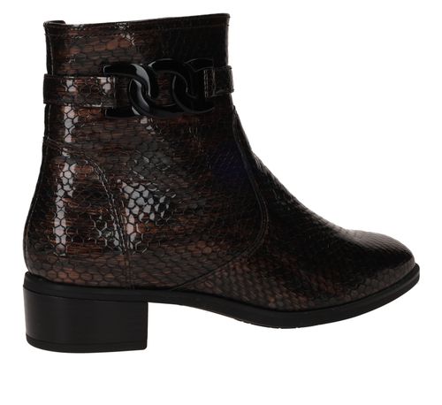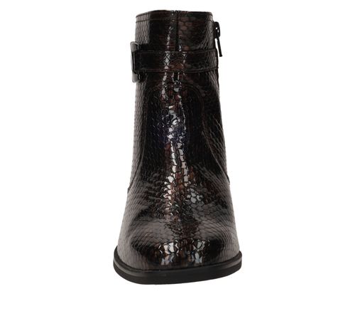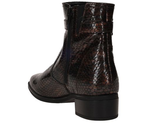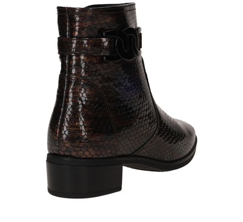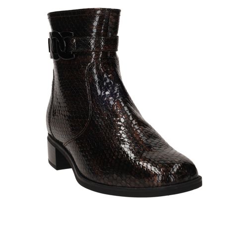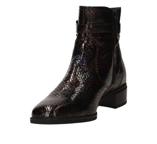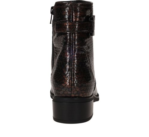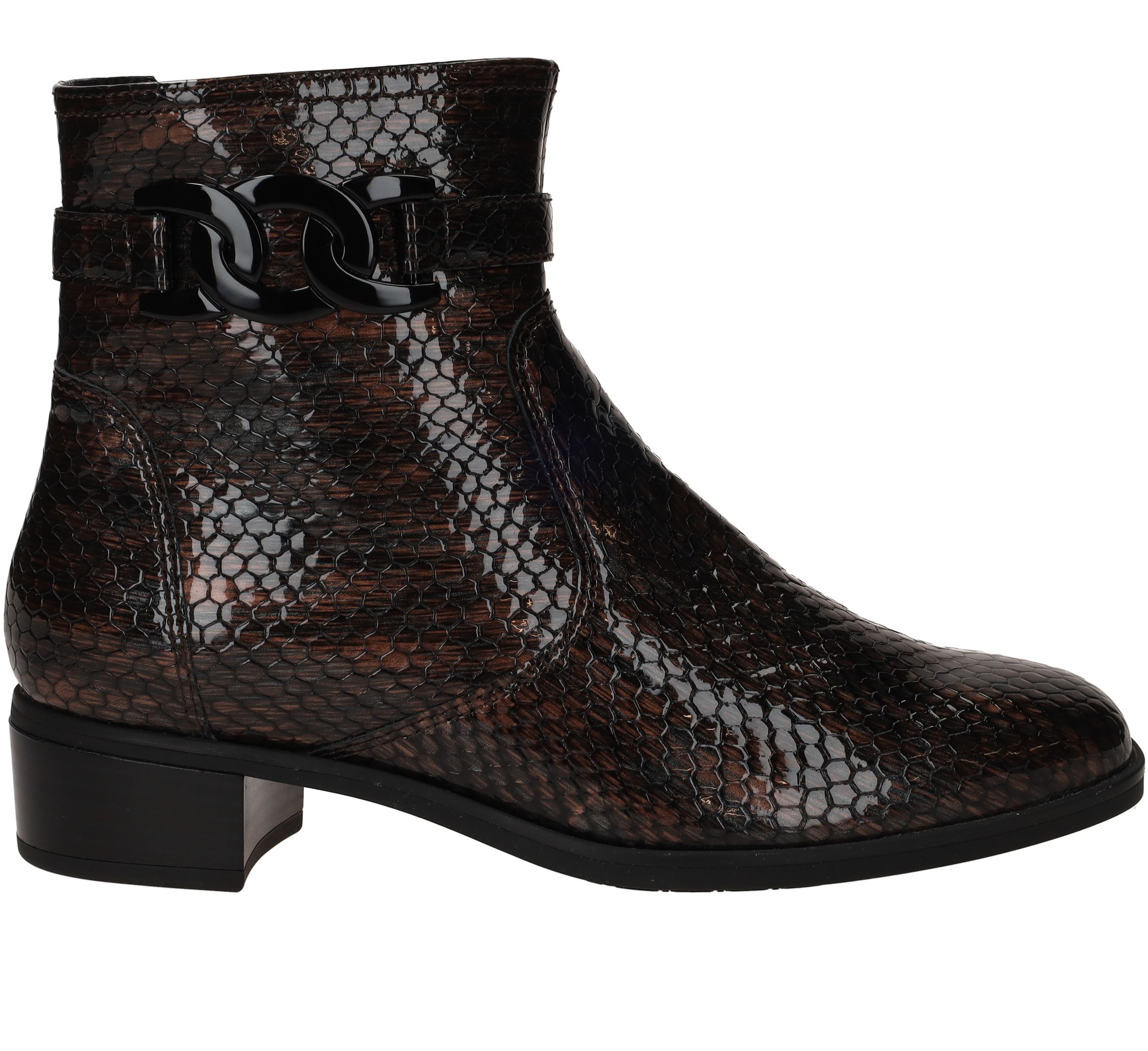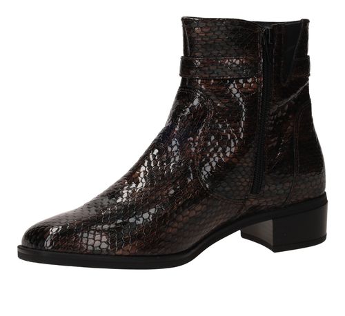Stijlvol Ara Graz enkellaarsje in het lakbruin met prachtig dierenprint motief. De schoen is gemaakt van leer en loopt heel comfortabel door het lage hakje.