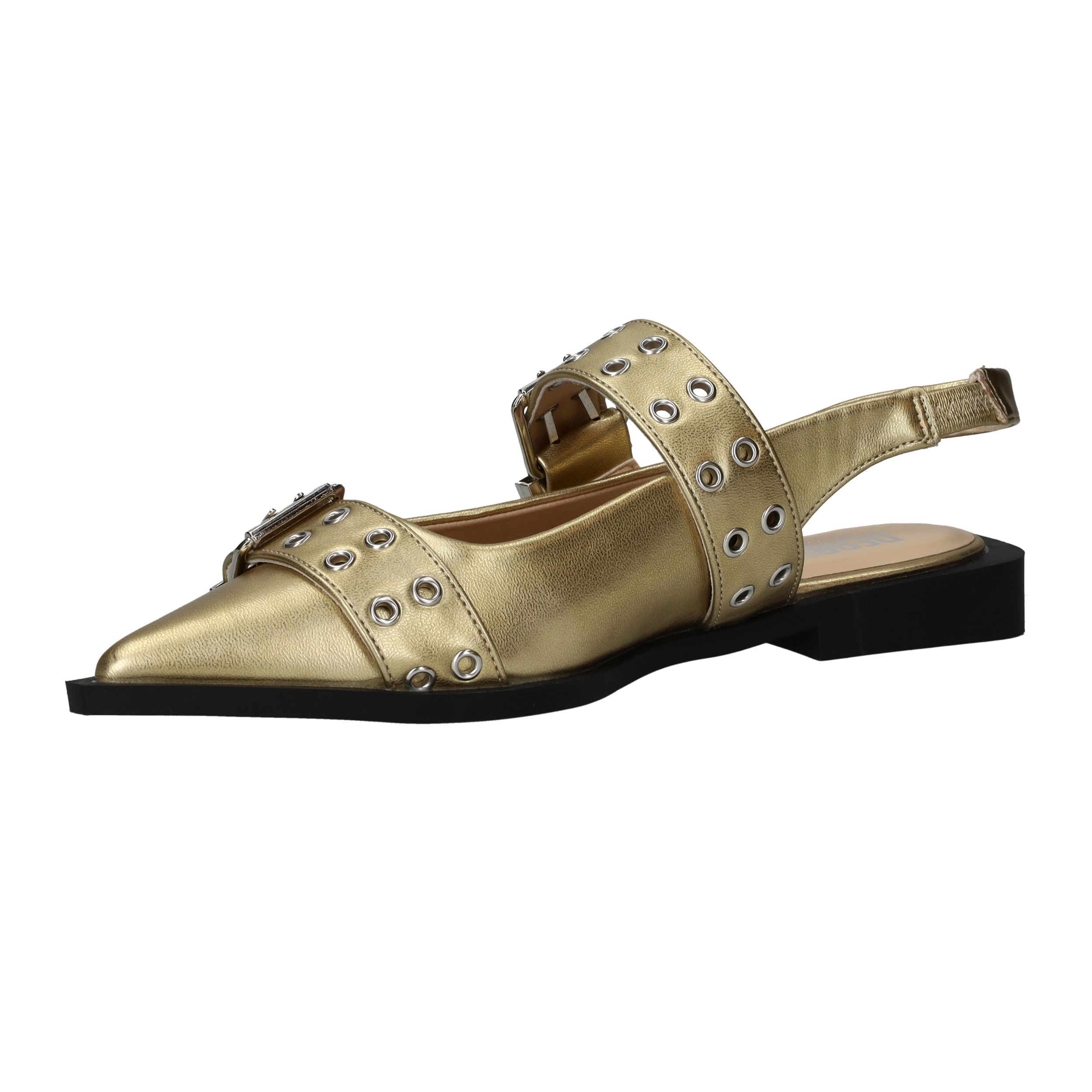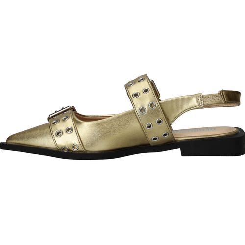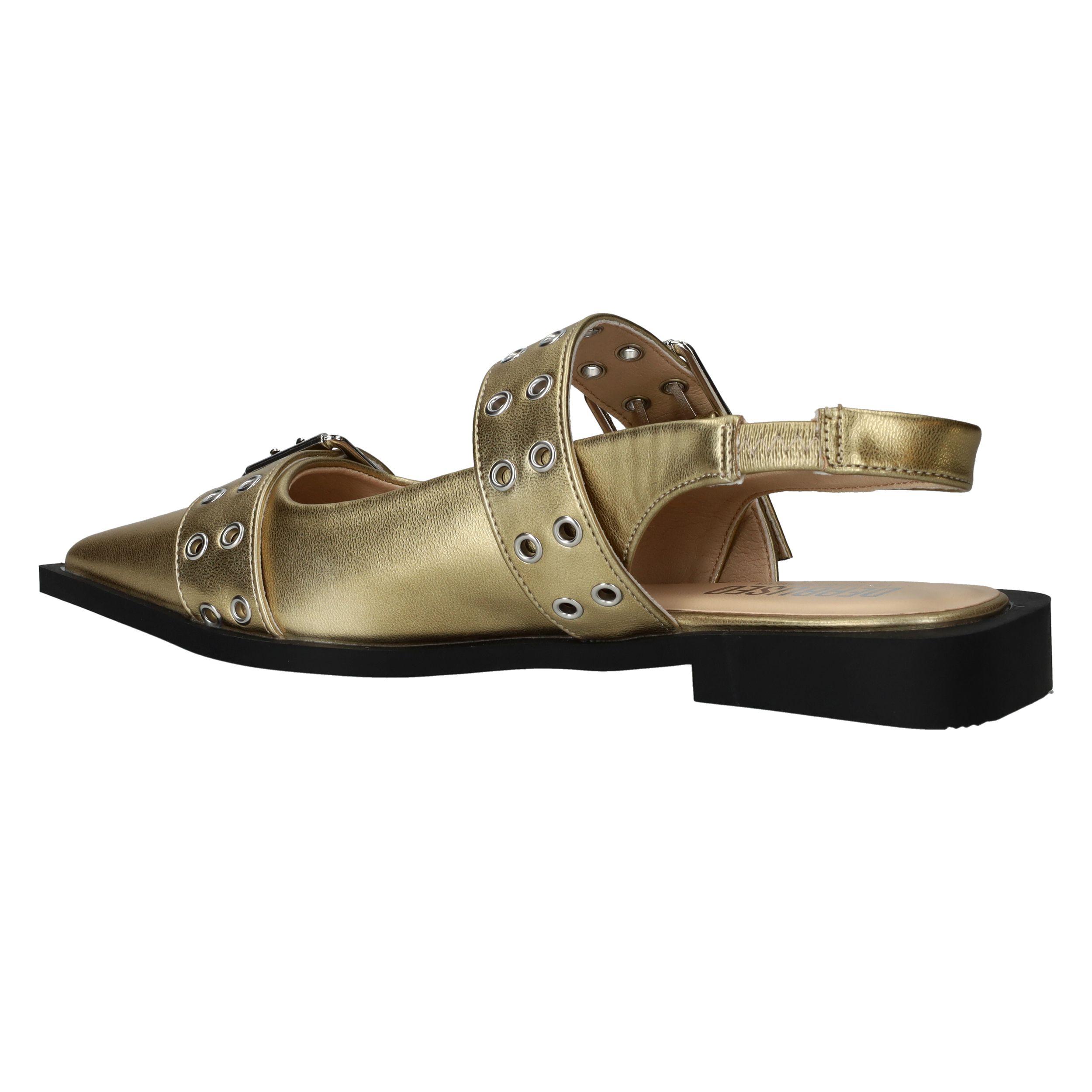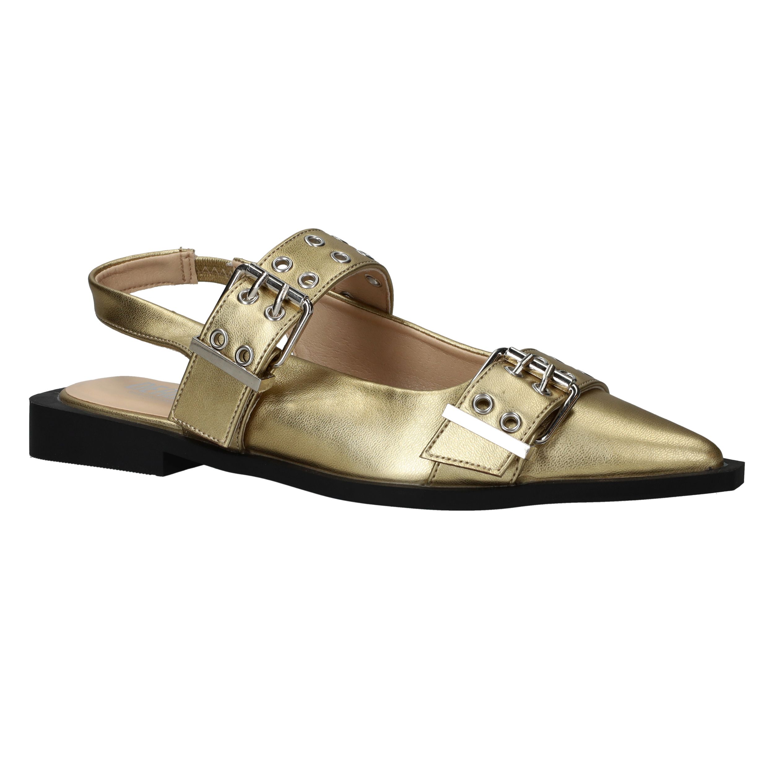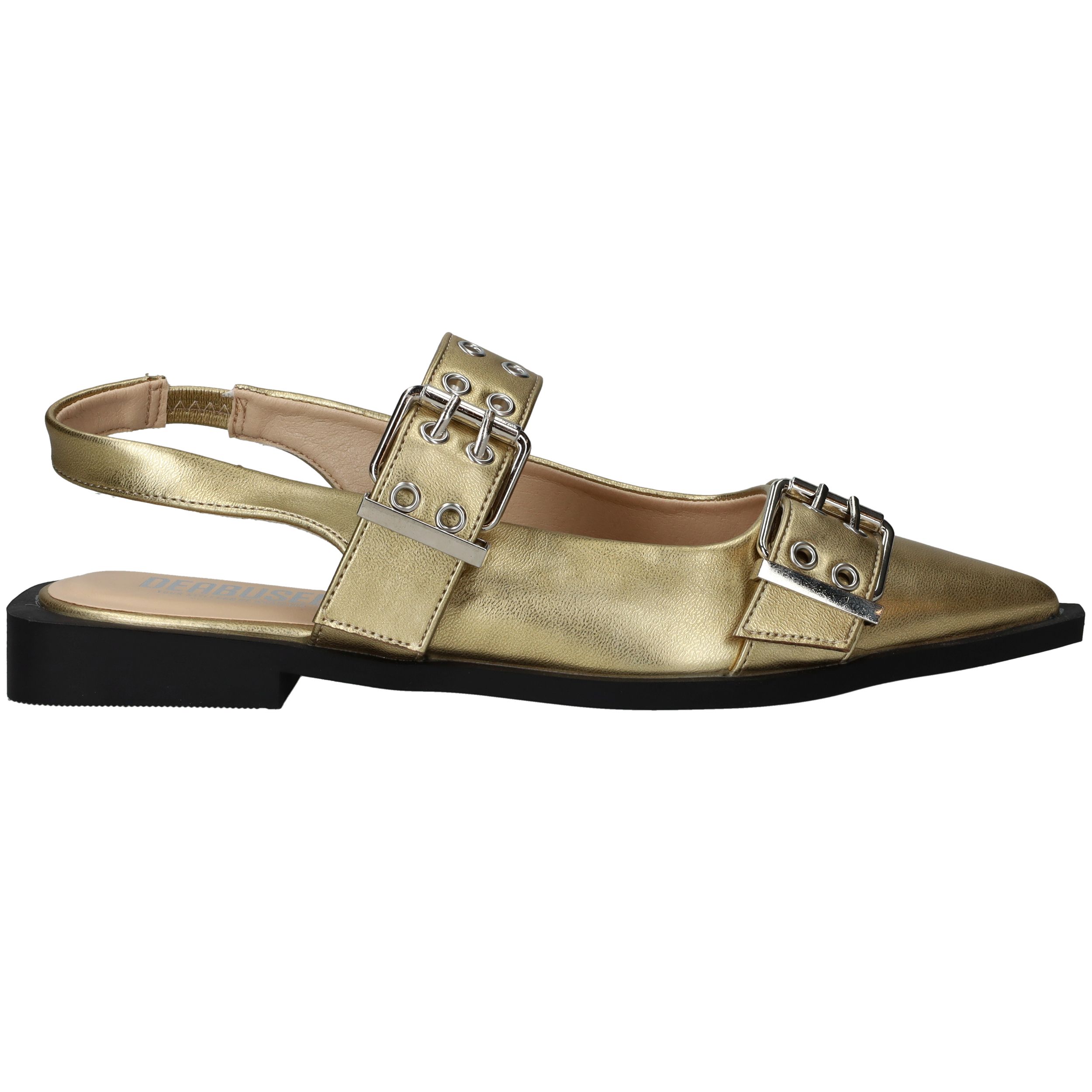 Super toffe Deabused slingback voor dames! De metallic gouden slingback heeft grote opvallende gespen.