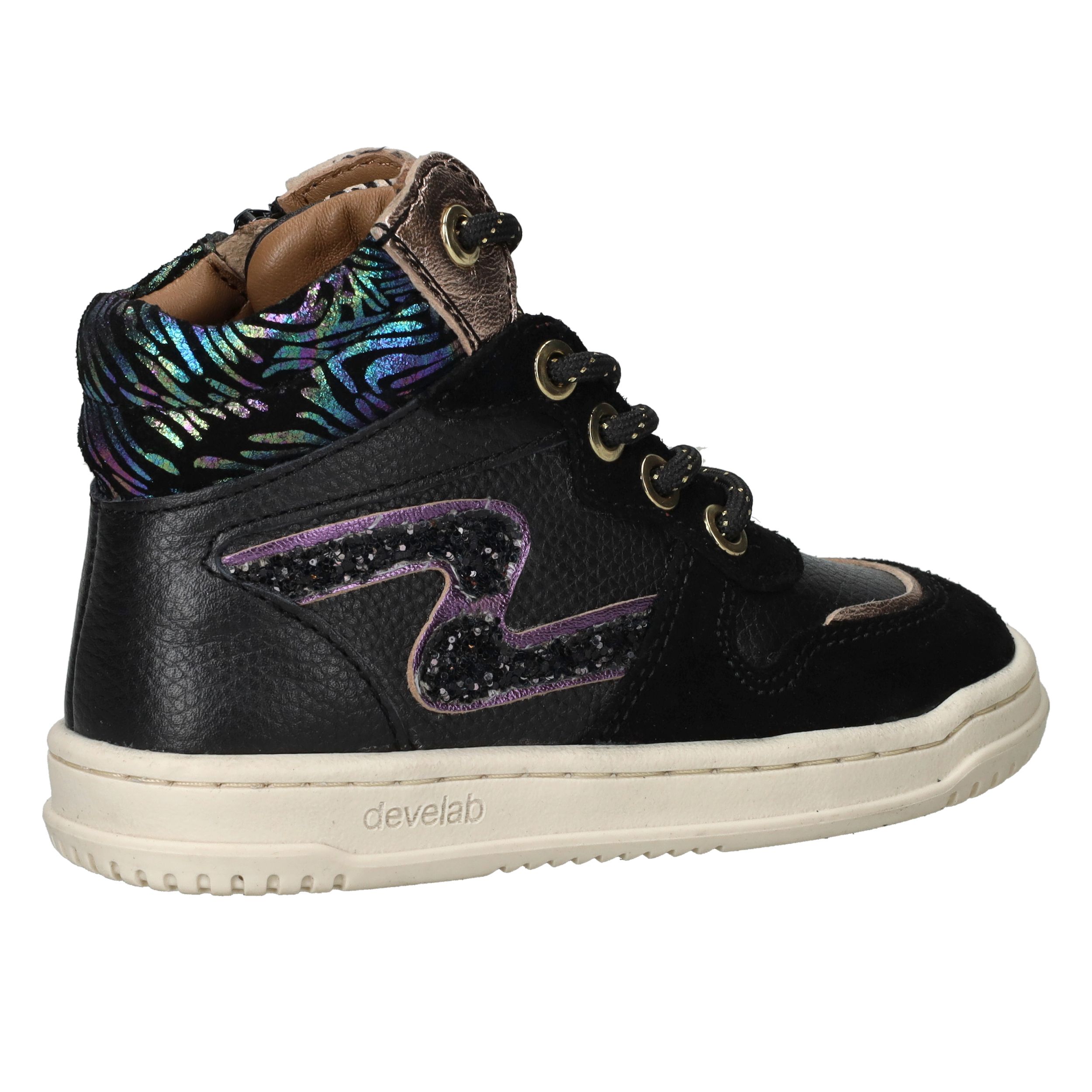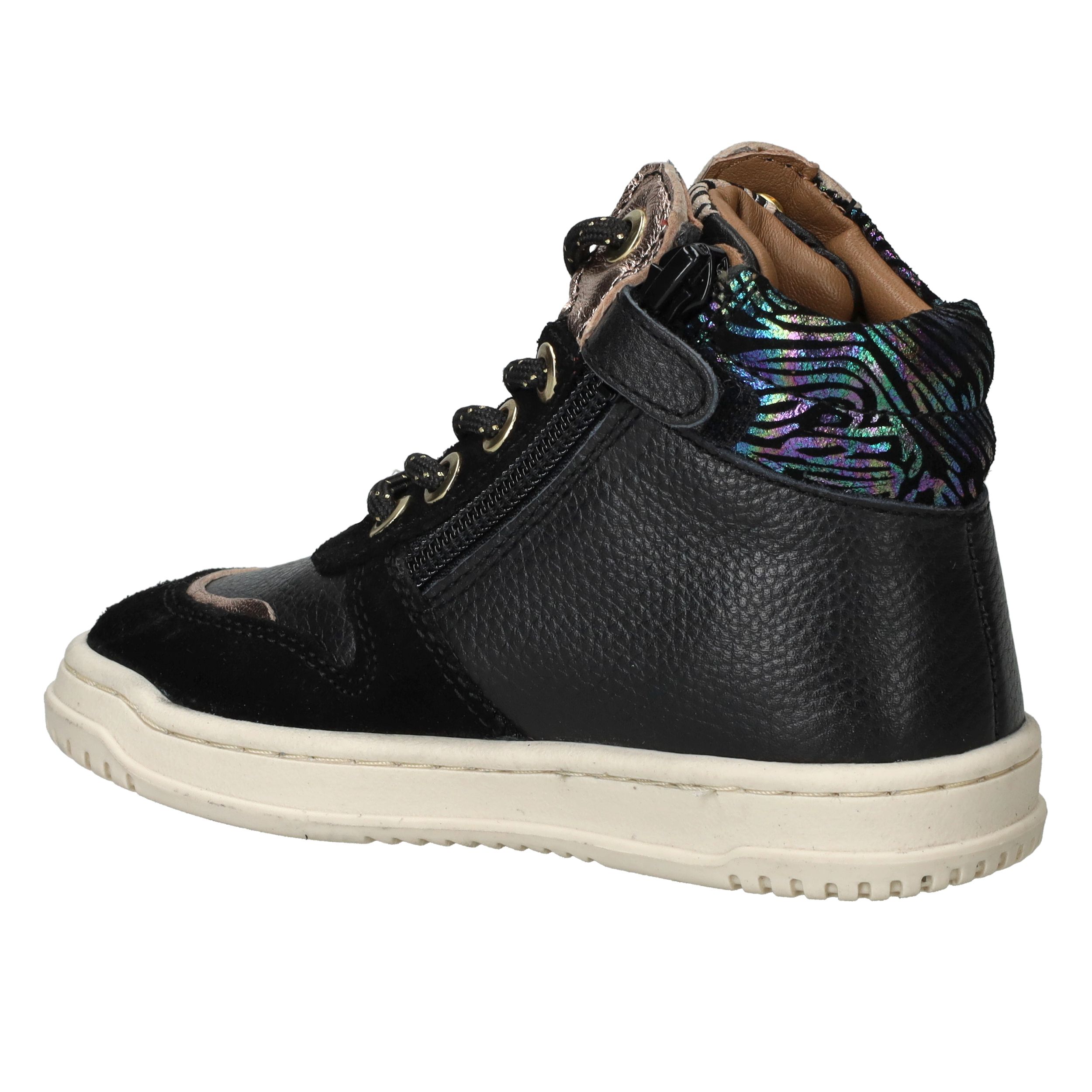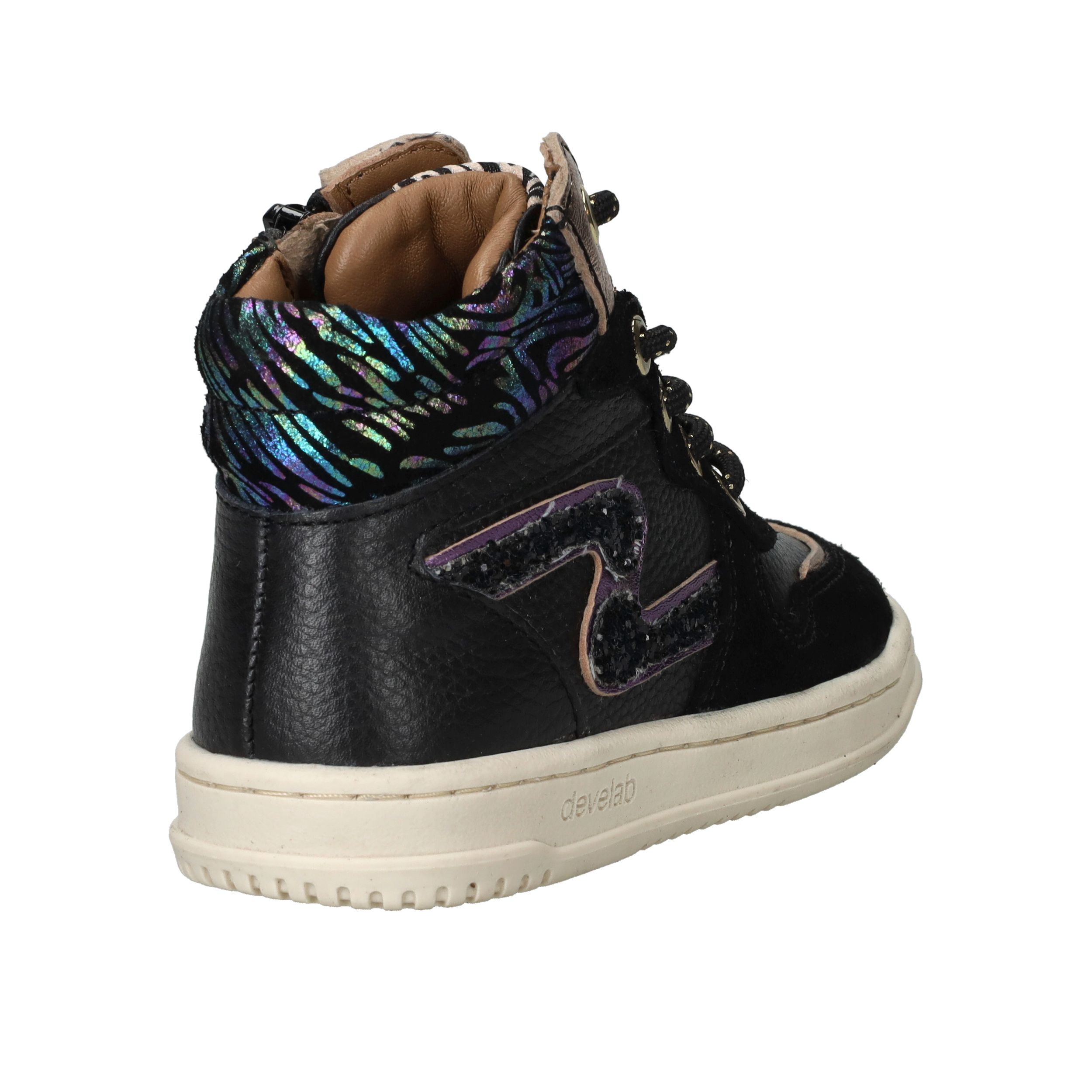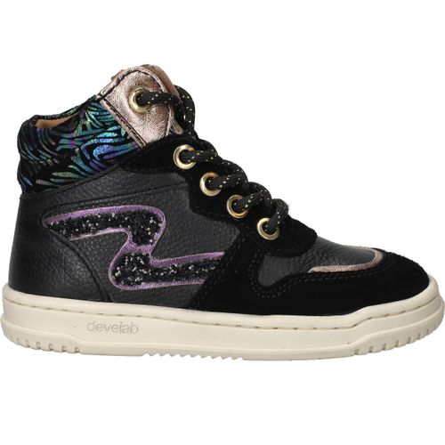 Met deze trendy Develab sneakers voor meisjes maak je elke outfit compleet. Het stevige leer zorgt voor langdurig draagplezier en geeft voldoende steun aan de voet. De zwarte kleur met kleurrijke accenten maakt deze sneakers speels en modieus. Dankzij voetbreedte G sluiten ze comfortabel aan bij kindervoeten.