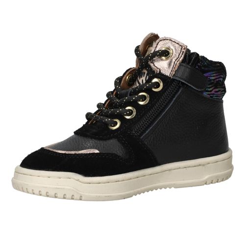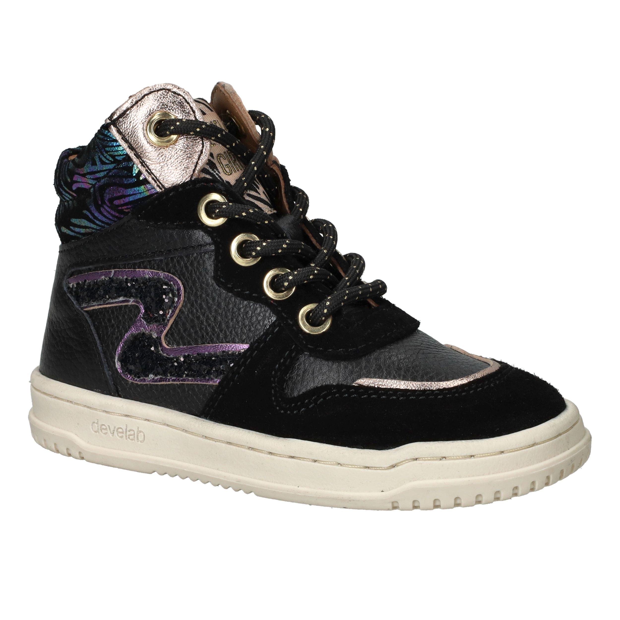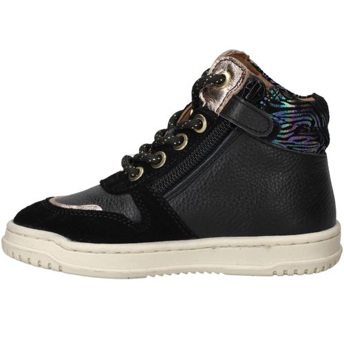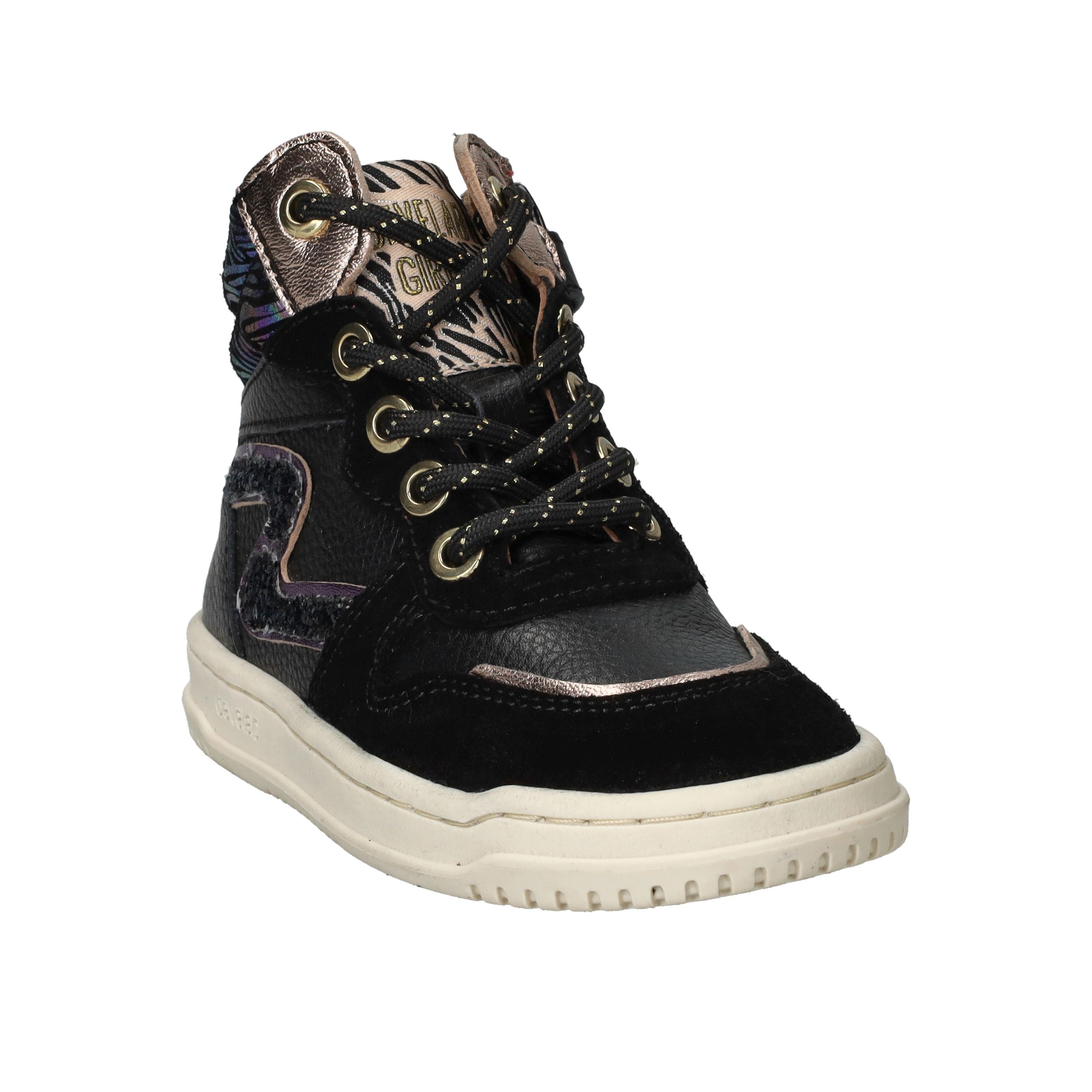 Met deze trendy Develab sneakers voor meisjes maak je elke outfit compleet. Het stevige leer zorgt voor langdurig draagplezier en geeft voldoende steun aan de voet. De zwarte kleur met kleurrijke accenten maakt deze sneakers speels en modieus. Dankzij voetbreedte G sluiten ze comfortabel aan bij kindervoeten.
