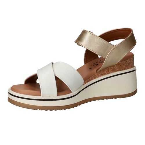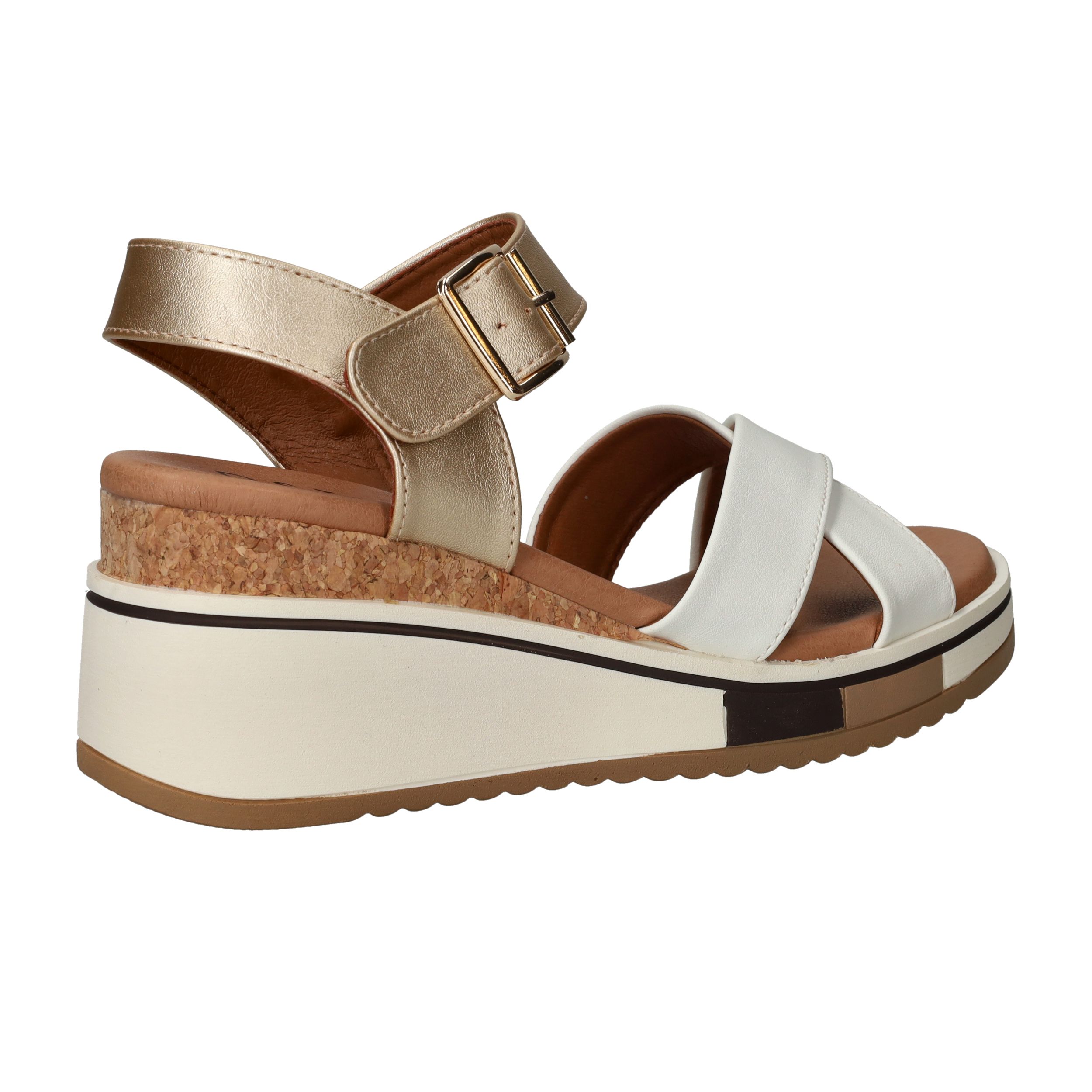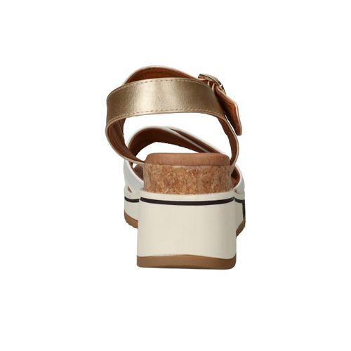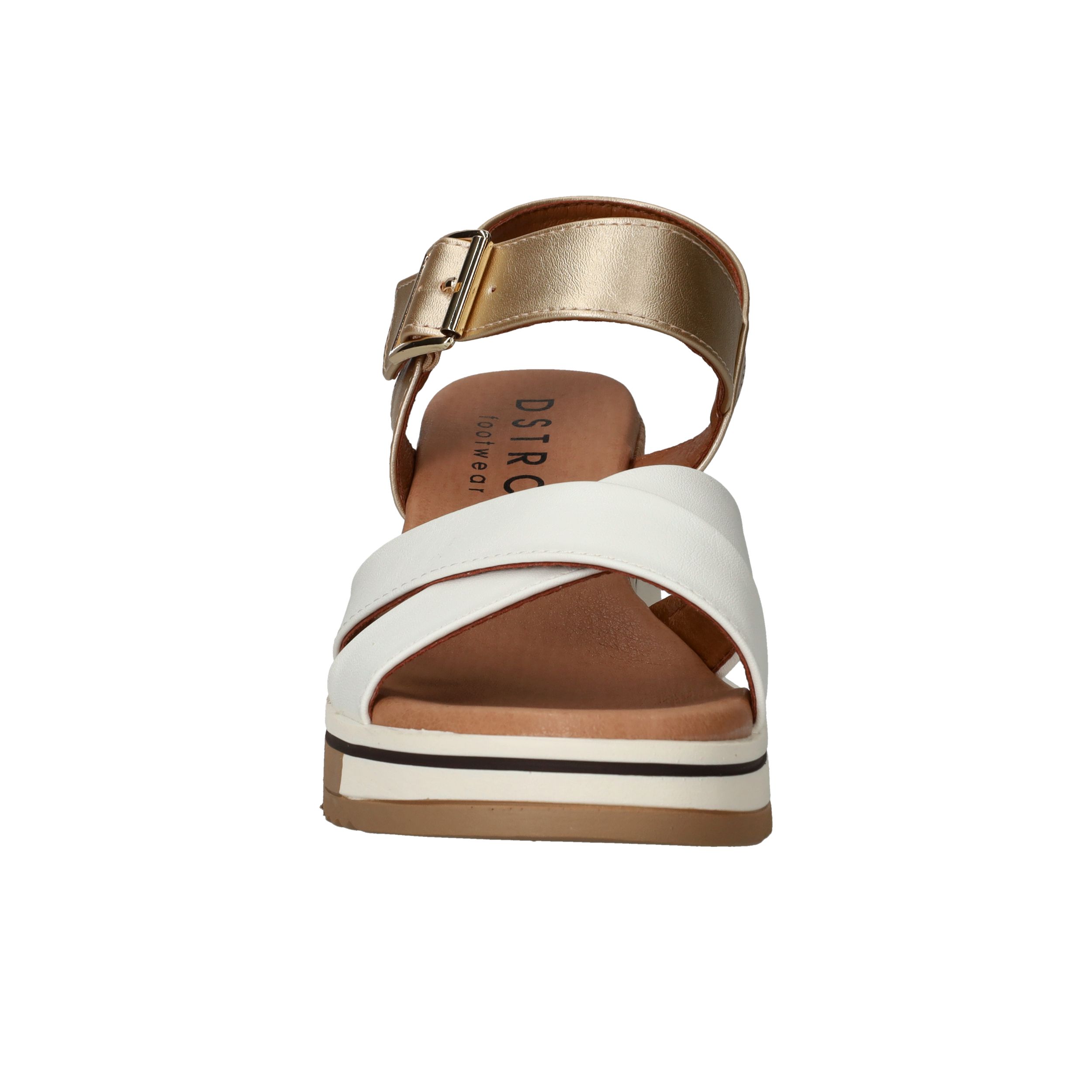 Deze moderne sandaal is een echte eyecatcher en combineert stijl met comfort. Het model is uitgevoerd in wit en goudkleurig leer met een opvallende plateauzool, wat zorgt voor een trendy en sportieve uitstraling. De zachte binnenzool en de stevige sleehak zorgen voor extra draagcomfort, zodat je moeiteloos de hele dag kunt genieten. Perfect voor een zomerse citytrip of een dagje terras!