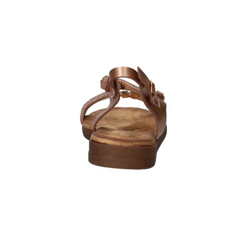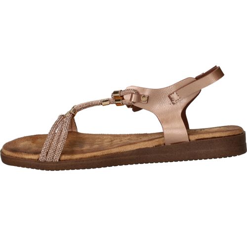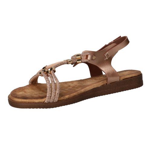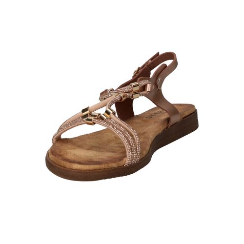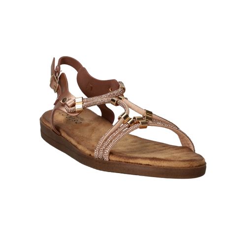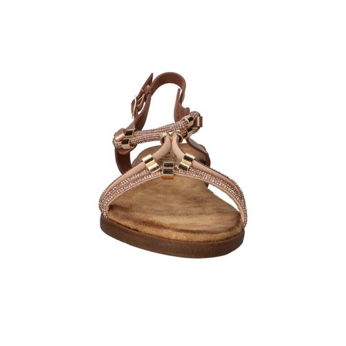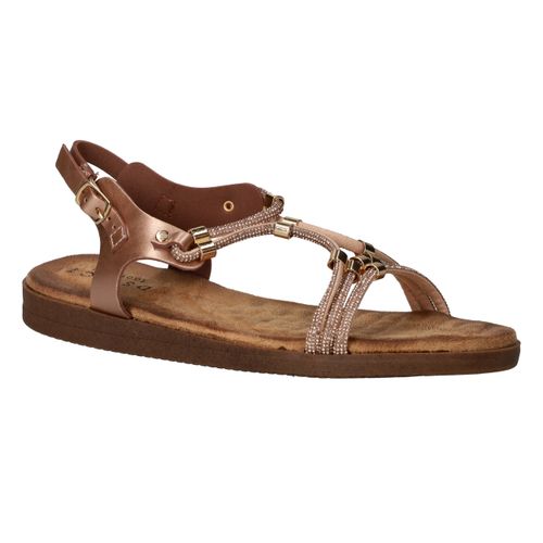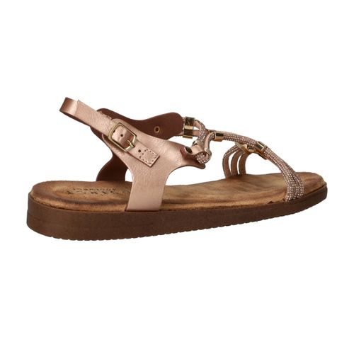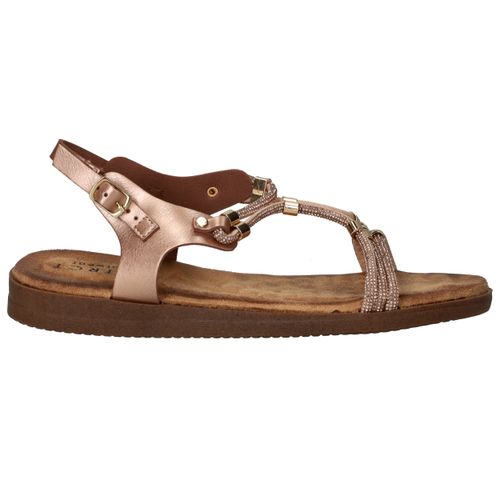 Deze vrouwelijke sandaal is een schitterende keuze voor warme dagen en zomeravonden. Het model is uitgevoerd in rosé metallic met fijne bandjes en goudkleurige details, wat zorgt voor een sierlijke en elegante uitstraling. Dankzij het zachte voetbed en de flexibele zool geniet je van optimaal comfort, of je nu gaat wandelen of een terrasje pakt. Een perfecte sandaal voor elke zomerse gelegenheid!