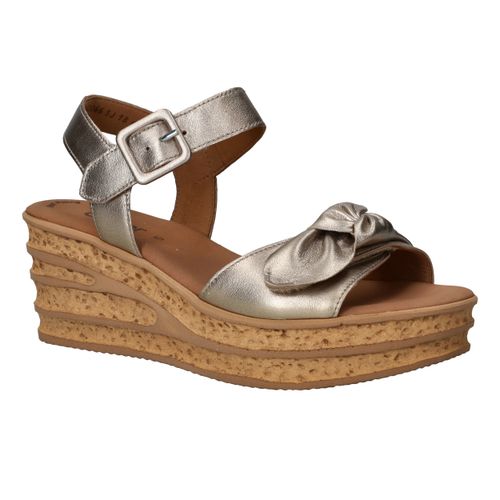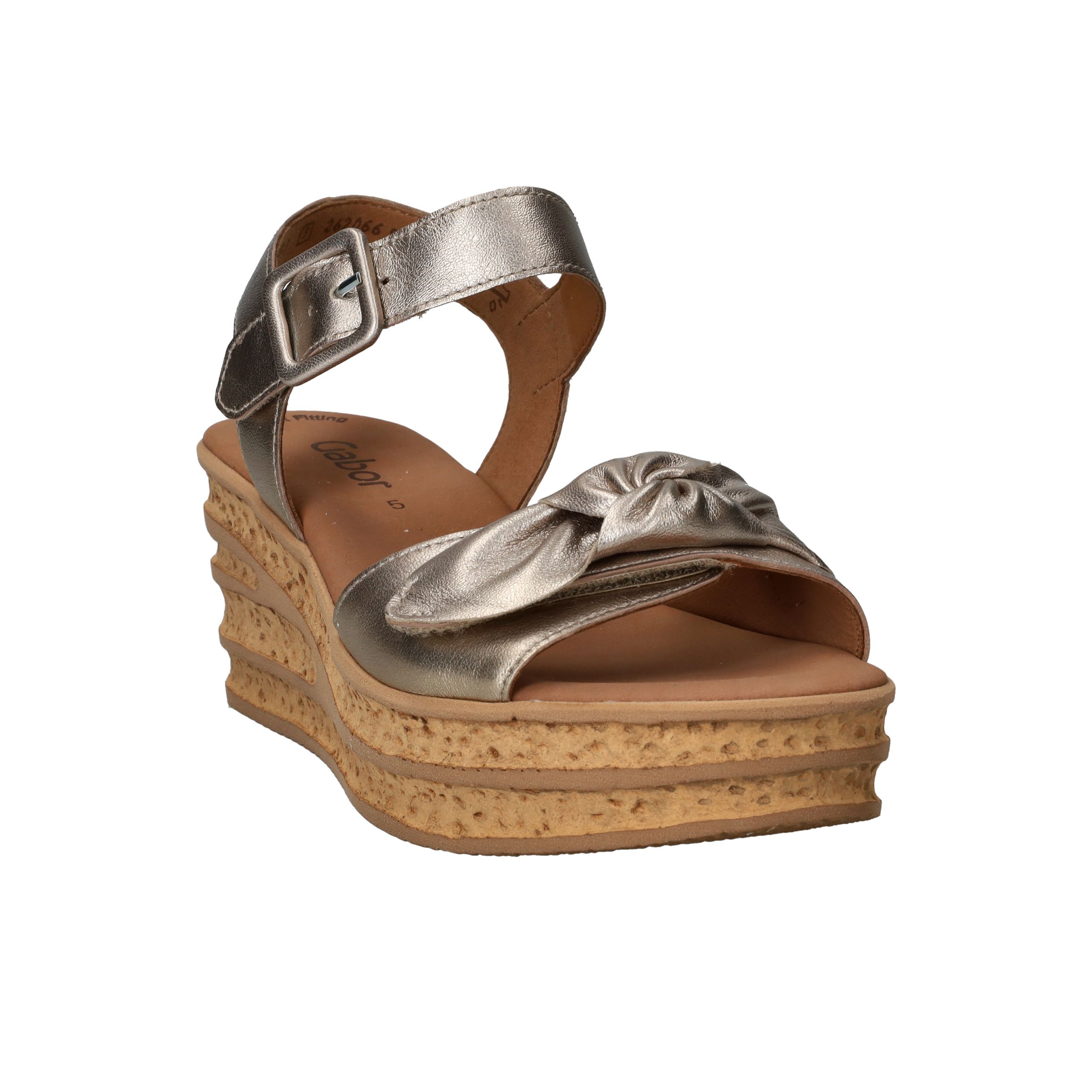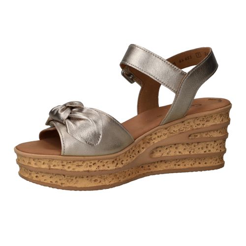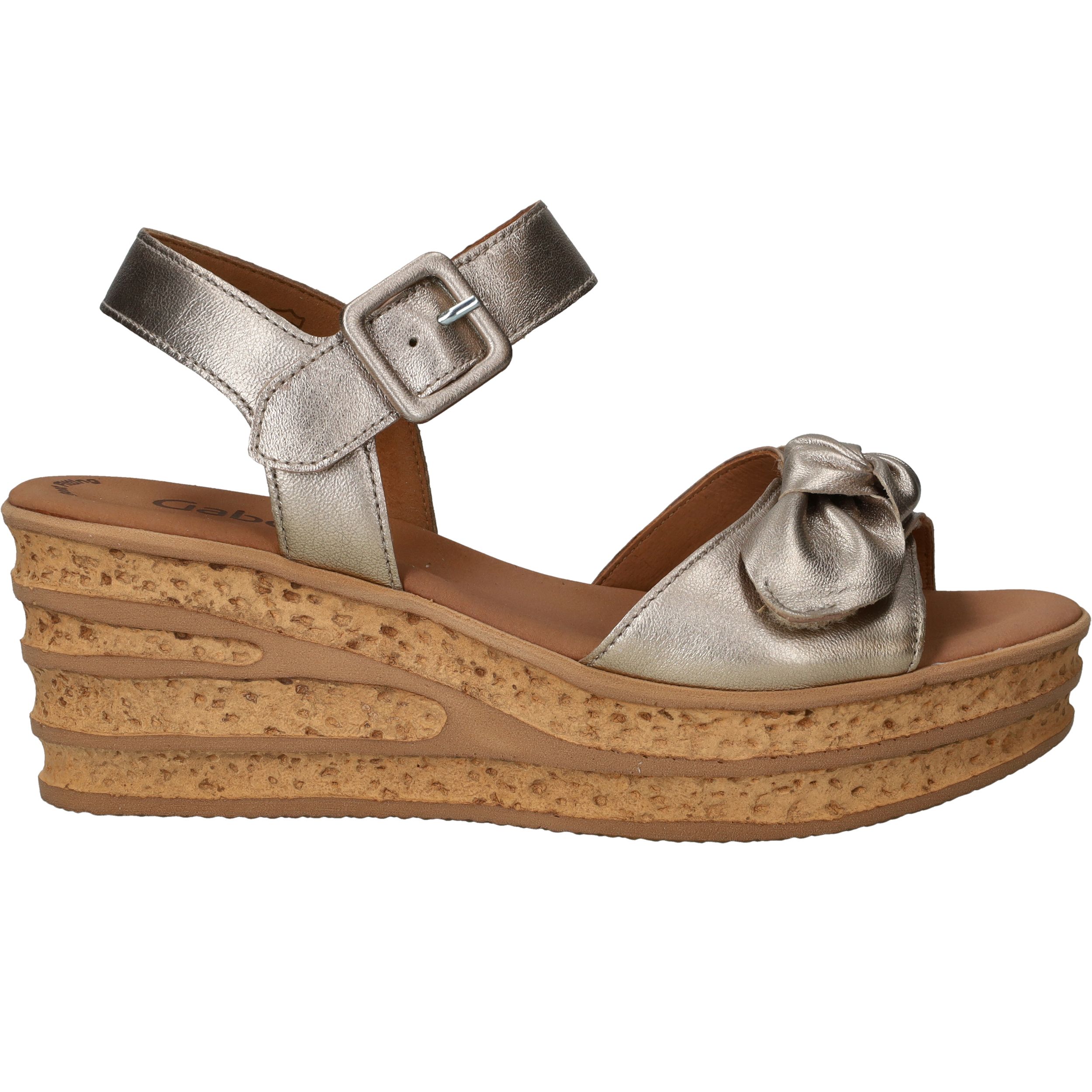 Deze elegante sleehak sandaal van Gabor is een perfecte combinatie van stijl en comfort. Het model is uitgevoerd in metallic goudkleurig leer en afgewerkt met een speelse strik op de voorvoet. De kurklook sleehak met verfijnde uitsparingen geeft de sandaal een zomerse en luchtige uitstraling. Ideaal voor een feestelijke gelegenheid of een zomerse dag!