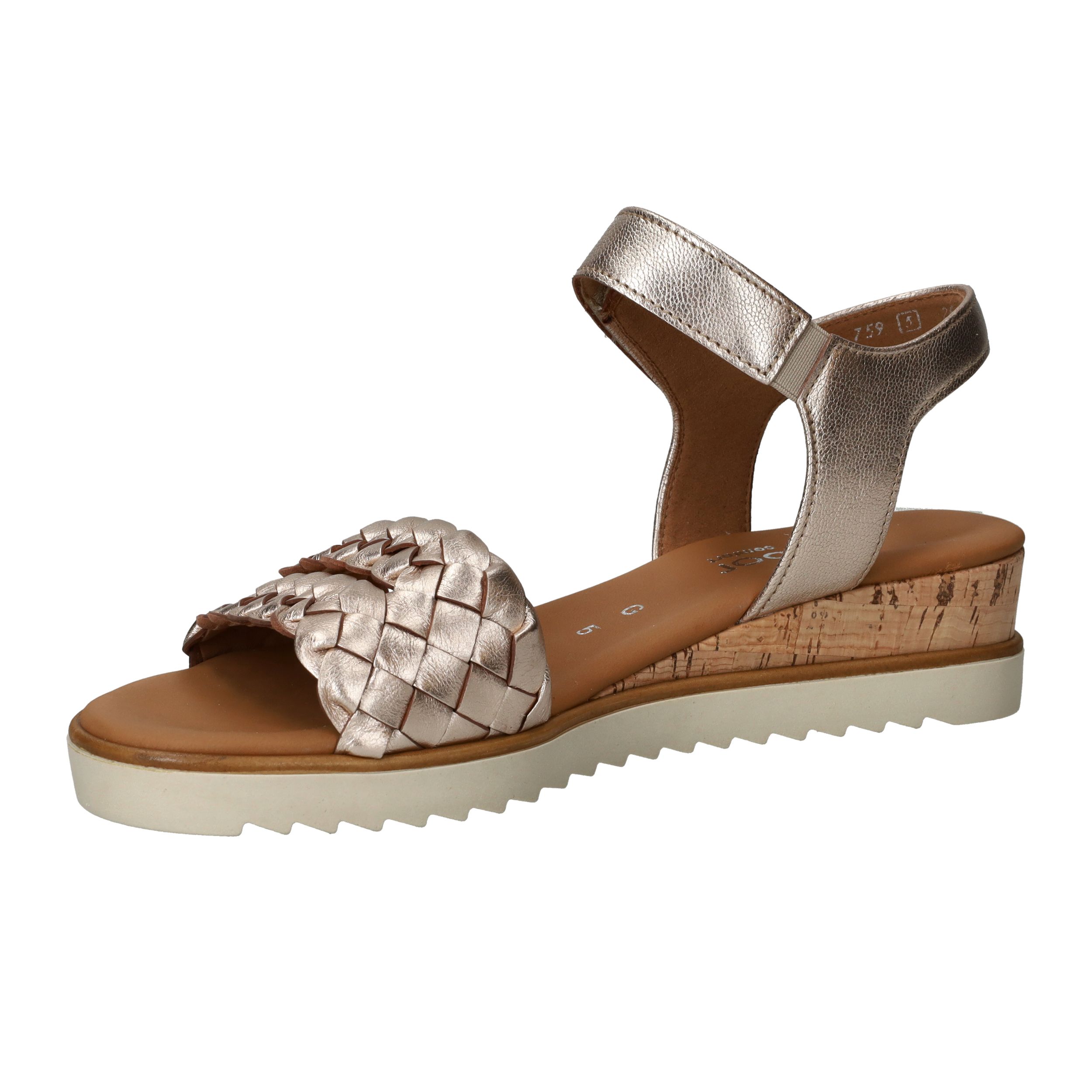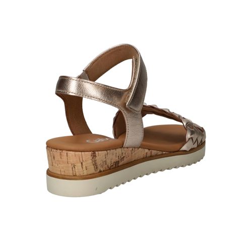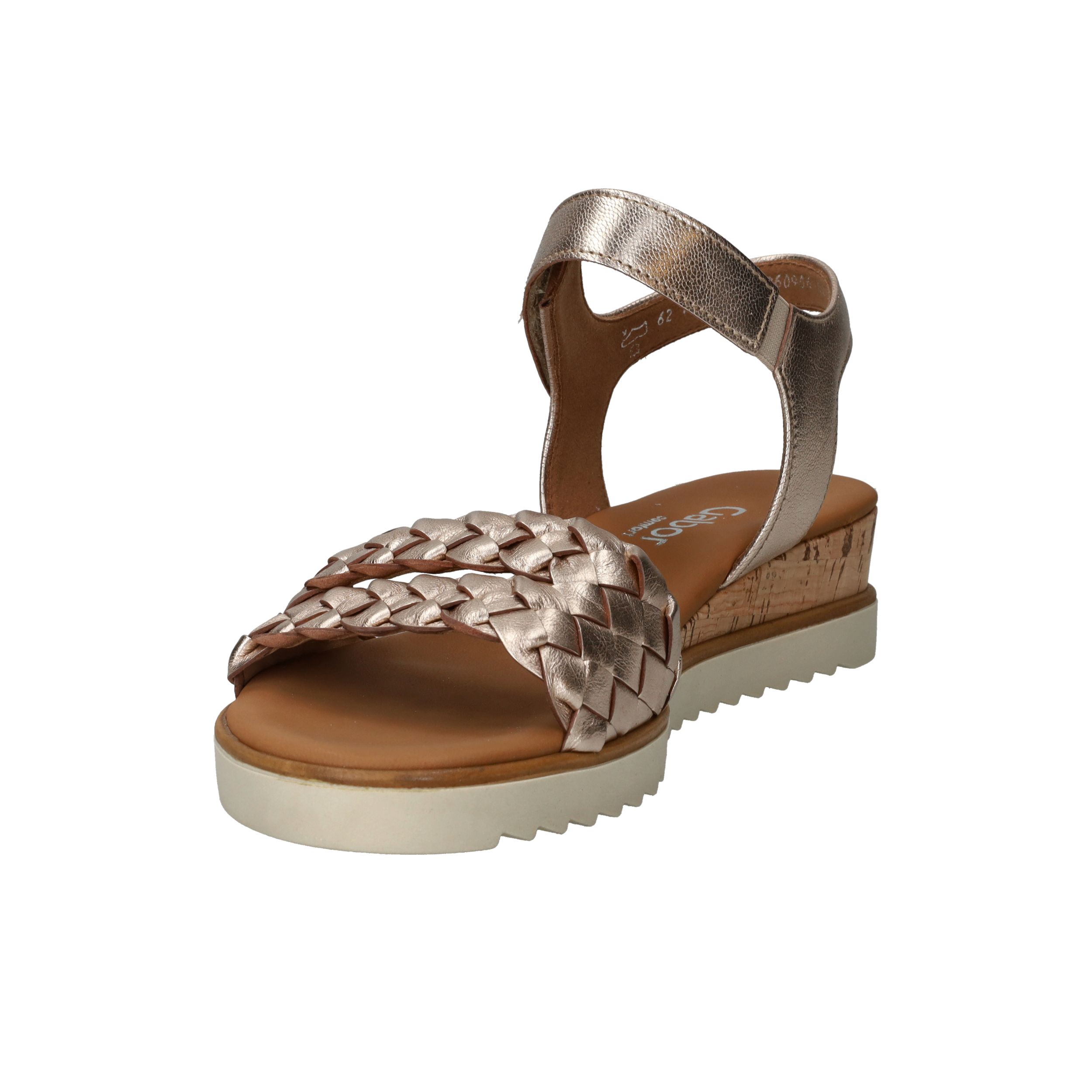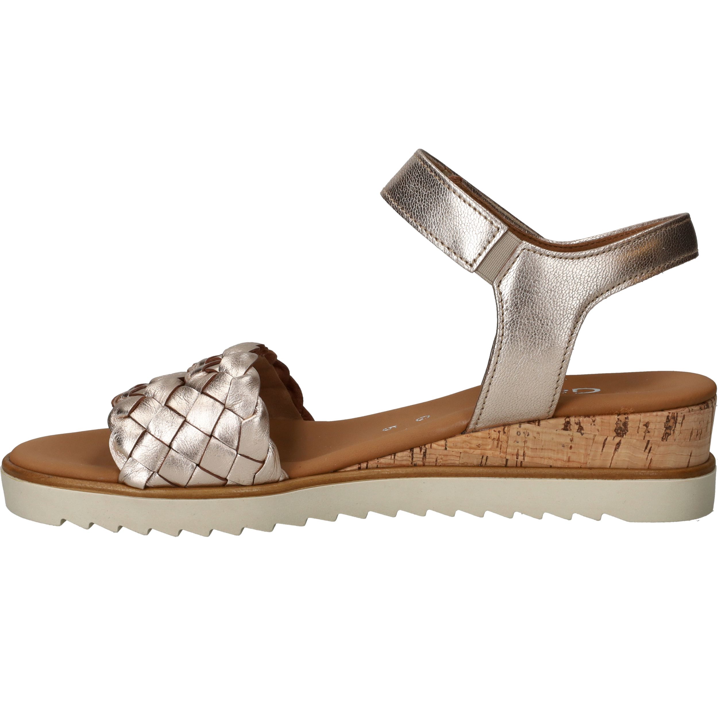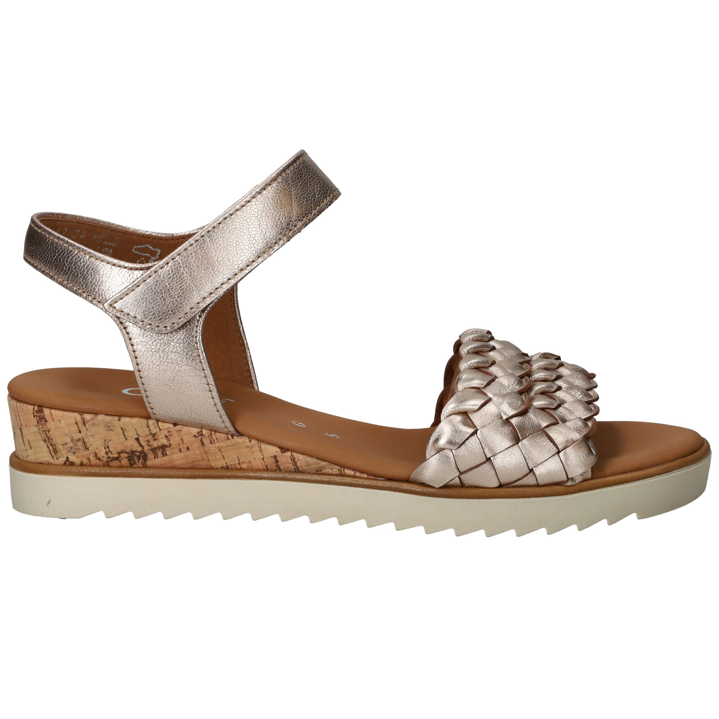 Deze zomerse sandaal van Gabor straalt elegantie en comfort uit. Het model is uitgevoerd in metallic goudkleurig leer met een speelse gevlochten band over de voorvoet. De kurklook hak en de lichte, flexibele zool zorgen voor een luchtige en comfortabele loopervaring. Perfect voor een stijlvolle zomerdag of een gezellige avond op het terras!