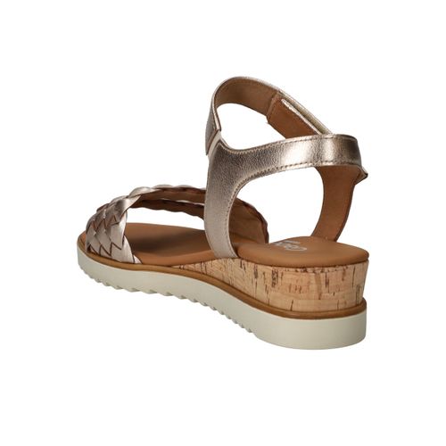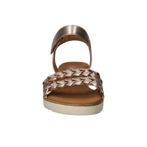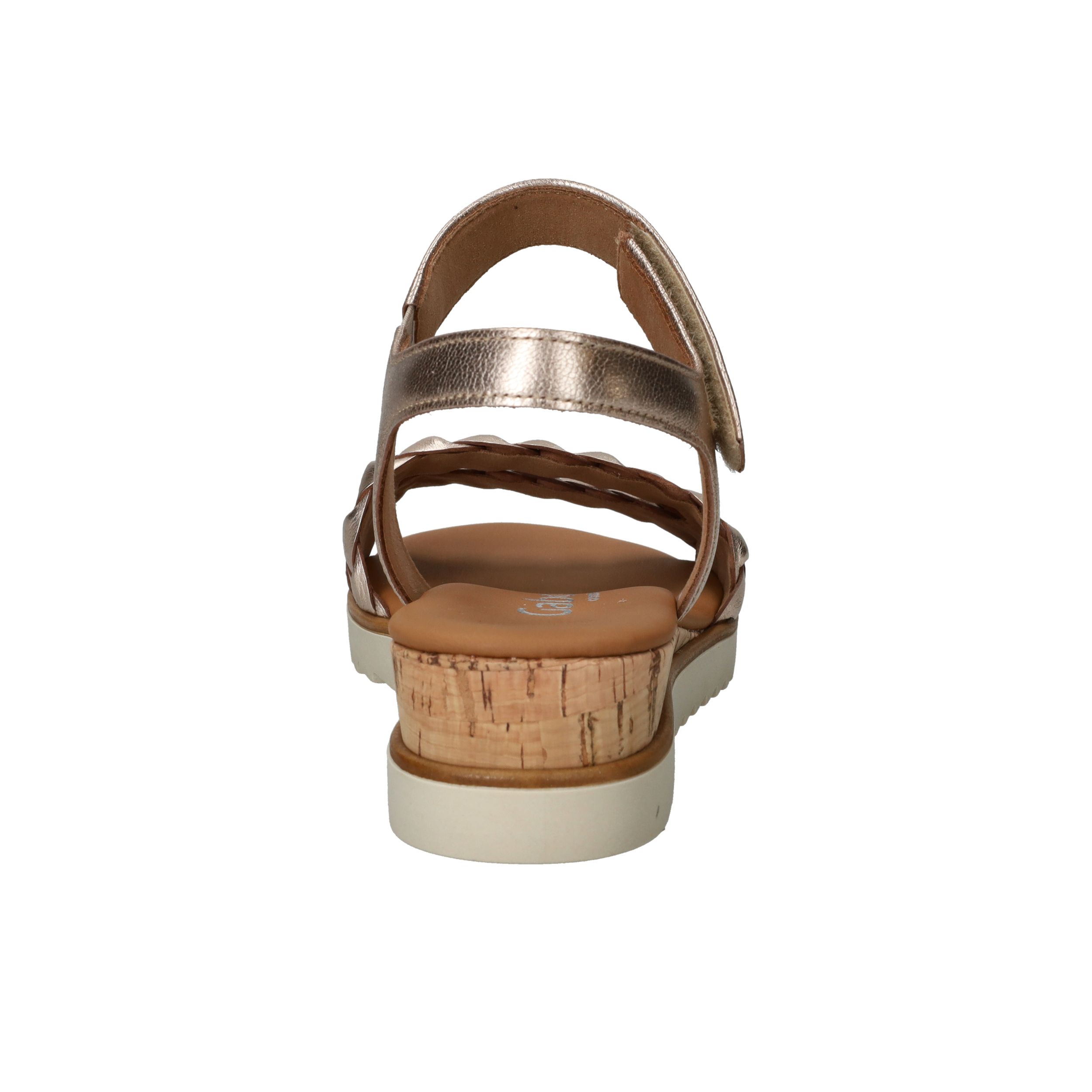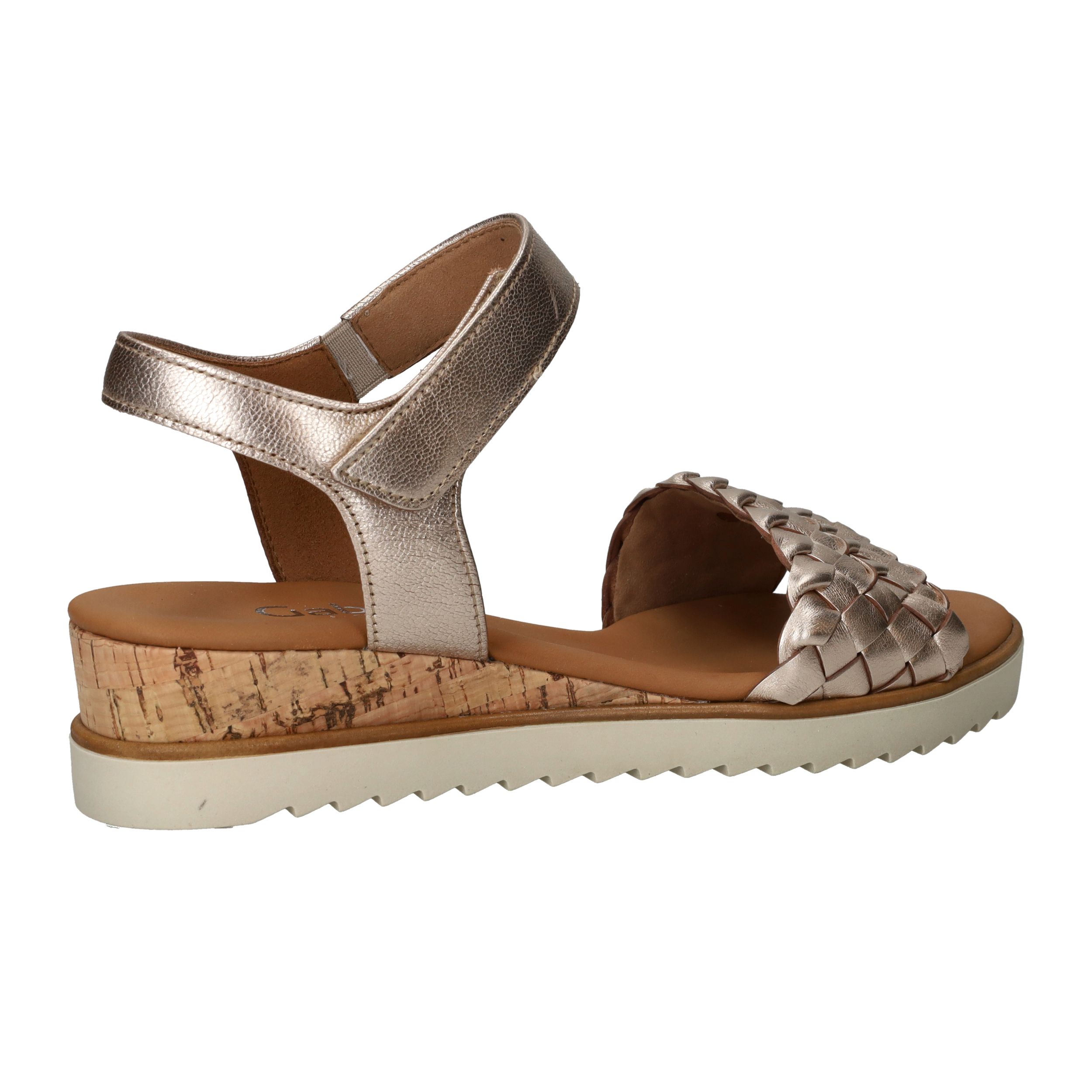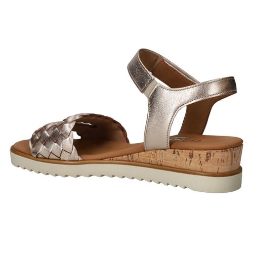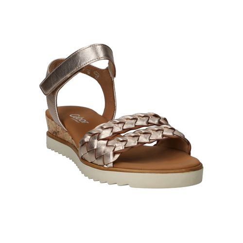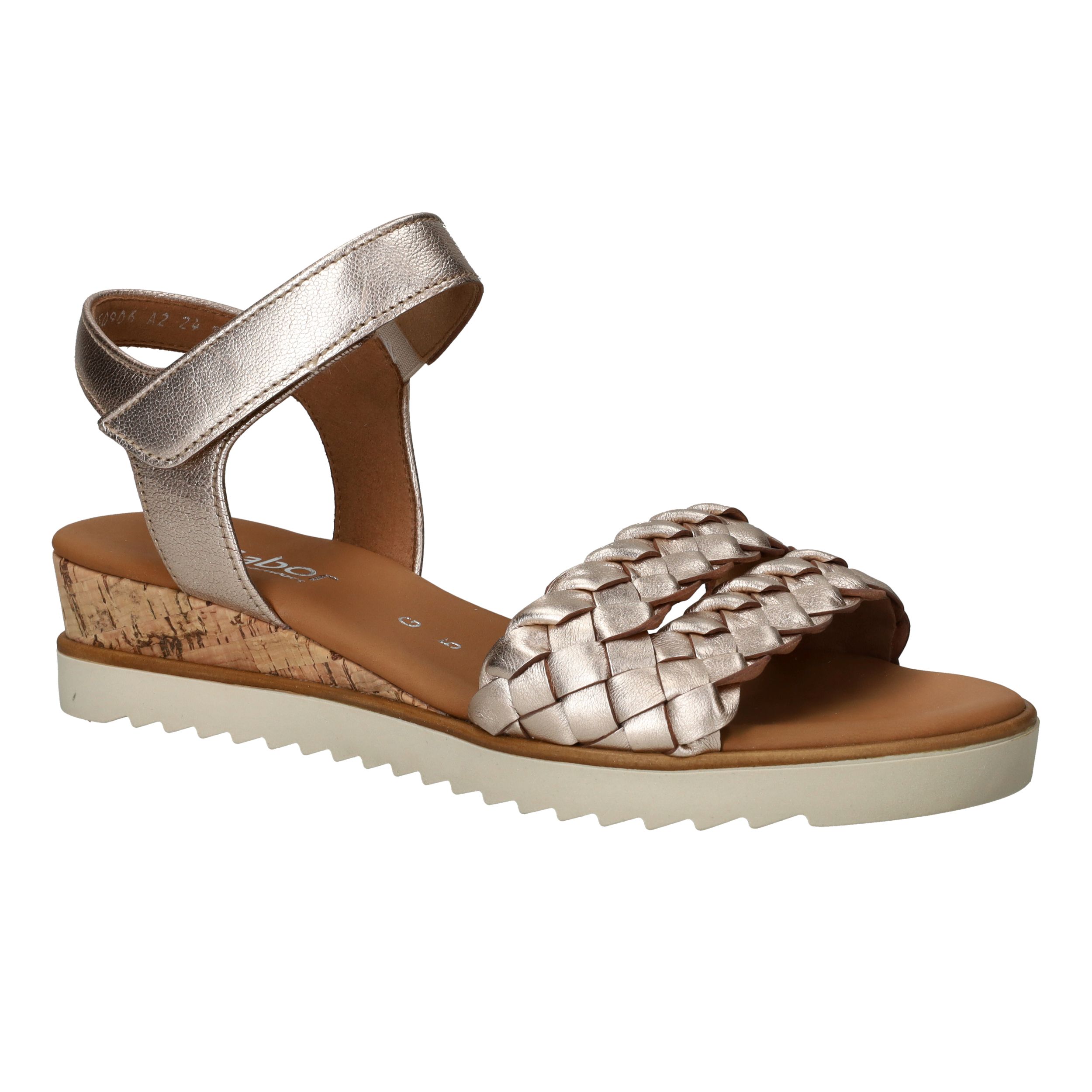 Deze zomerse sandaal van Gabor straalt elegantie en comfort uit. Het model is uitgevoerd in metallic goudkleurig leer met een speelse gevlochten band over de voorvoet. De kurklook hak en de lichte, flexibele zool zorgen voor een luchtige en comfortabele loopervaring. Perfect voor een stijlvolle zomerdag of een gezellige avond op het terras!