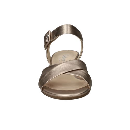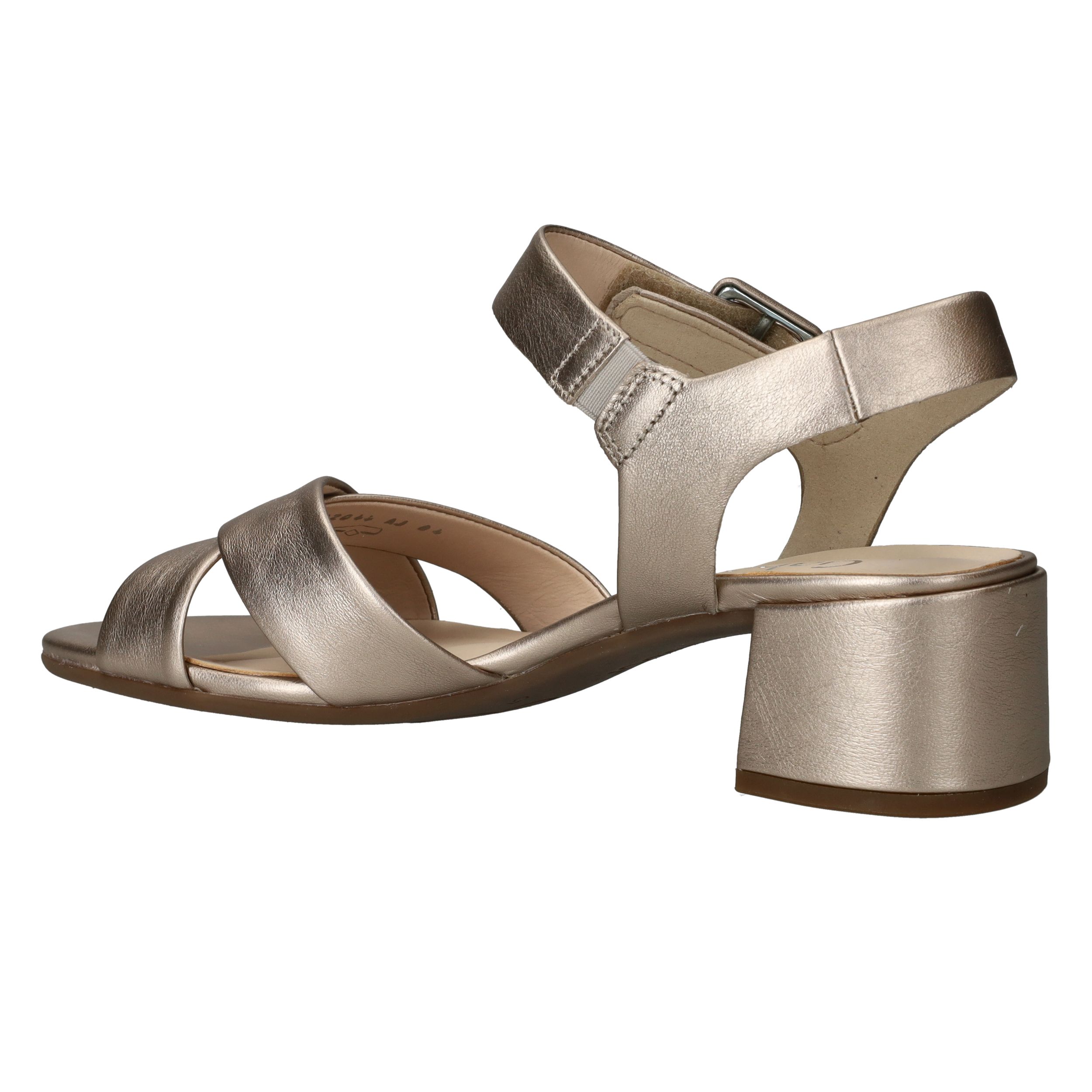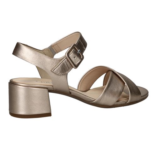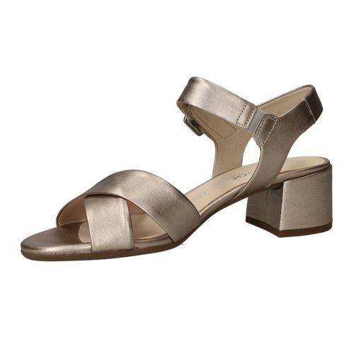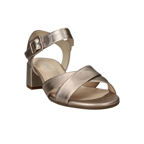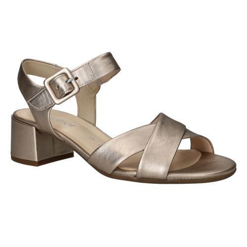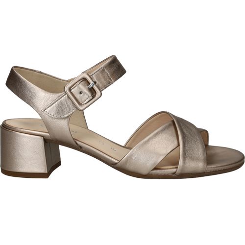 Deze elegante sandaal van het merk Gabor is perfect voor speciale gelegenheden en zomerse feestjes. Het model is gemaakt van zacht leer in een stijlvolle metallic beige kleur en heeft een vrouwelijke uitstraling door de gekruiste banden. De middelhoge hak biedt net dat beetje extra, zonder in te leveren op comfort. Een verfijnde sandaal die jouw outfit compleet maakt!