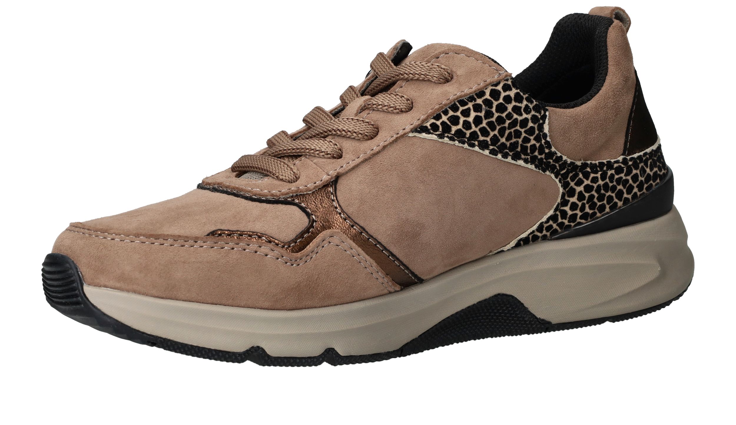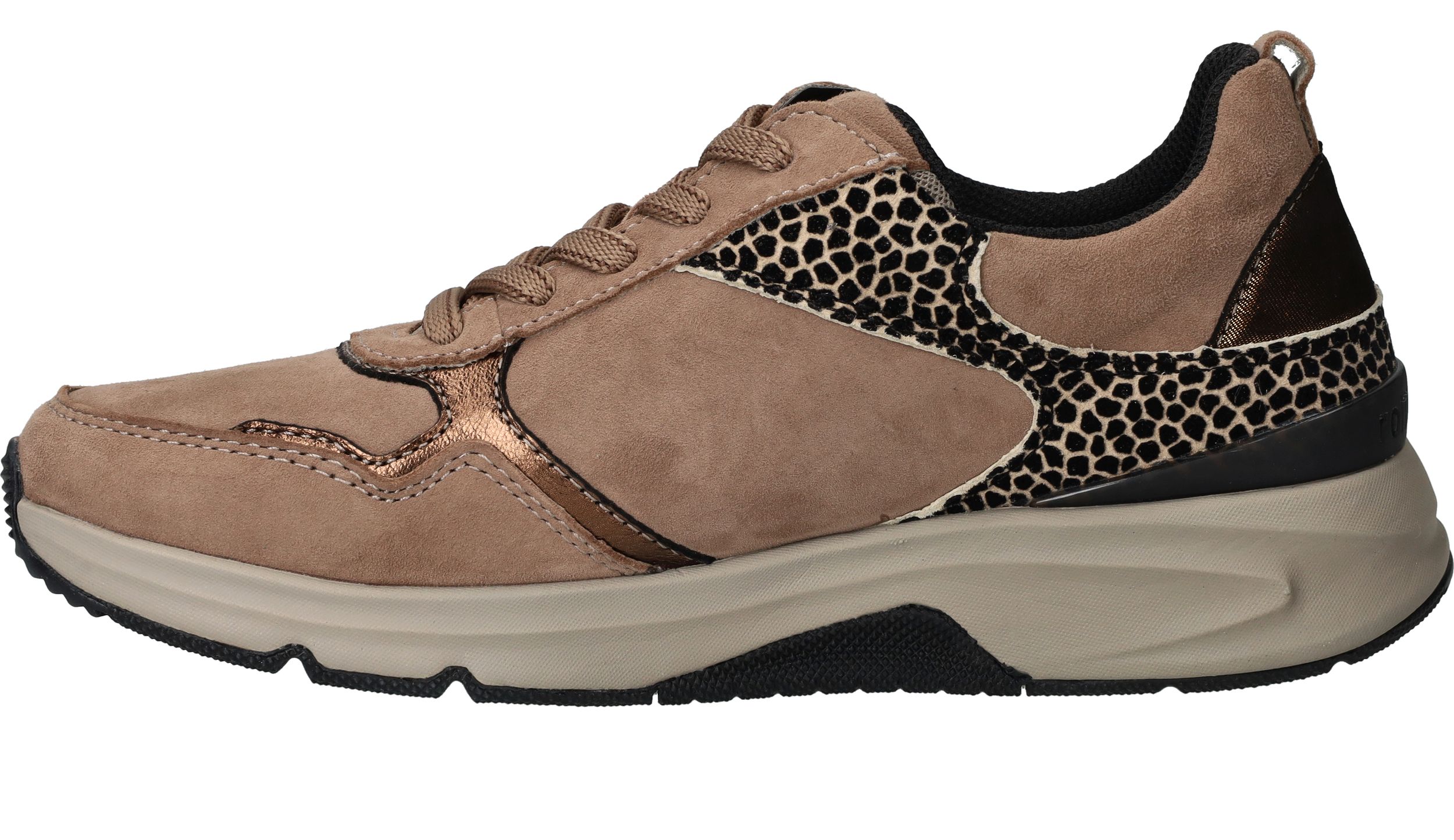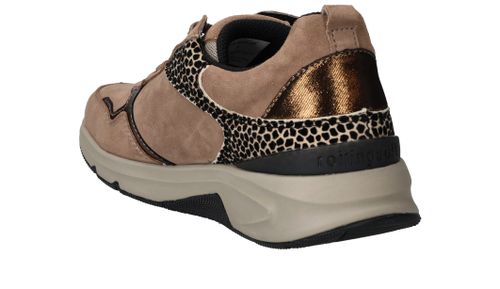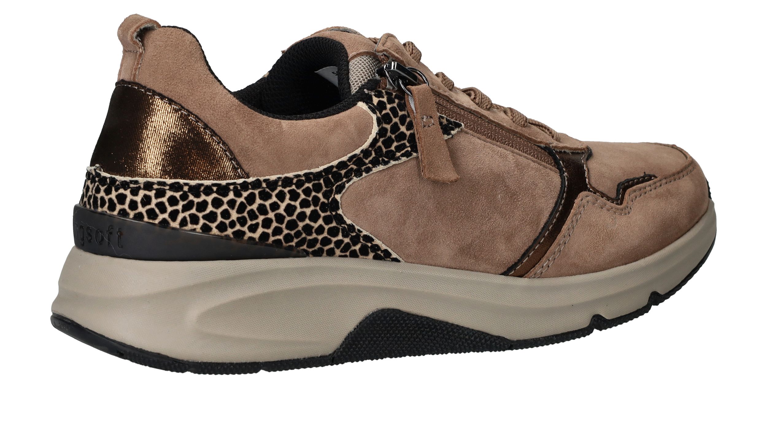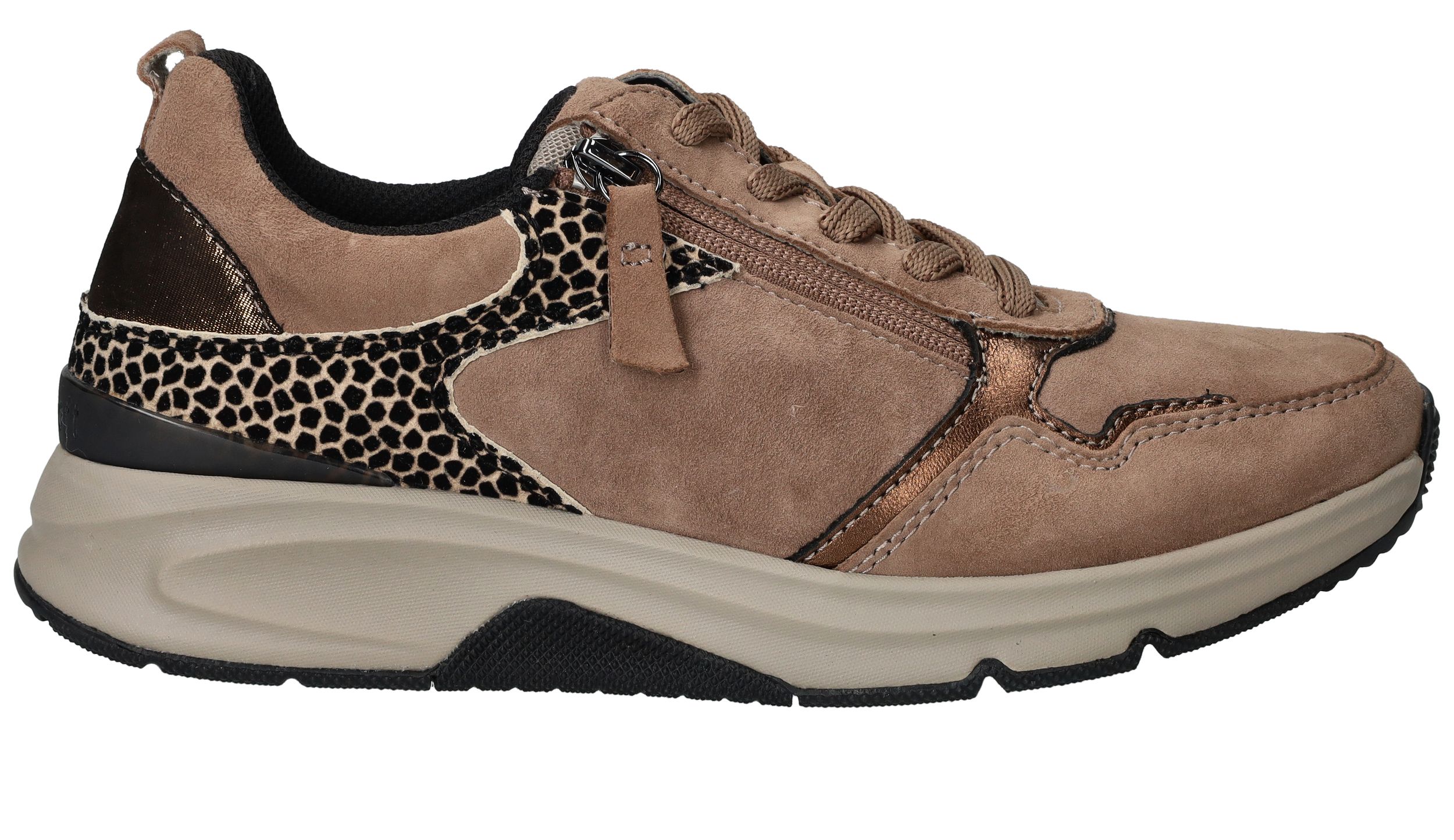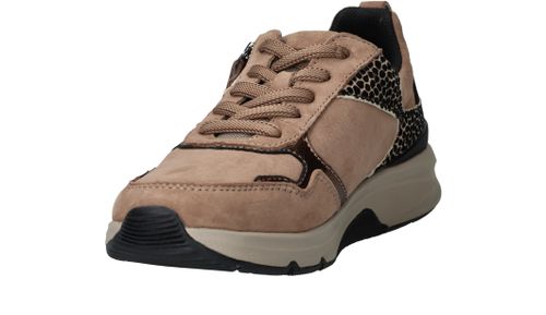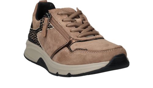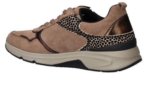 Ervaar optimaal draagcomfort met deze Gabor Rollingsoft sneaker voor dames. Door de lagen onder de voetboog krijgt je voet meer stabiliteit en heb je een optimale afwikkelbeweging. De sneaker heeft een donkere beige kleur en subtiele dierenprint.