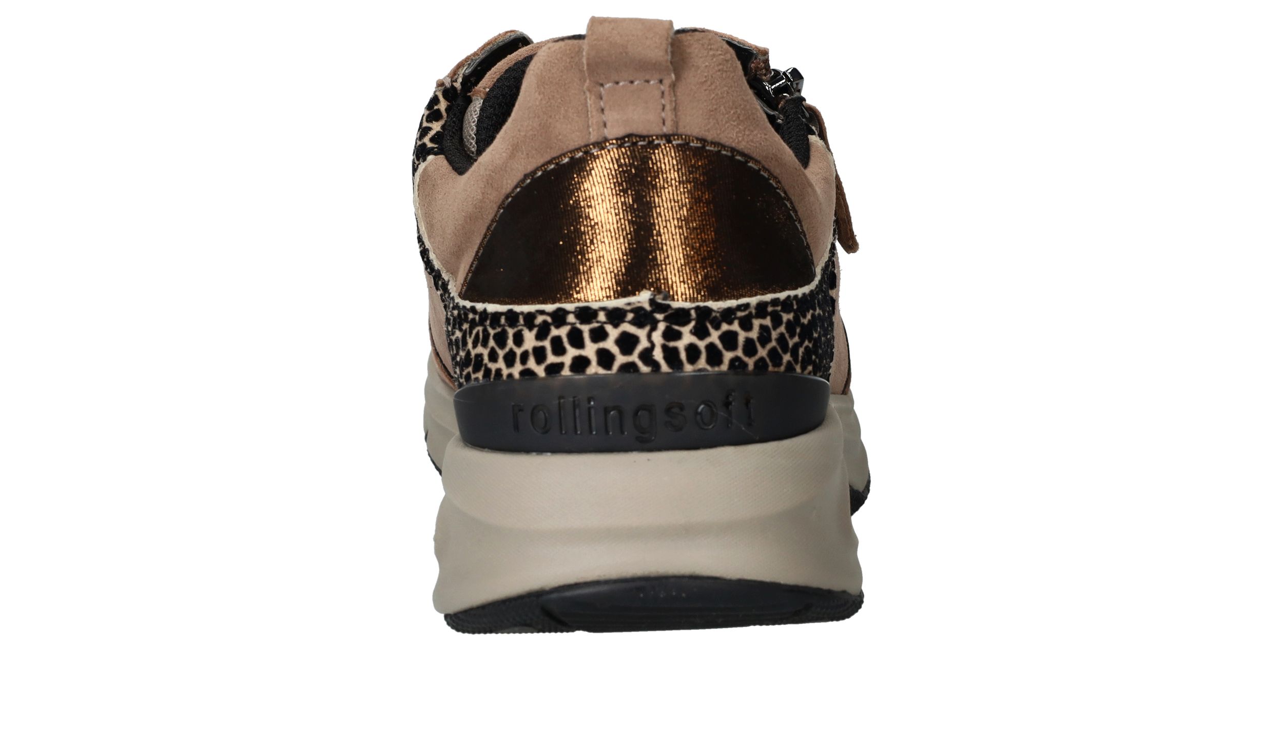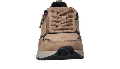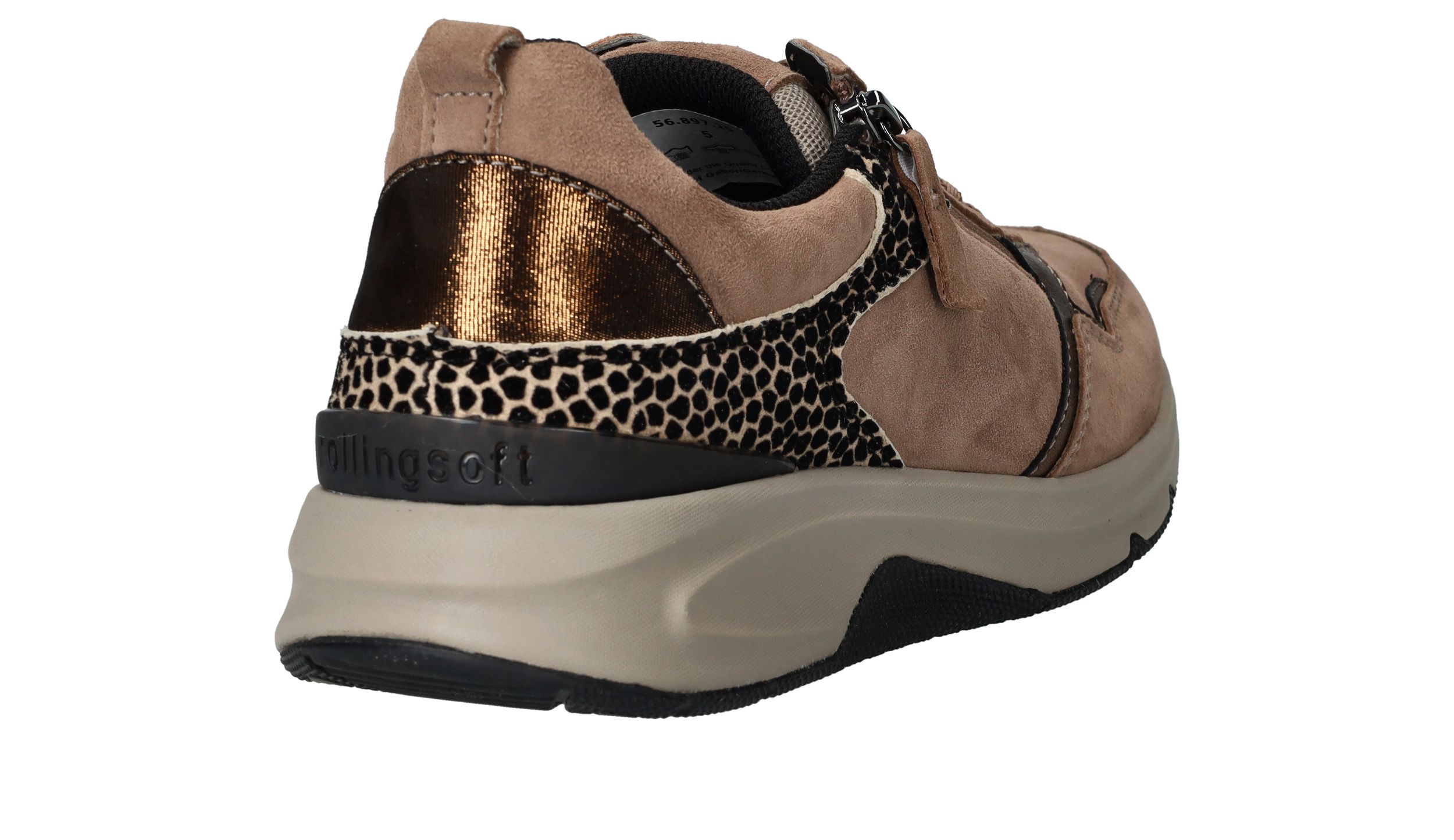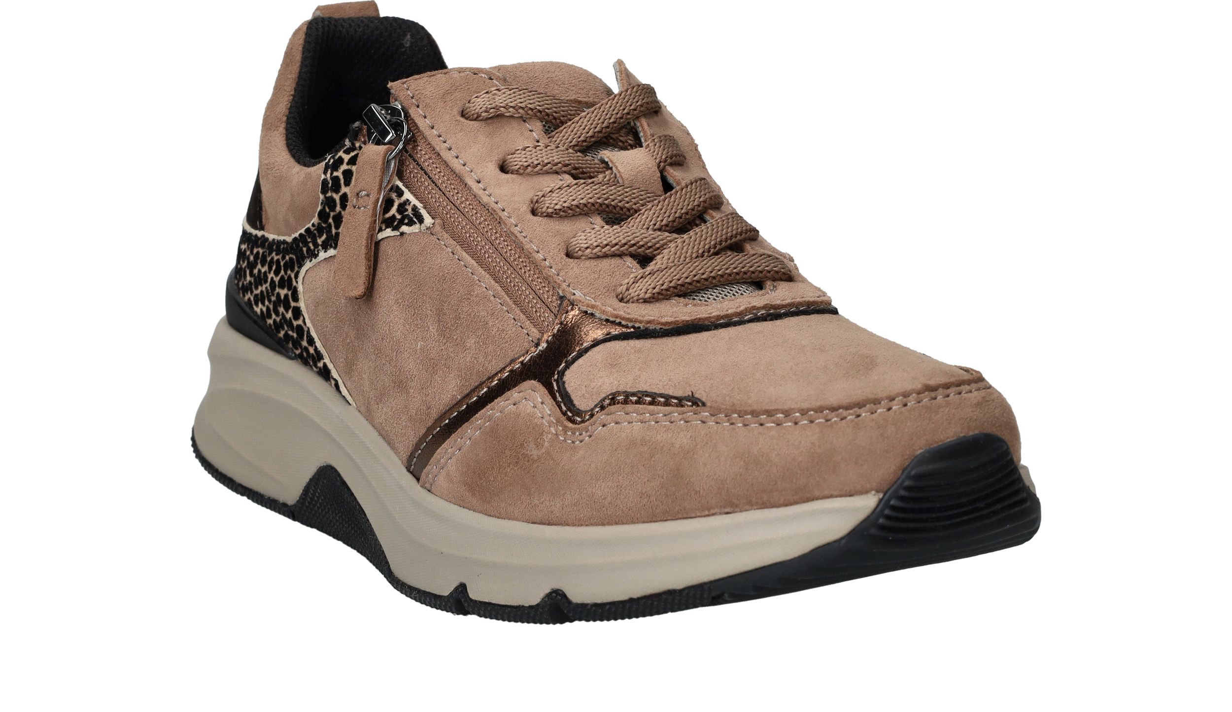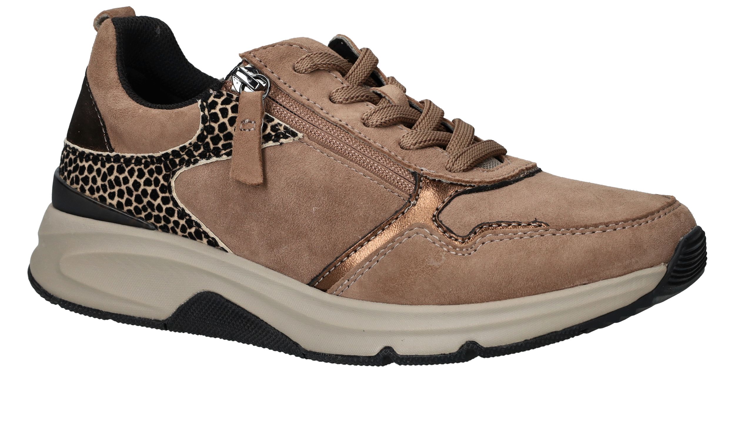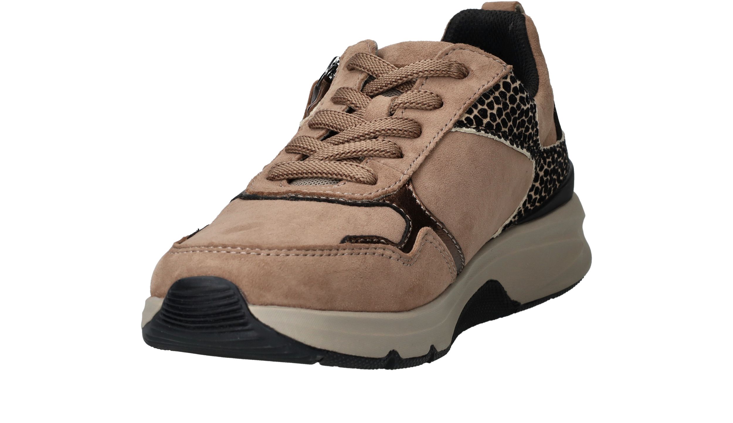 Ervaar optimaal draagcomfort met deze Gabor Rollingsoft sneaker voor dames. Door de lagen onder de voetboog krijgt je voet meer stabiliteit en heb je een optimale afwikkelbeweging. De sneaker heeft een donkere beige kleur en subtiele dierenprint.
