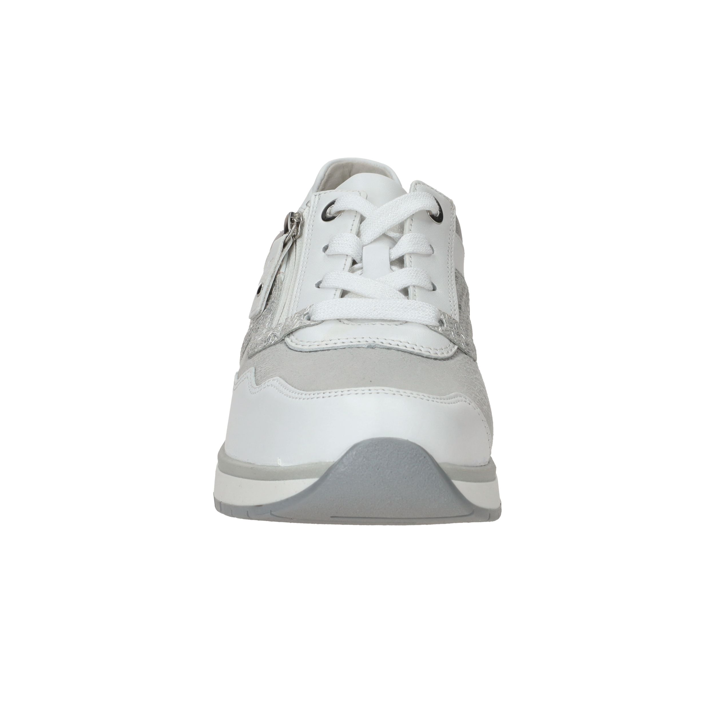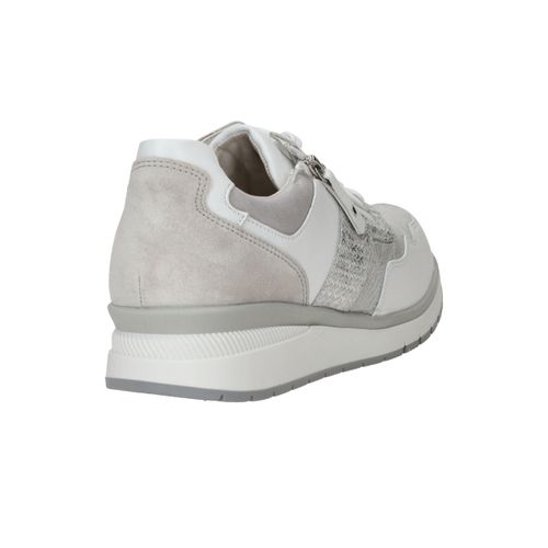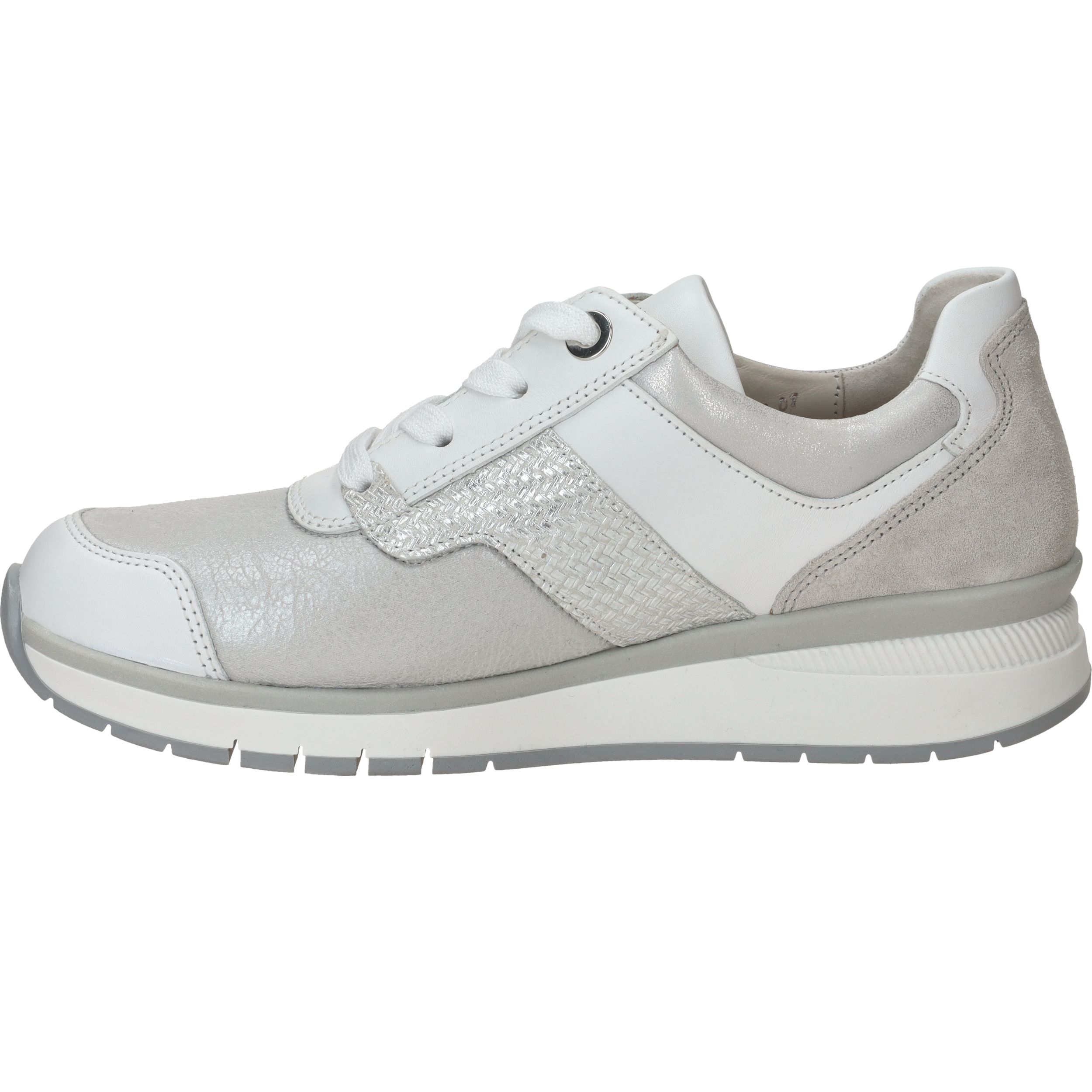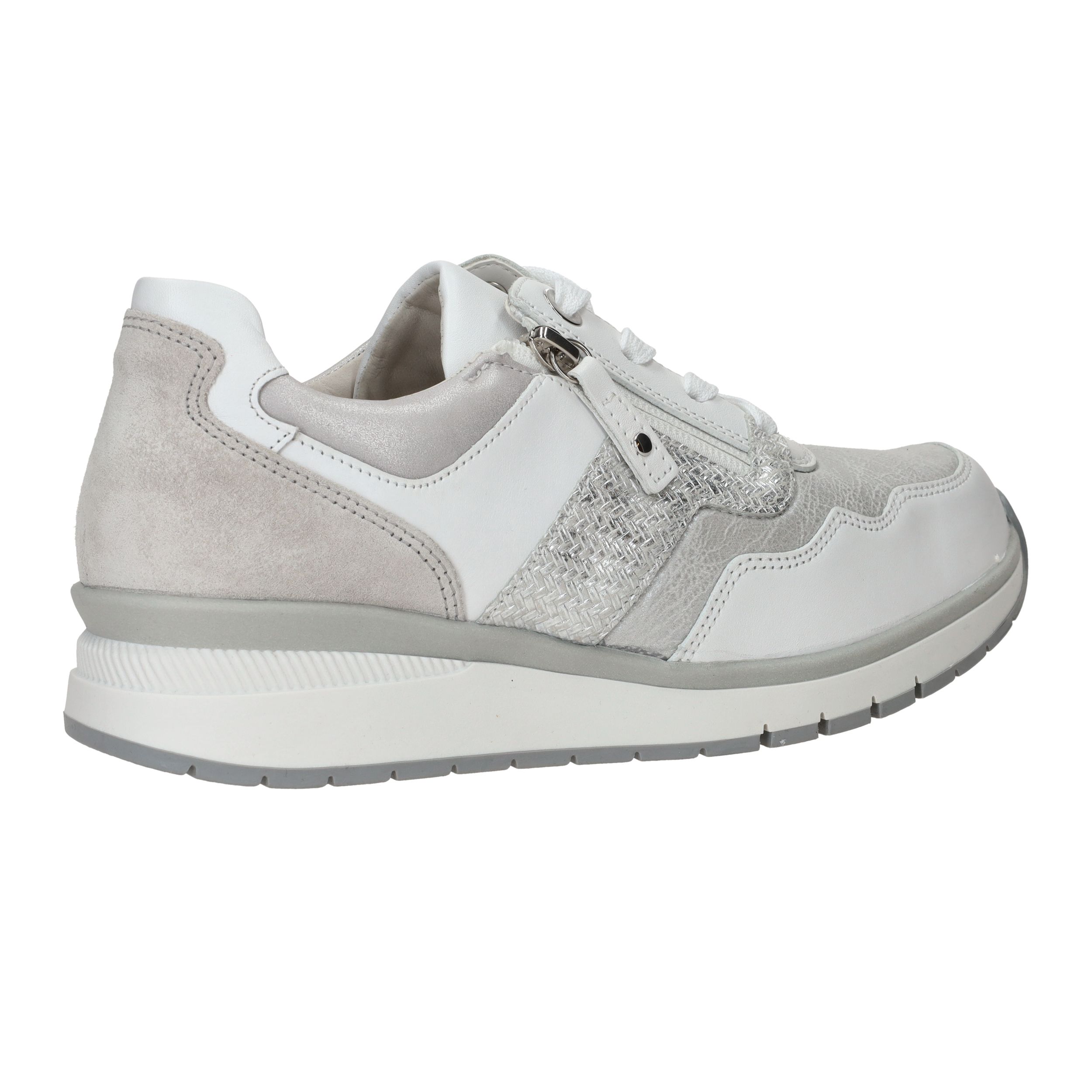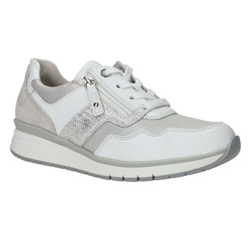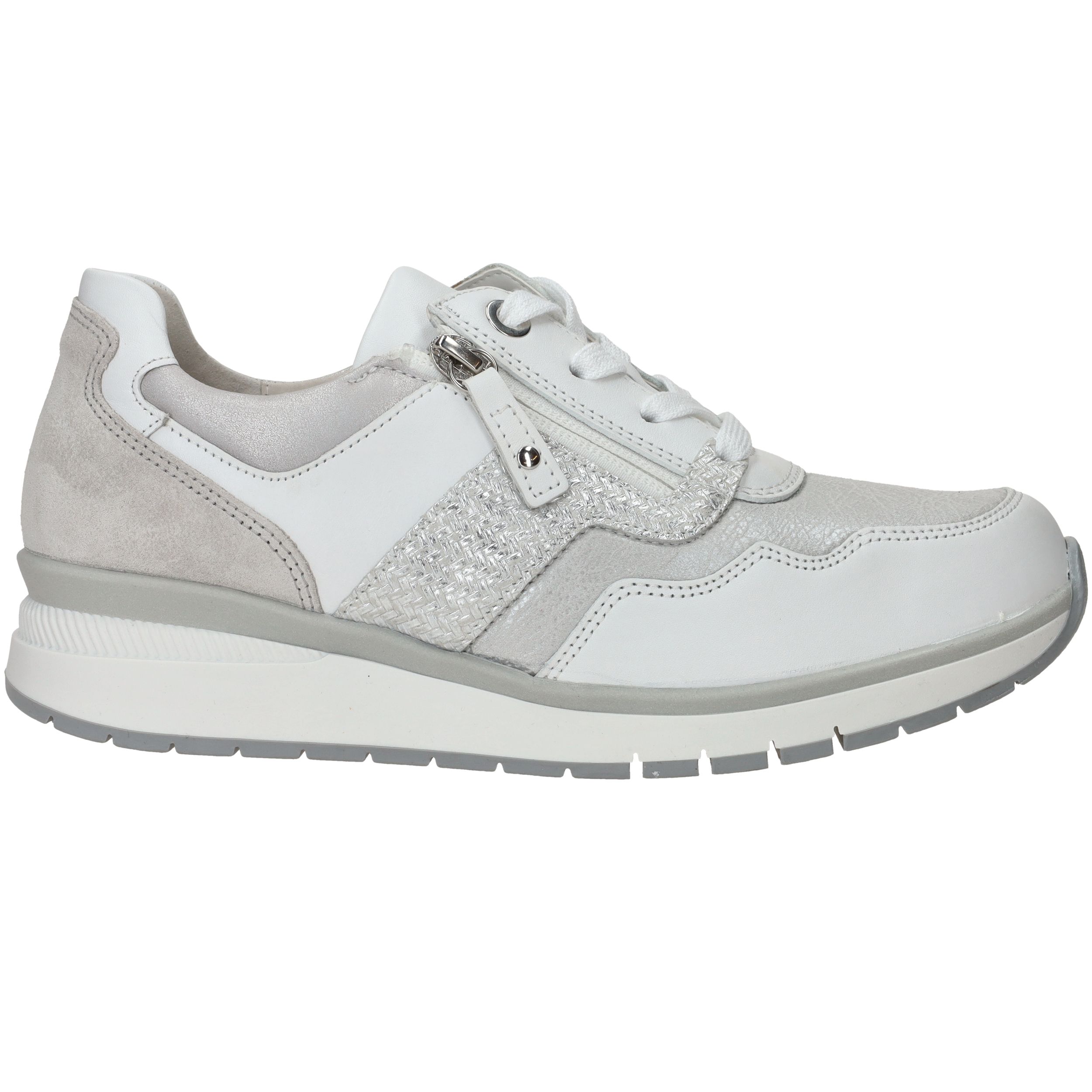 Comfortabele witte damessneaker van Gabor met metallic zilveren accenten. De neus van deze sneaker is gemaakt van stretchmateriaal waardoor de tenen meer ruimte krijgen.