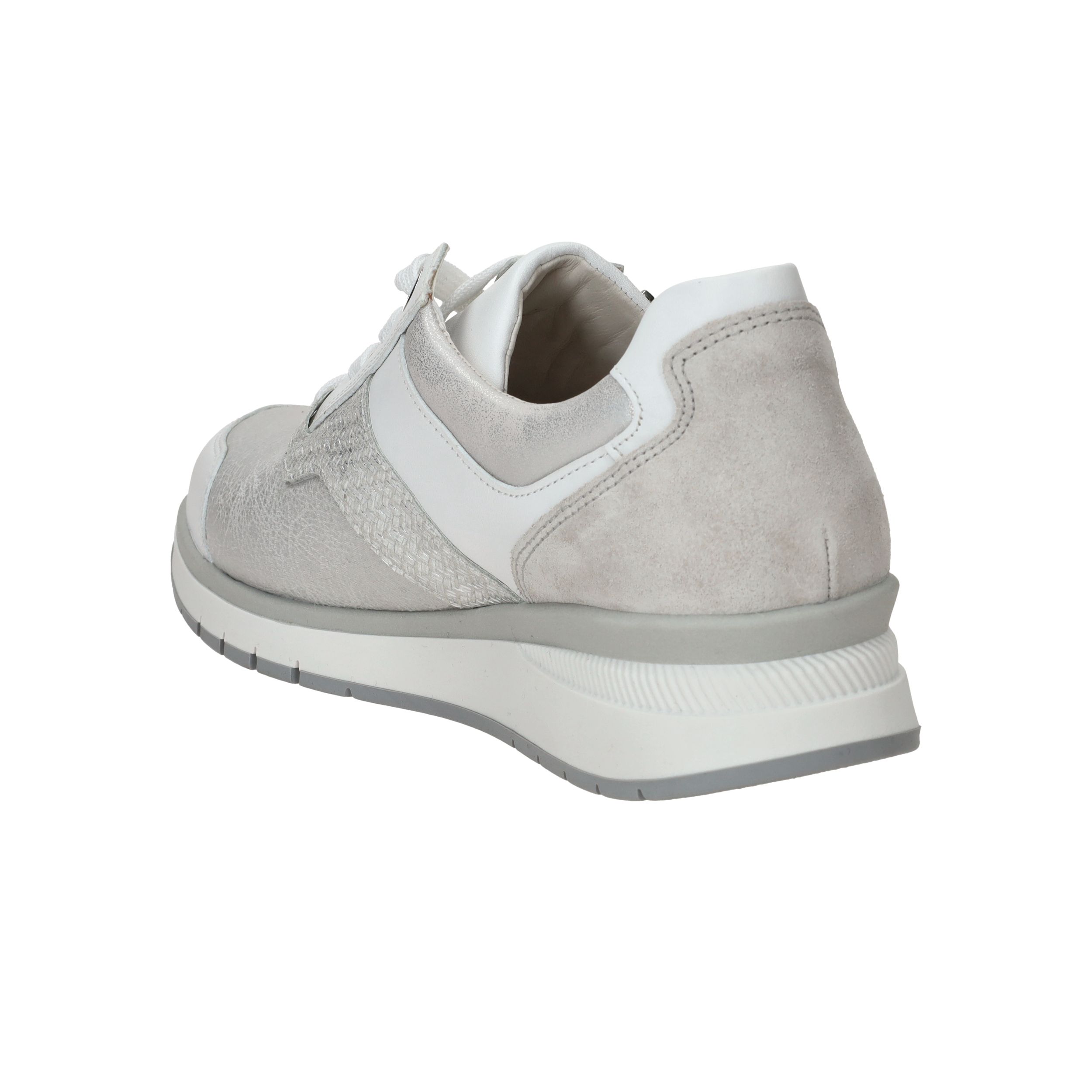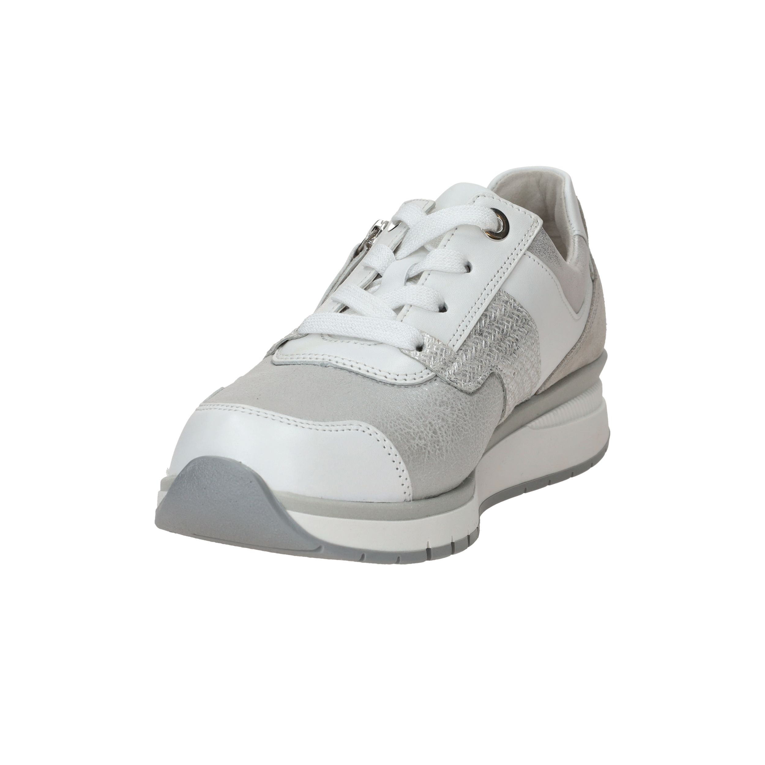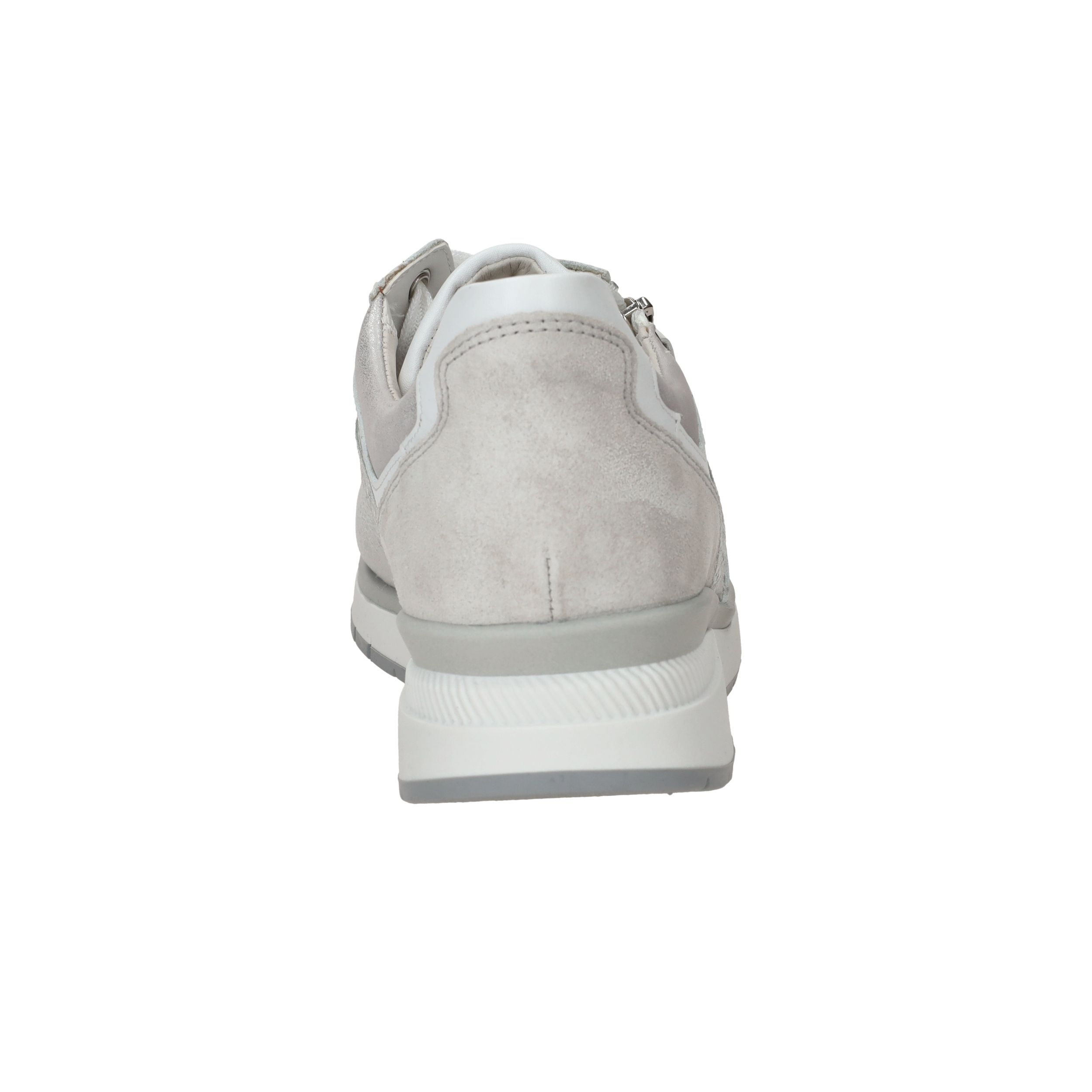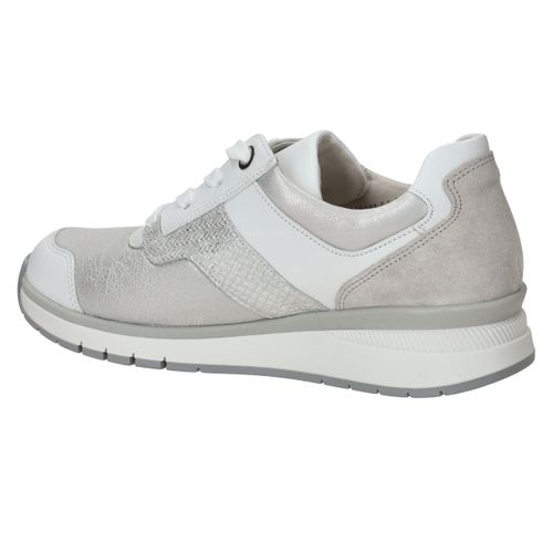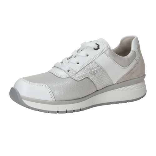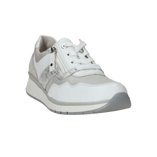 Comfortabele witte damessneaker van Gabor met metallic zilveren accenten. De neus van deze sneaker is gemaakt van stretchmateriaal waardoor de tenen meer ruimte krijgen.