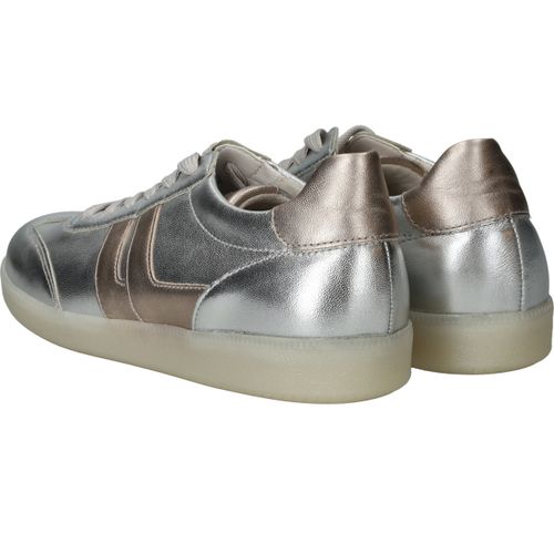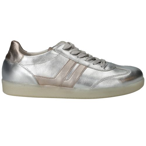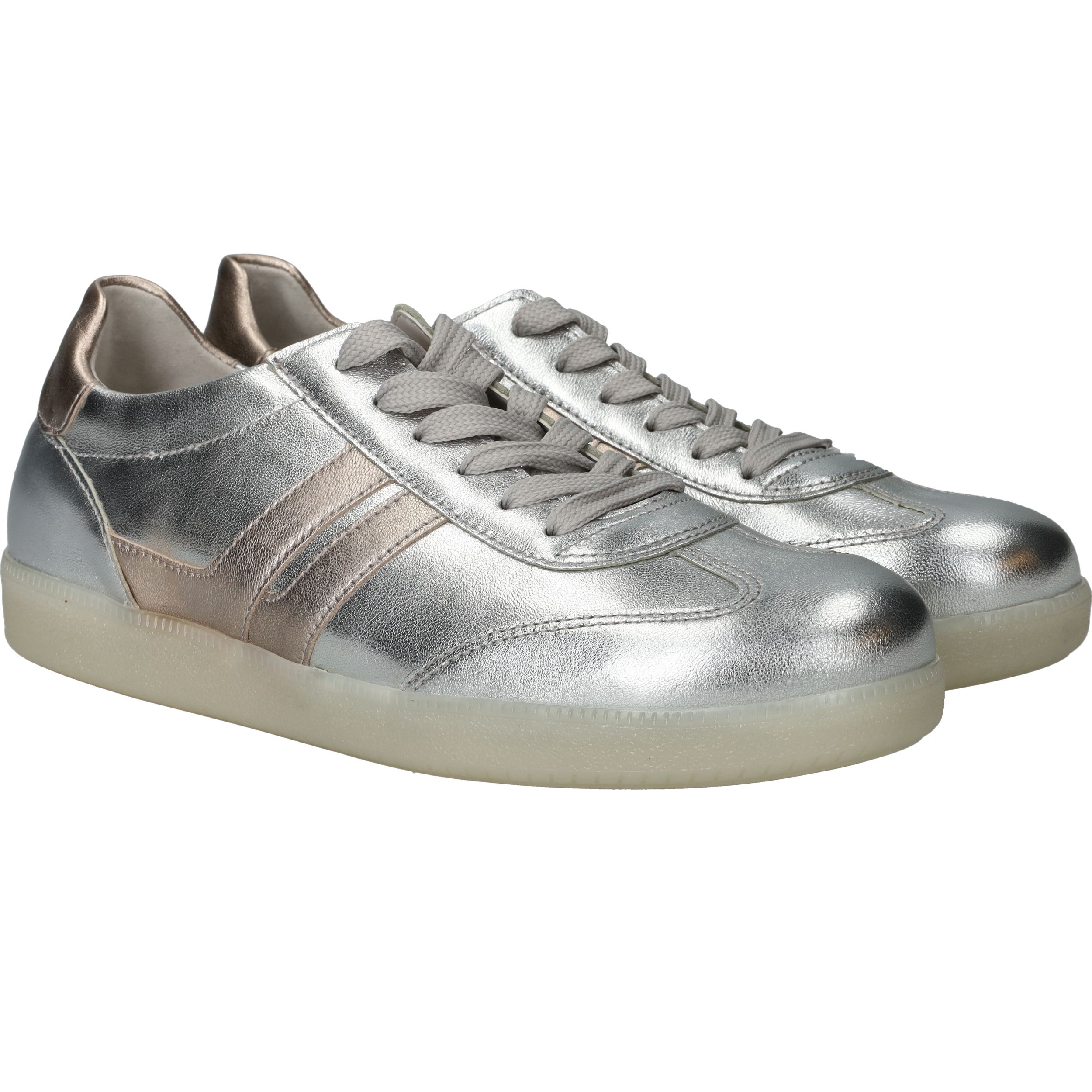 Met deze sportieve Gabor sneaker val je zeker op! De metallic zilveren sneaker heeft gouden details en een lichte zool.