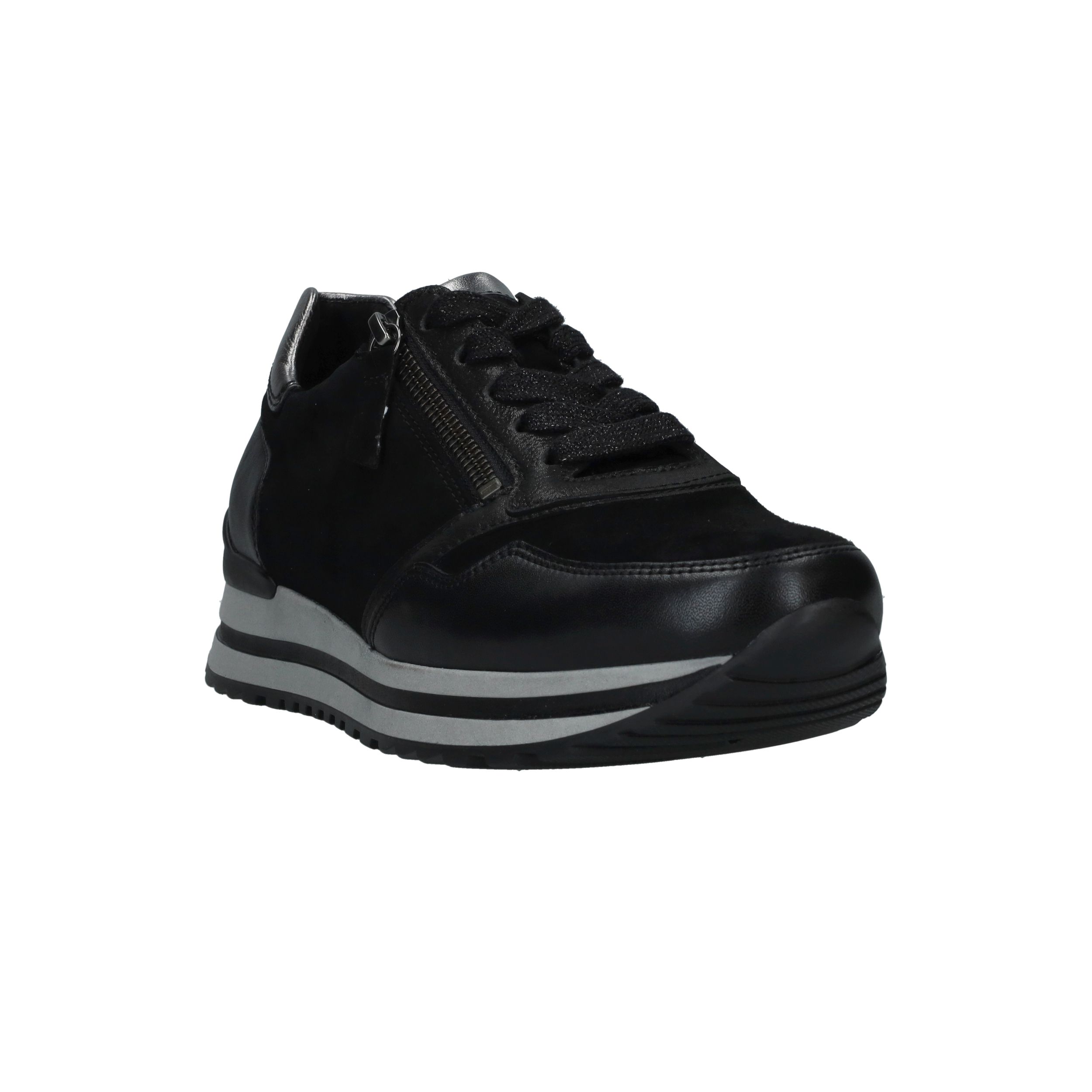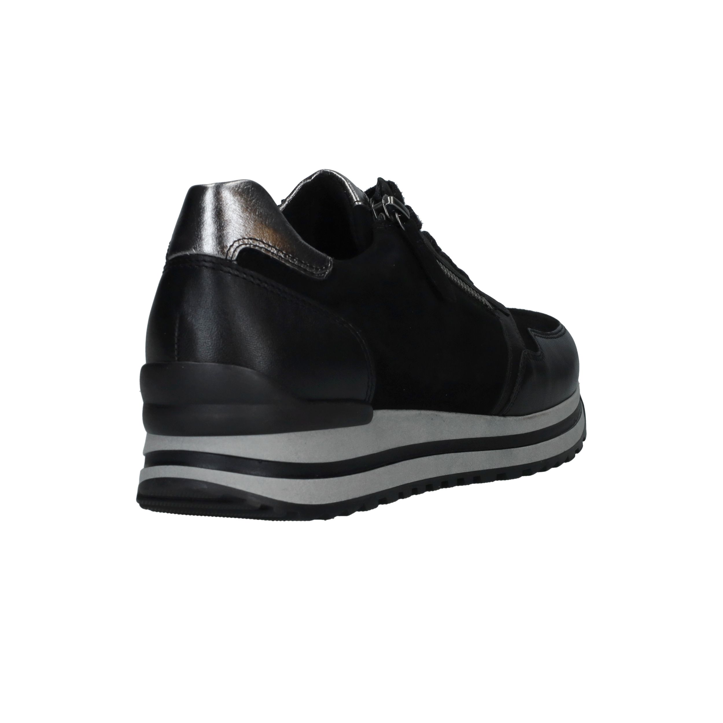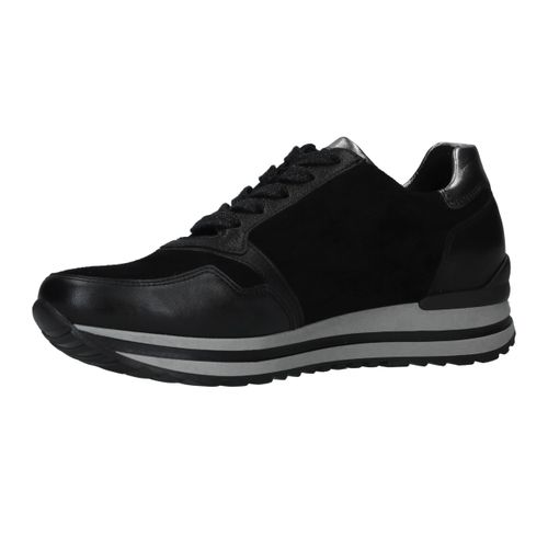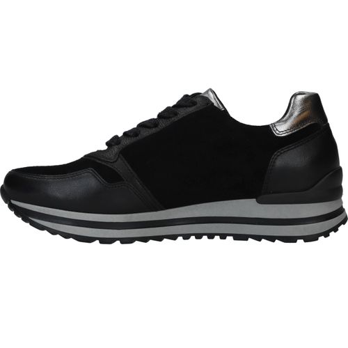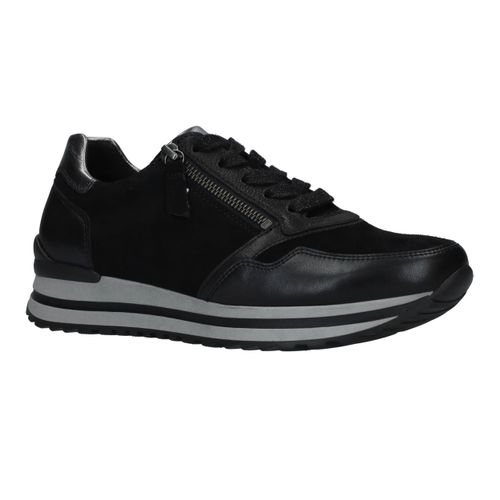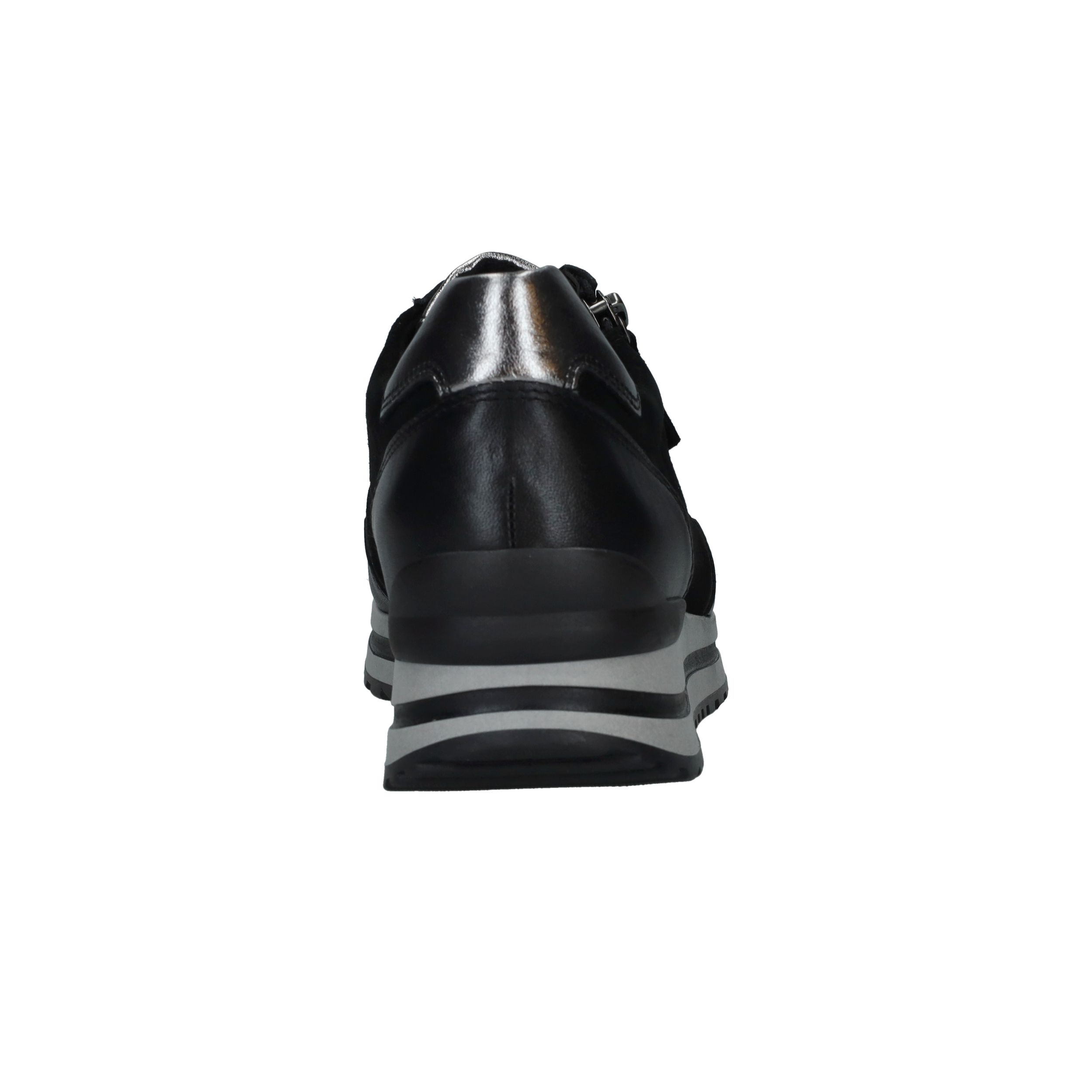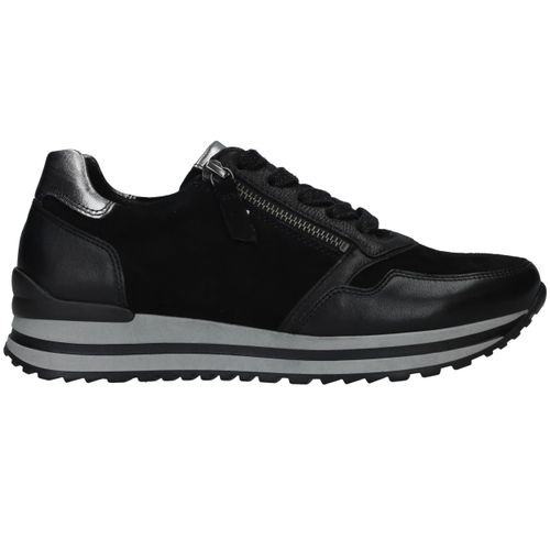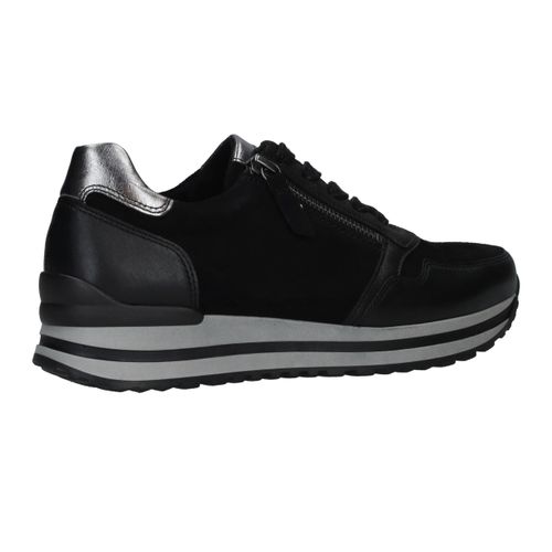 Deze elegante dames sneakers van Gabor combineren stijl en comfort op een geraffineerde manier. De zwarte kleur in combinatie met glanzende metallic accenten en de mix van leer en suède geeft deze sneaker een chique en sportieve uitstraling. Dankzij de ritssluiting én de extra brede voetwijdte H geniet je van een comfortabele en gemakkelijke instap.
