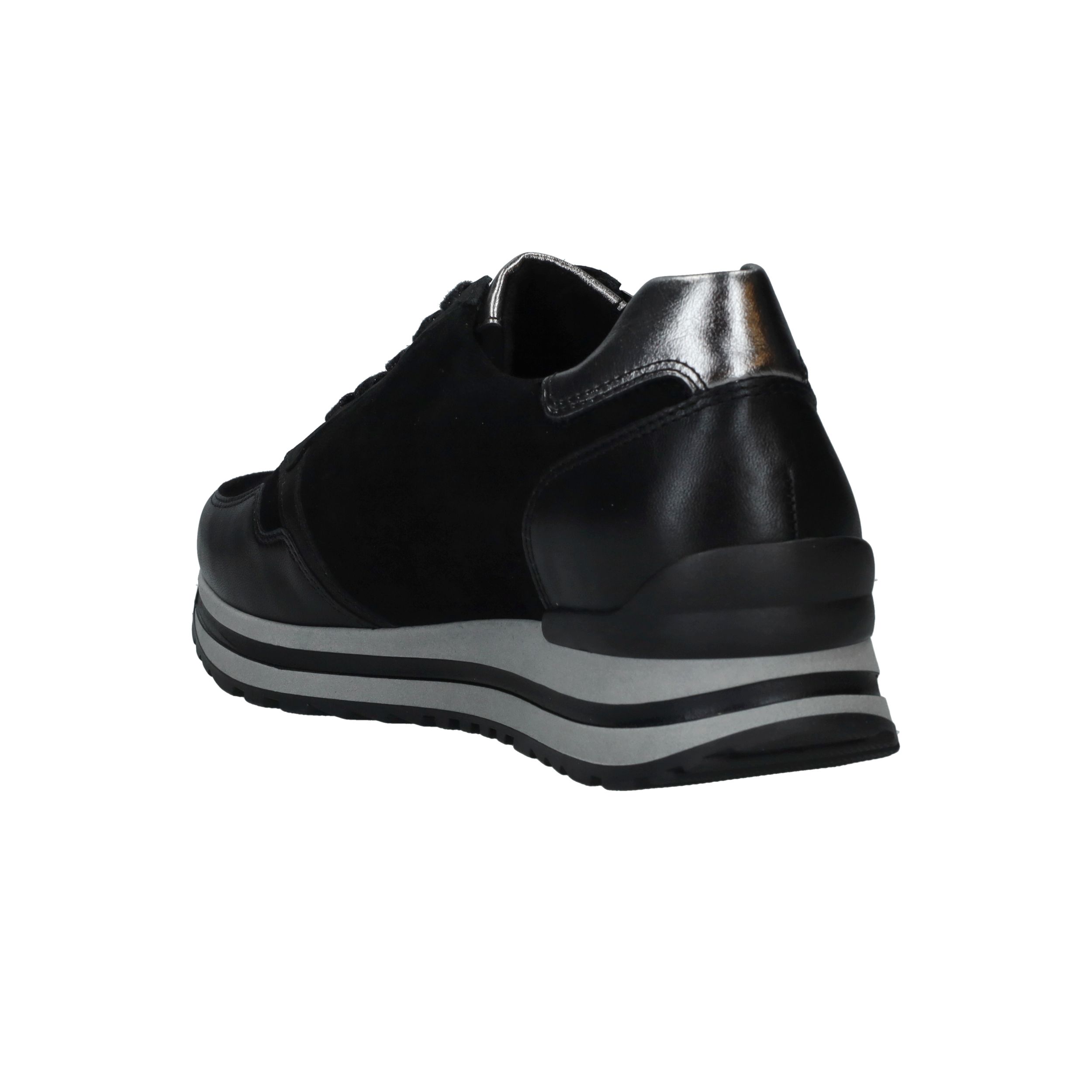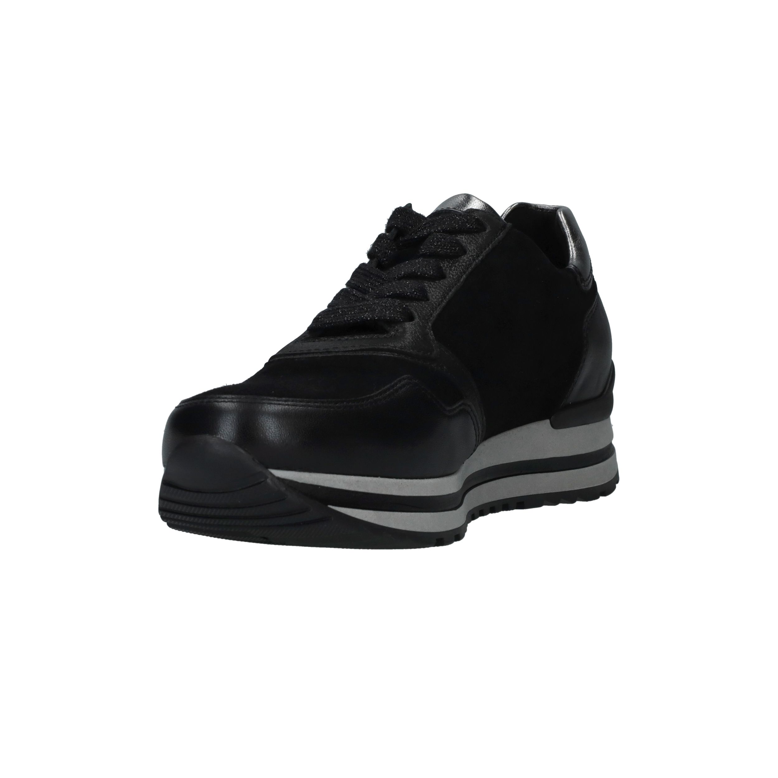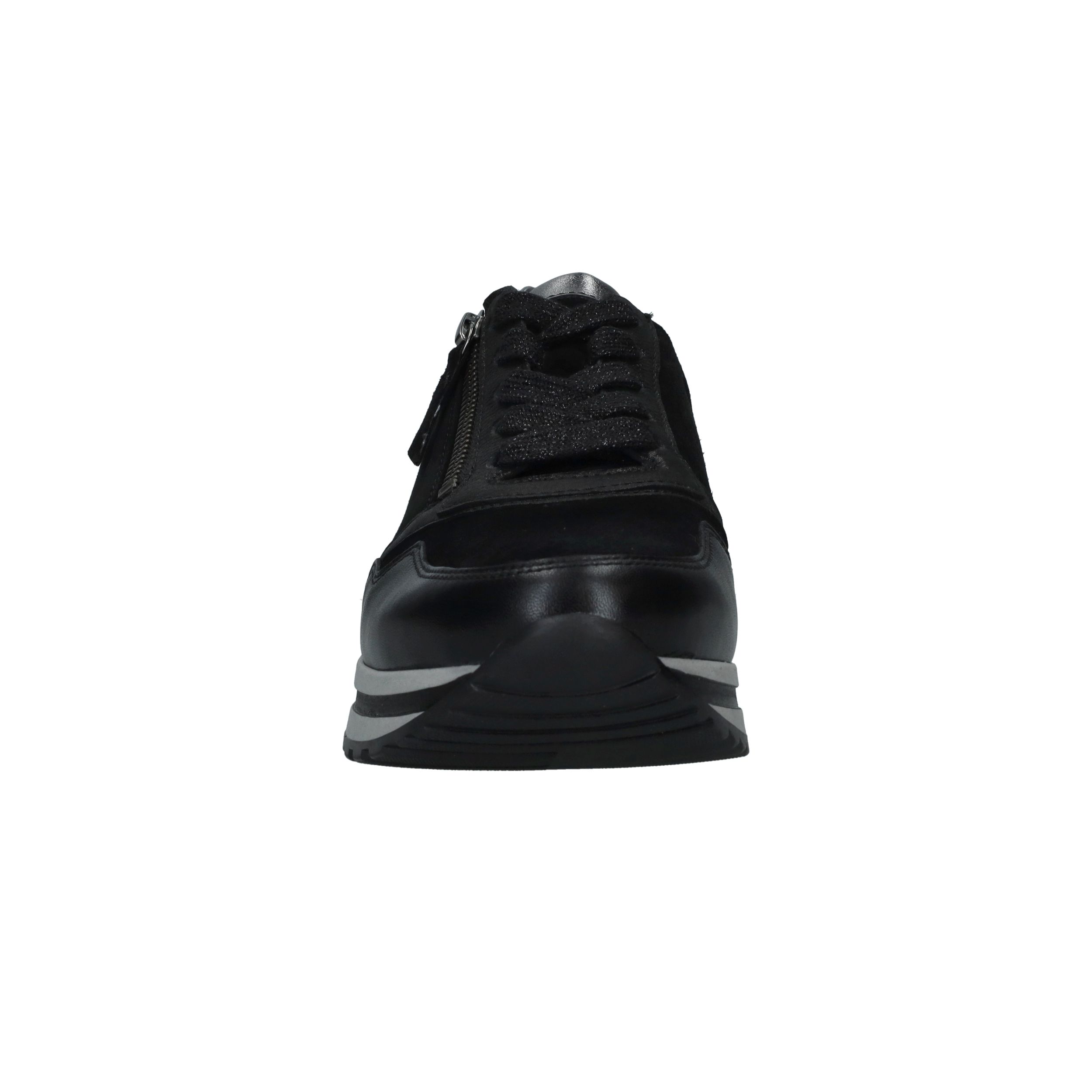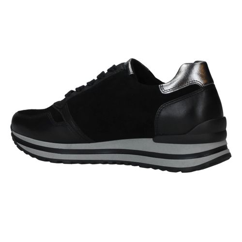 Deze elegante dames sneakers van Gabor combineren stijl en comfort op een geraffineerde manier. De zwarte kleur in combinatie met glanzende metallic accenten en de mix van leer en suède geeft deze sneaker een chique en sportieve uitstraling. Dankzij de ritssluiting én de extra brede voetwijdte H geniet je van een comfortabele en gemakkelijke instap.