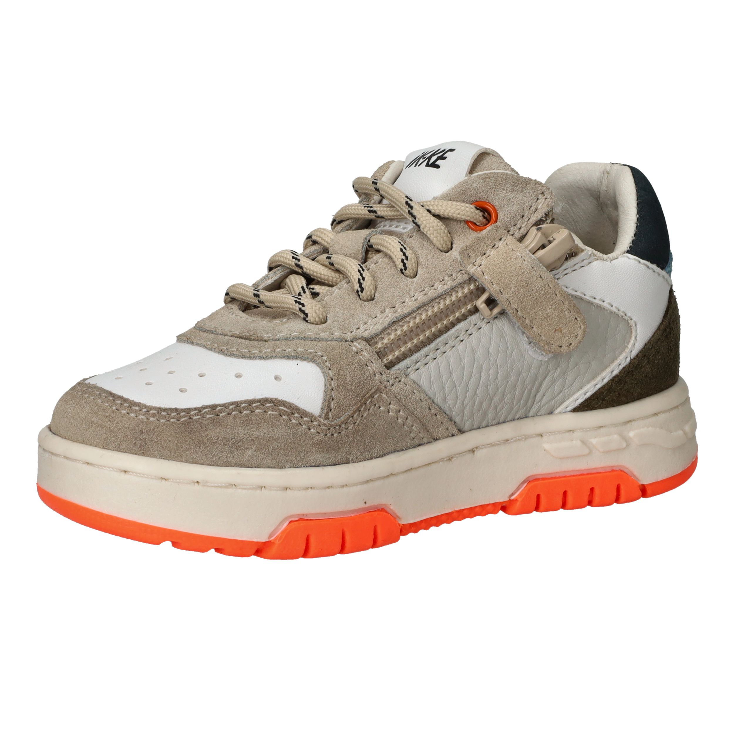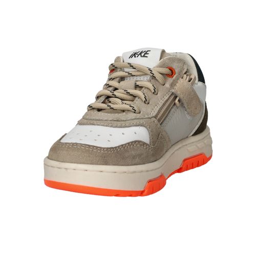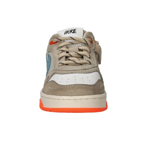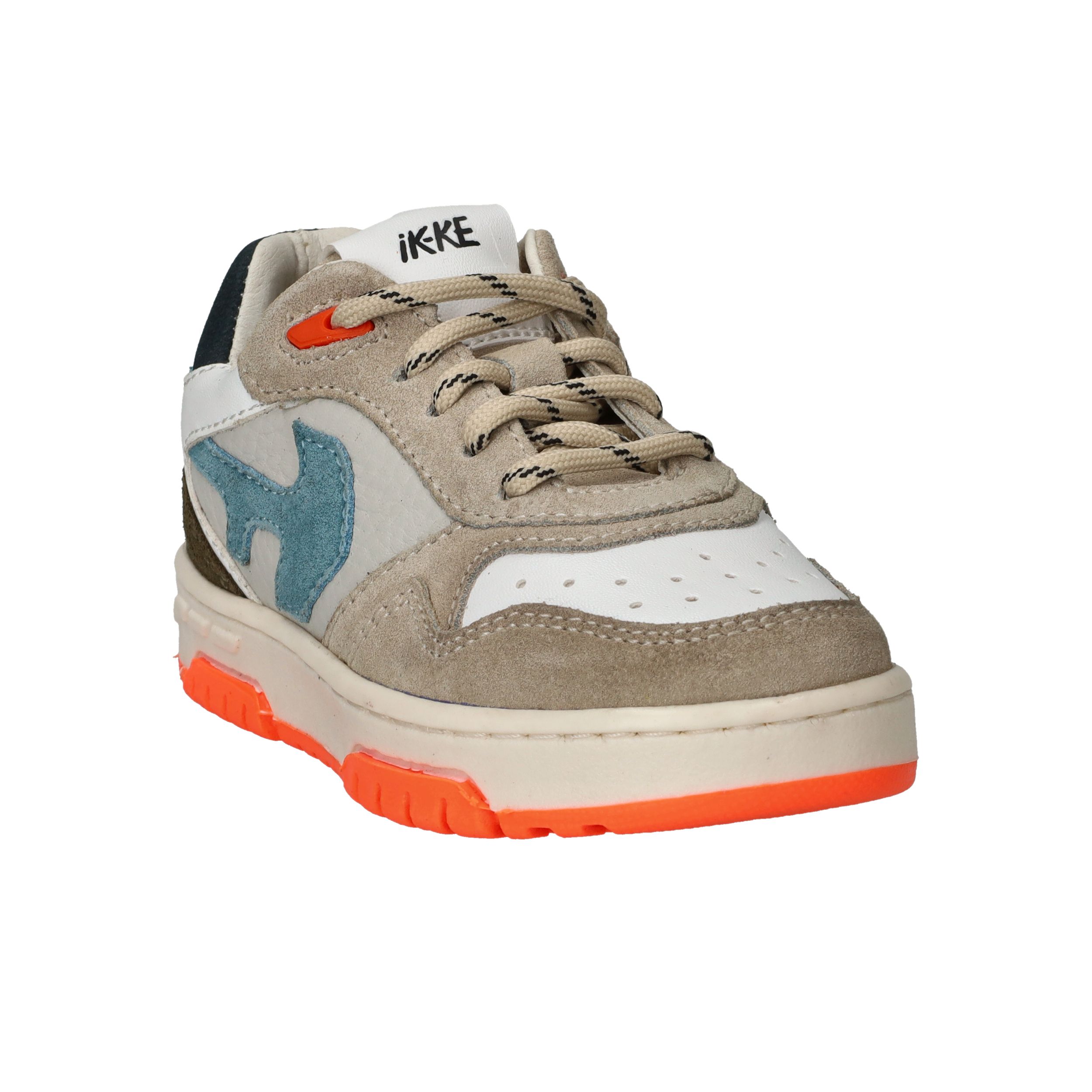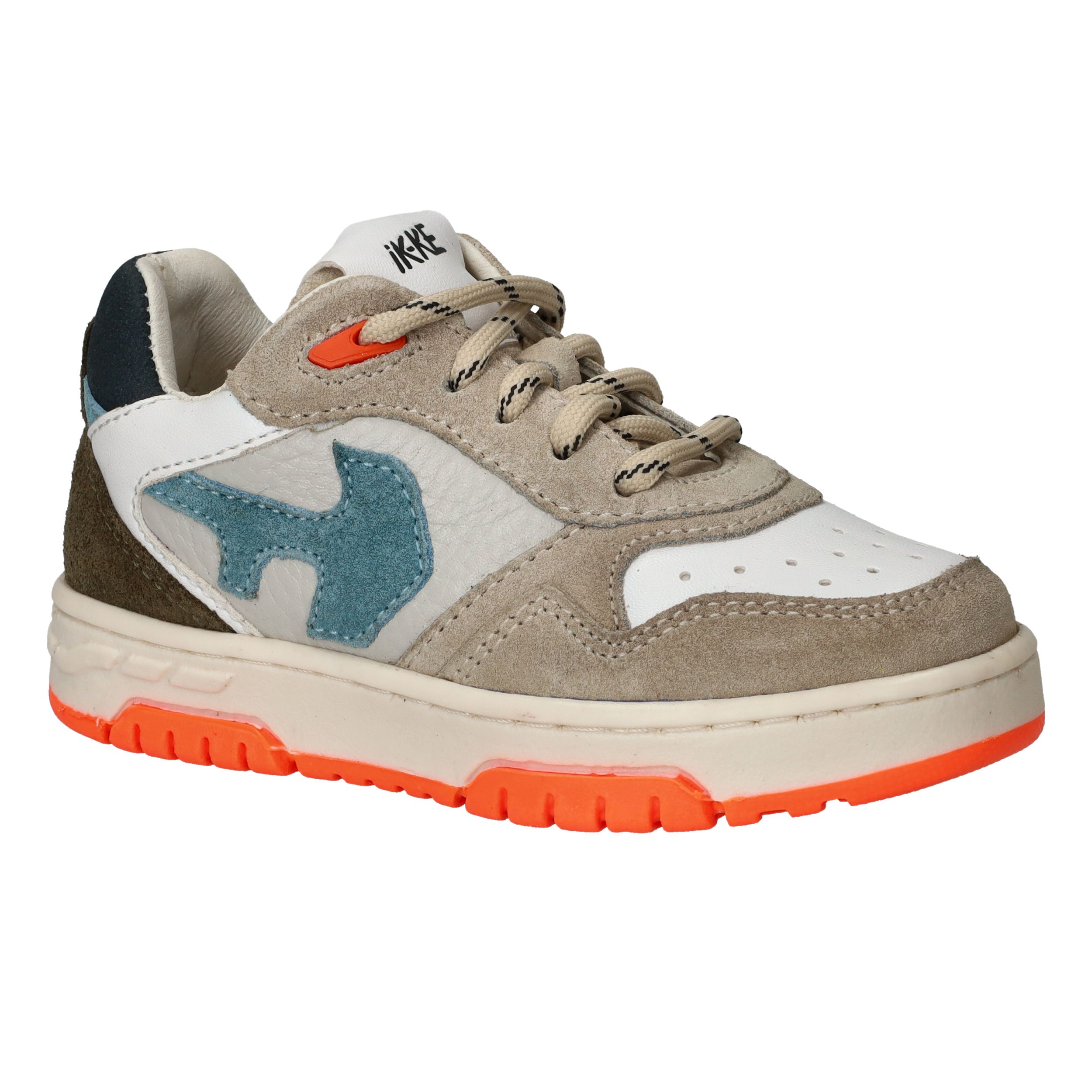Stoere IK-KE jongenssneaker in het beige. De sneaker heeft leuke gekleurde details en een flitsende oranje zool.