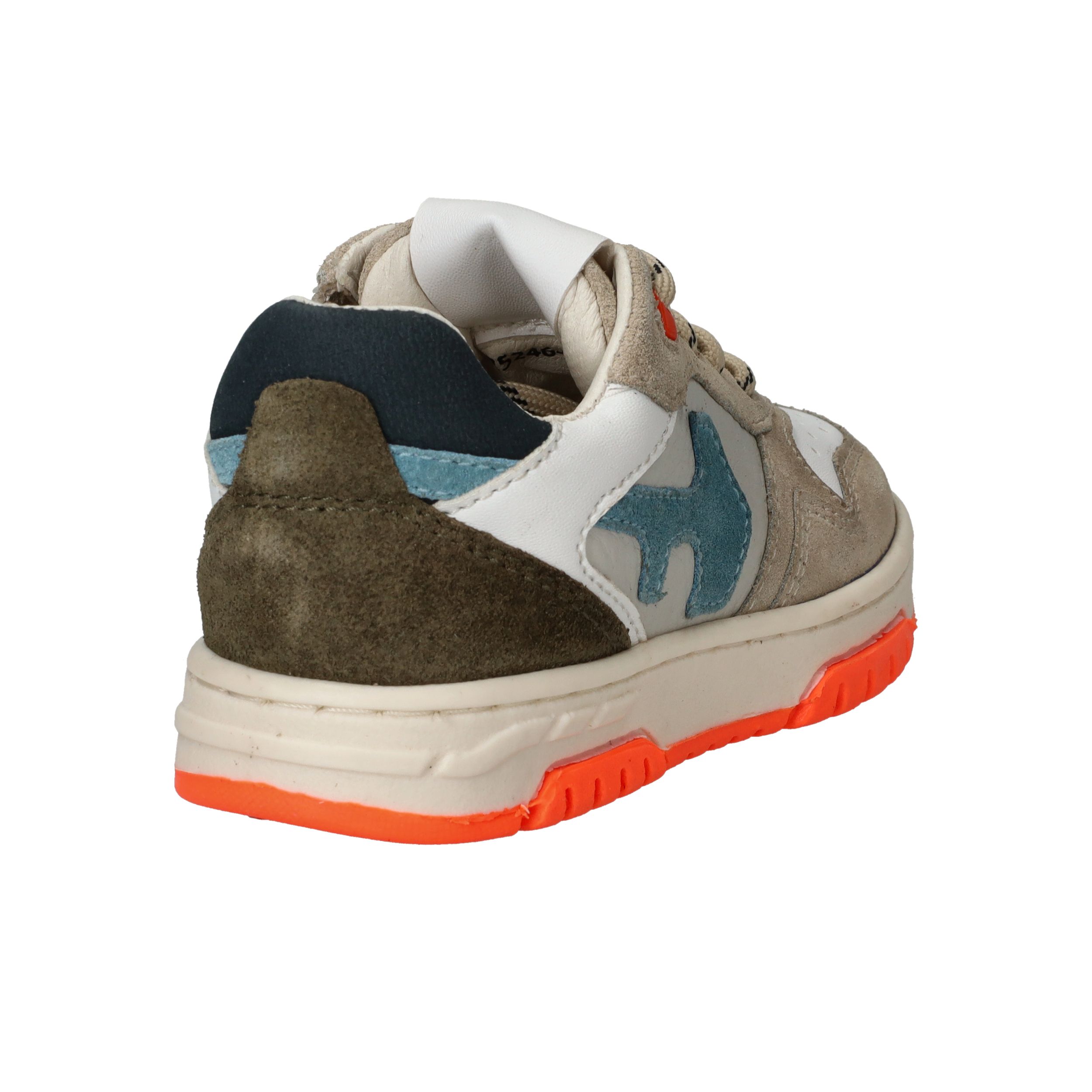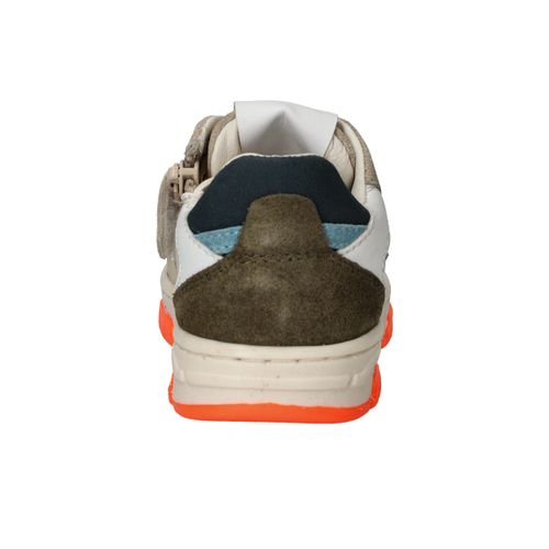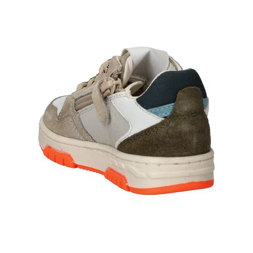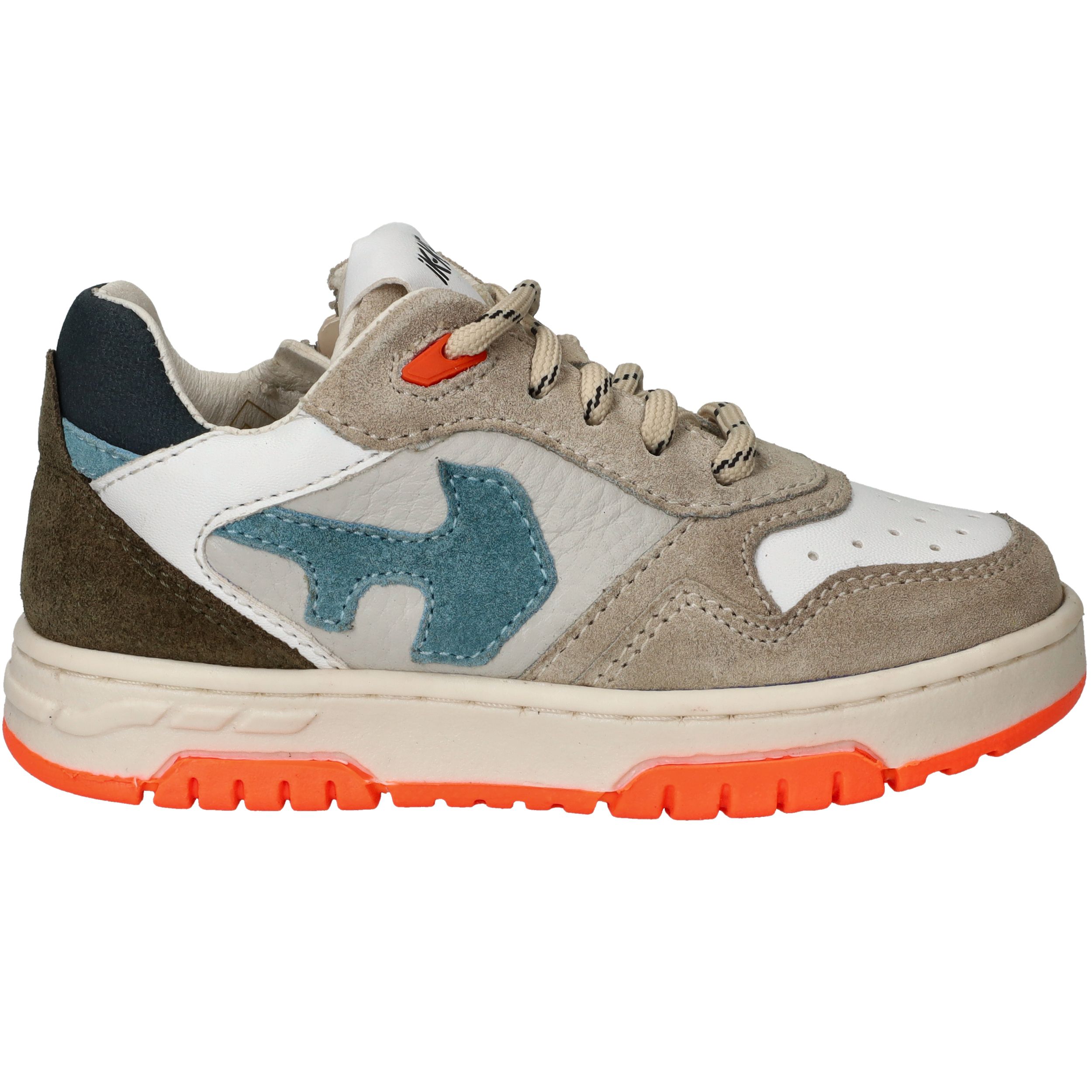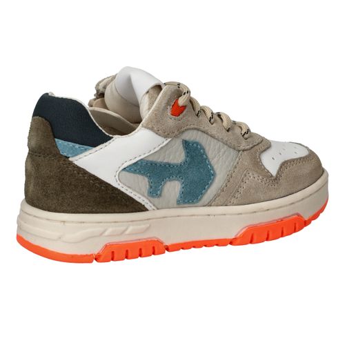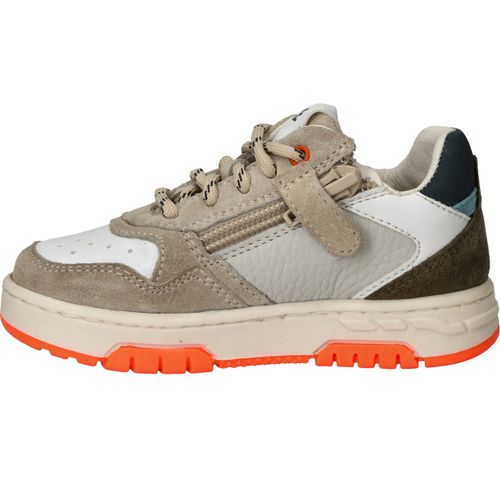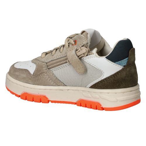 Stoere IK-KE jongenssneaker in het beige. De sneaker heeft leuke gekleurde details en een flitsende oranje zool.