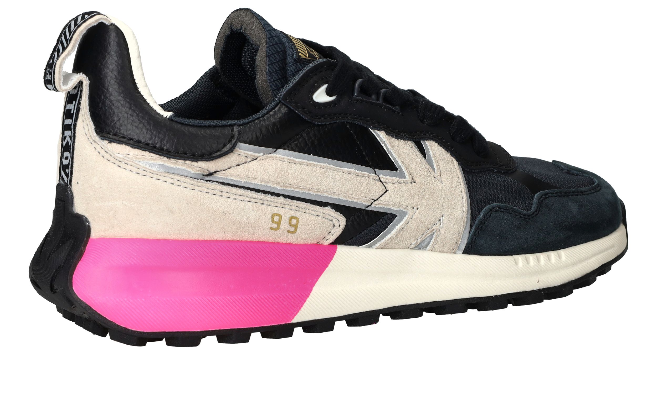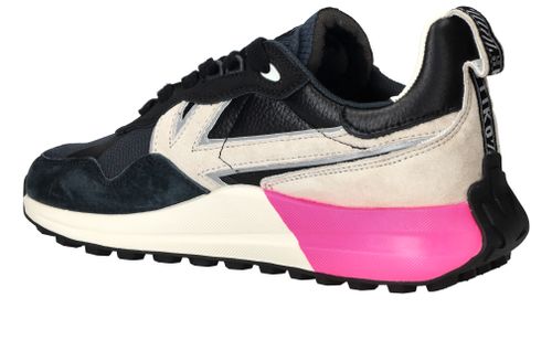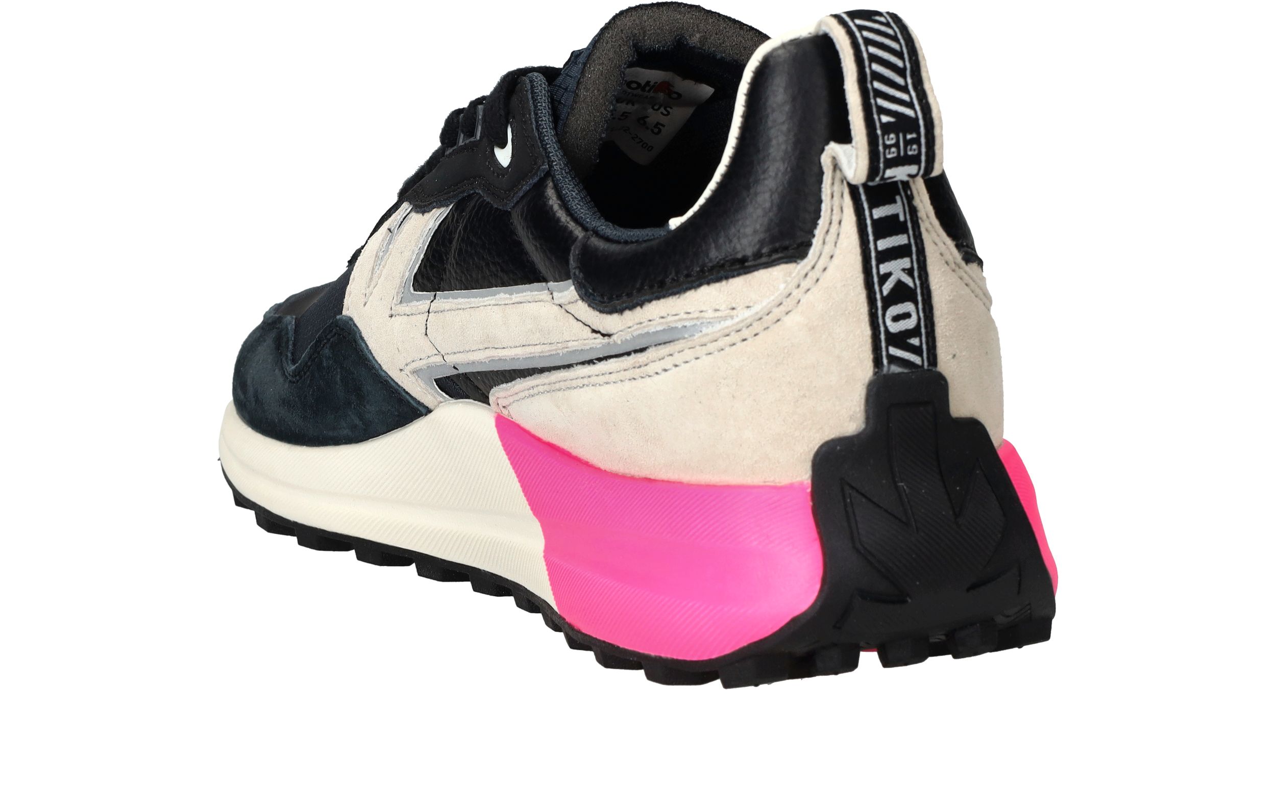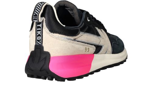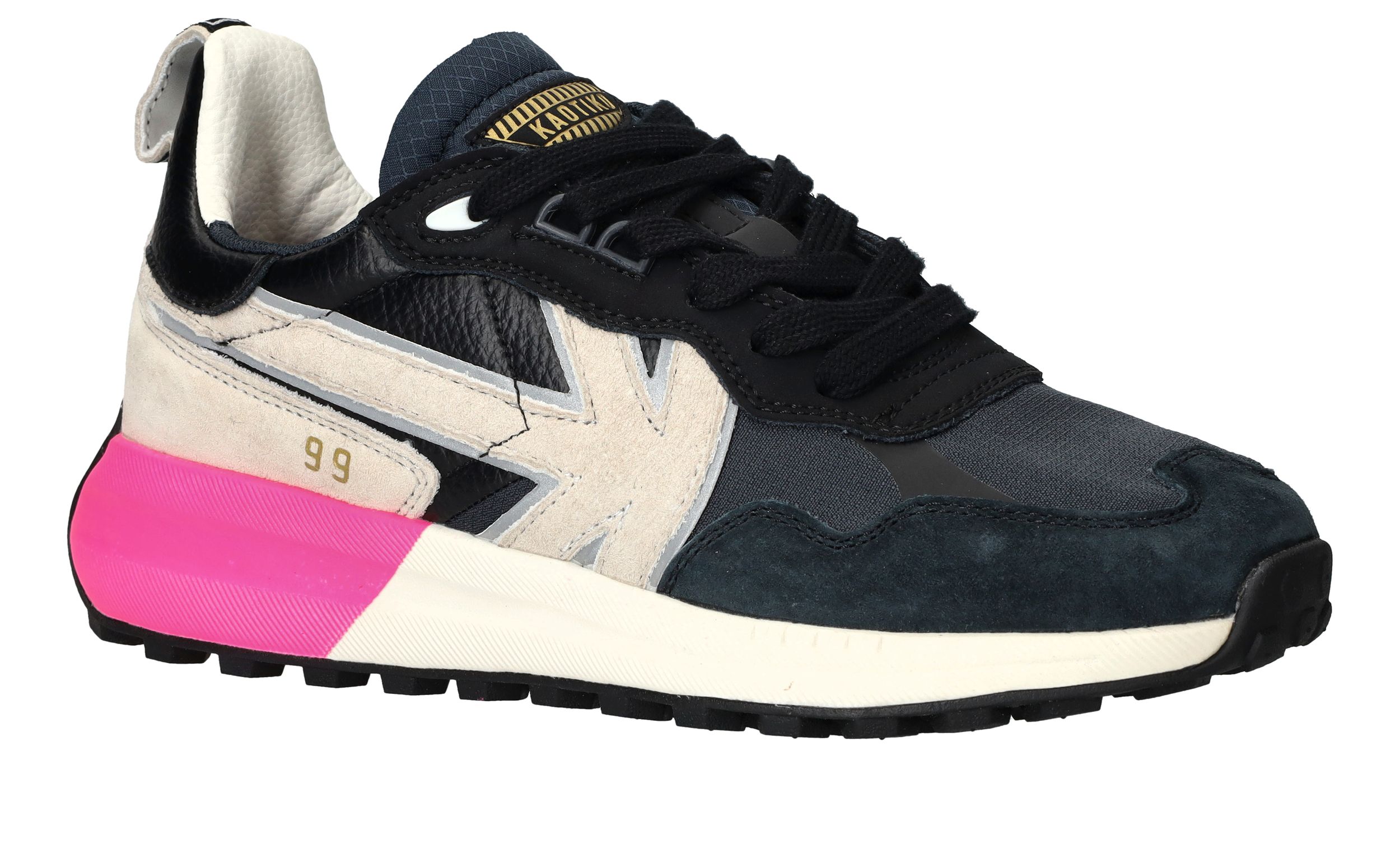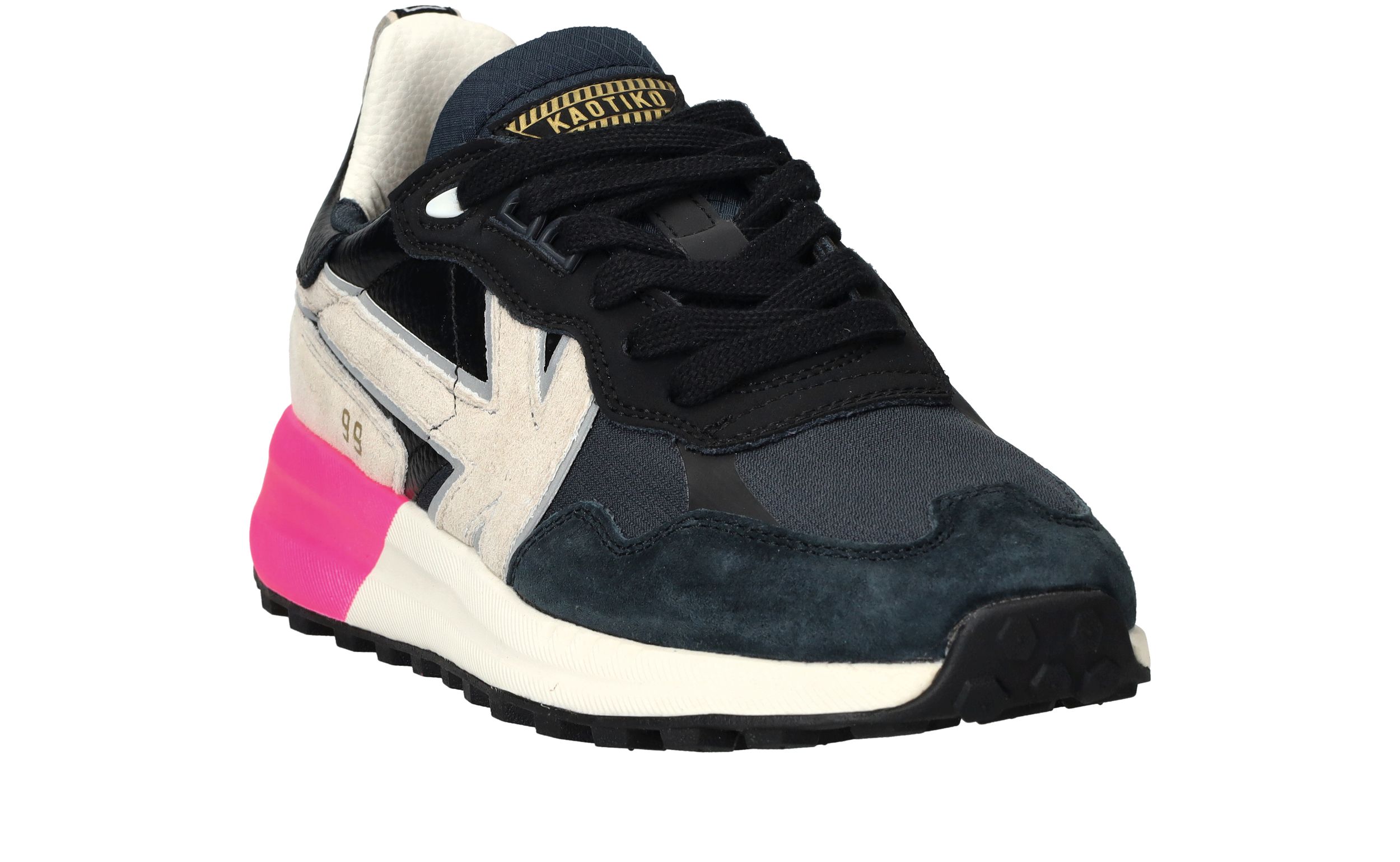 Chunky Kaotiko sneaker voor dames in het zwart met blauwe en neon roze accenten. De sneaker loopt heel comfortabel omdat hij heel licht van gewicht is.