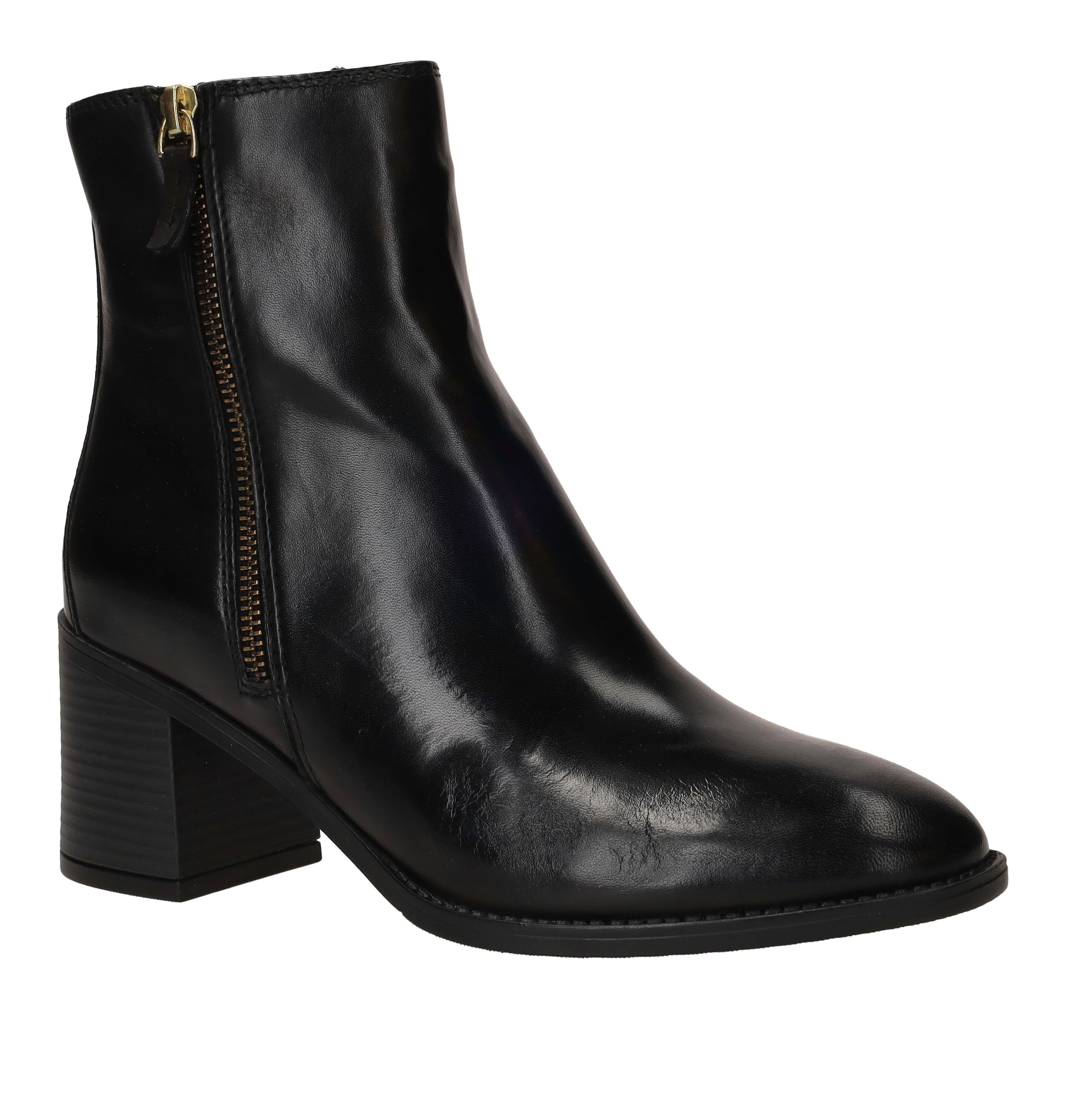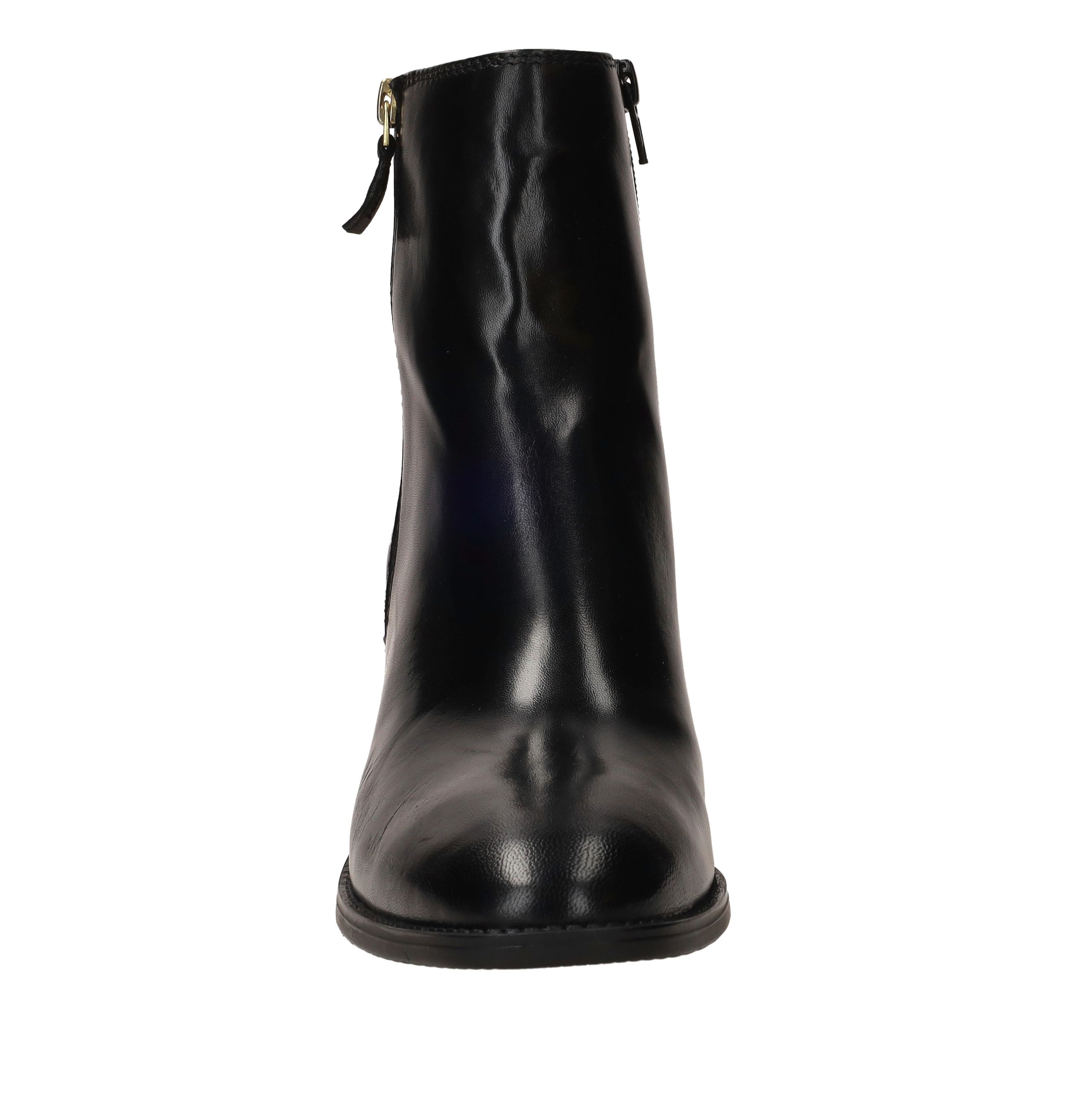 Mooi zwart LOFF 1881 enkellaarsje voor dames. De enkellaars is gemaakt van leer en heeft een gouden sierrits aan de buitenkant.