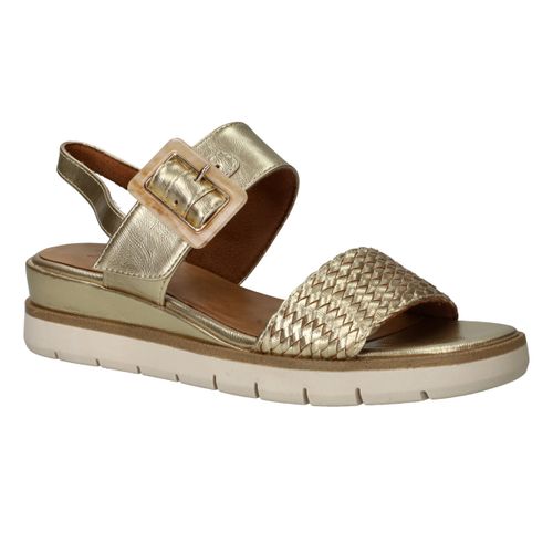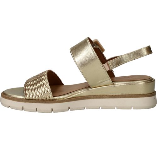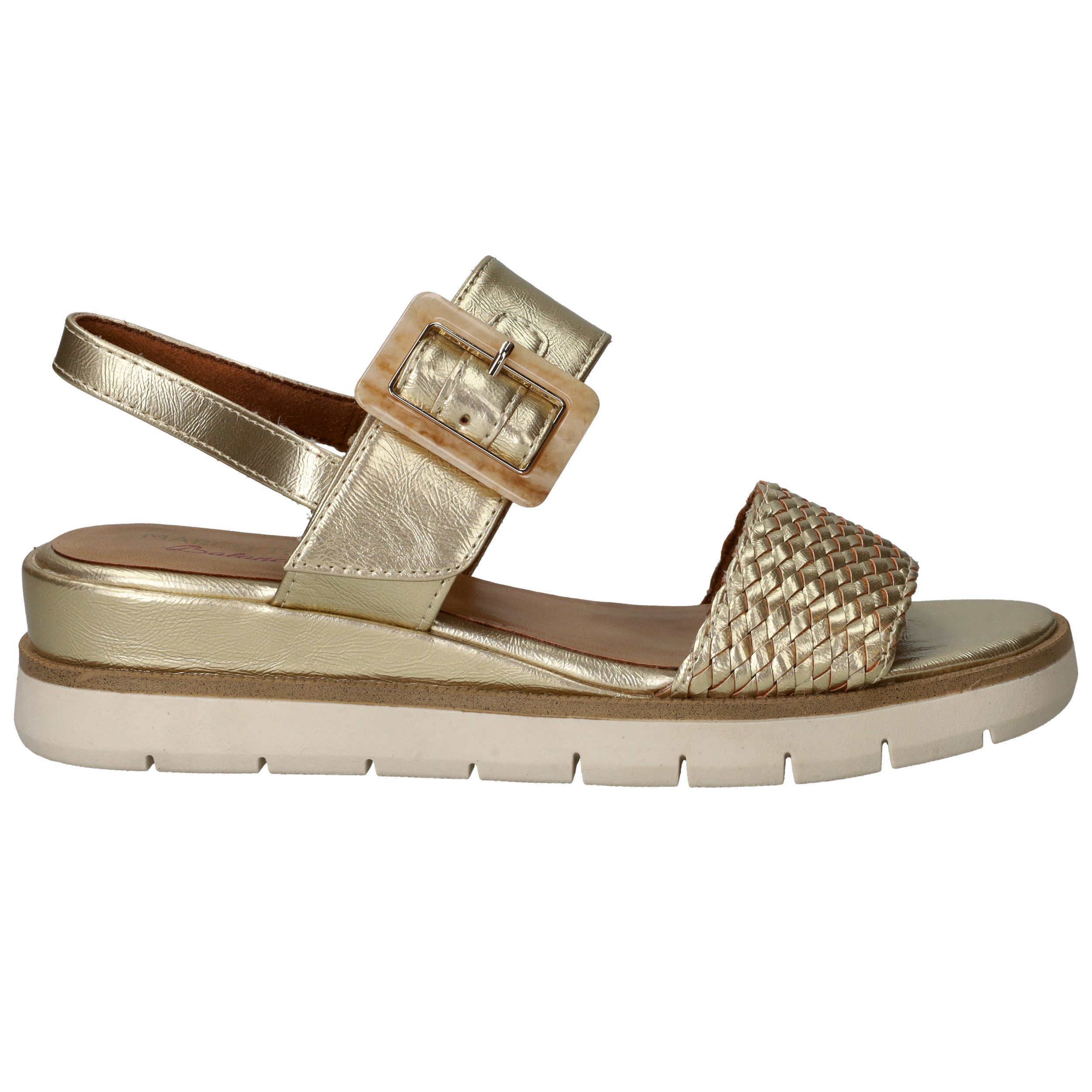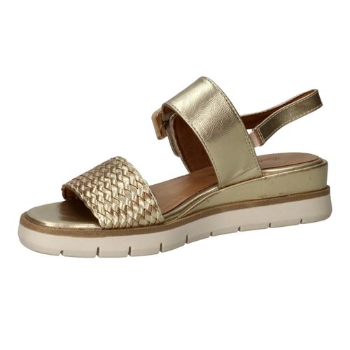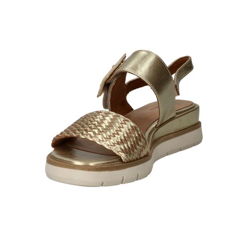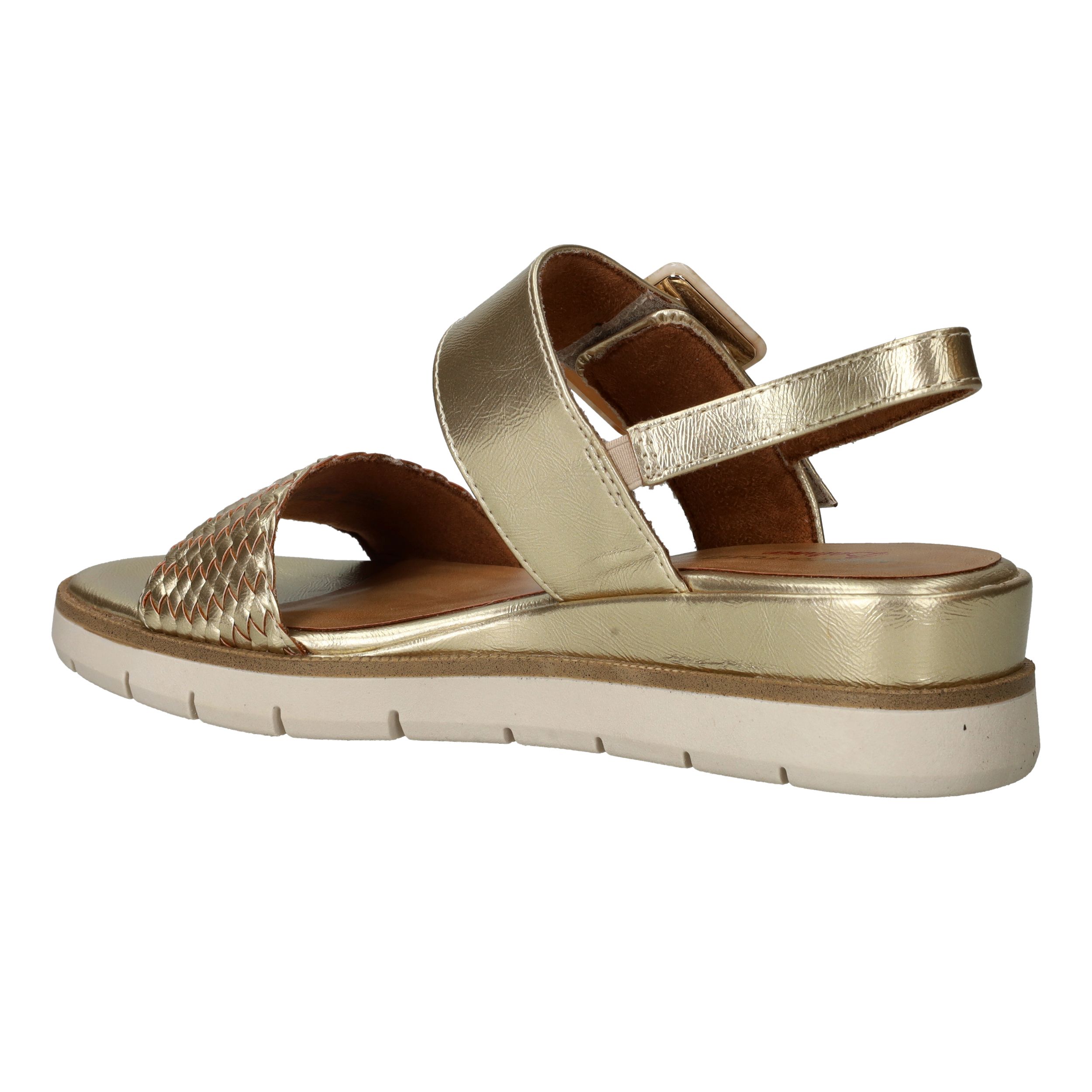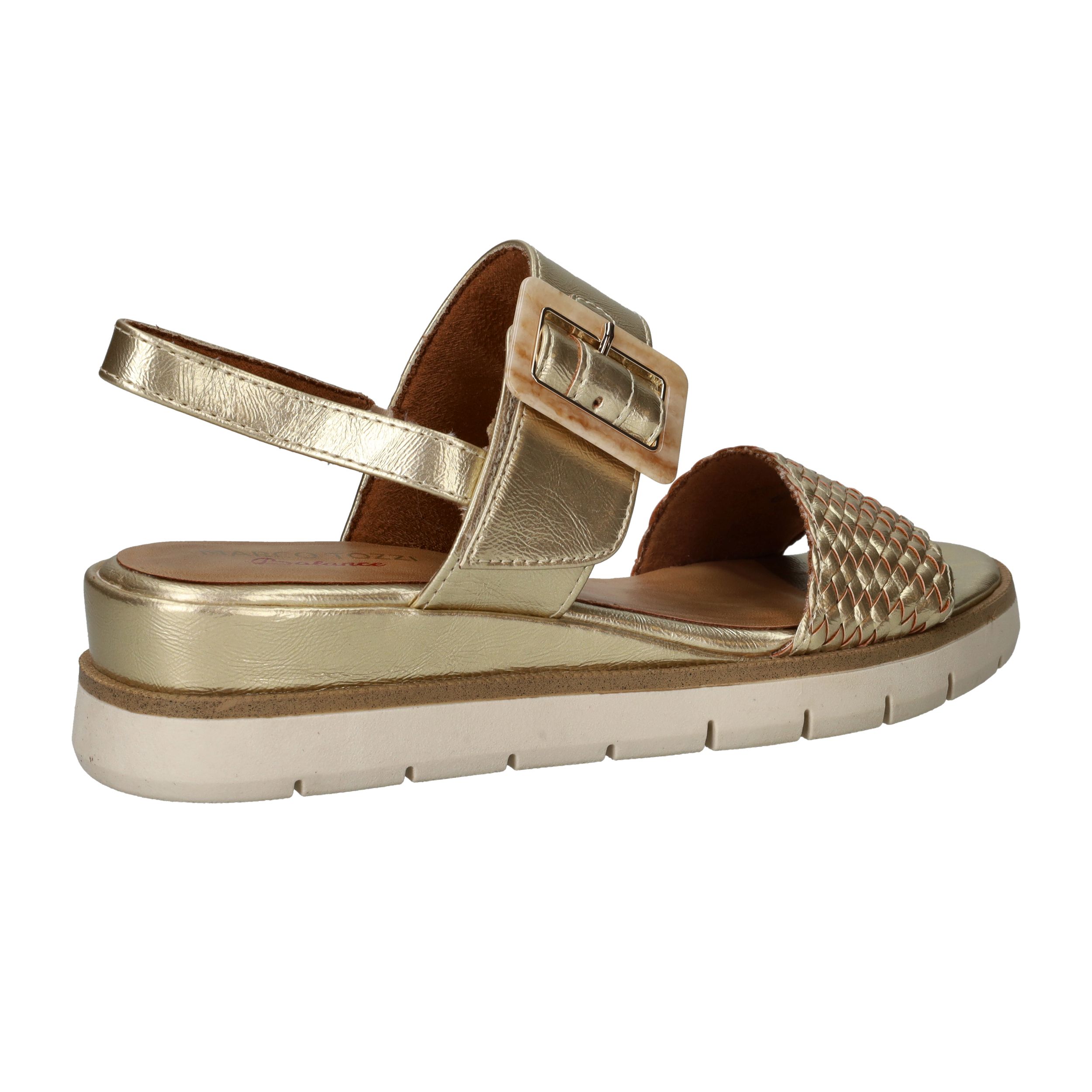 Stralend de dag door met deze gouden sandalen van Marco Tozzi! Deze stijlvolle damessandaal is gemaakt van soepel kunstleer en heeft een mooie gevlochten band over de voorvoet. Dankzij de brede gesp en zachte zool zit hij stevig en comfortabel, perfect voor elke zomerse dag.
