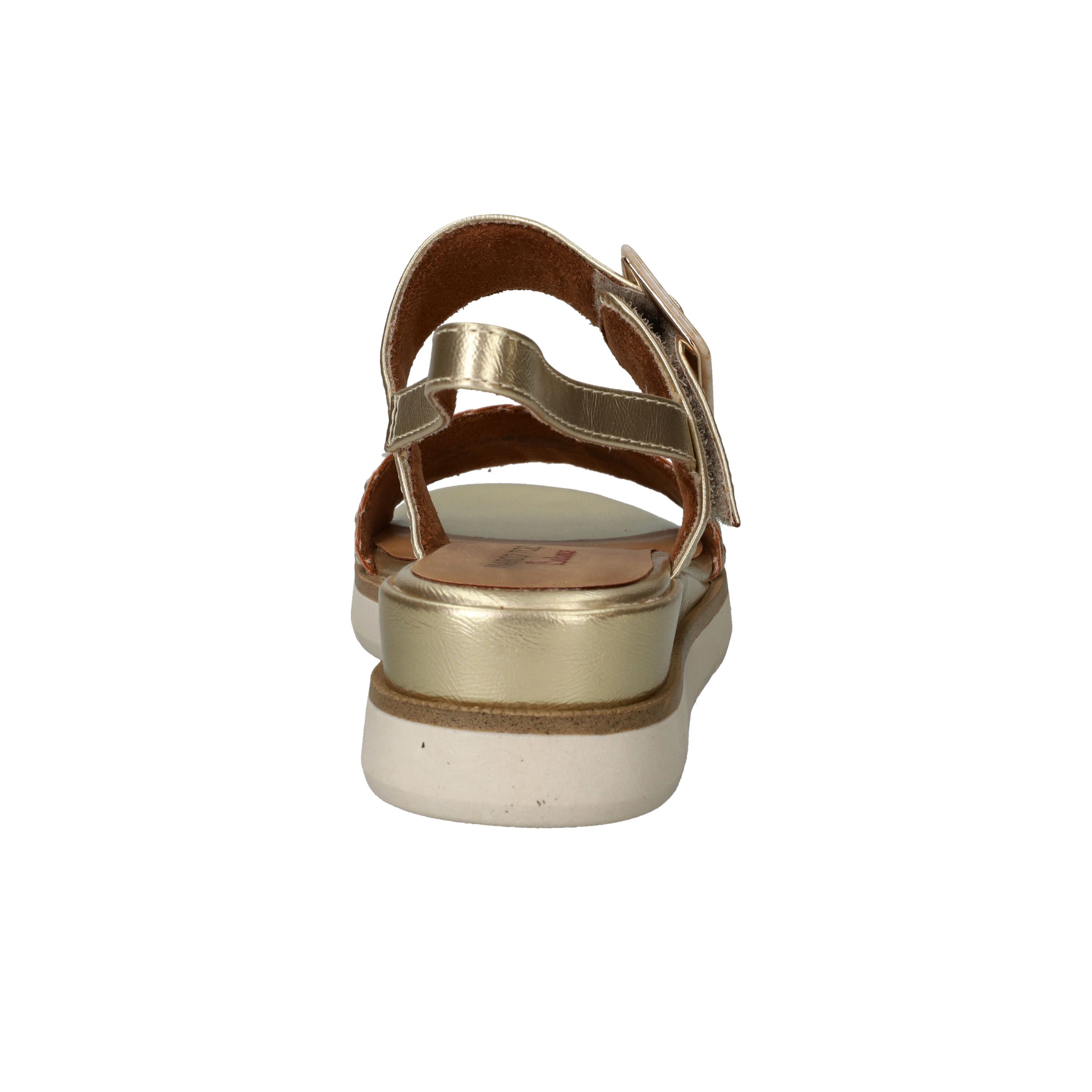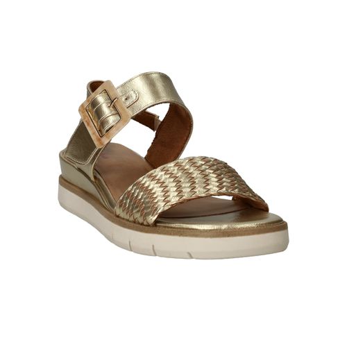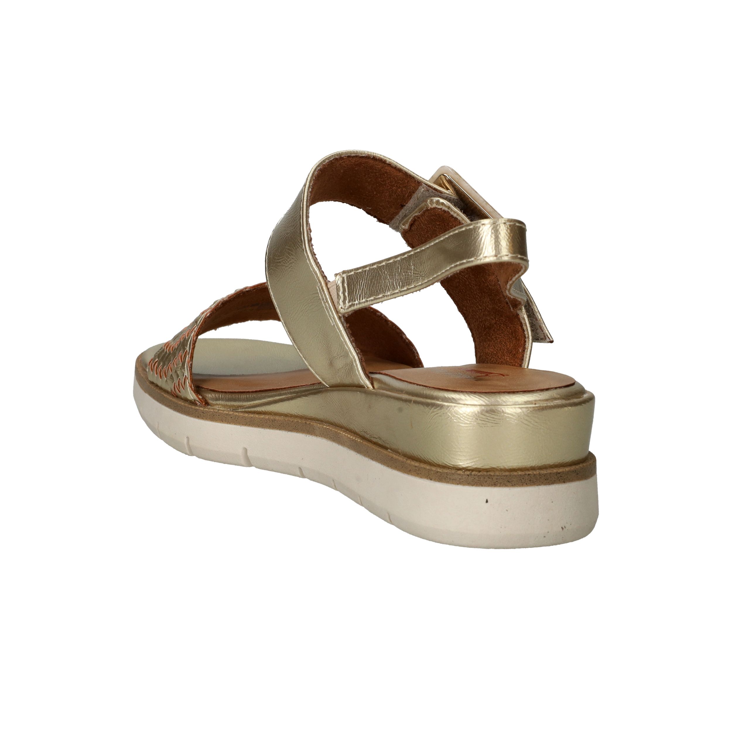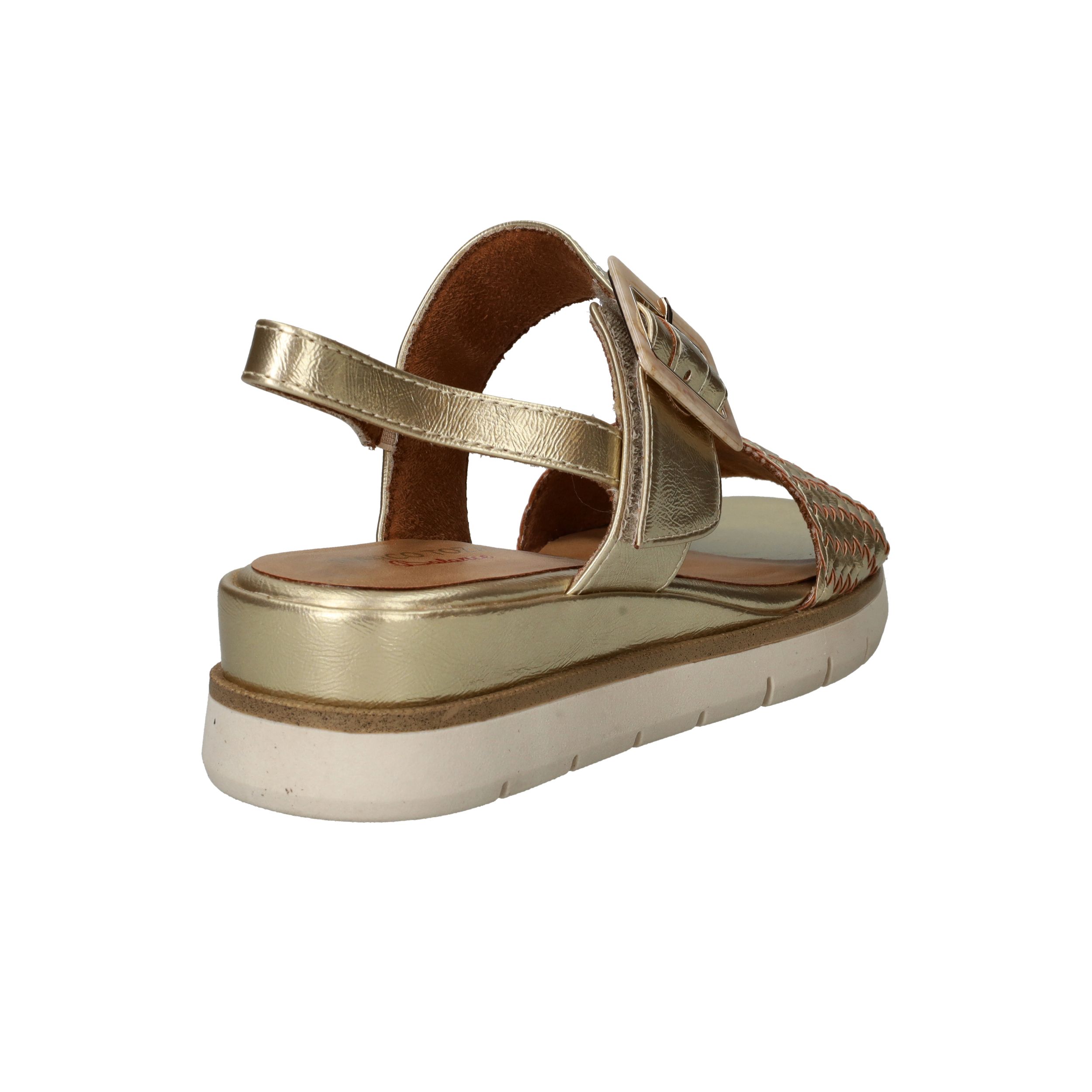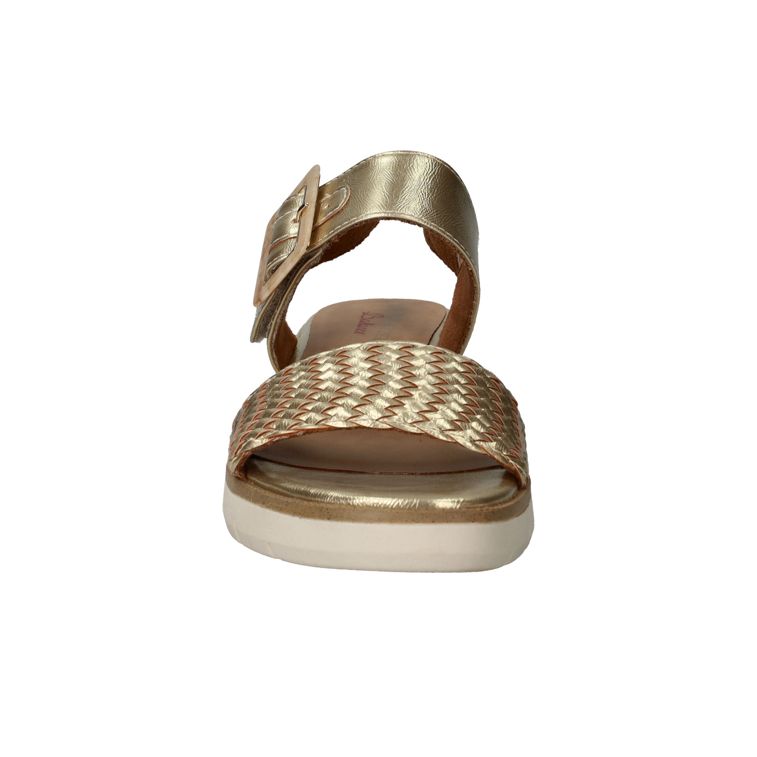 Stralend de dag door met deze gouden sandalen van Marco Tozzi! Deze stijlvolle damessandaal is gemaakt van soepel kunstleer en heeft een mooie gevlochten band over de voorvoet. Dankzij de brede gesp en zachte zool zit hij stevig en comfortabel, perfect voor elke zomerse dag.