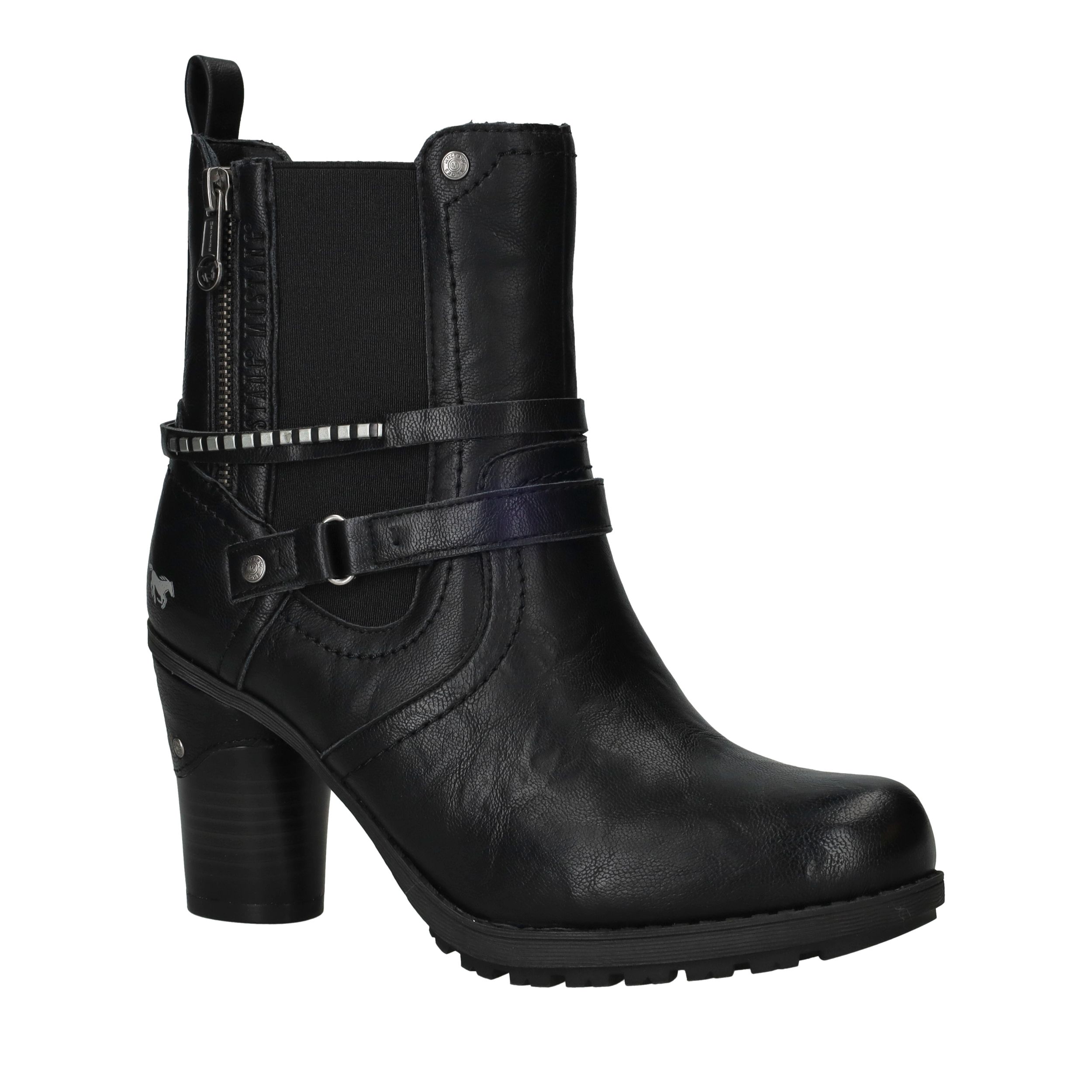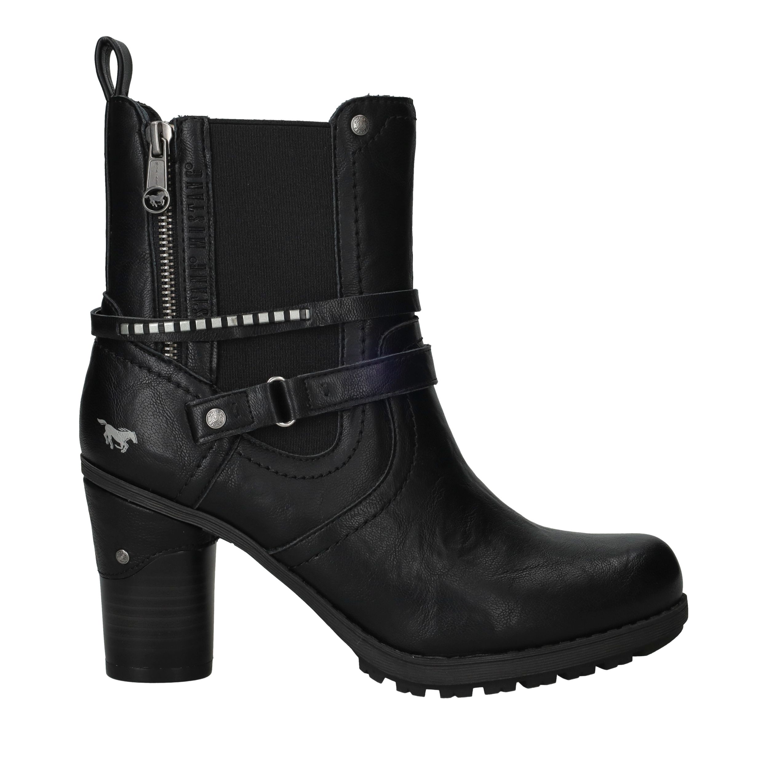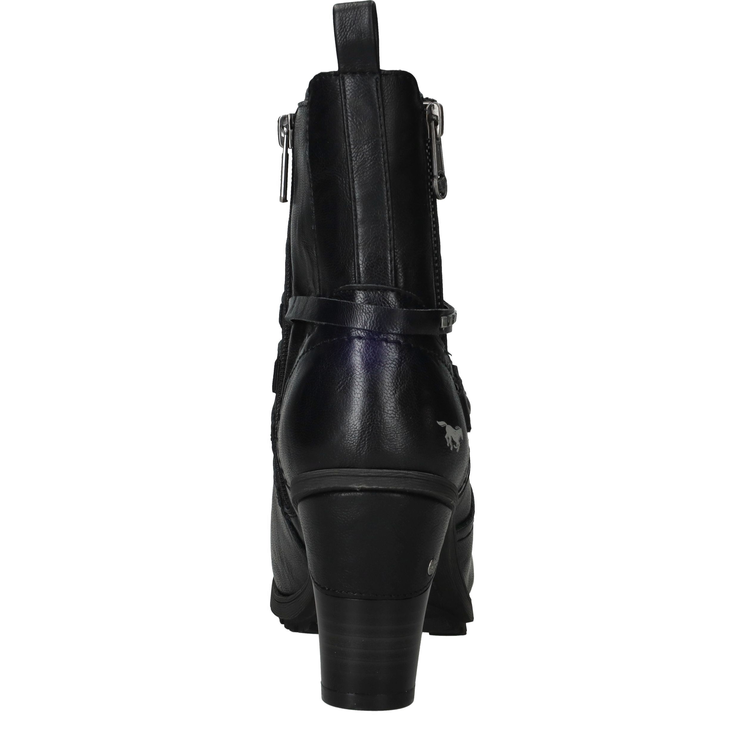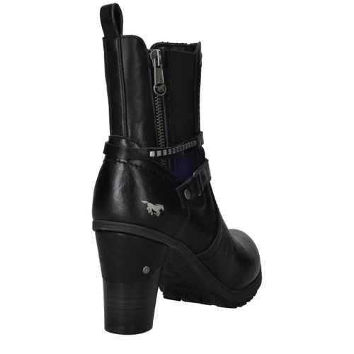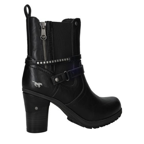 Deze stoere Mustang enkellaarsjes in zwart kunstleer zijn een absolute must-have voor iedere garderobe. De klassieke kleur maakt ze eindeloos te combineren en geeft elke outfit een stijlvolle, krachtige uitstraling. Dankzij de comfortabele voetbreedte G geniet je van een fijne pasvorm. Perfect voor dames die houden van een stoere look met vrouwelijk detail.