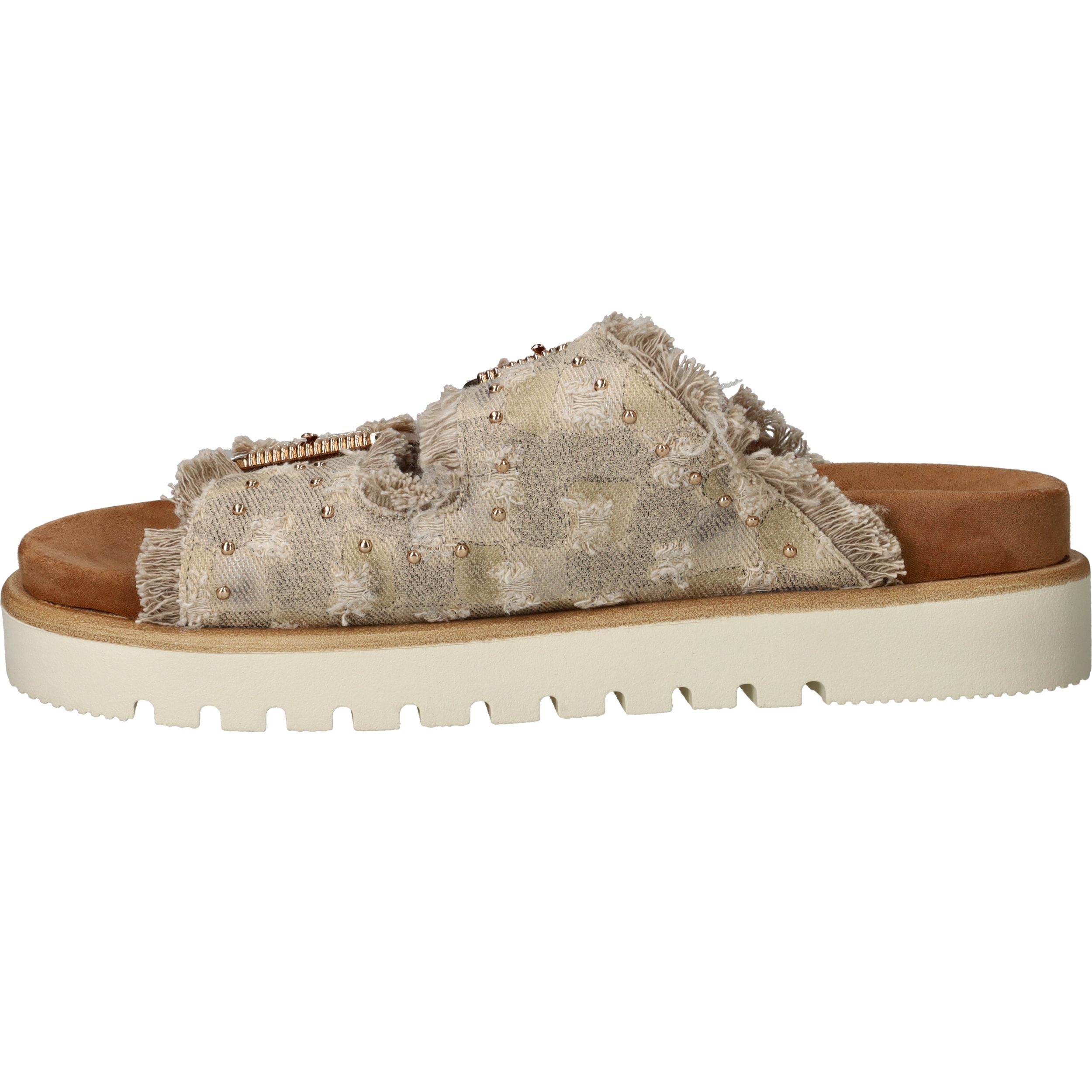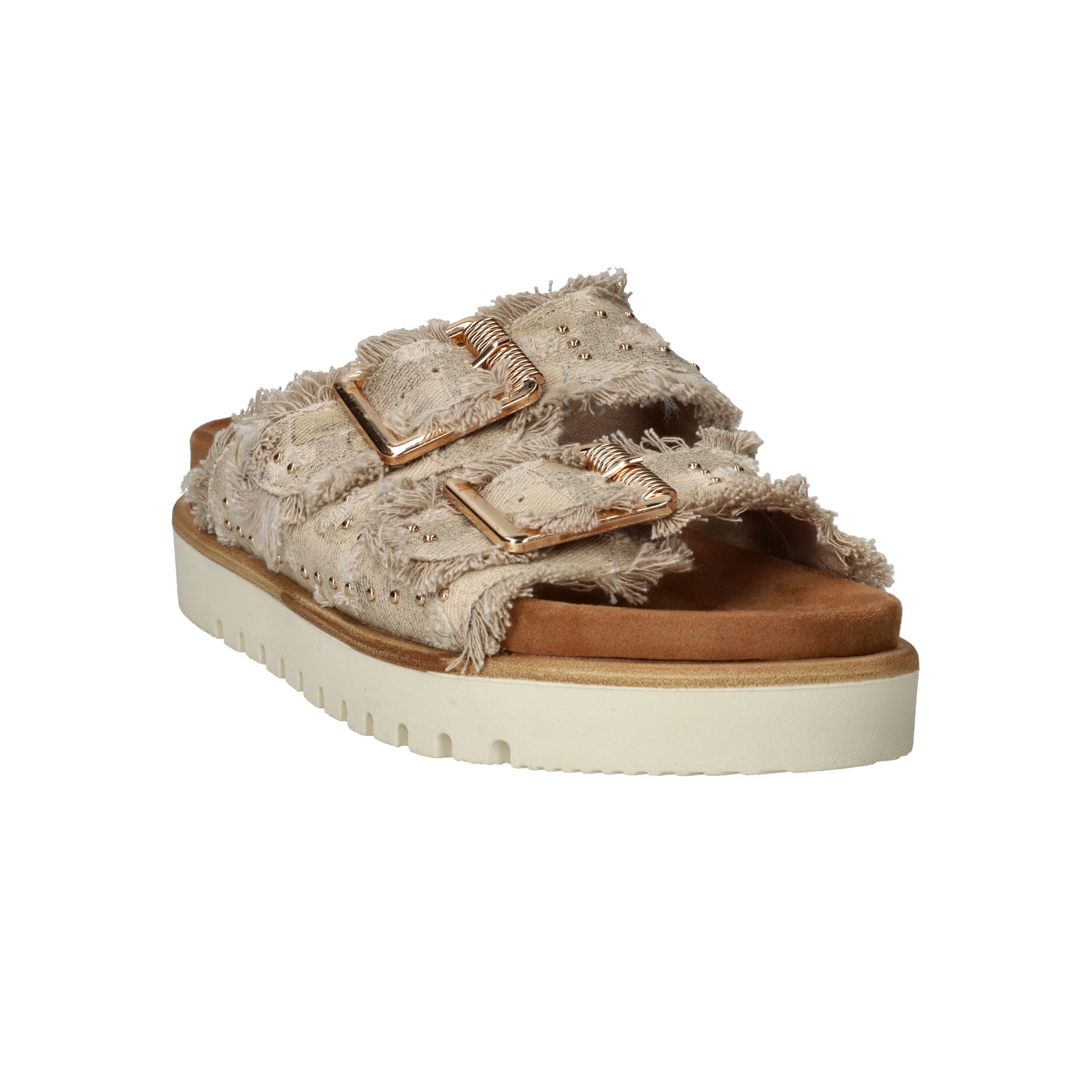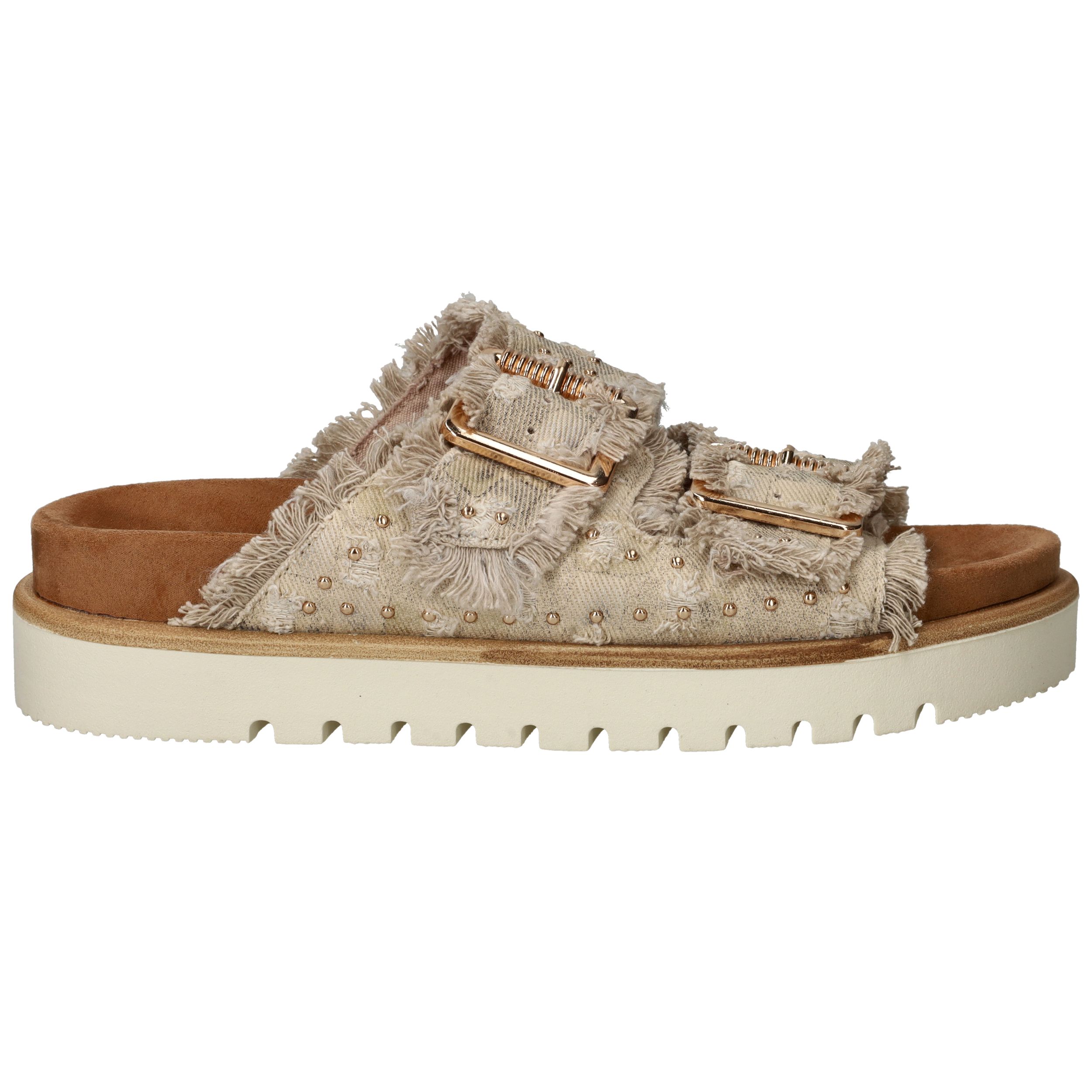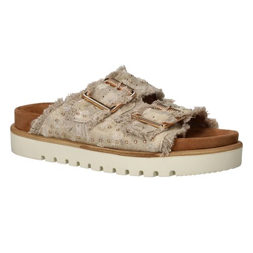 Deze trendy slippers van Mustang zijn een perfecte mix van boho en comfort. De dubbele band van beige textiel met rafelranden, studs en goudkleurige gespen geeft een unieke en stoere uitstraling. Voor dames die houden van opvallend maar comfortabel schoeisel. De zachte zool met profiel zorgt voor goede grip en loopcomfort, zelfs op warme dagen.