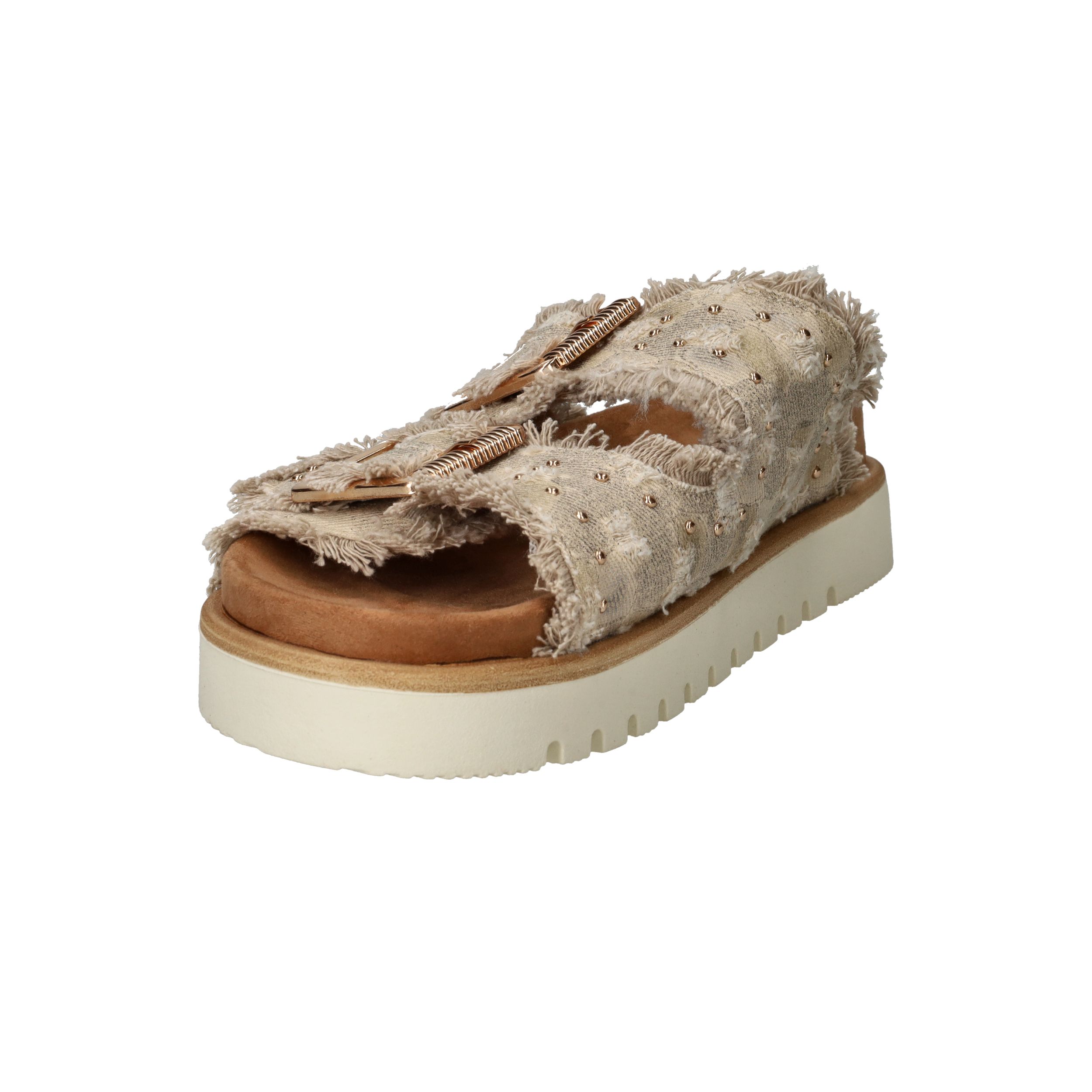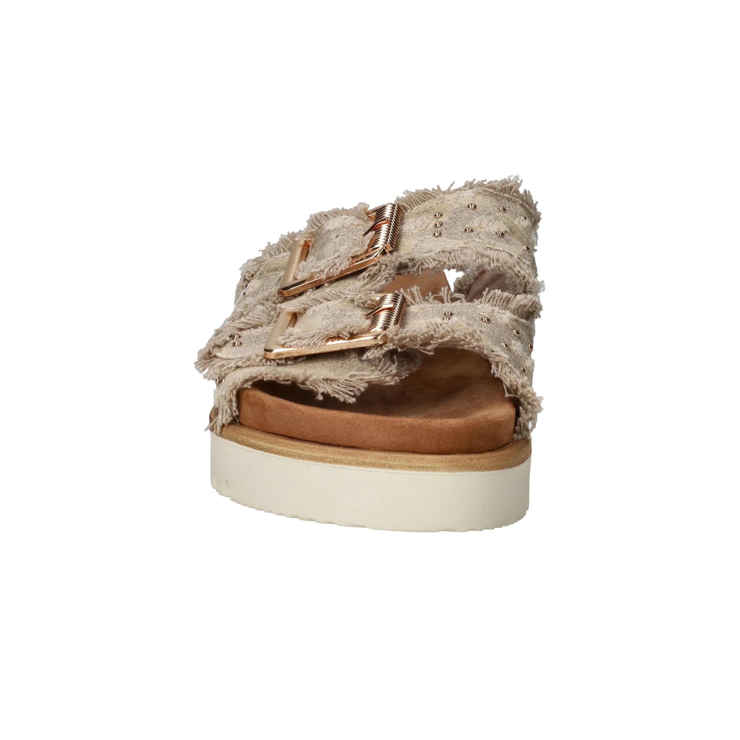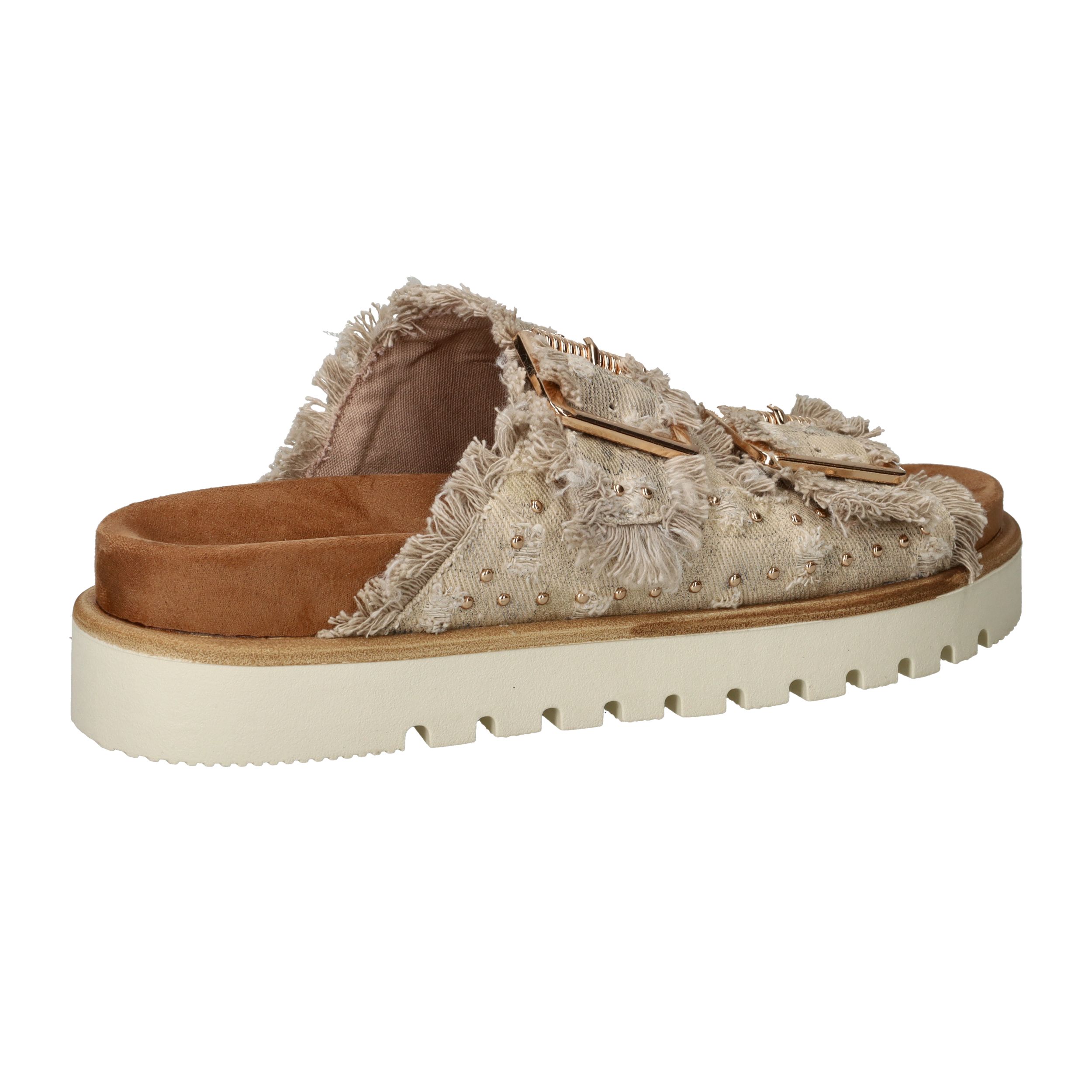 Deze trendy slippers van Mustang zijn een perfecte mix van boho en comfort. De dubbele band van beige textiel met rafelranden, studs en goudkleurige gespen geeft een unieke en stoere uitstraling. Voor dames die houden van opvallend maar comfortabel schoeisel. De zachte zool met profiel zorgt voor goede grip en loopcomfort, zelfs op warme dagen.