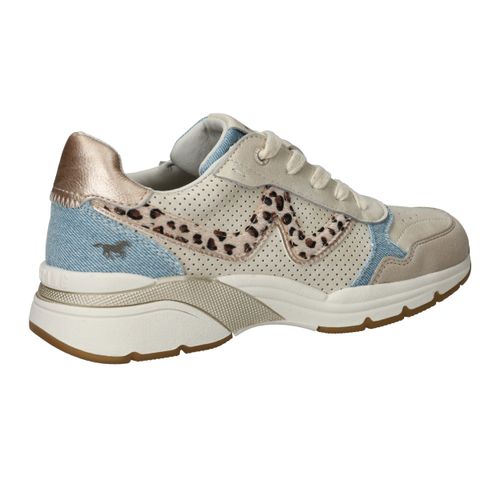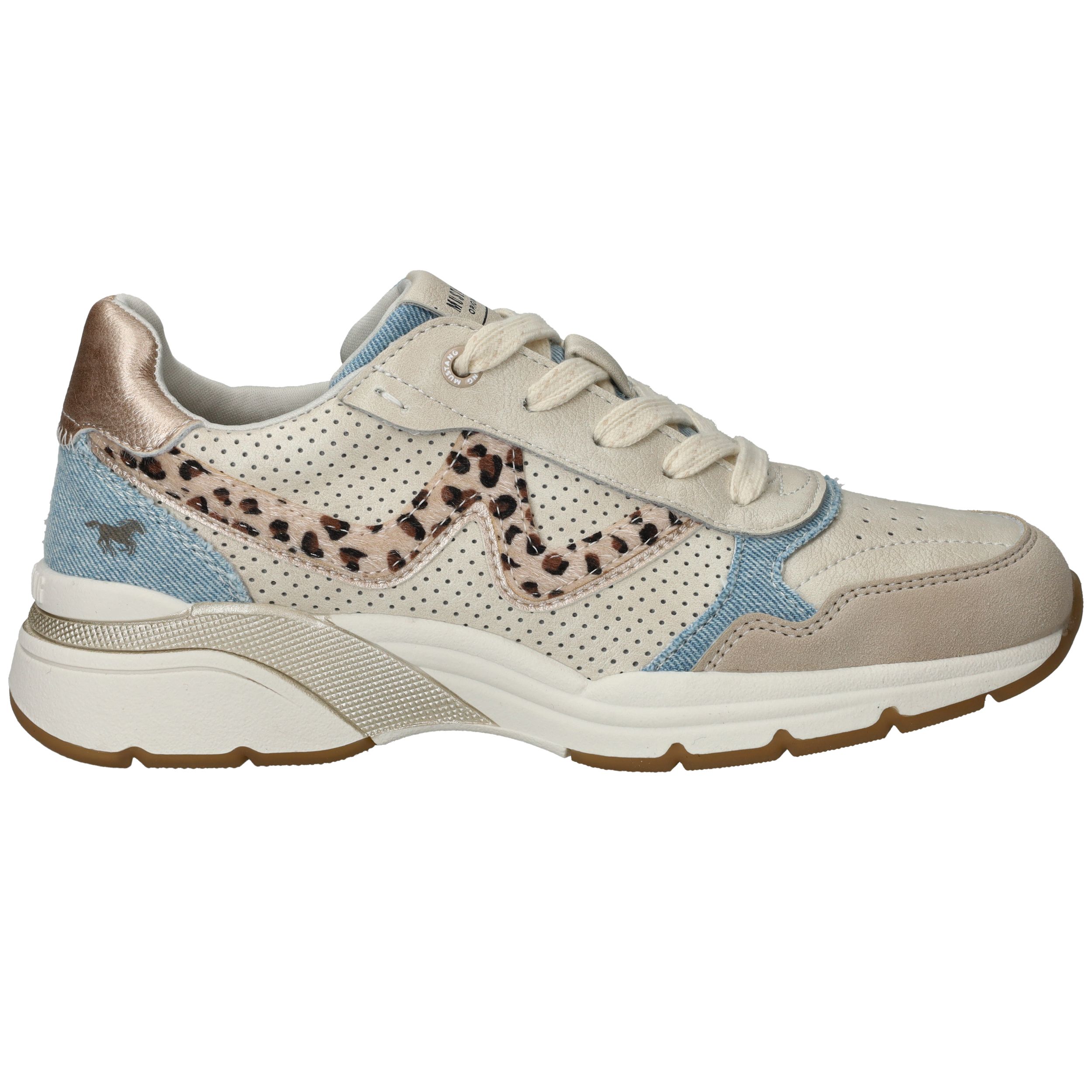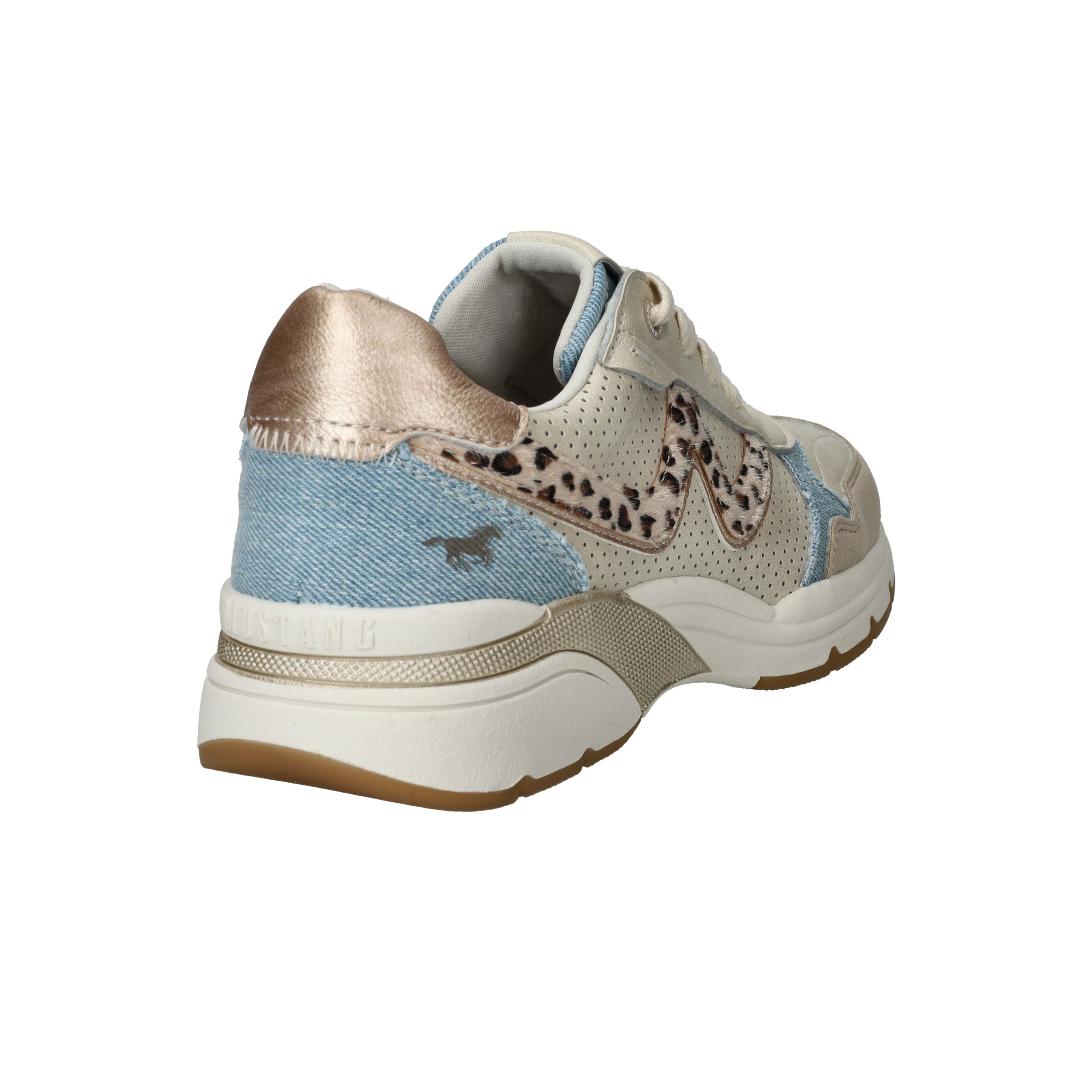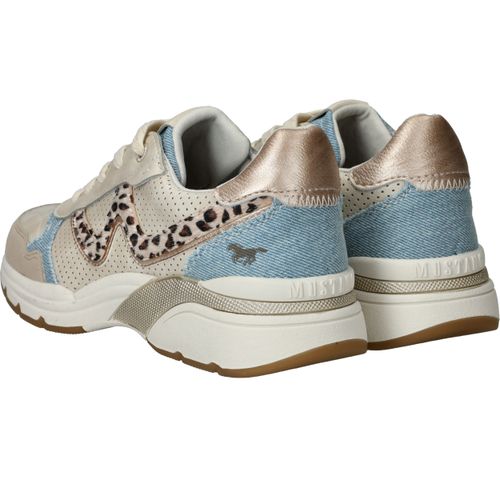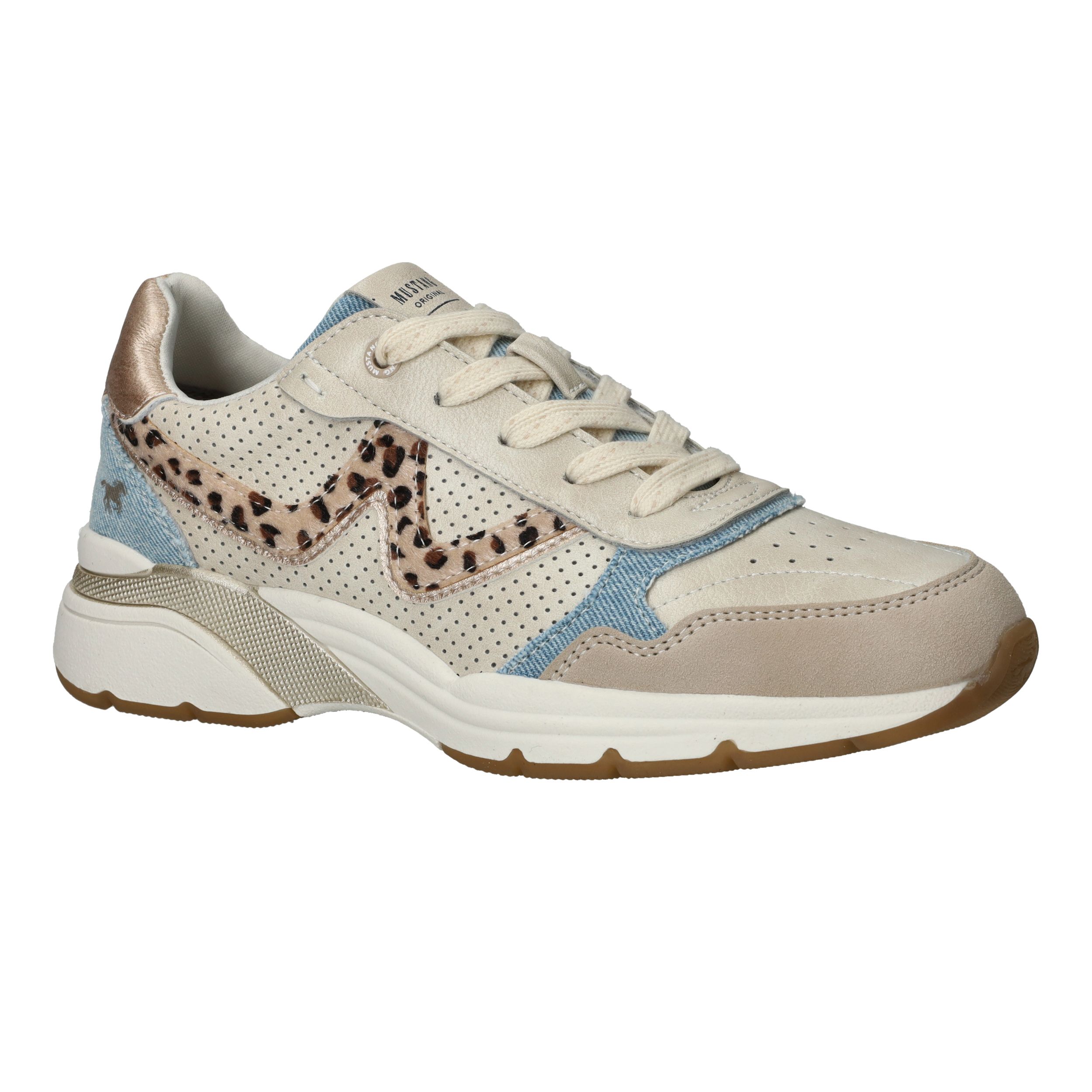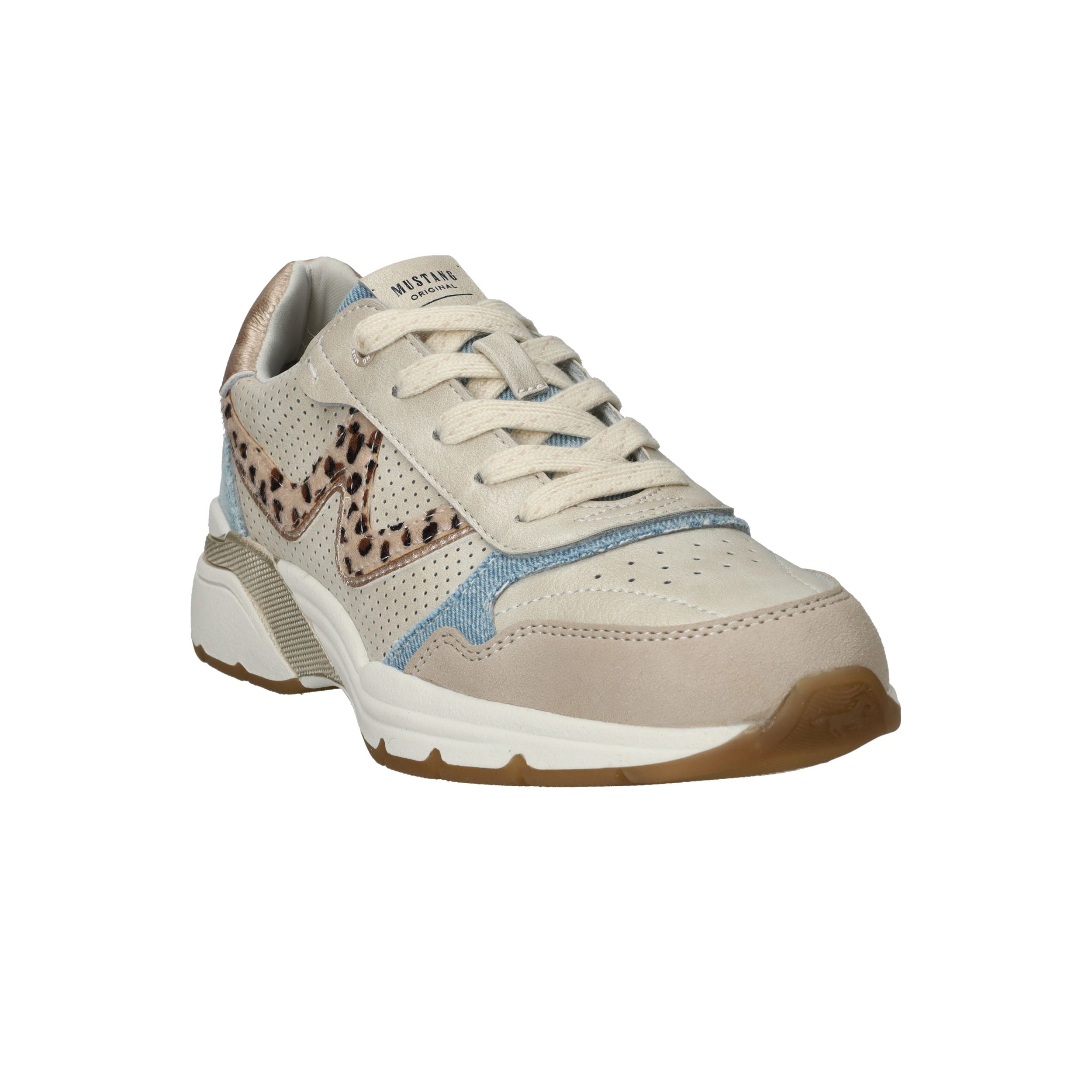 De details van deze Mustang sneaker maken de damesschoen heel speciaal. De beige sneaker heeft leuke jeans en dierenprint accenten.