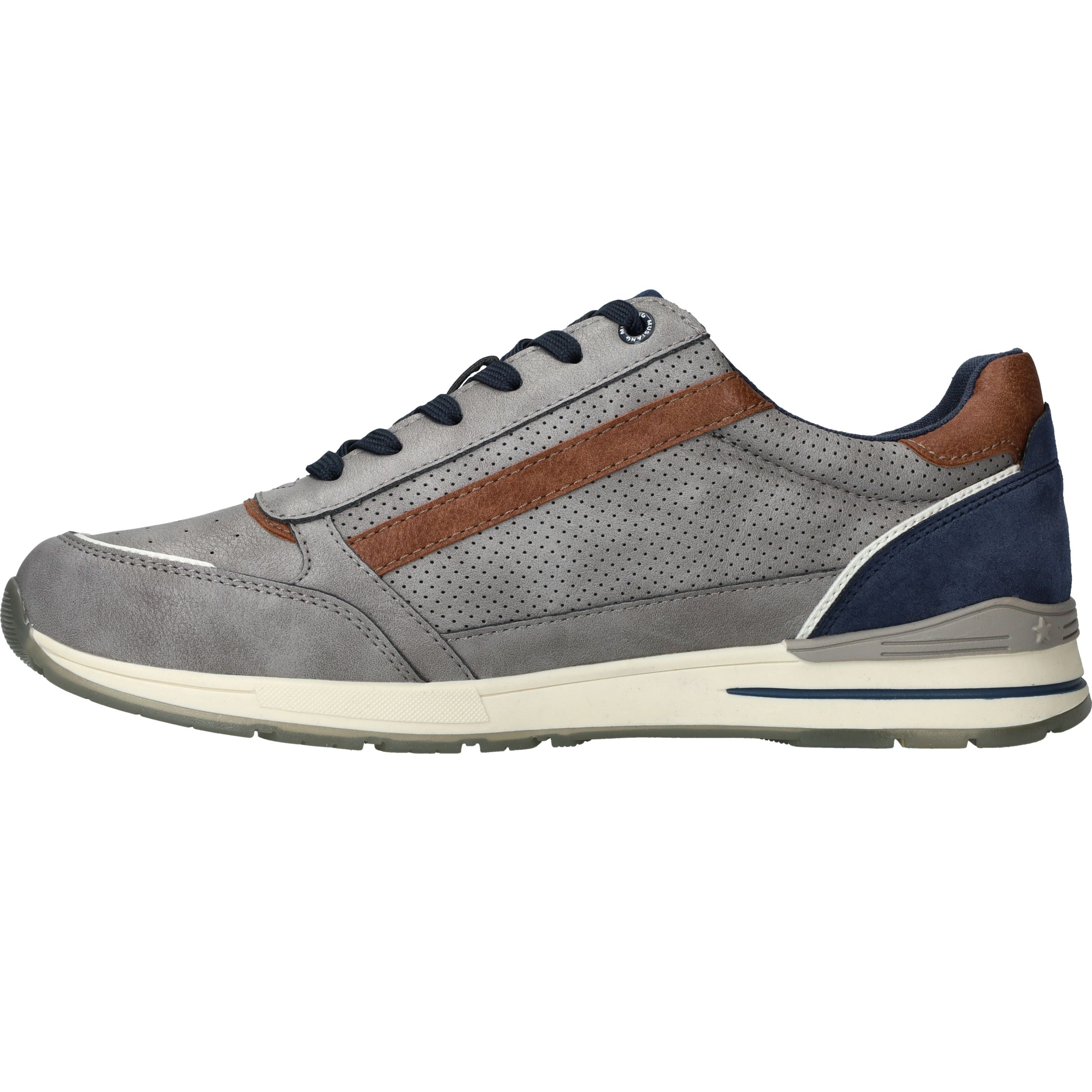Mooie warmgrijze Mustang sneaker met cognac en blauwe details. Deze herensneaker is makkelijk te combineren met al je outfits.
