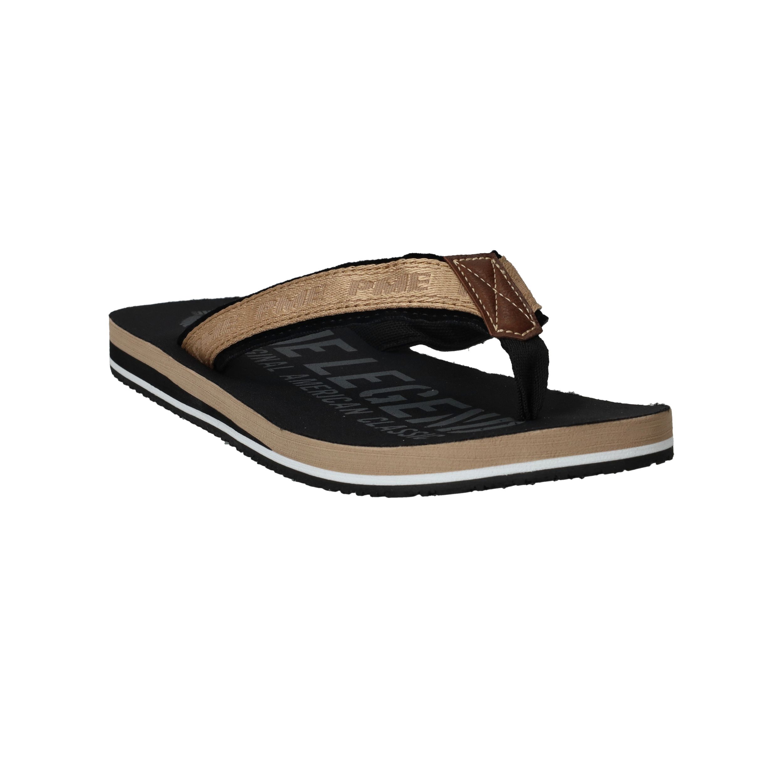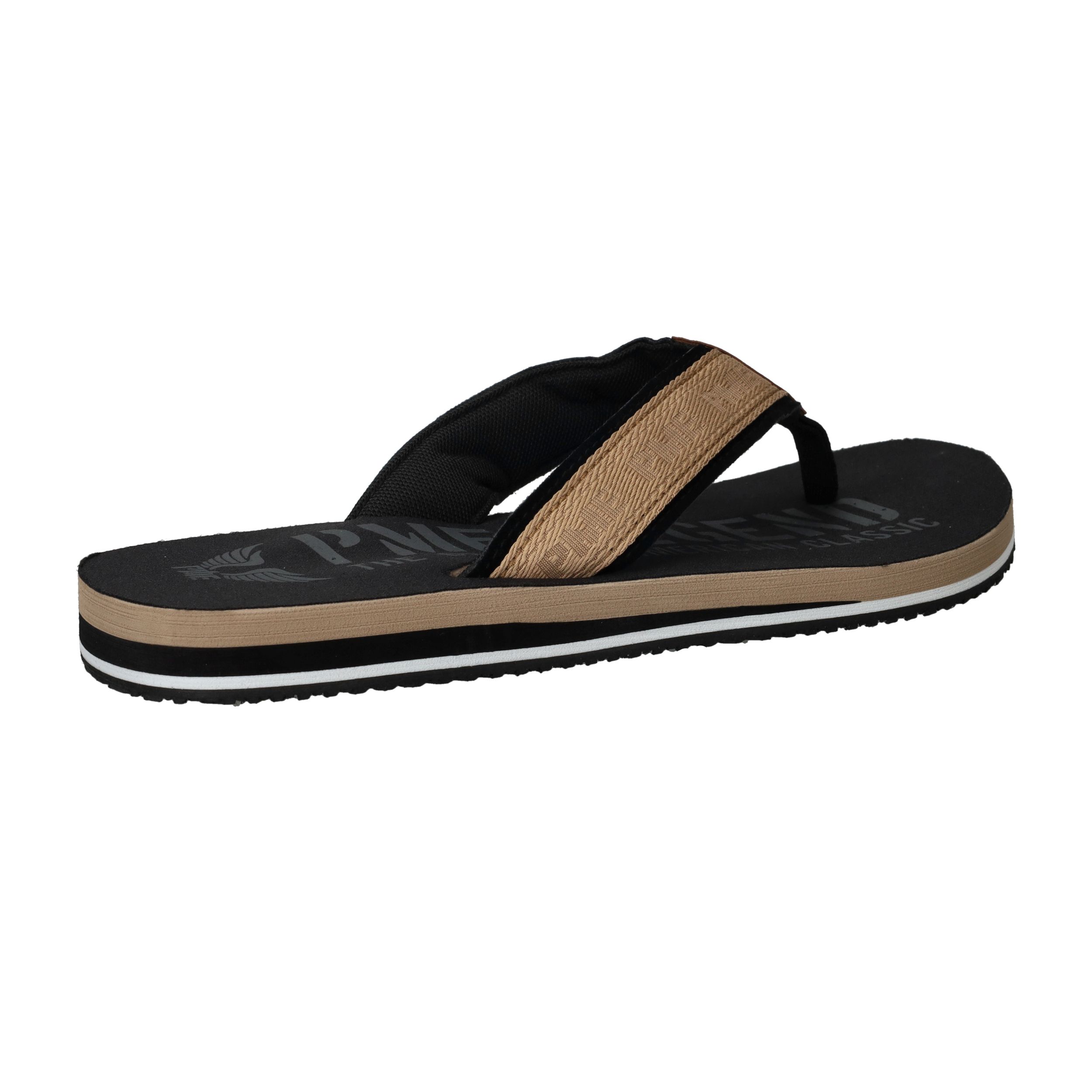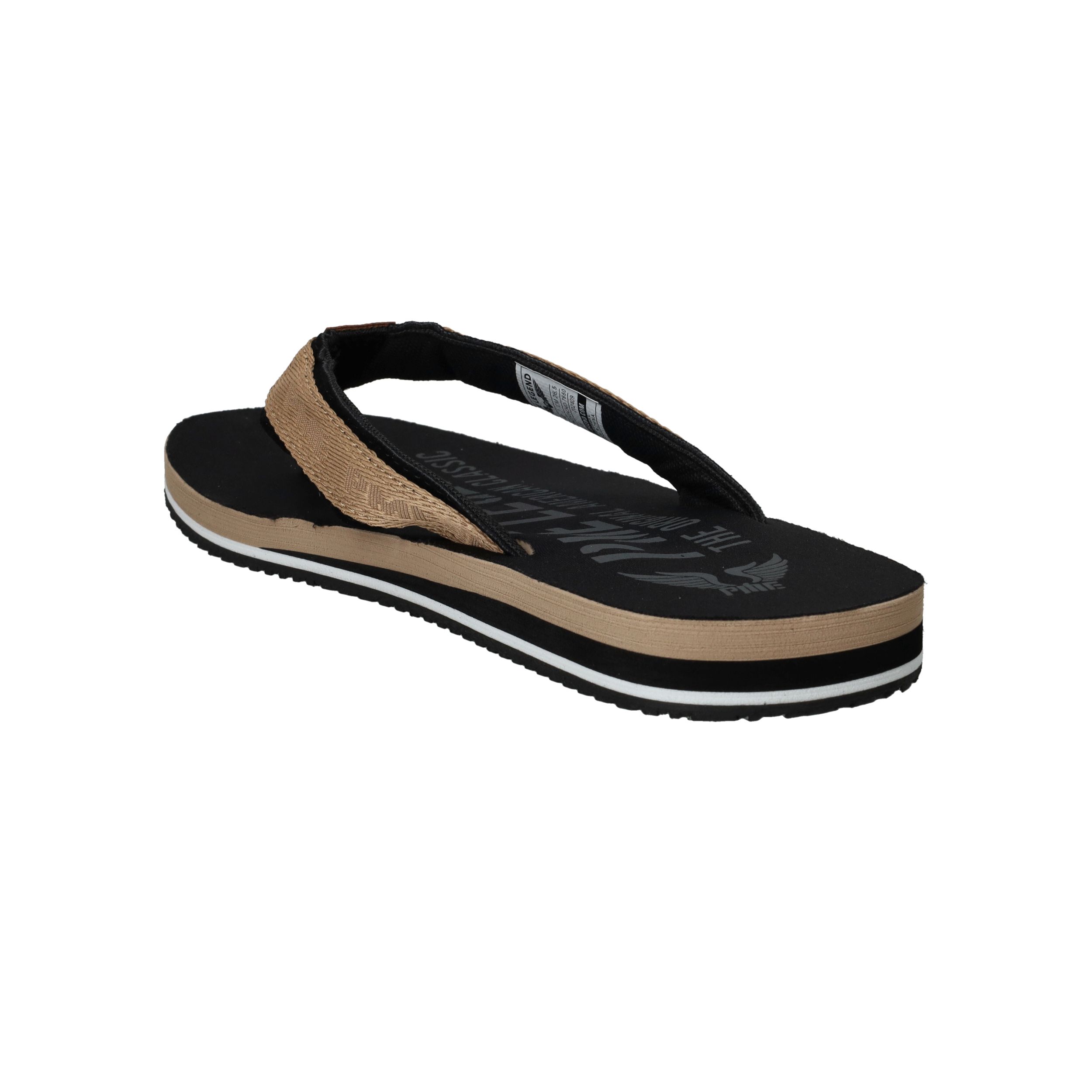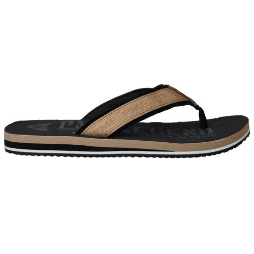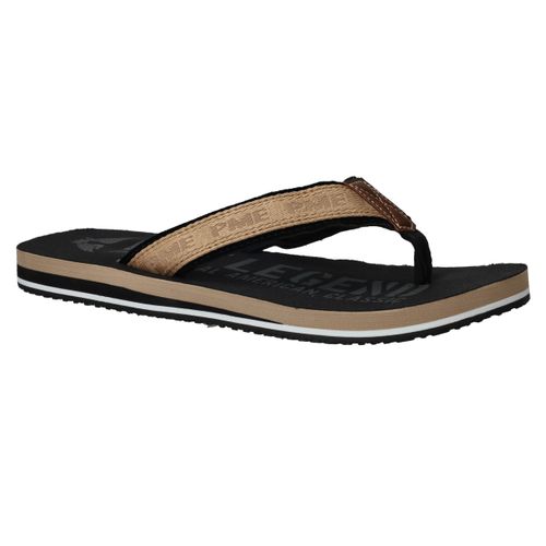 Deze comfortabele heren slippers van PME Legend zijn perfect voor warme dagen, vakanties of gewoon lekker thuis. Het bandje is uitgevoerd in taupekleurig textiel met zwarte accenten voor een stoere look. De zwarte binnenzool is strak en tijdloos, en de normale voetbreedte G zorgt voor een prettige pasvorm.