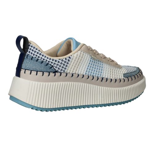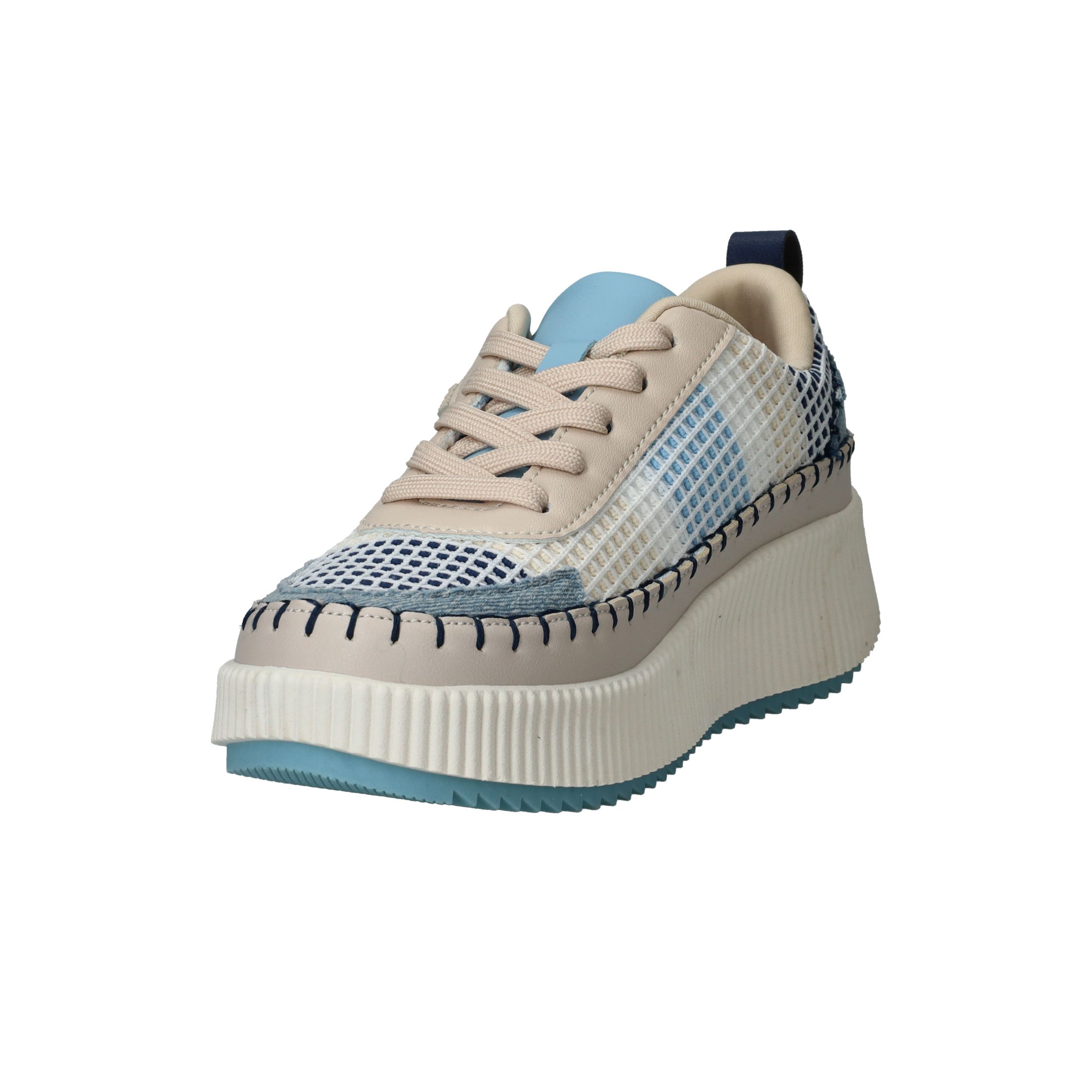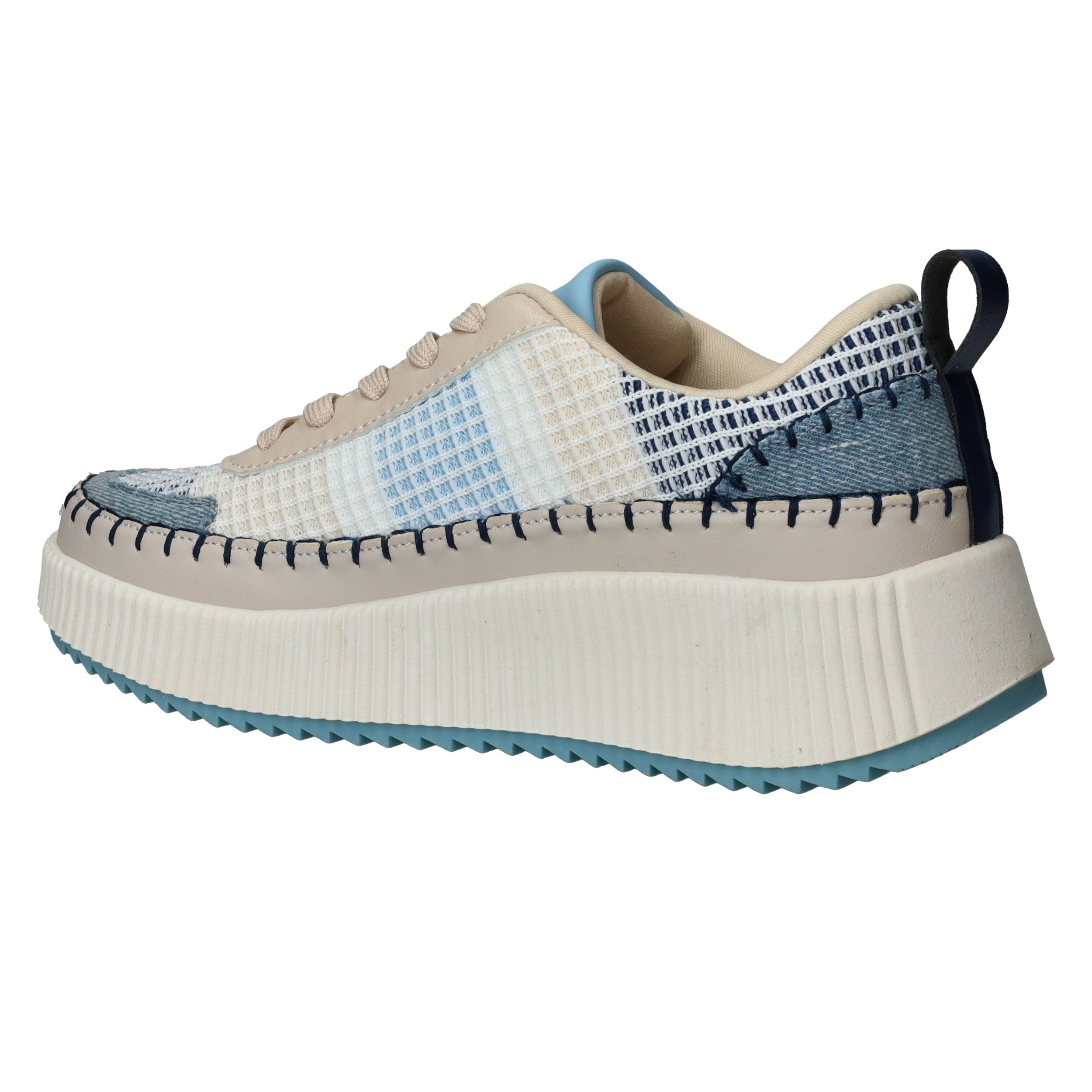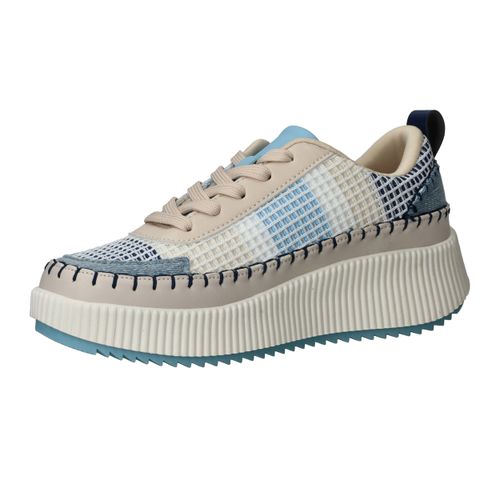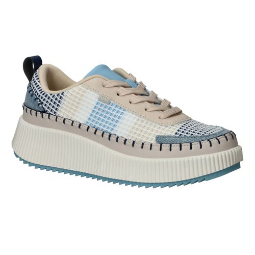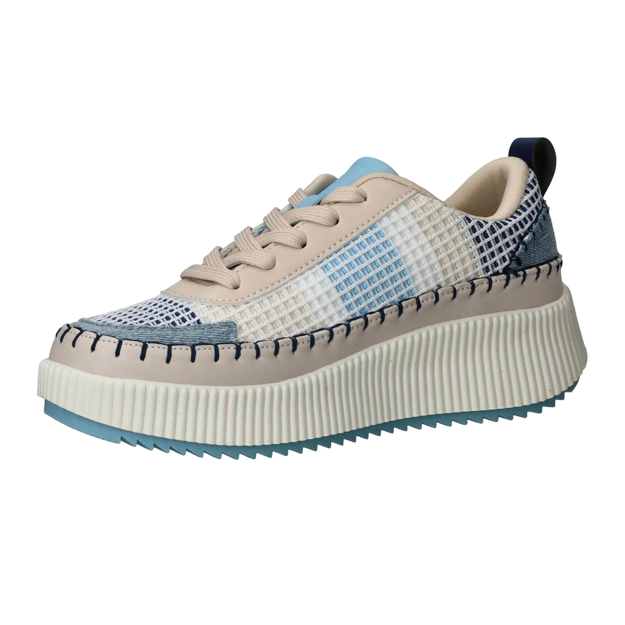 Trendy POSH by Poelman sneaker met gave ribbel platformzool! De beige sneaker heeft een blauw colorblock patroon en is afgewerkt met een leuk sierstiksel.