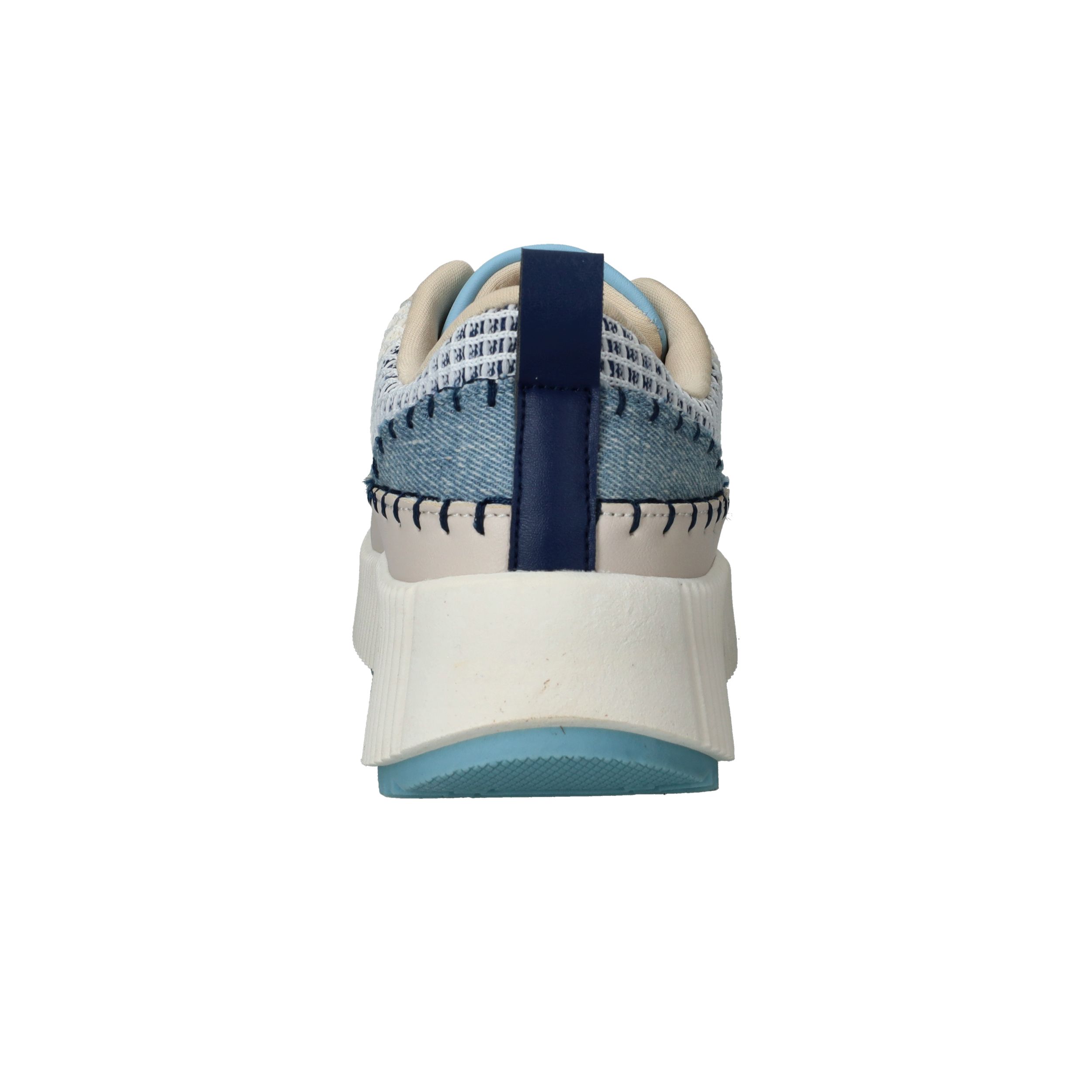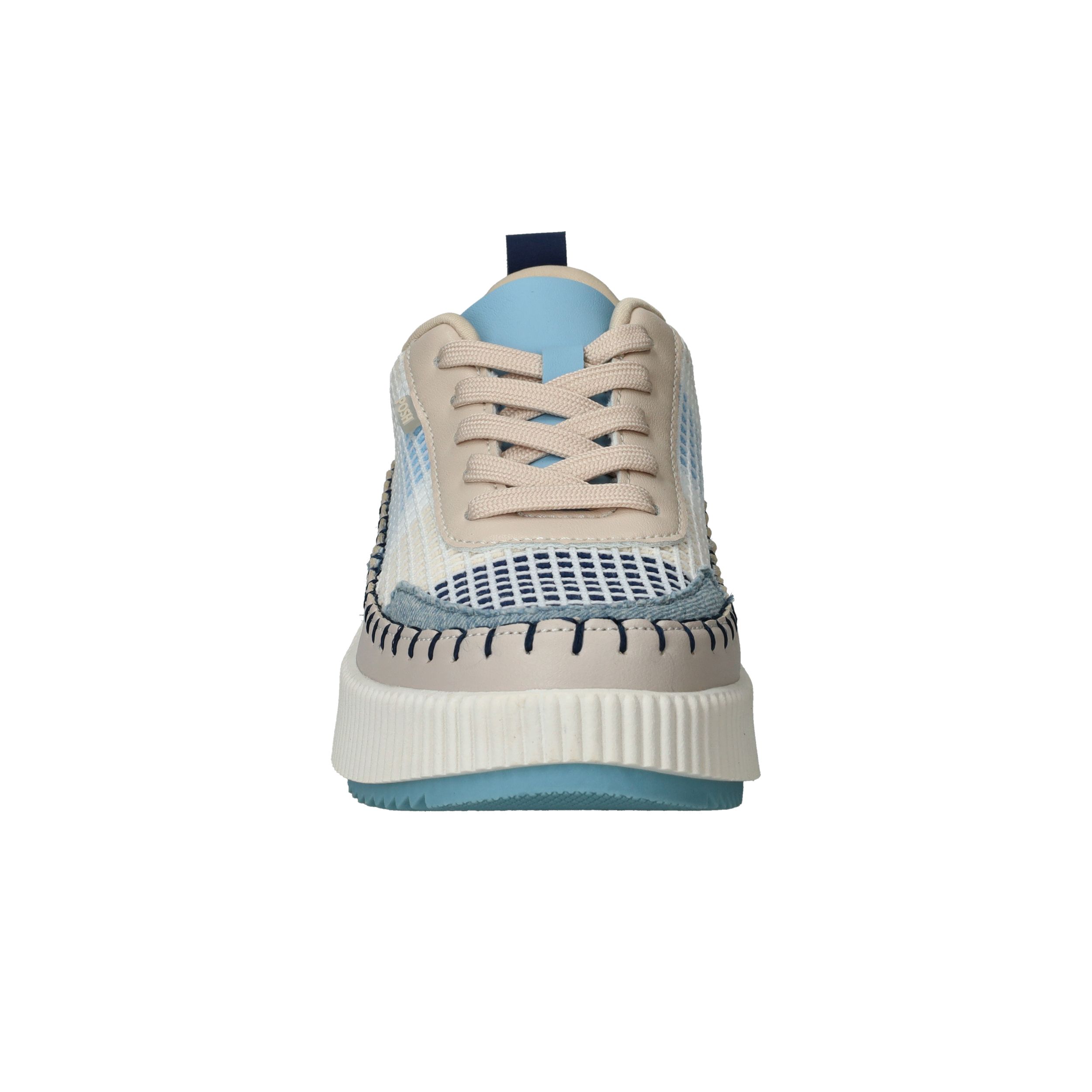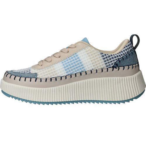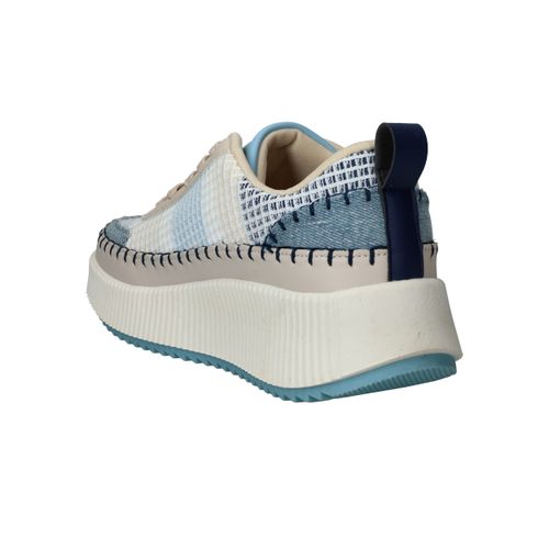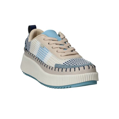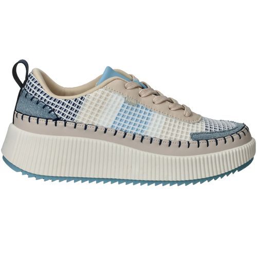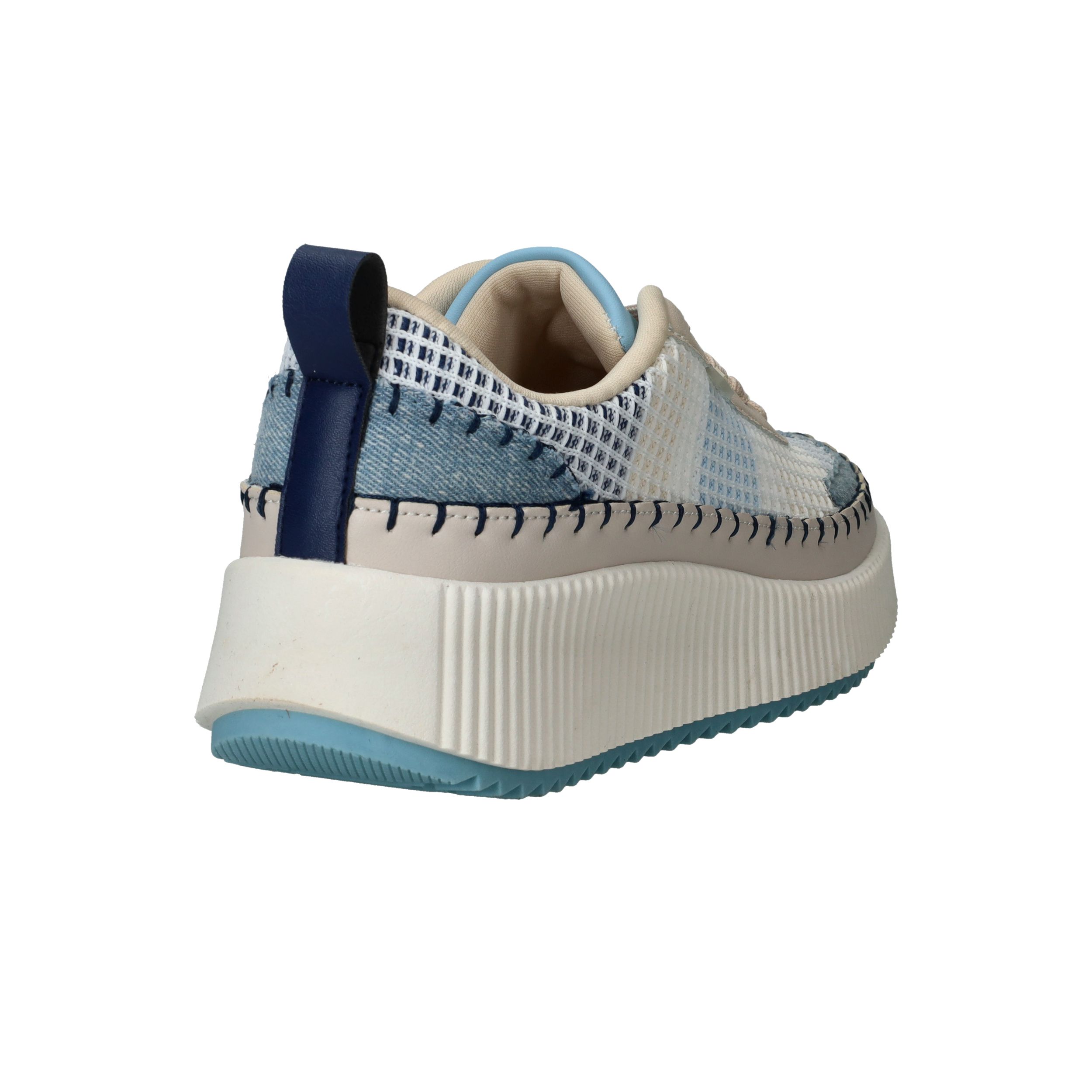 Trendy POSH by Poelman sneaker met gave ribbel platformzool! De beige sneaker heeft een blauw colorblock patroon en is afgewerkt met een leuk sierstiksel.