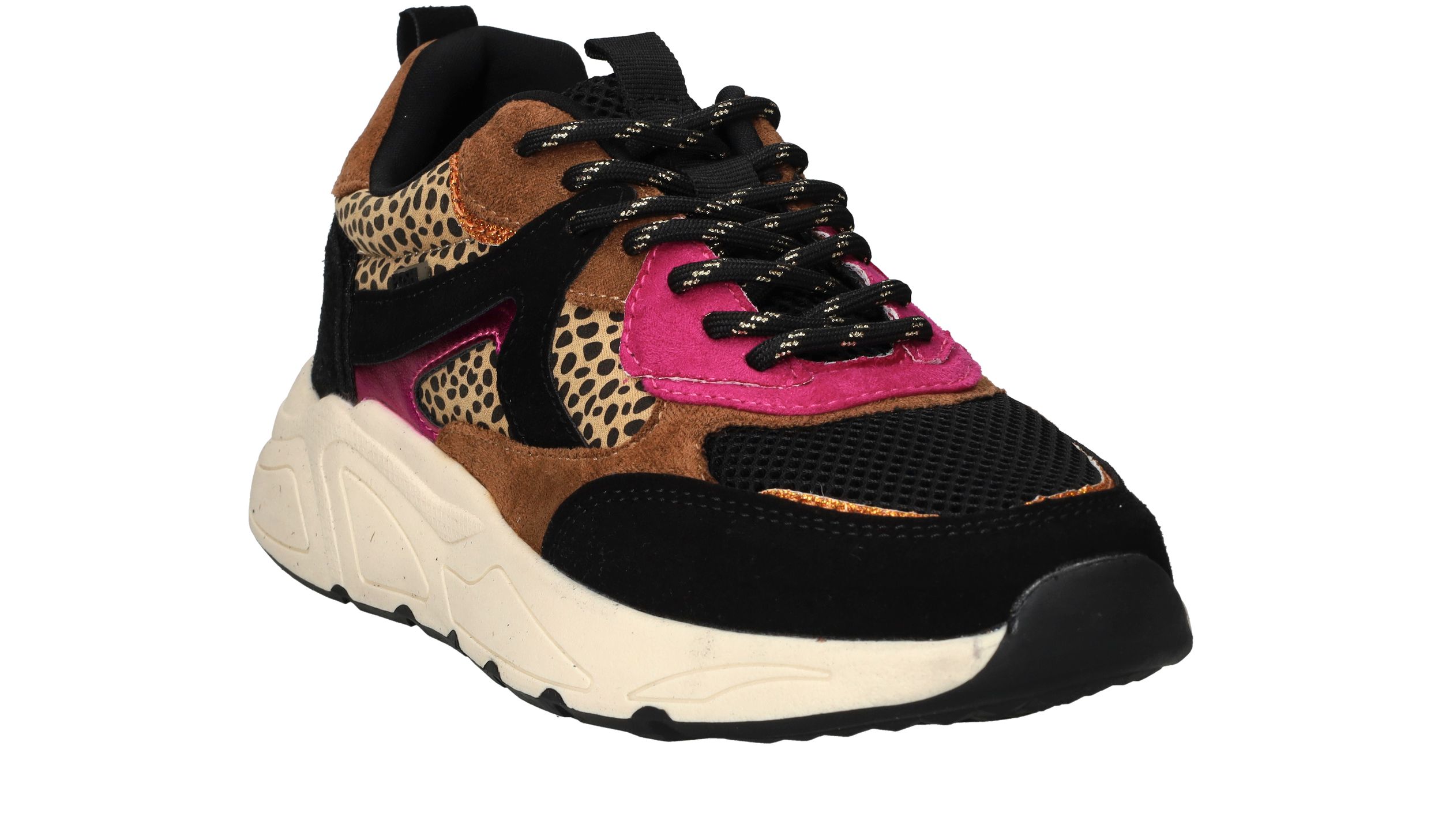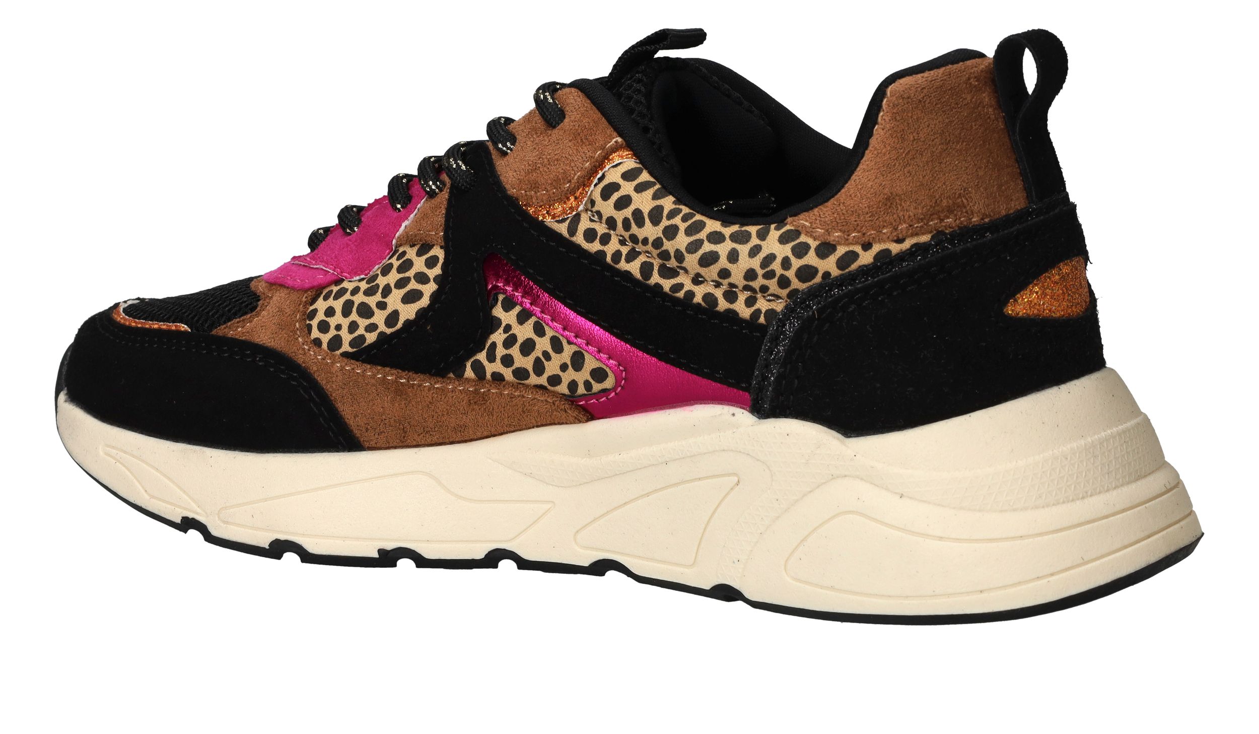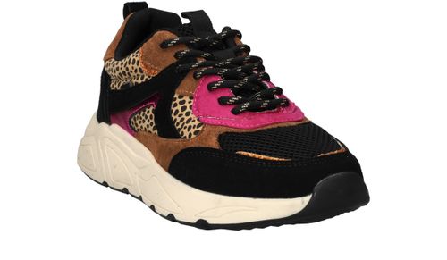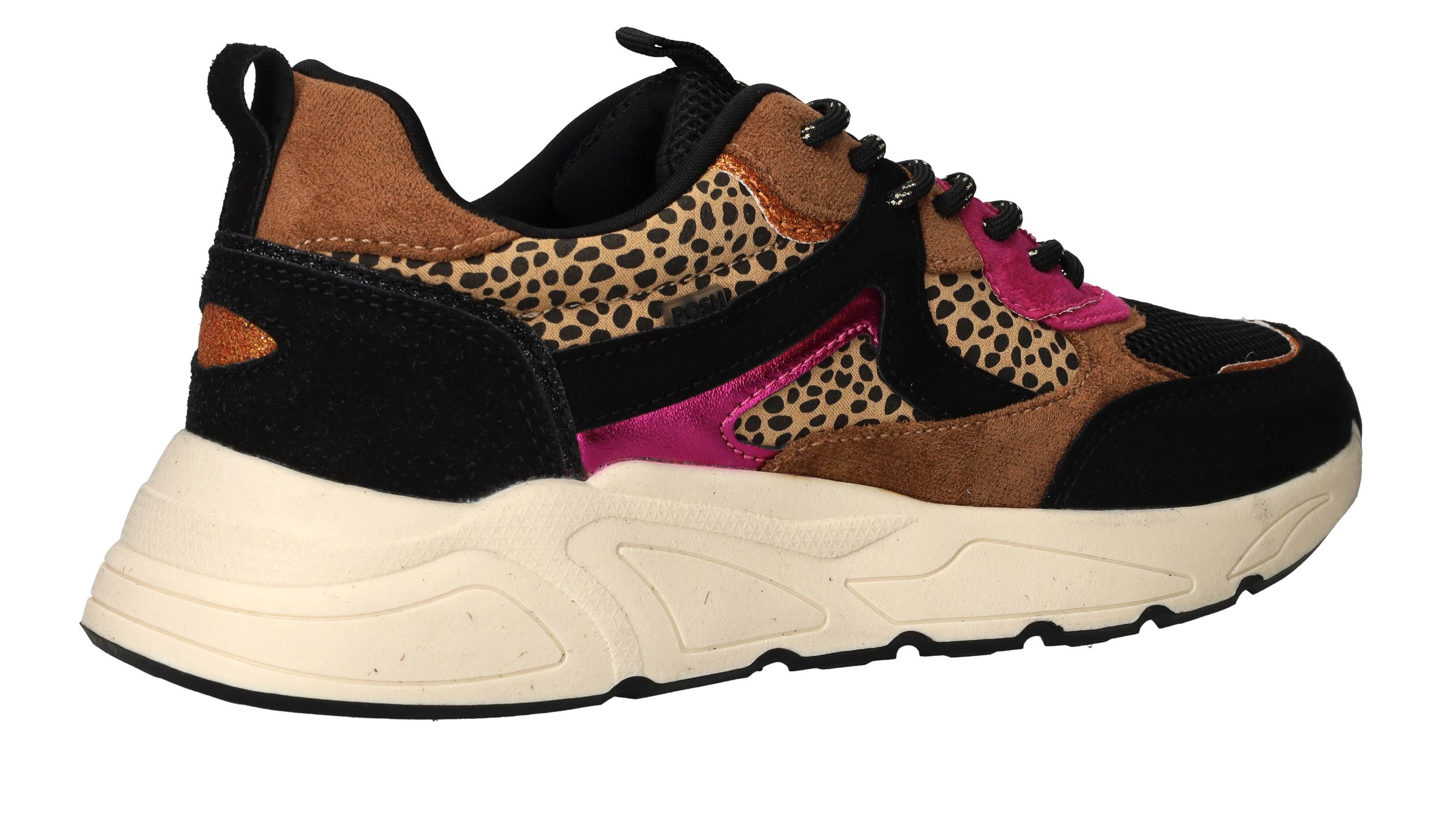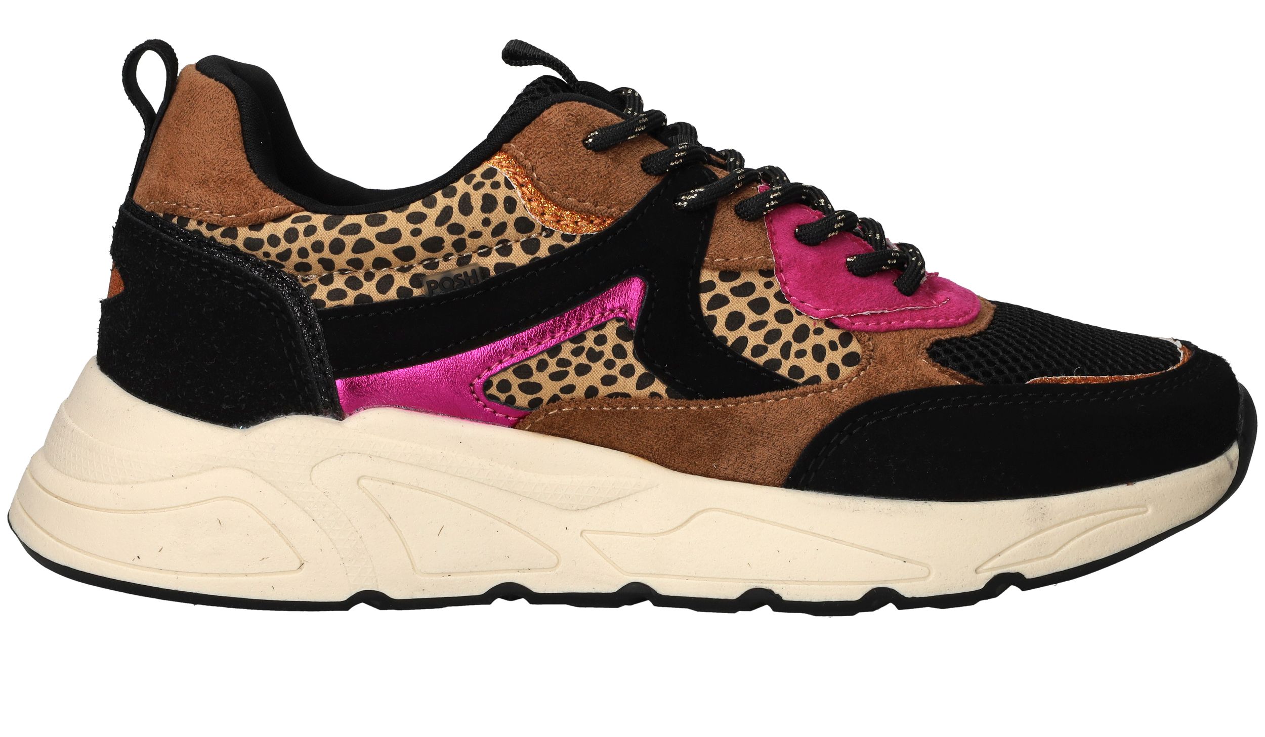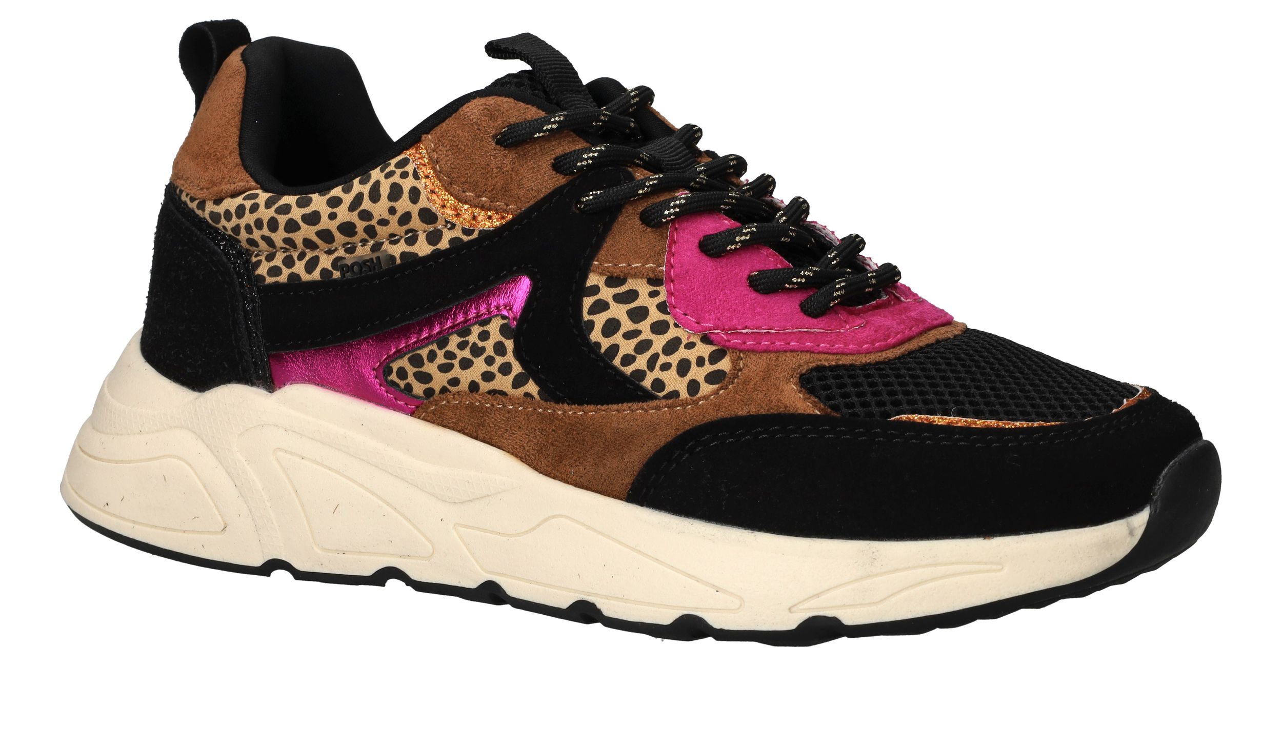 Vrolijke zwarte POSH By Poelman sneaker met dierenprint en toffe metallic roze accenten.