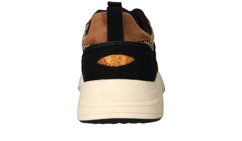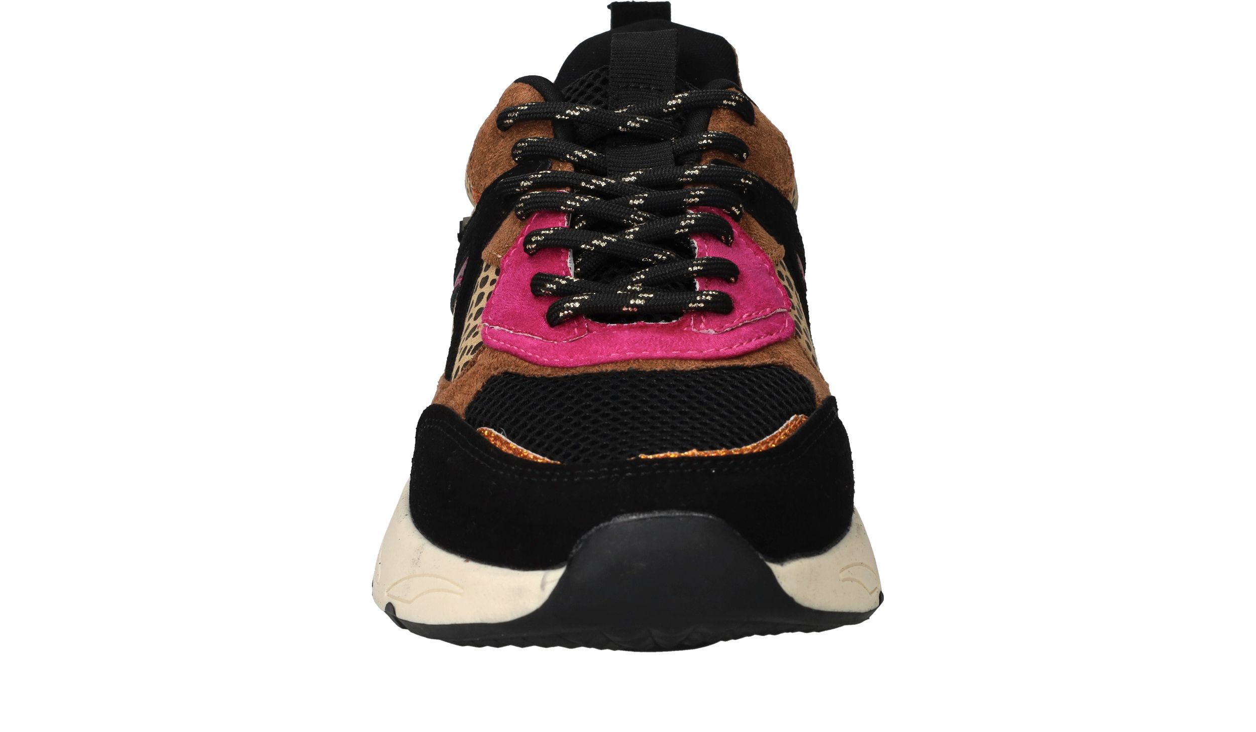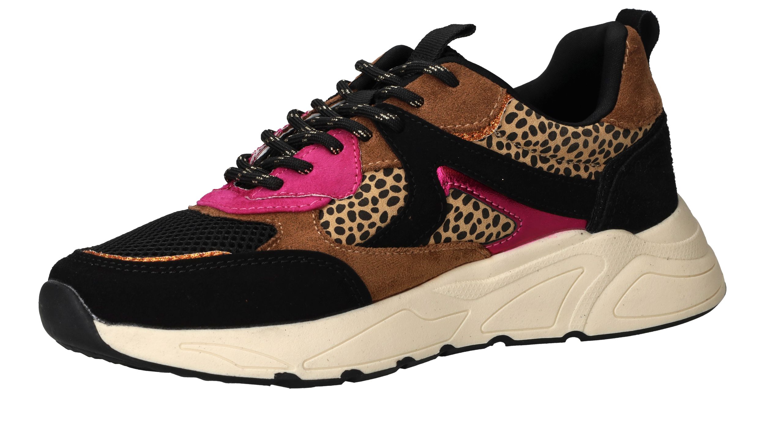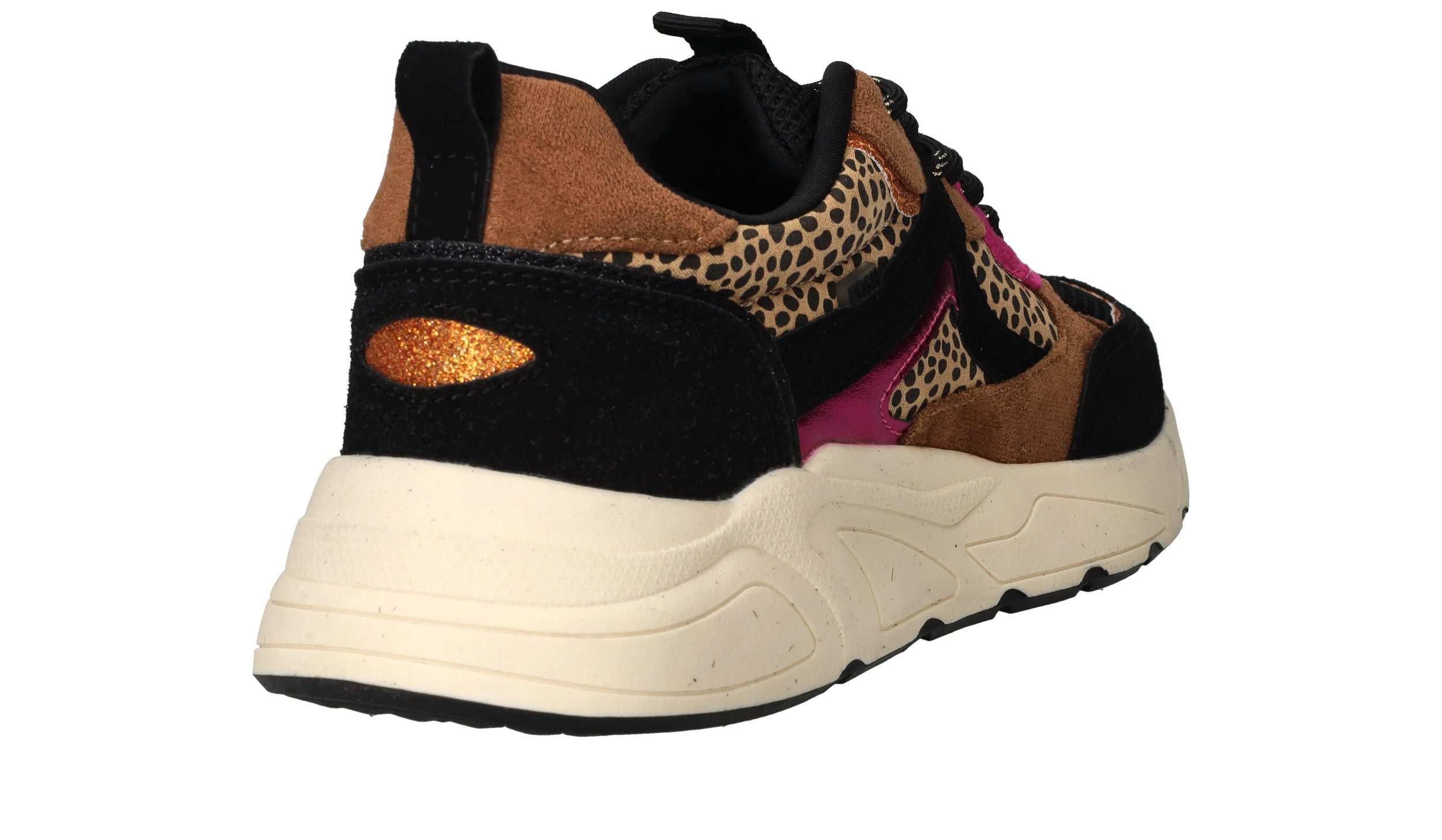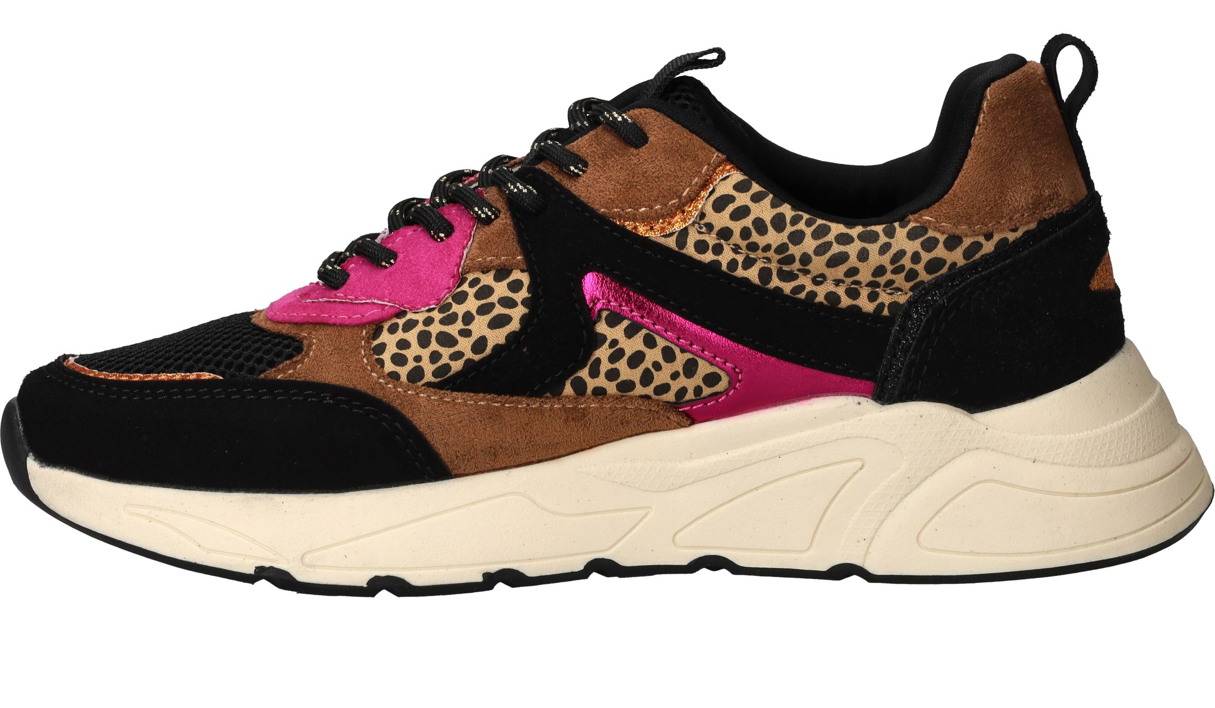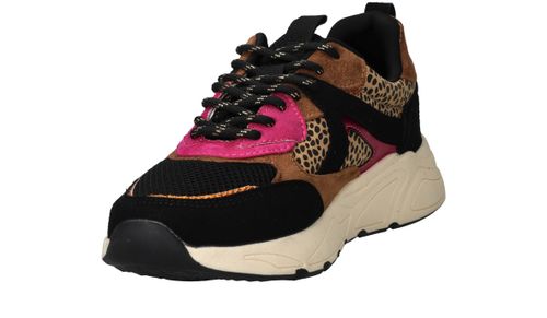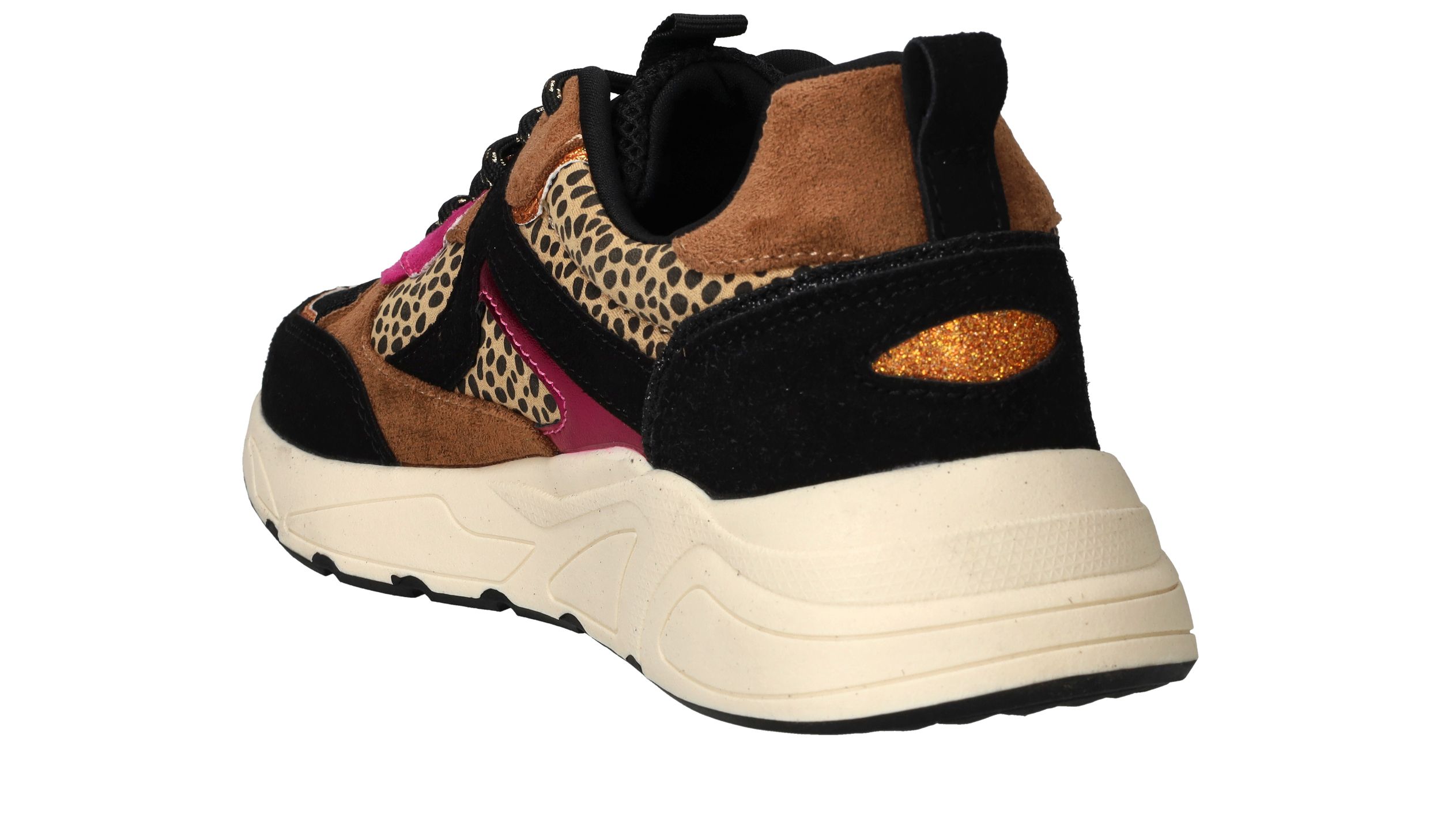 Vrolijke zwarte POSH By Poelman sneaker met dierenprint en toffe metallic roze accenten.