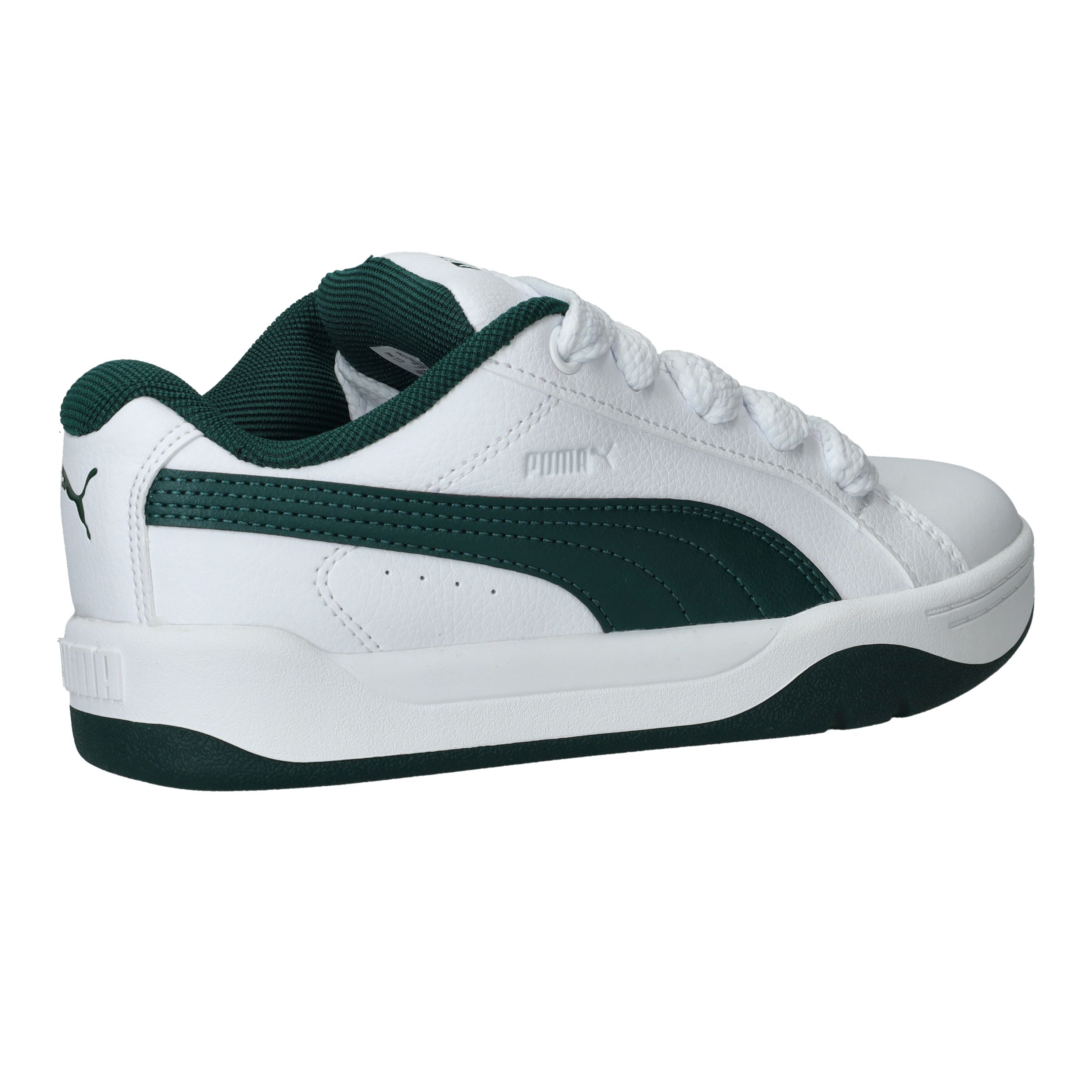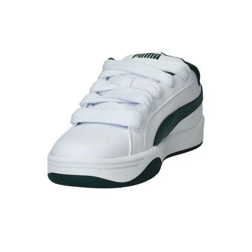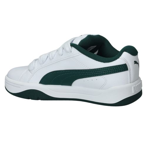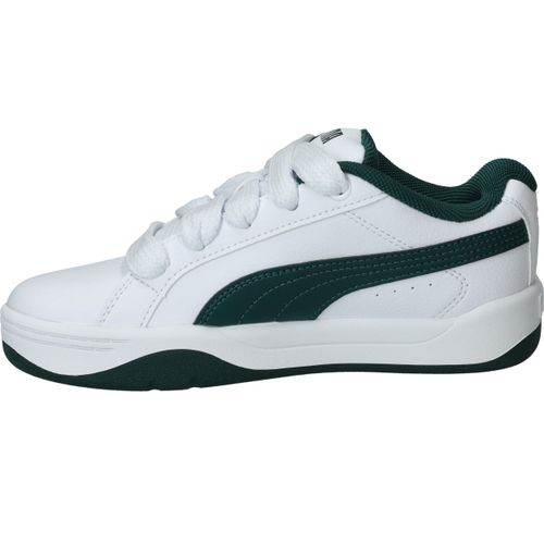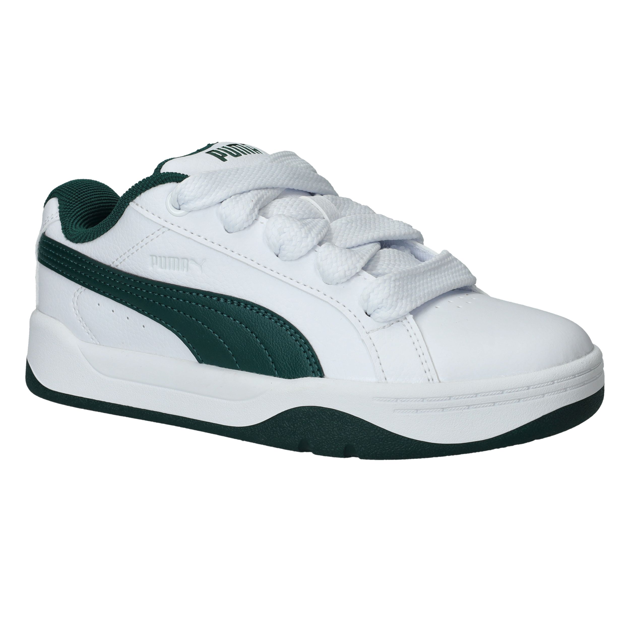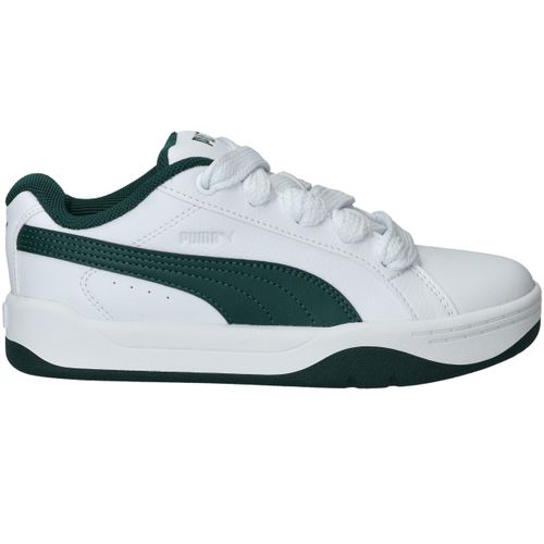 Wat meteen opvalt zijn de brede veters van deze Puma Park Lifestyle Easy sneaker voor jongens. De witte sneaker heeft een toffe groene streep en zool.