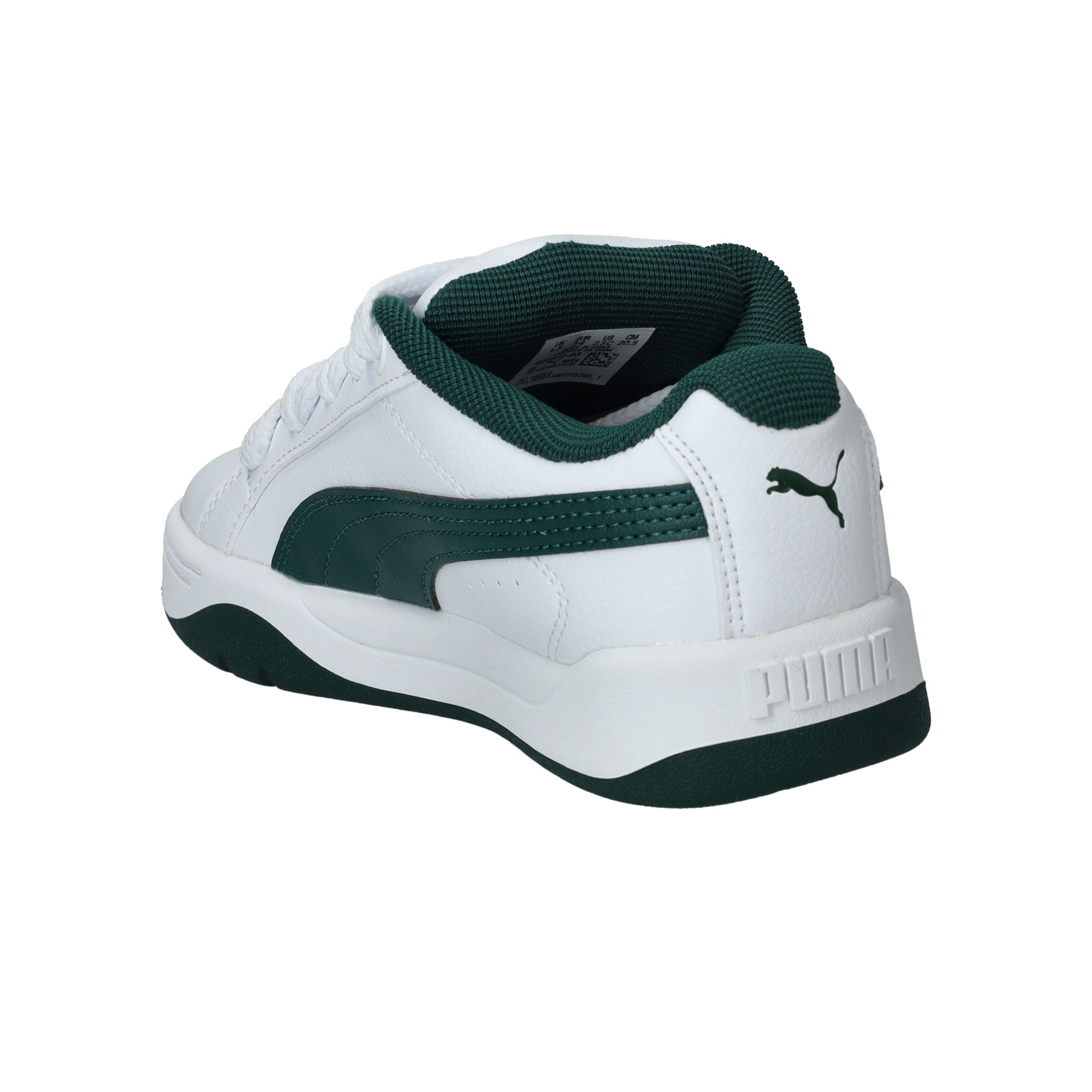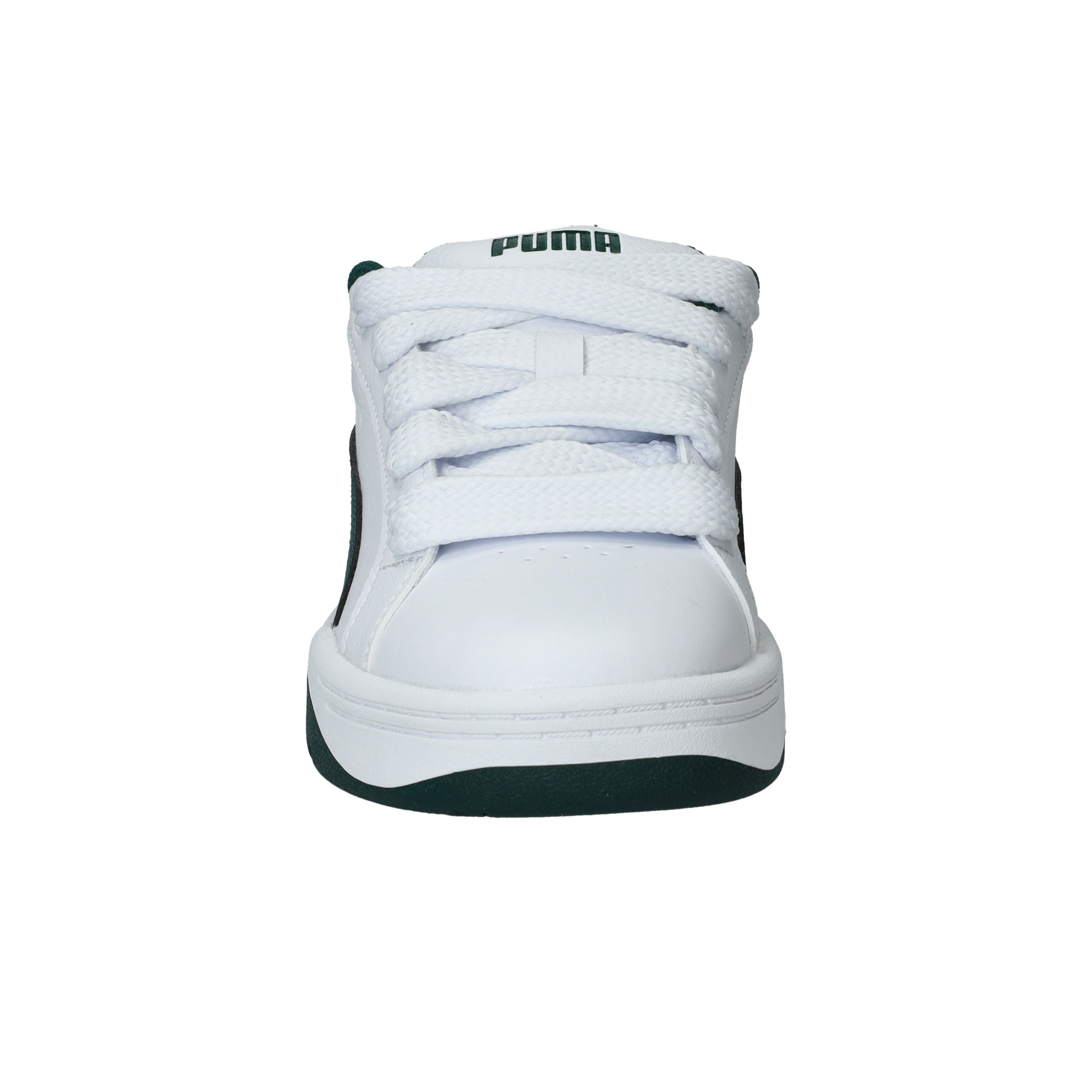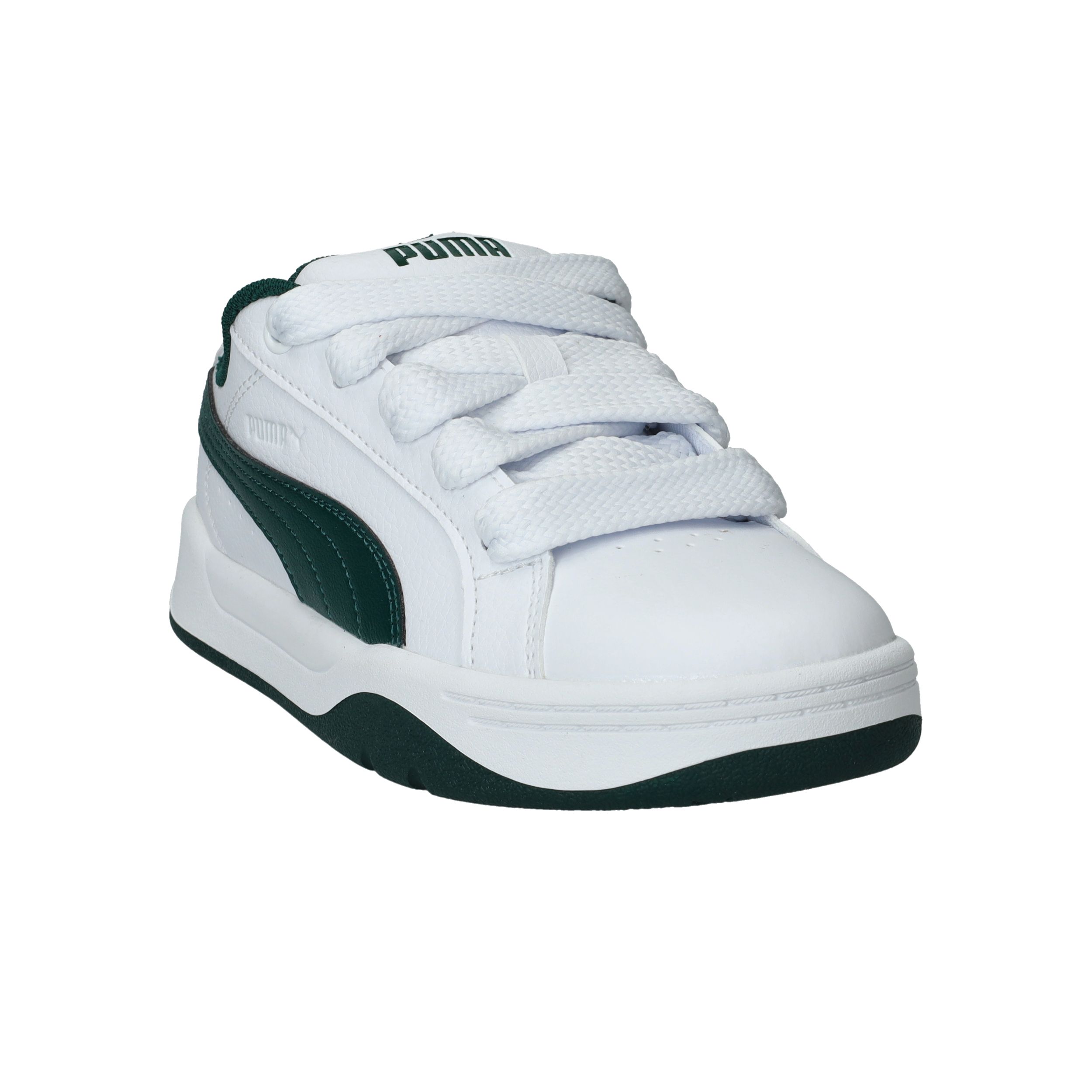 Wat meteen opvalt zijn de brede veters van deze Puma Park Lifestyle Easy sneaker voor jongens. De witte sneaker heeft een toffe groene streep en zool.