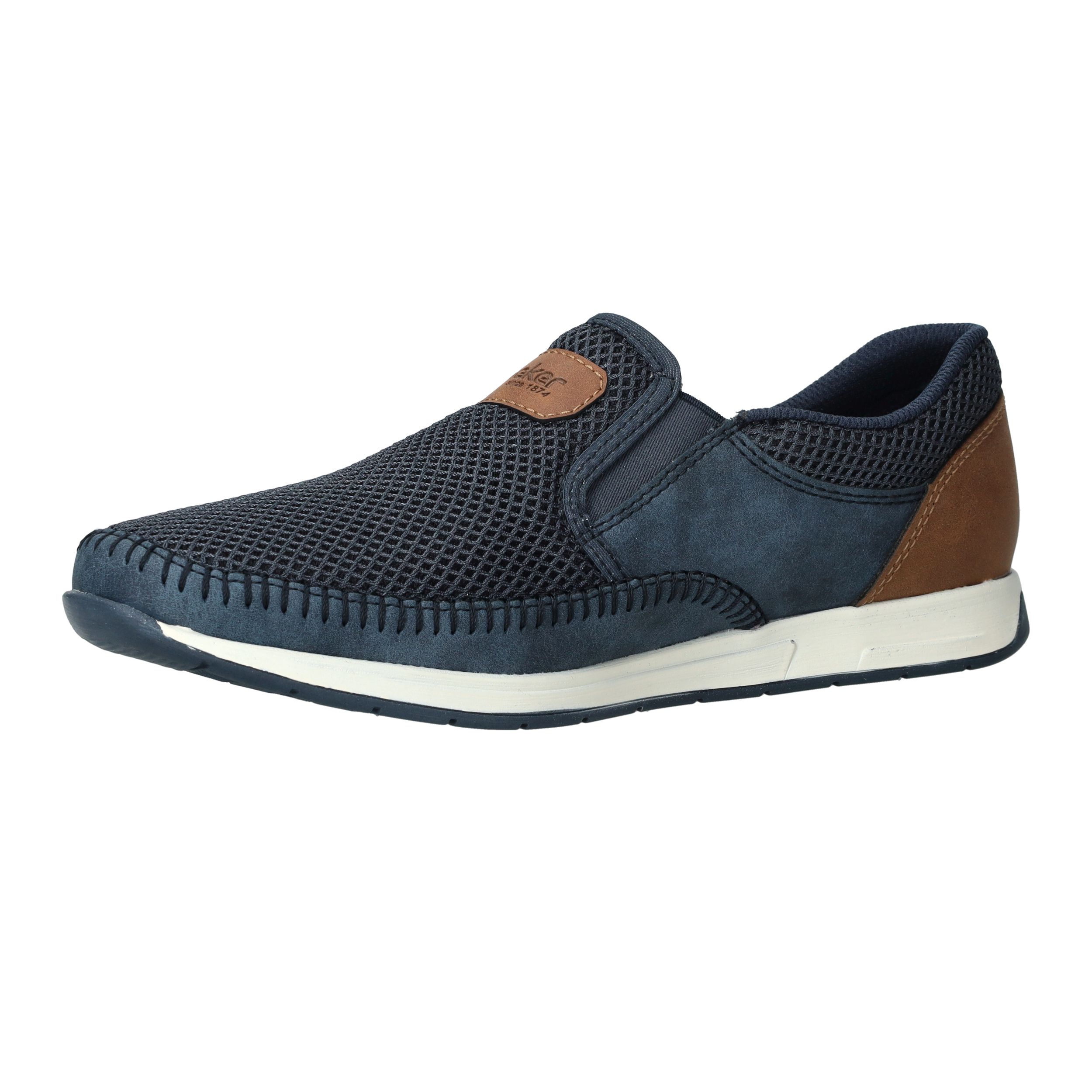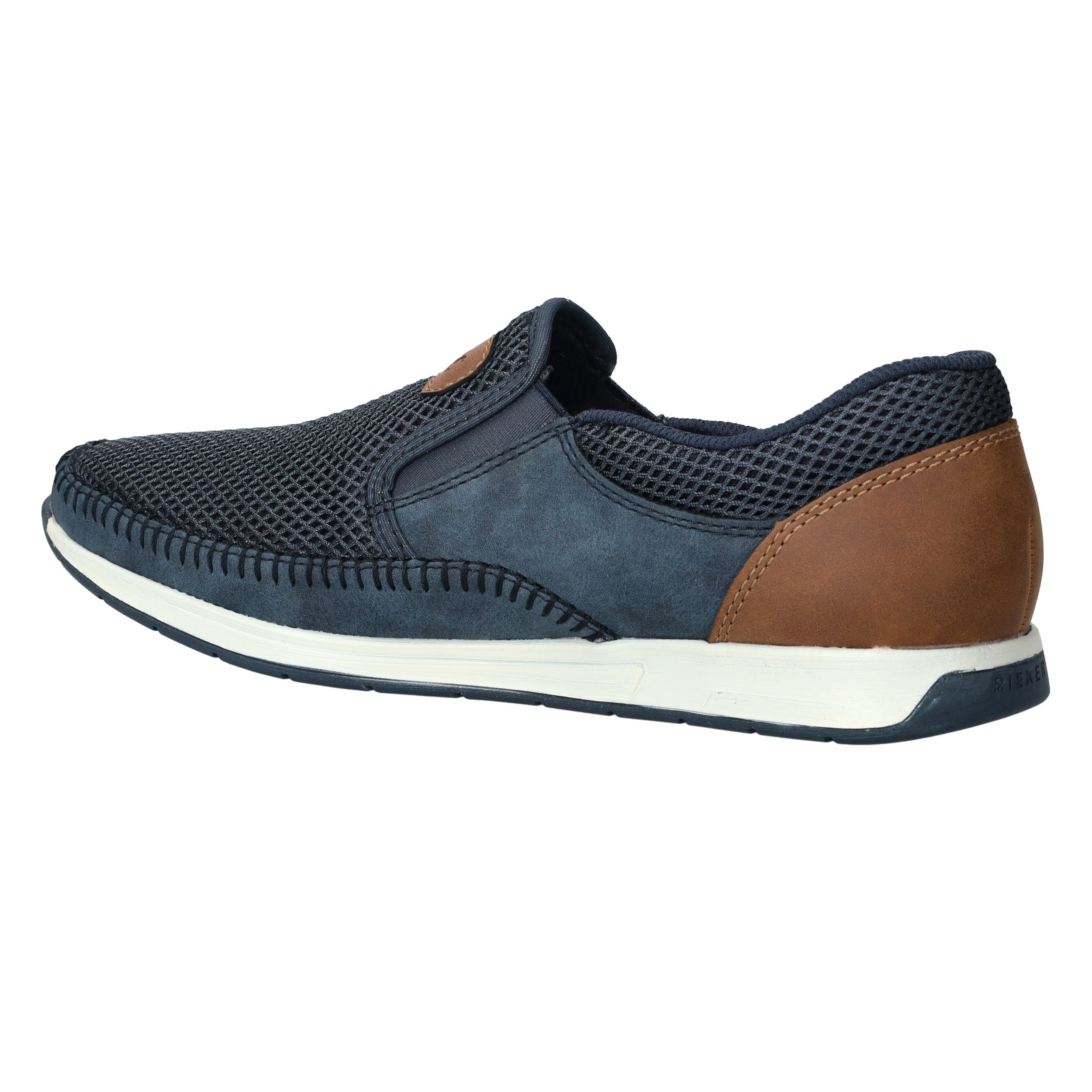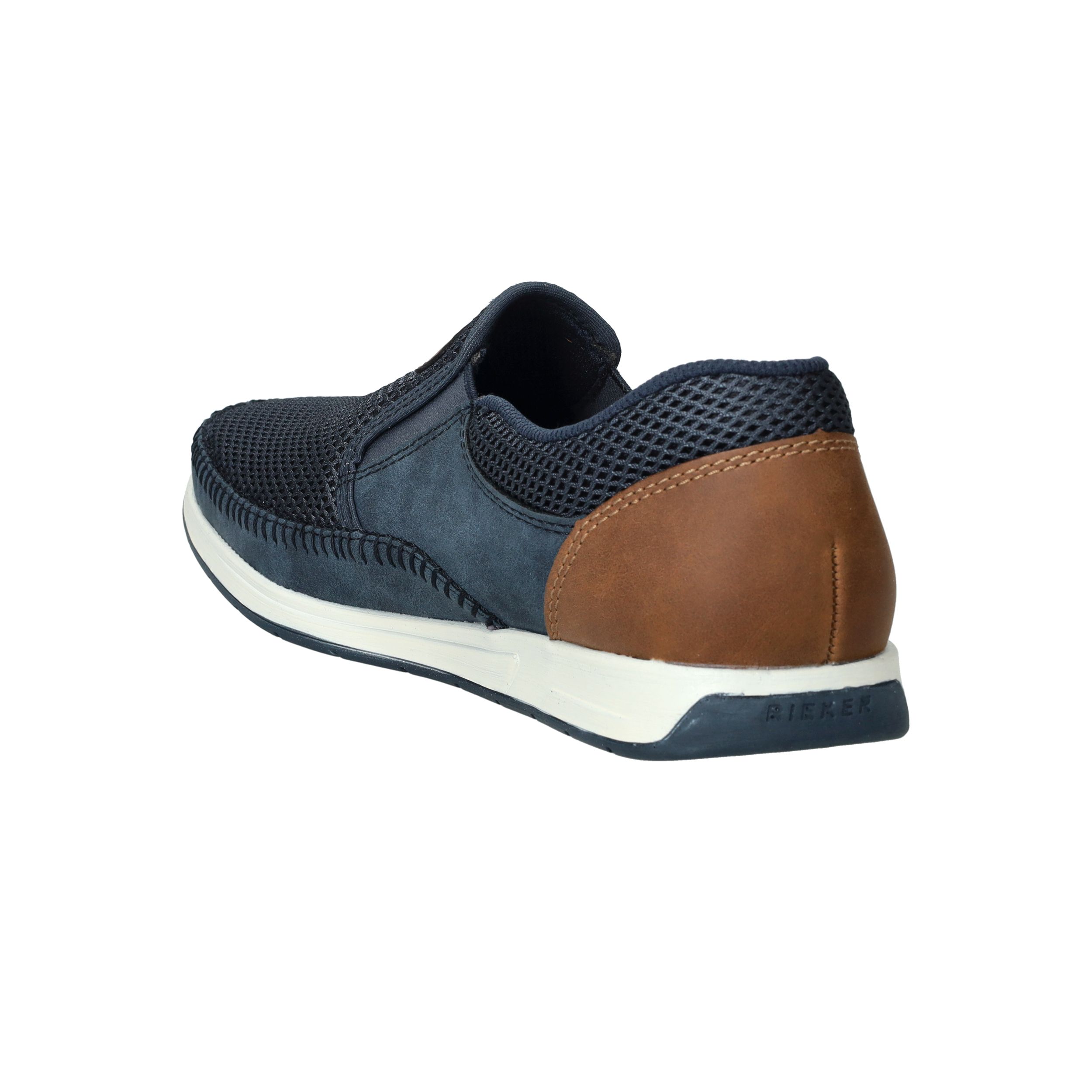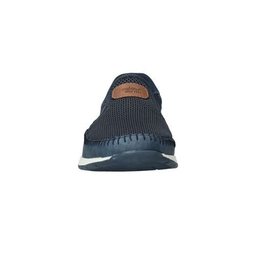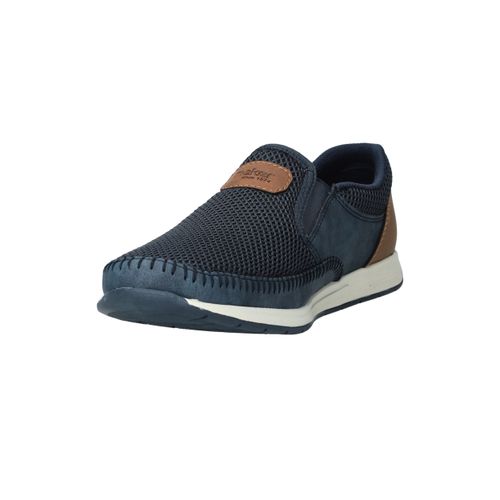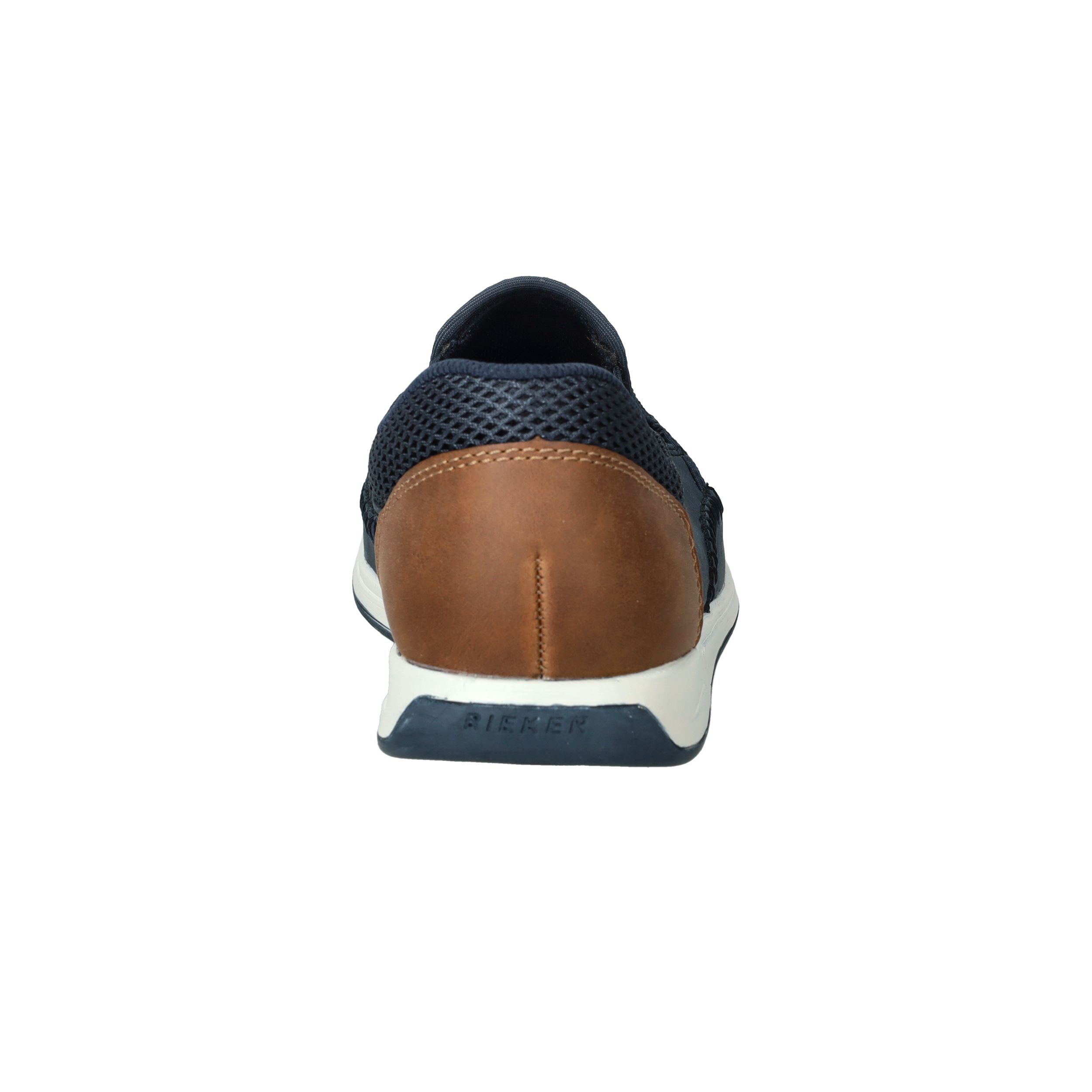 Sportieve Rieker instapper voor heren. De blauwe instapper is afgewerkt met cognac details.