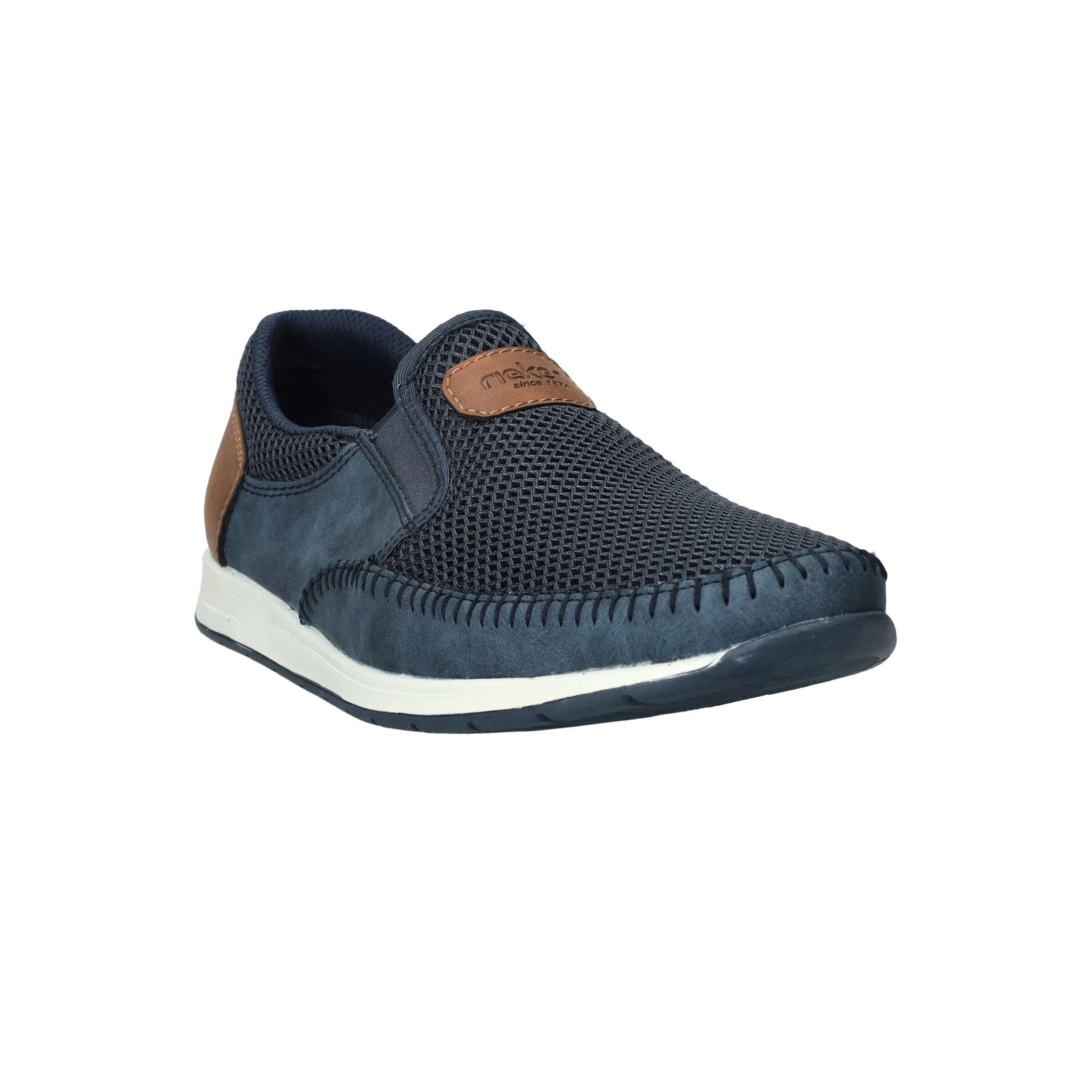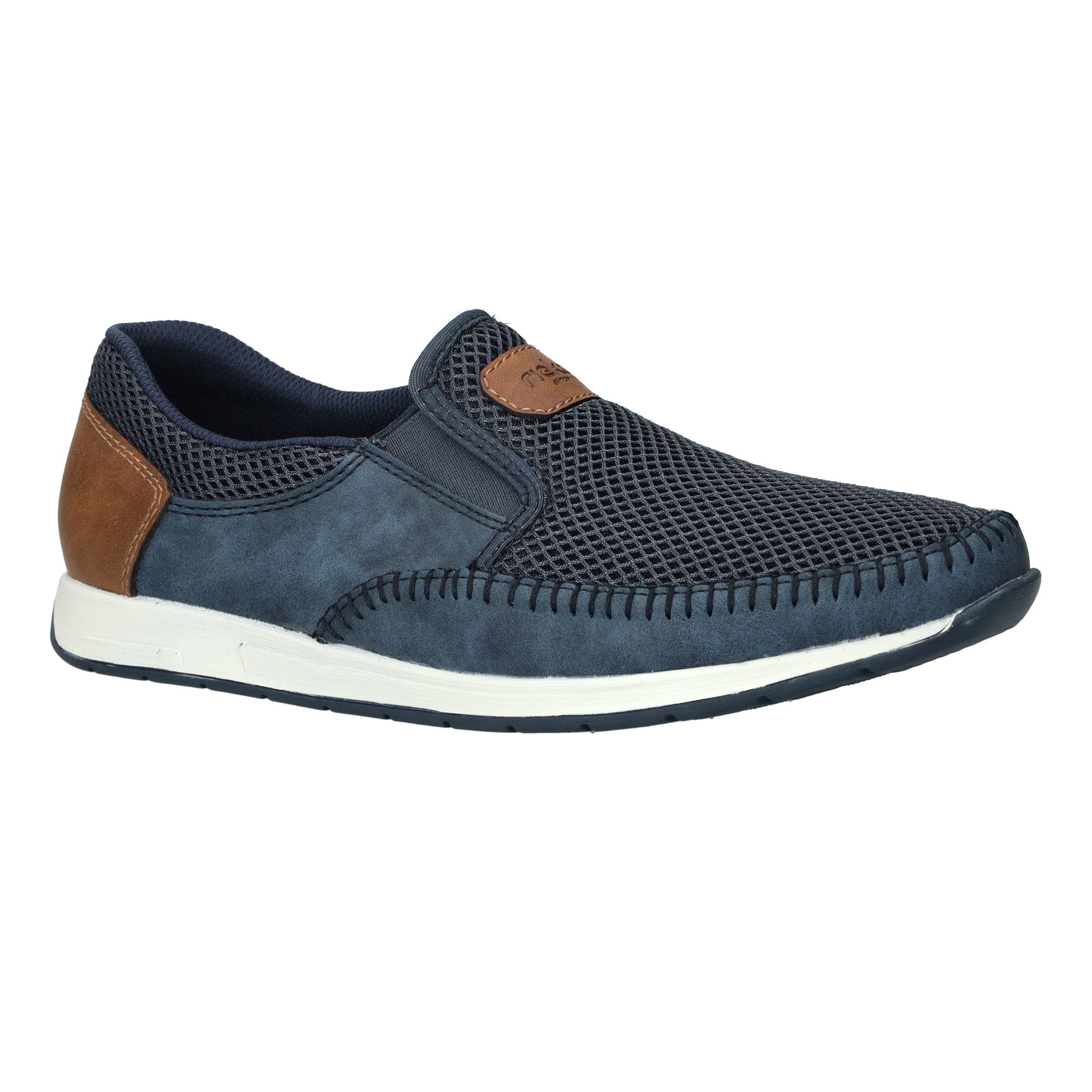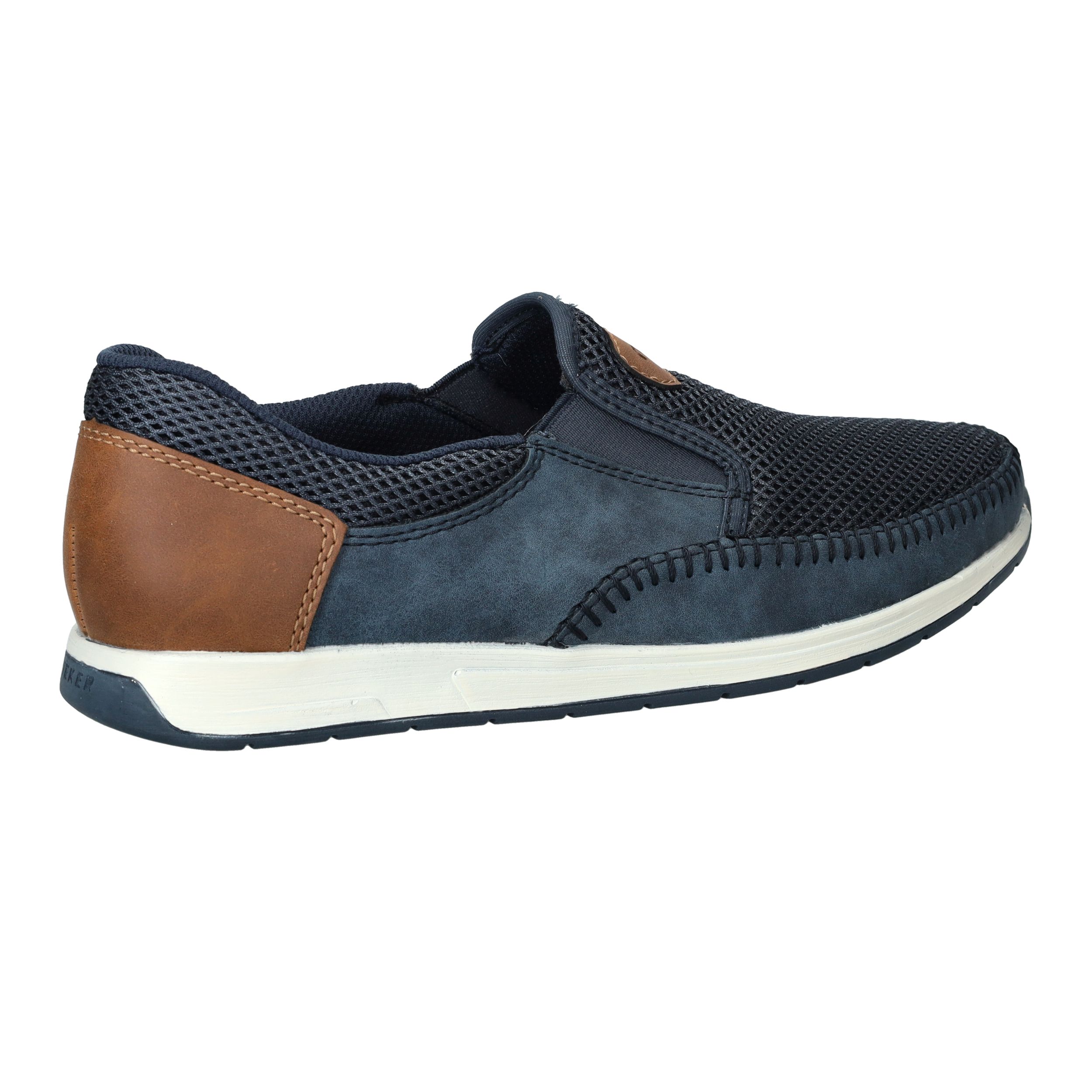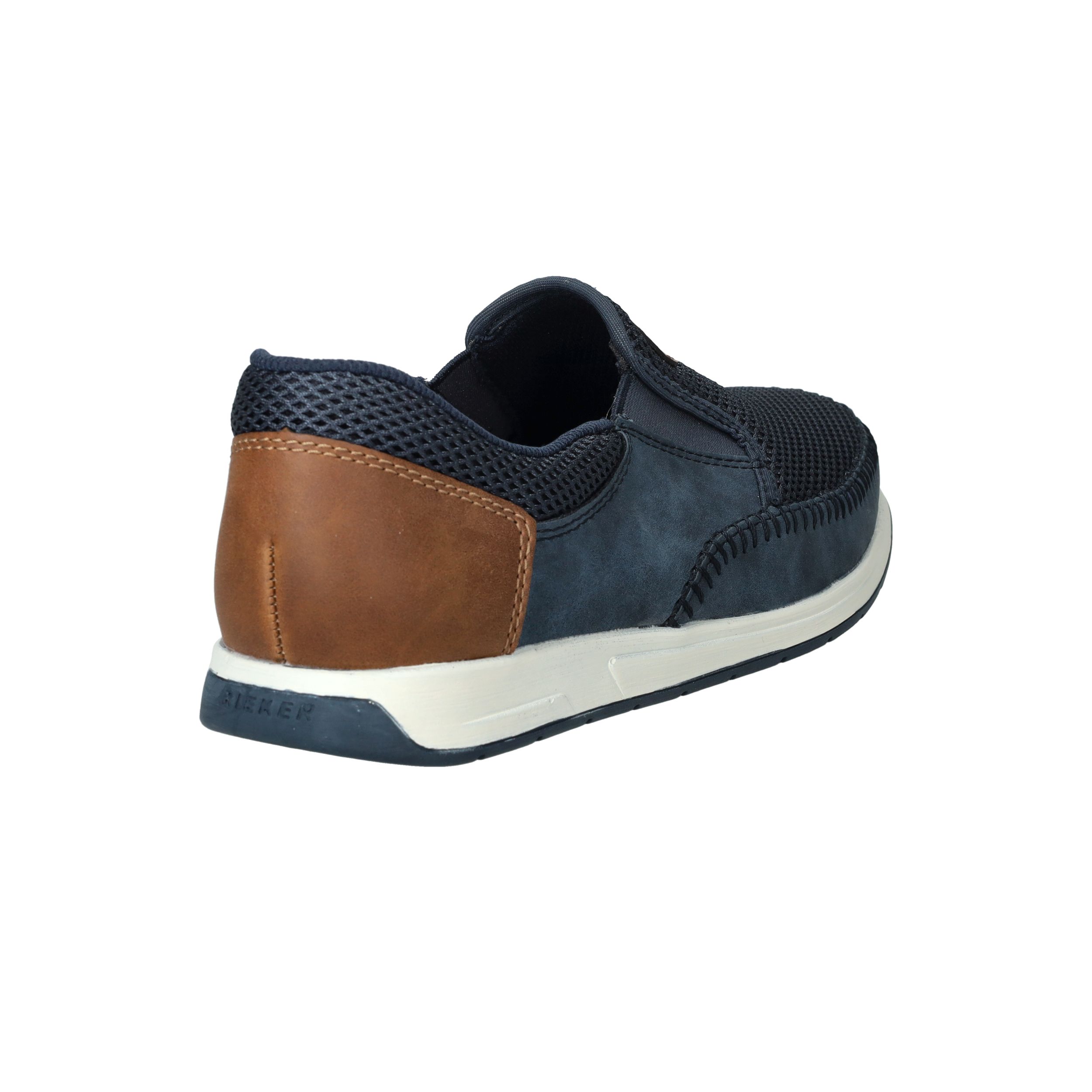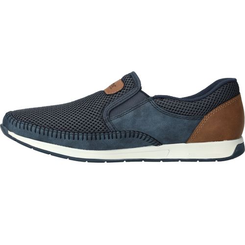 Sportieve Rieker instapper voor heren. De blauwe instapper is afgewerkt met cognac details.