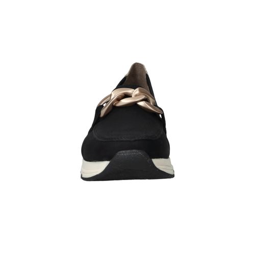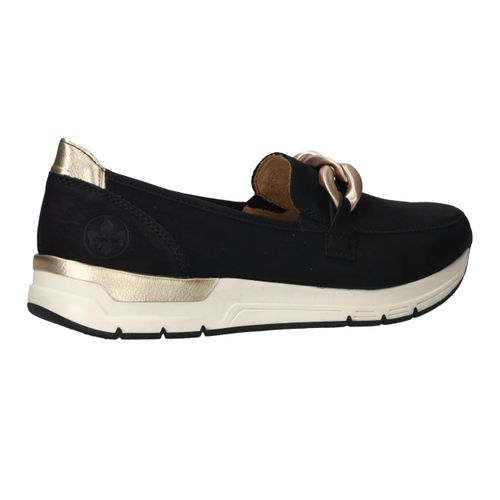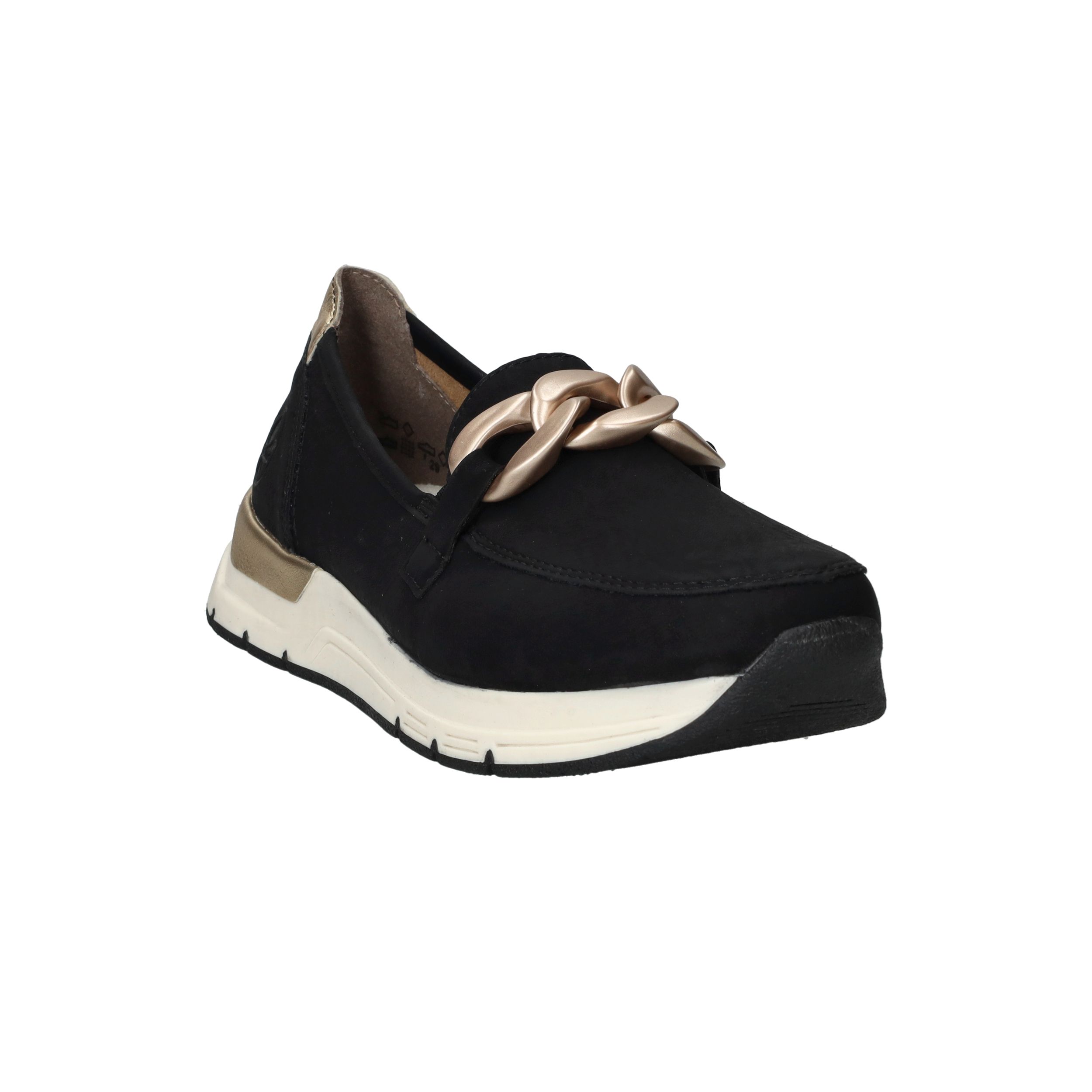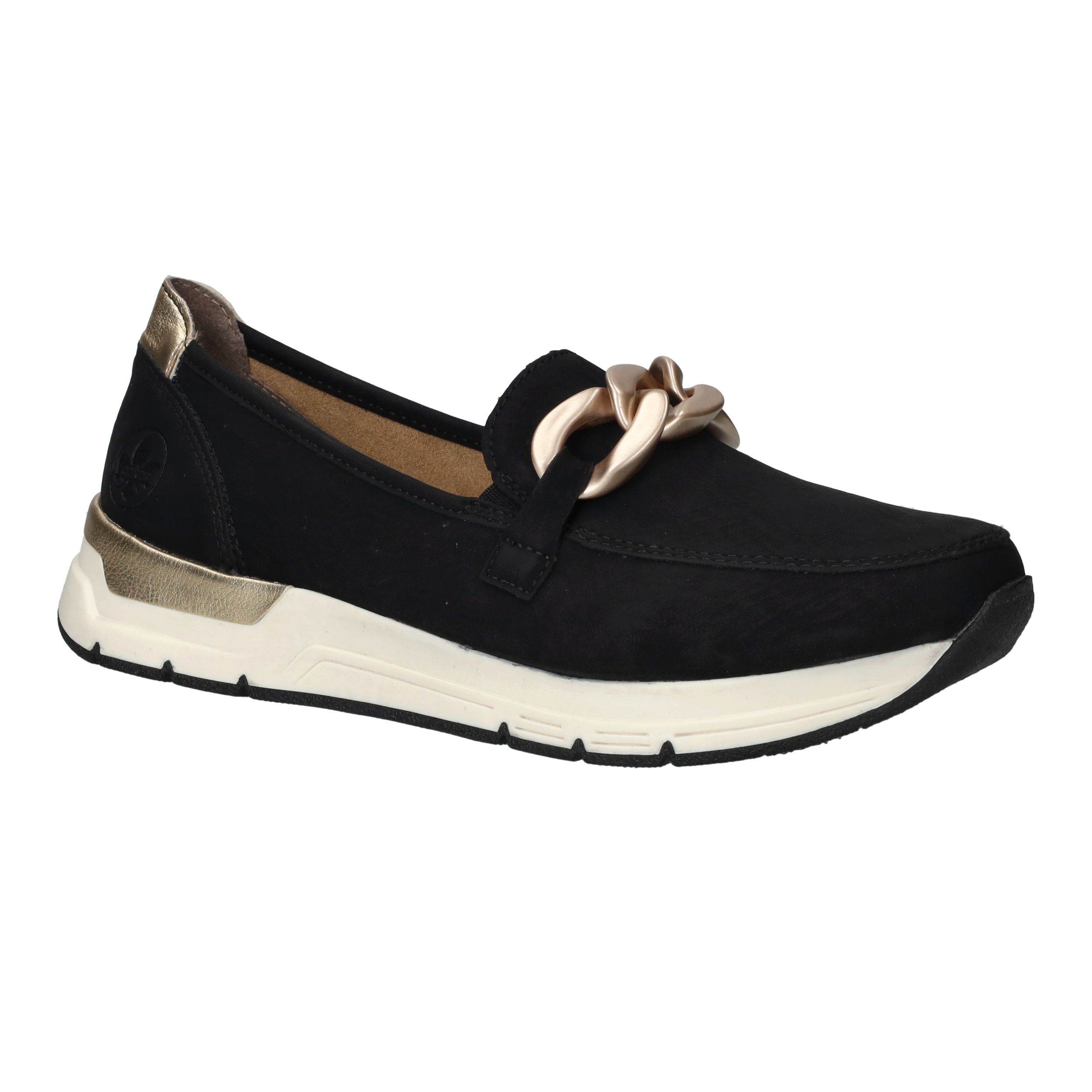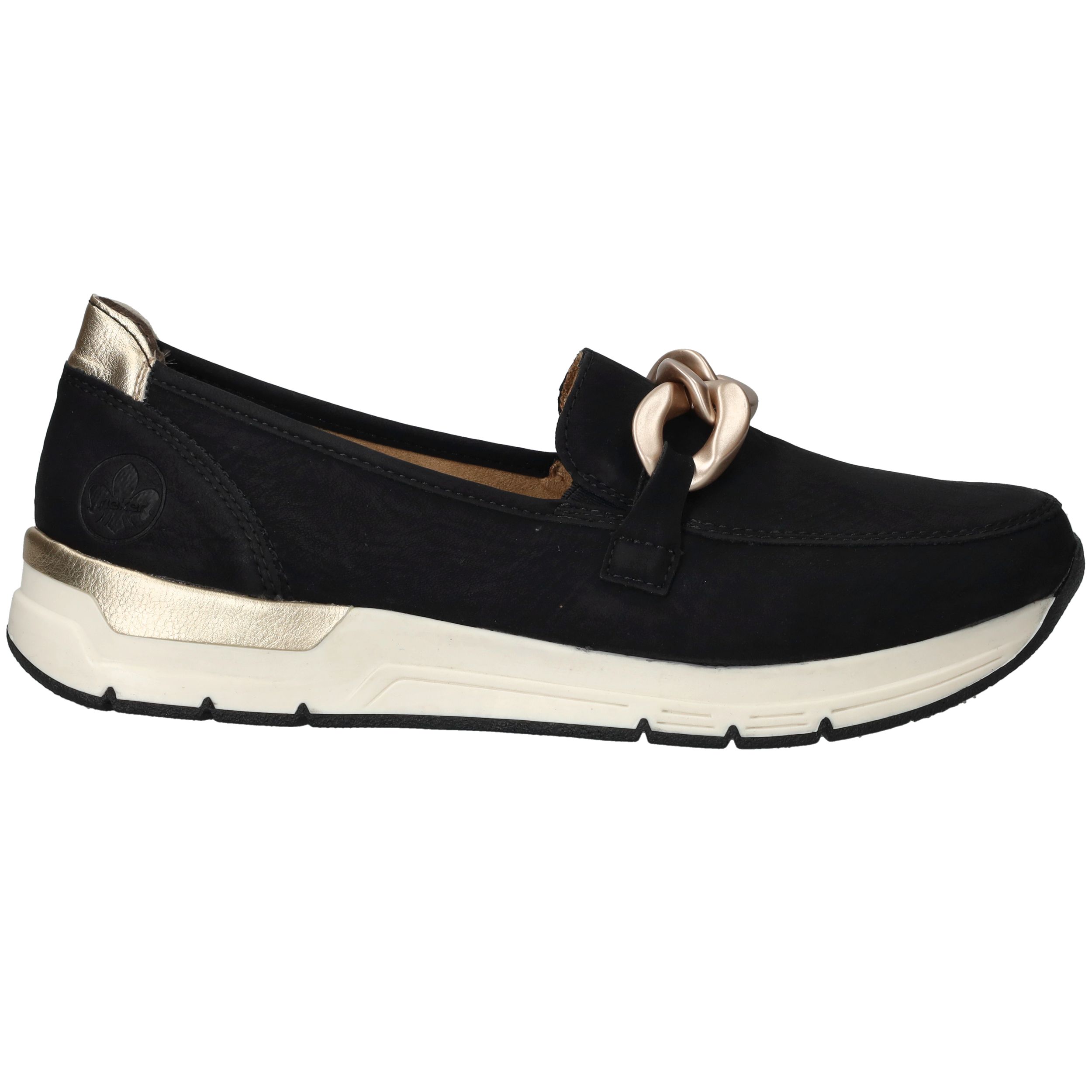 Dit is een stijlvolle Rieker instapper met een sportieve uitstraling. De zwarte instapper loopt heel comfortabel en heeft een sportieve zool.
