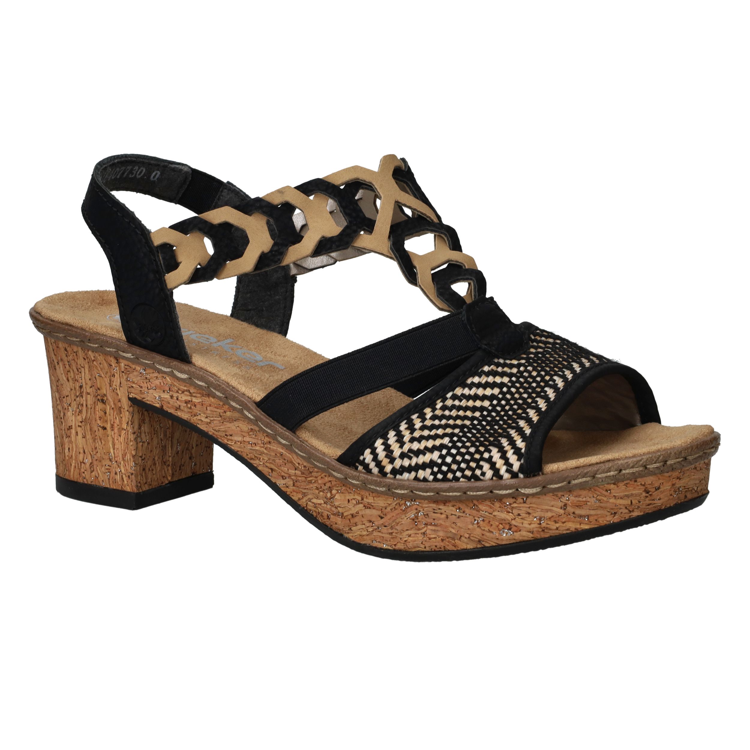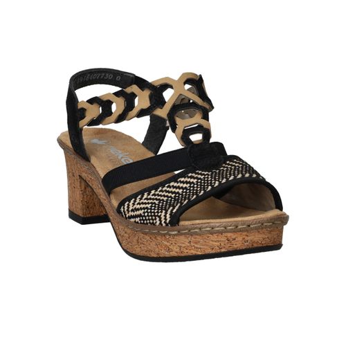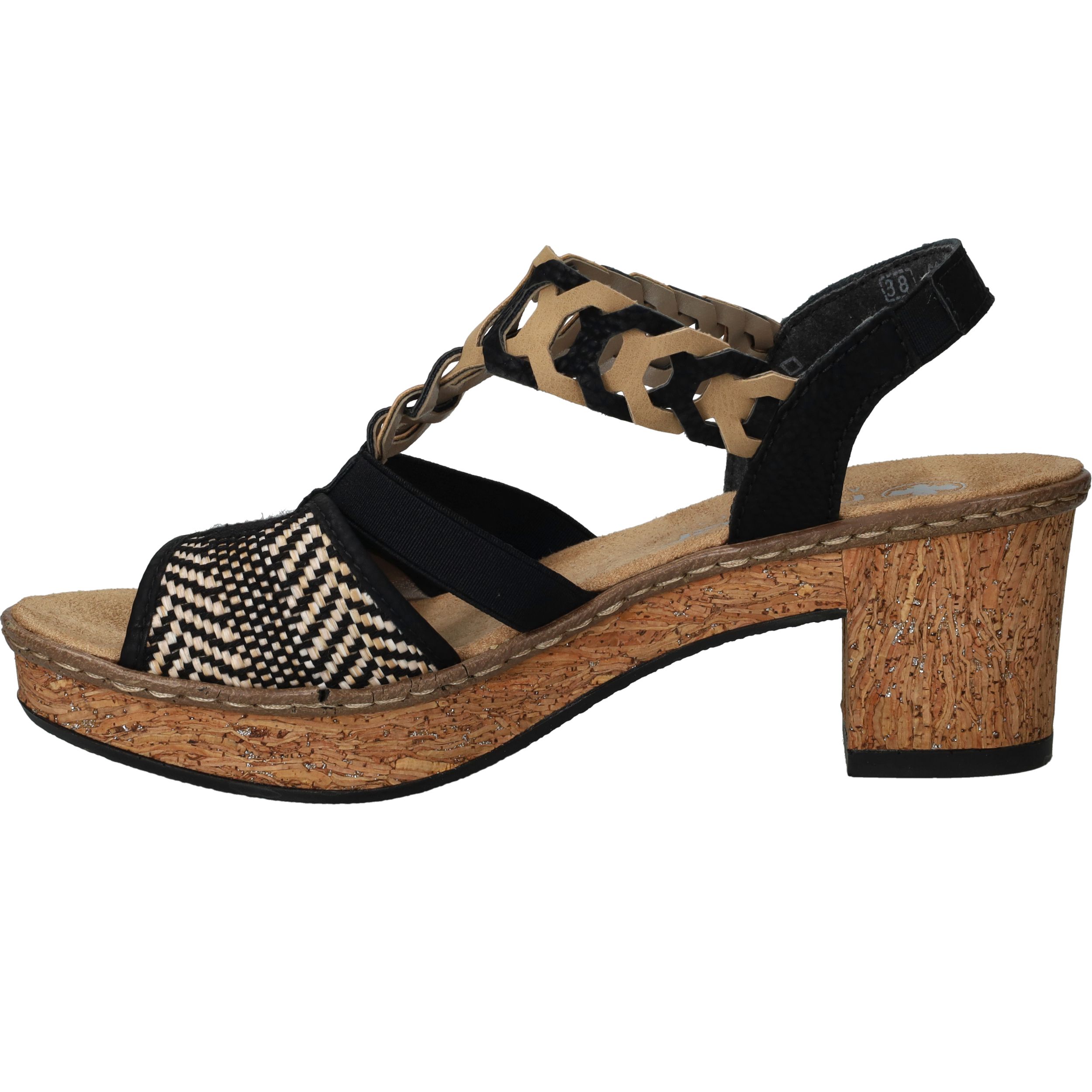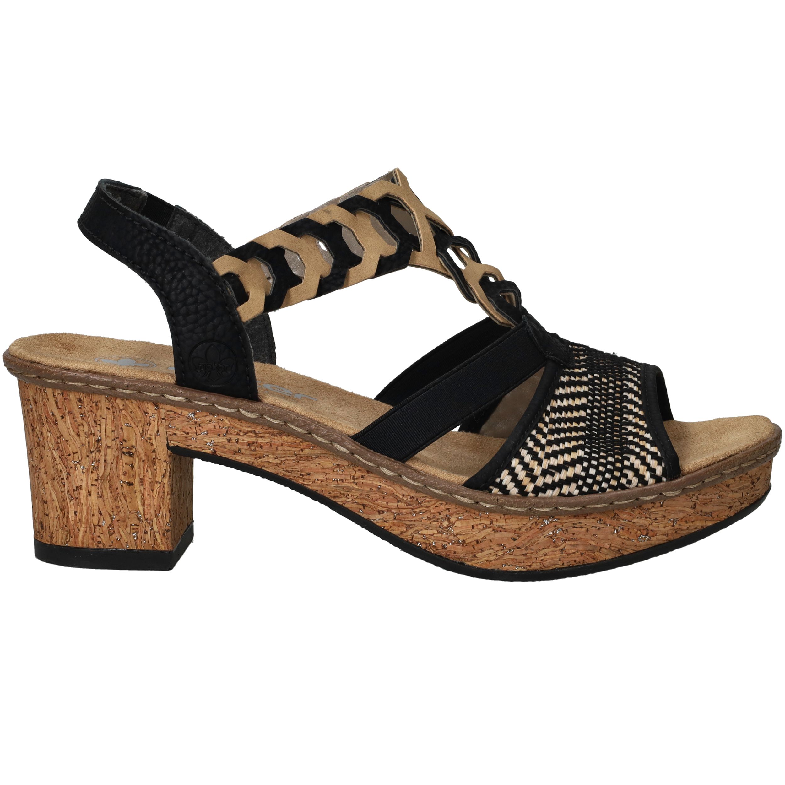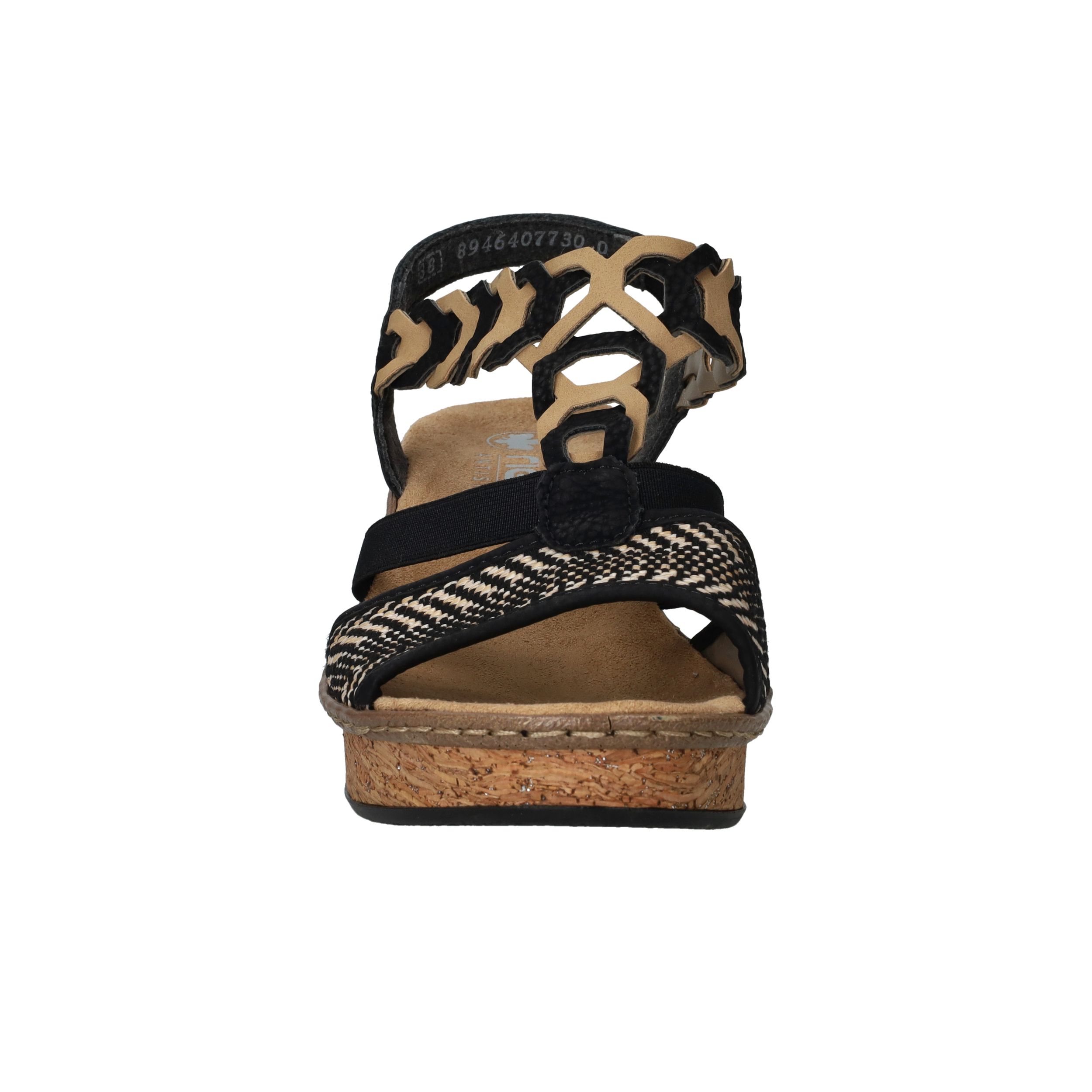 Mooie Rieker sandalette in het zwart met geweven bandjes. De sandalette heeft subtiele glitter in de zool.