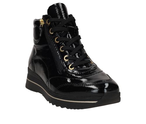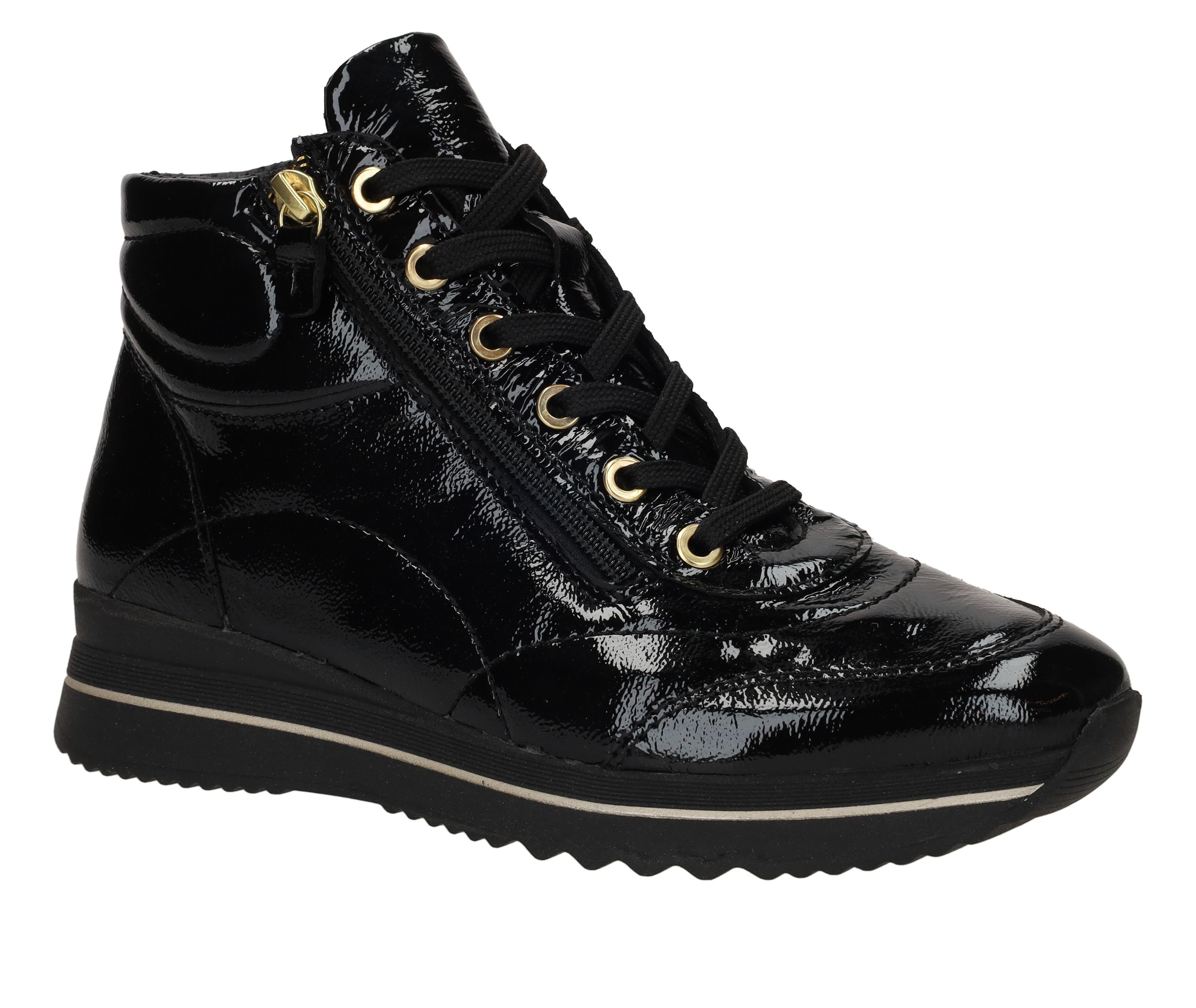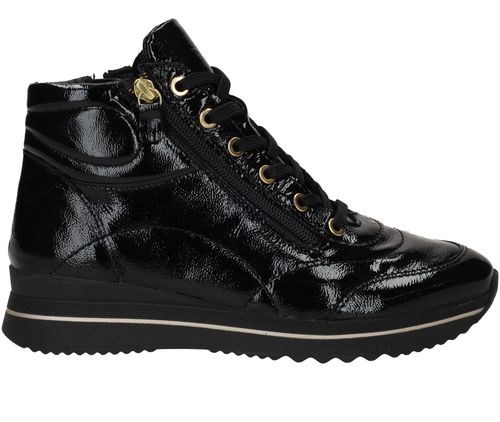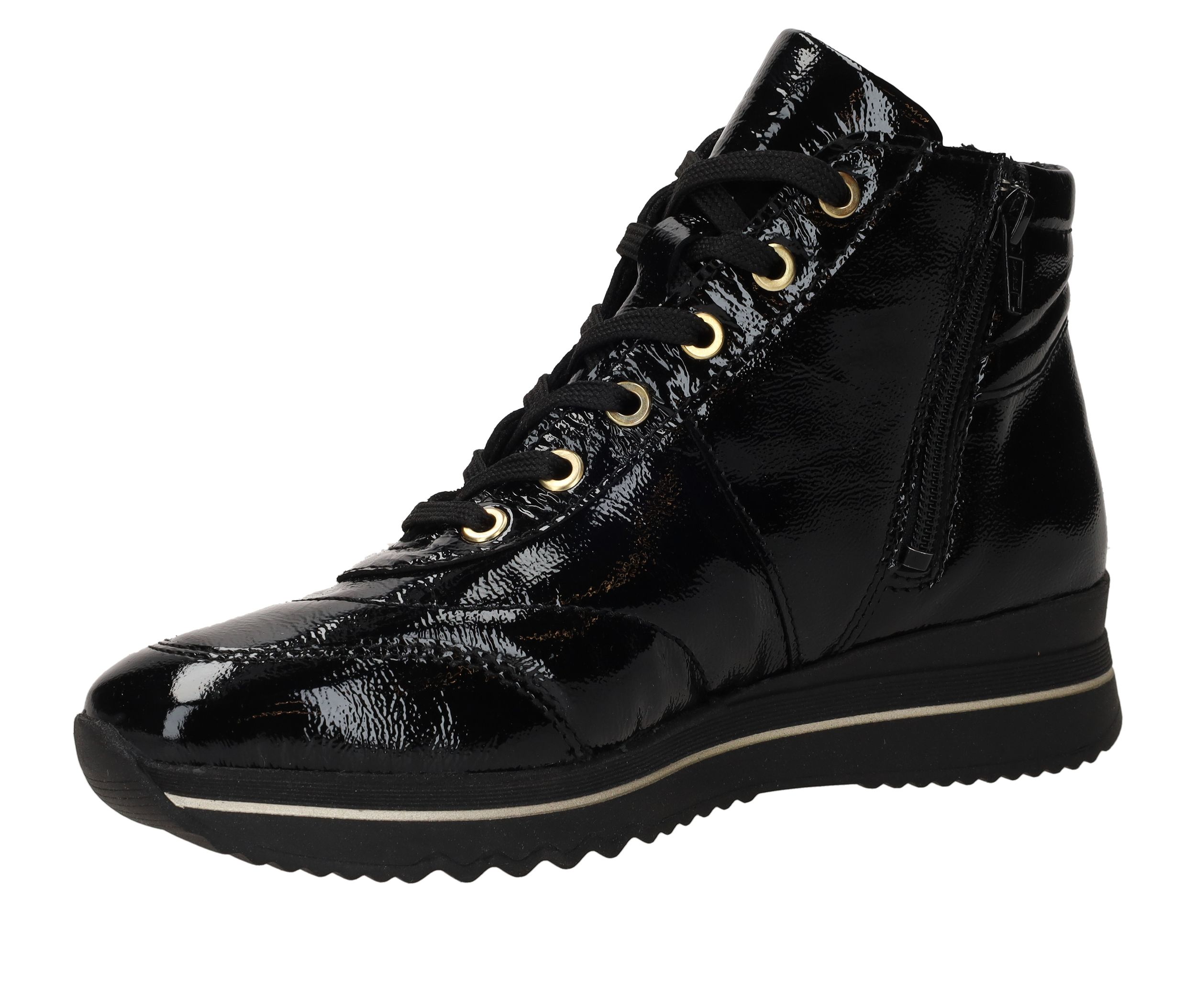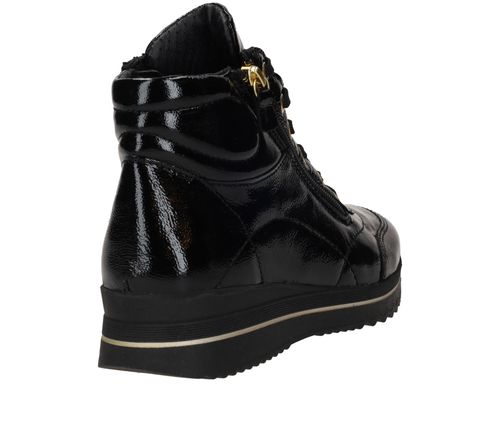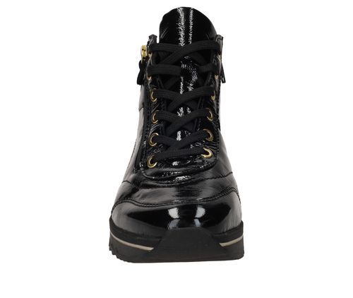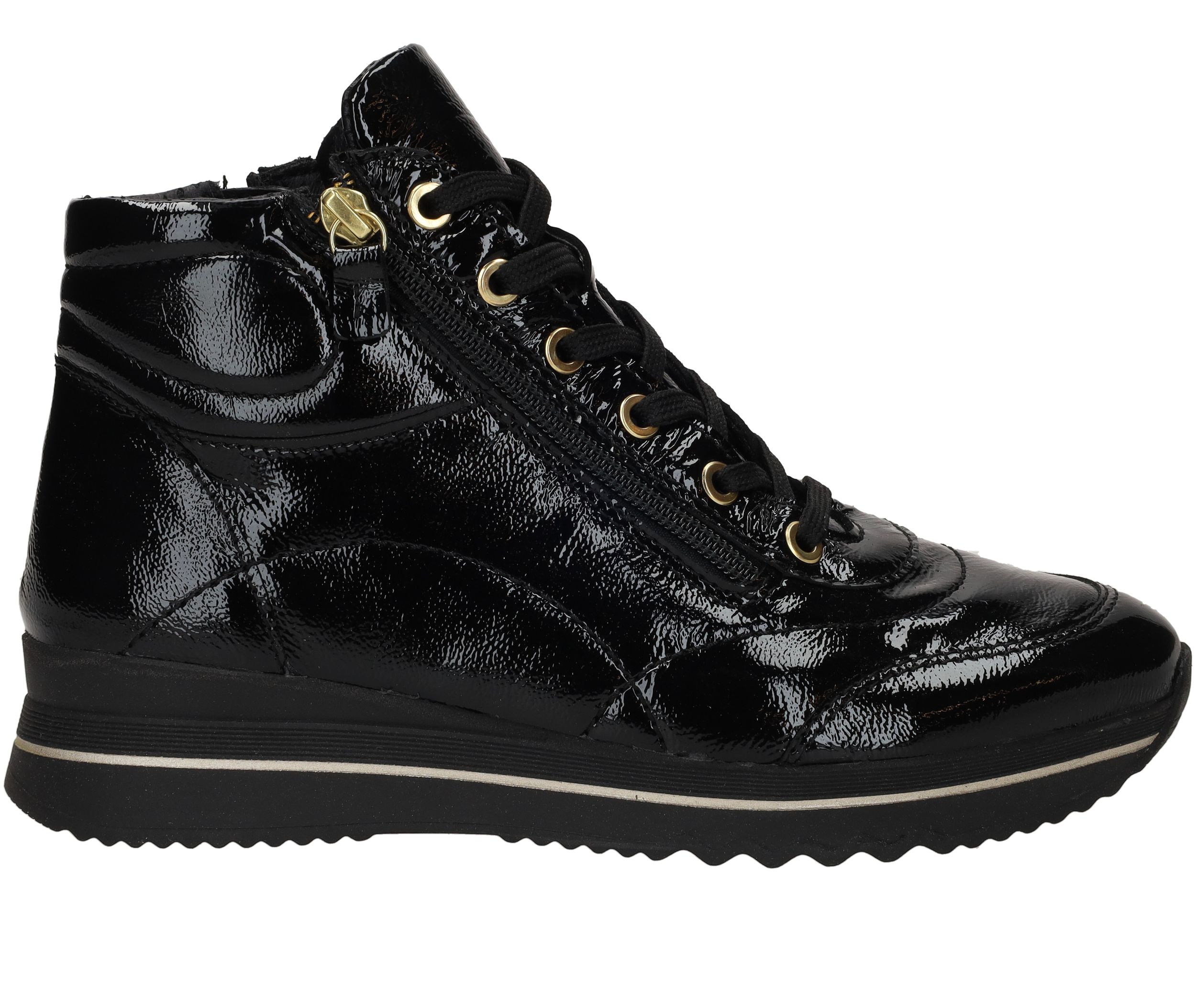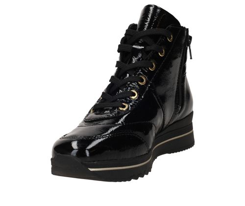 - De zwarte damesboot heeft voetwijdte H en is daarom geschikt voor een bredere voet.