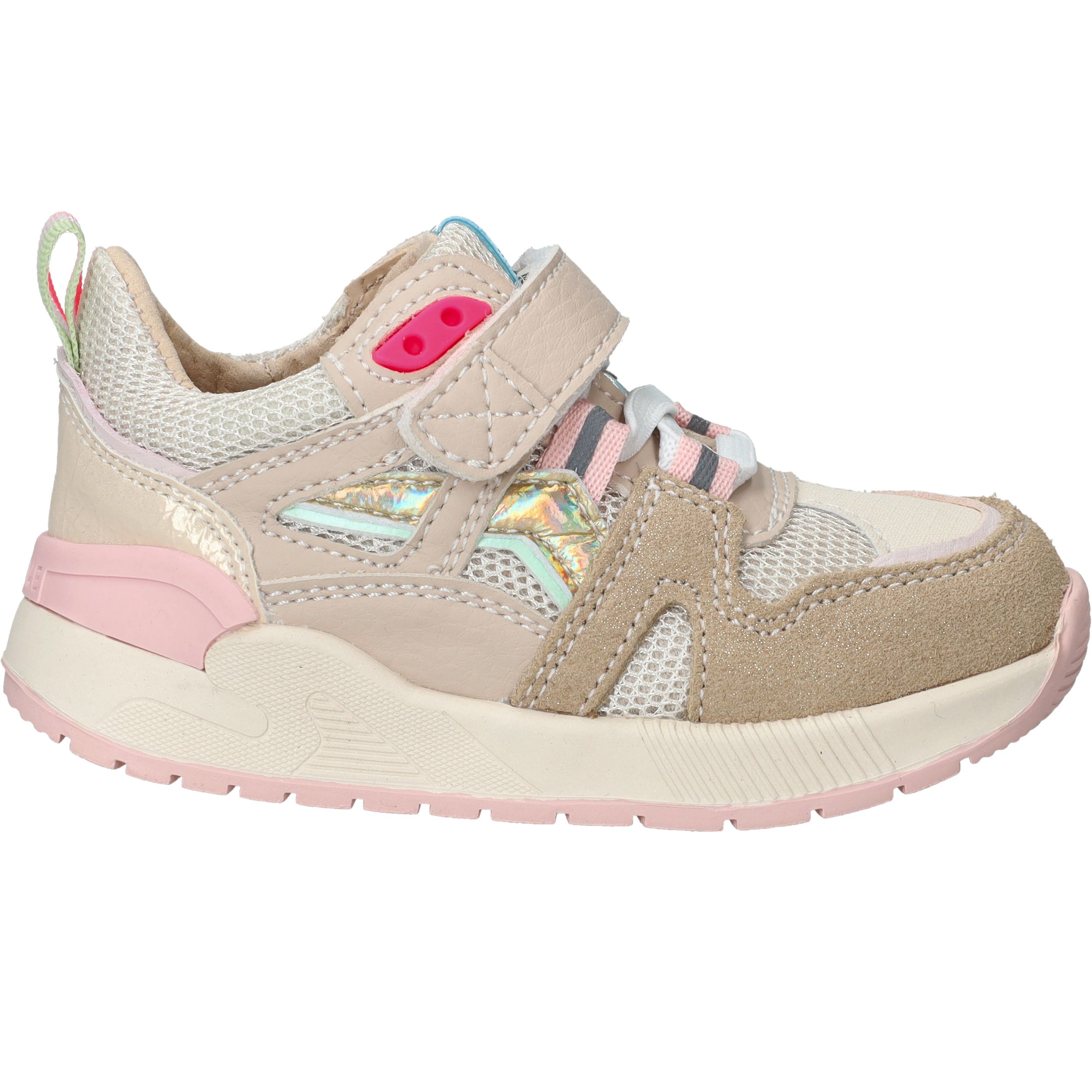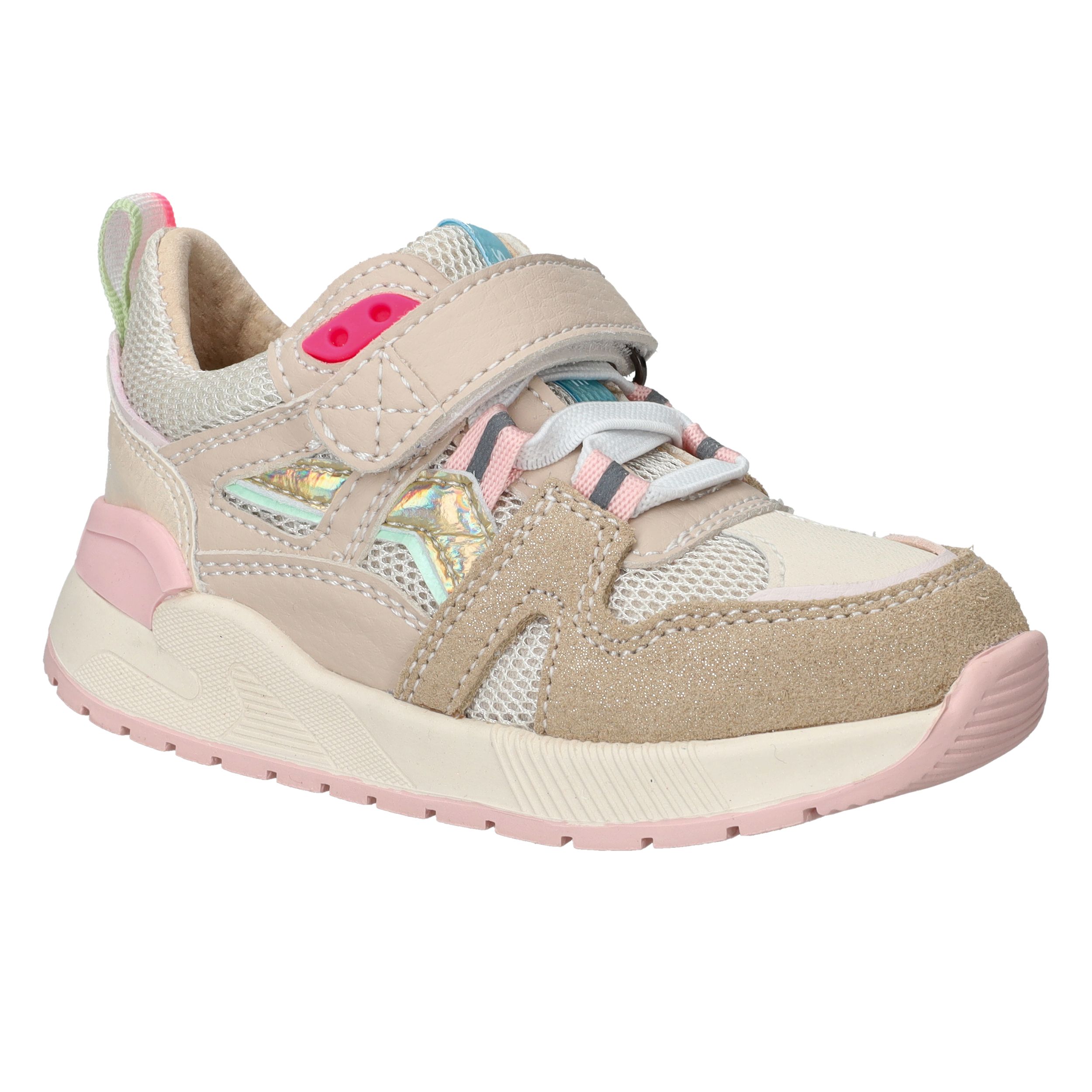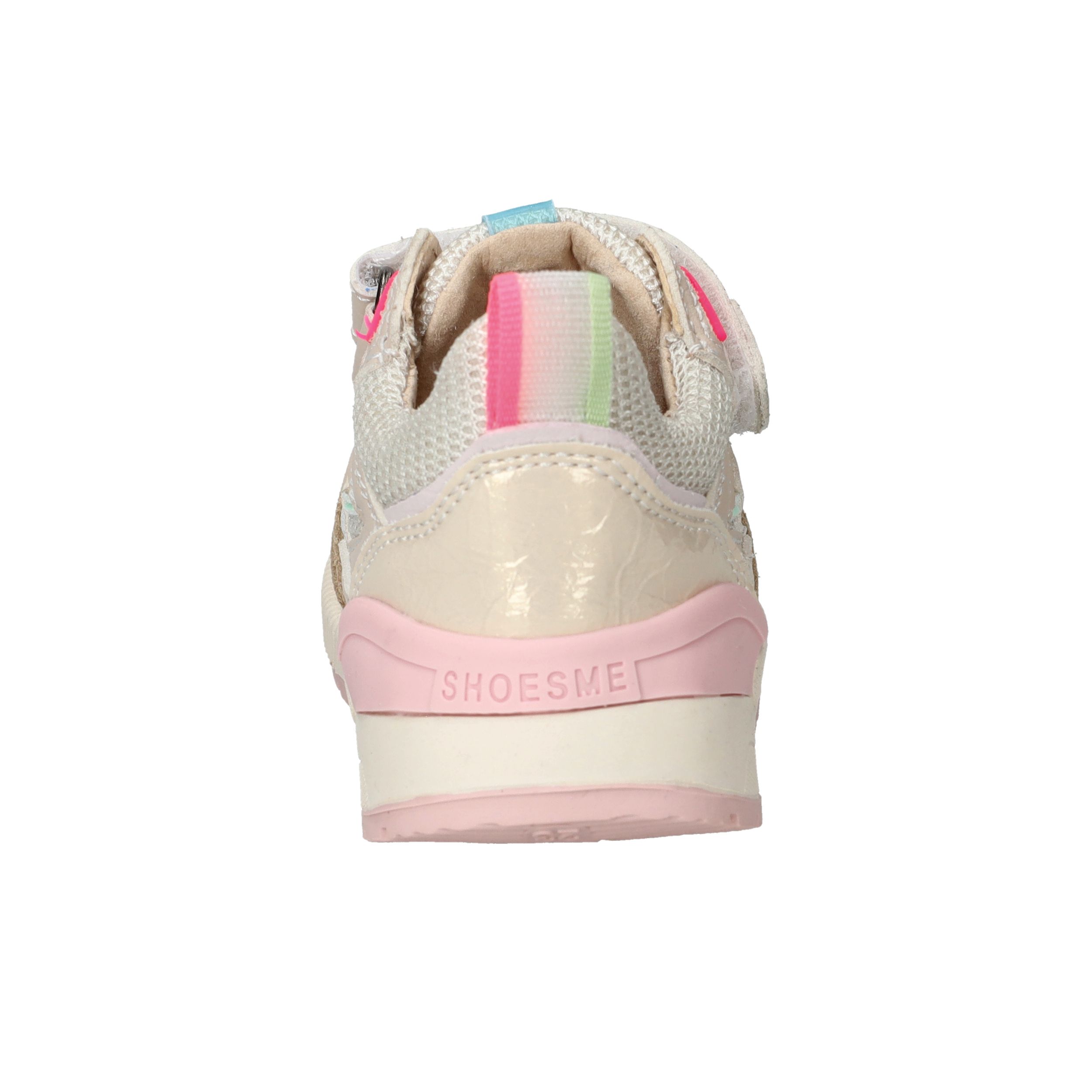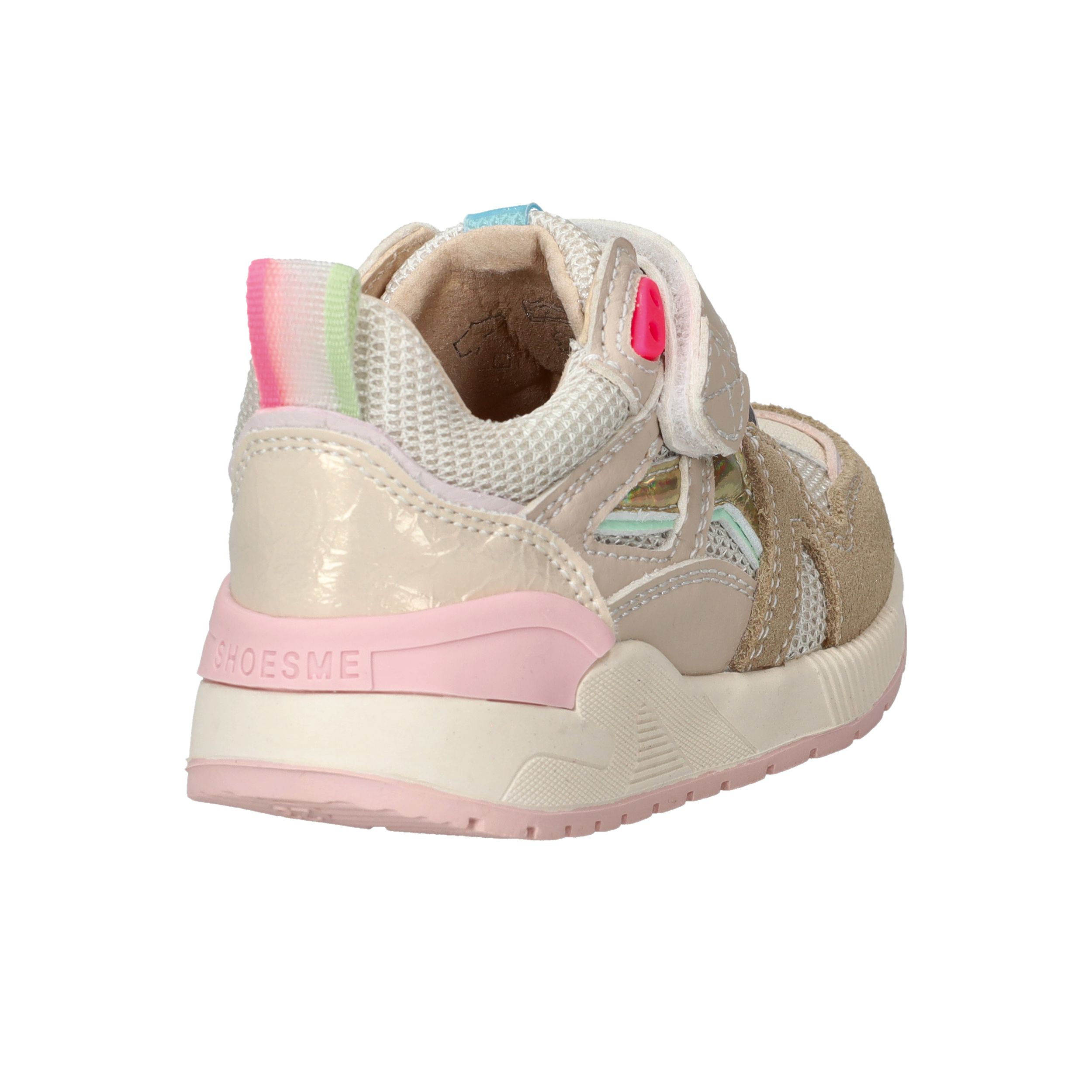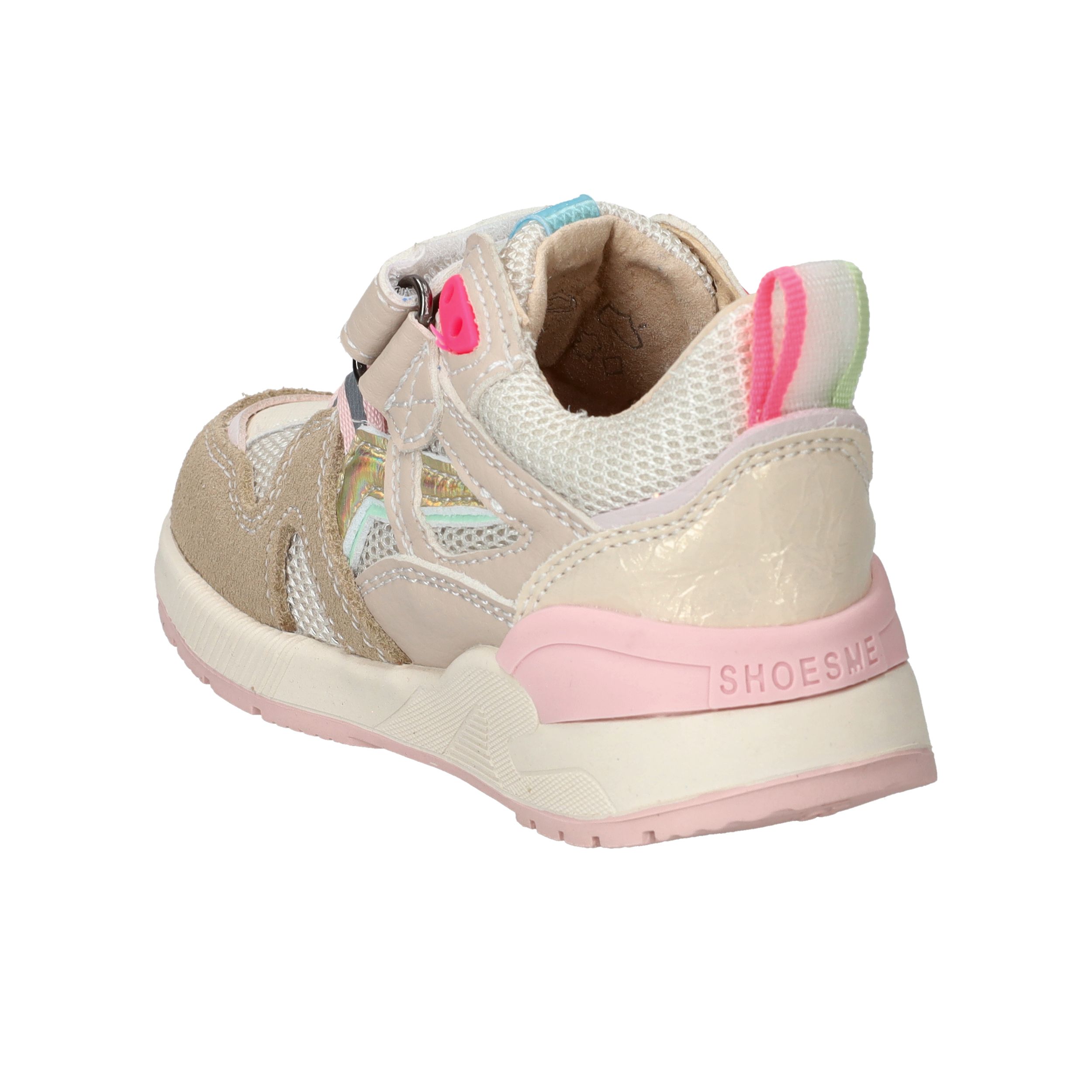 Vrolijke meidensneaker van Shoesme! De beige sneaker heeft veel details zoals roze accenten en gouden glitter. Je kindje kan deze sneaker makkelijk zelf aan doen door de elastische veter en klittenbandsluiting.