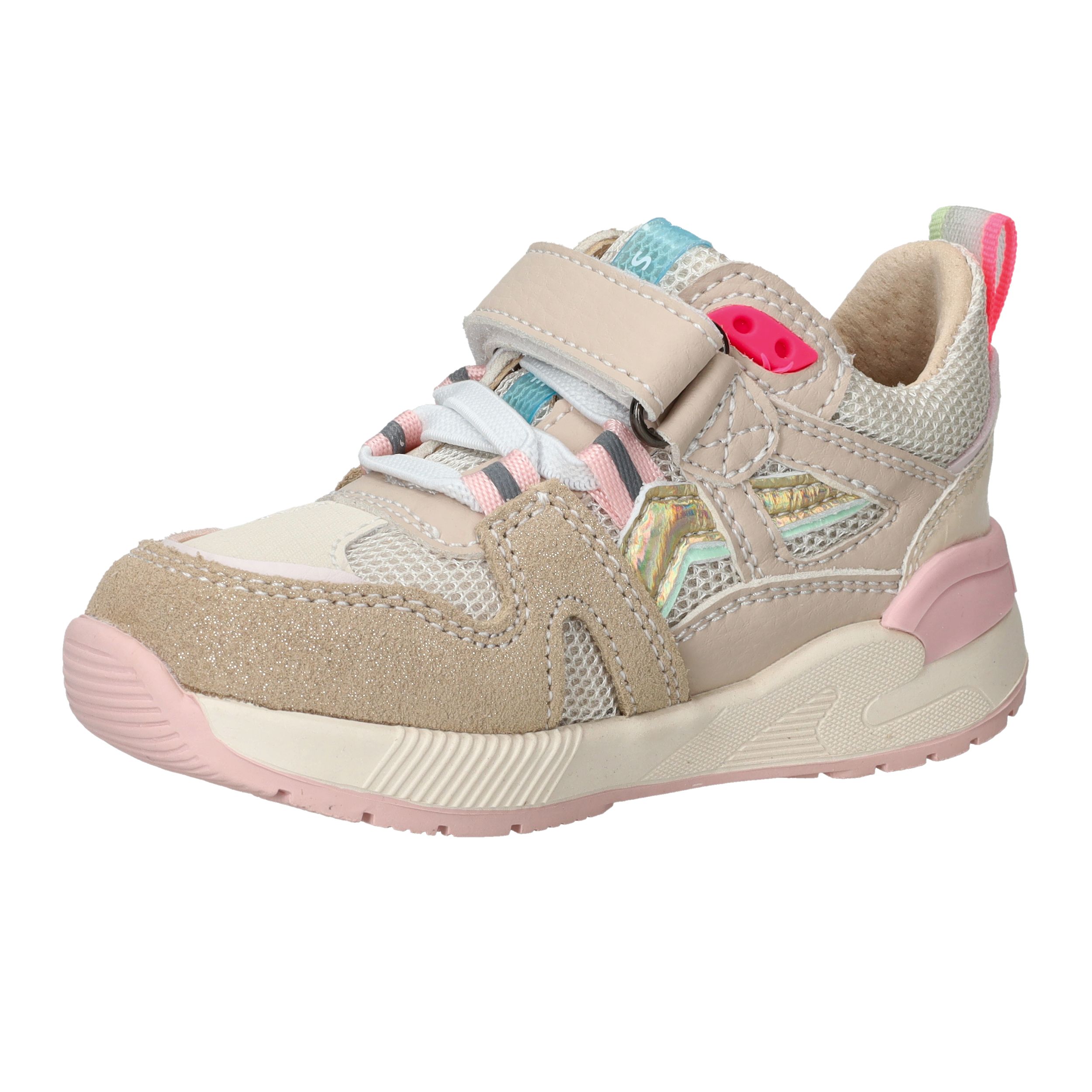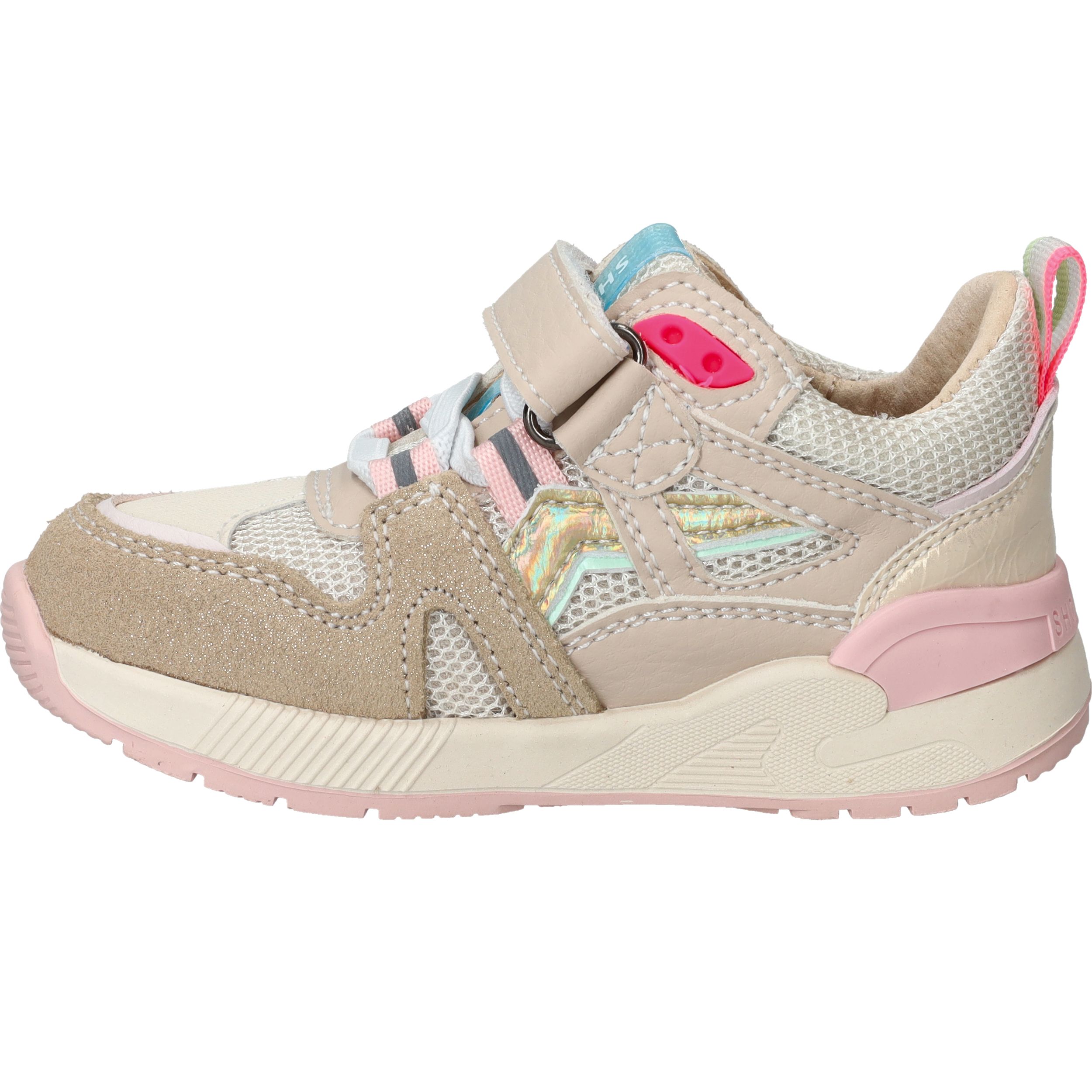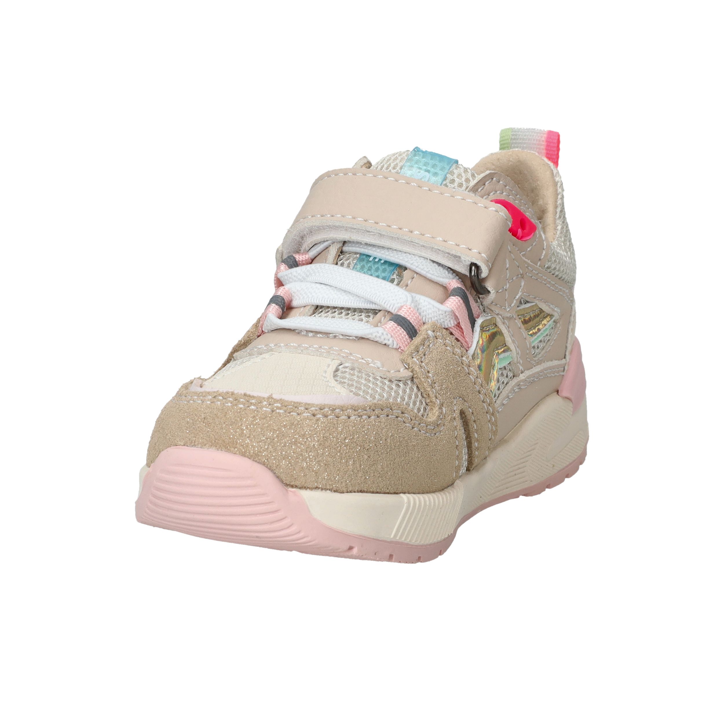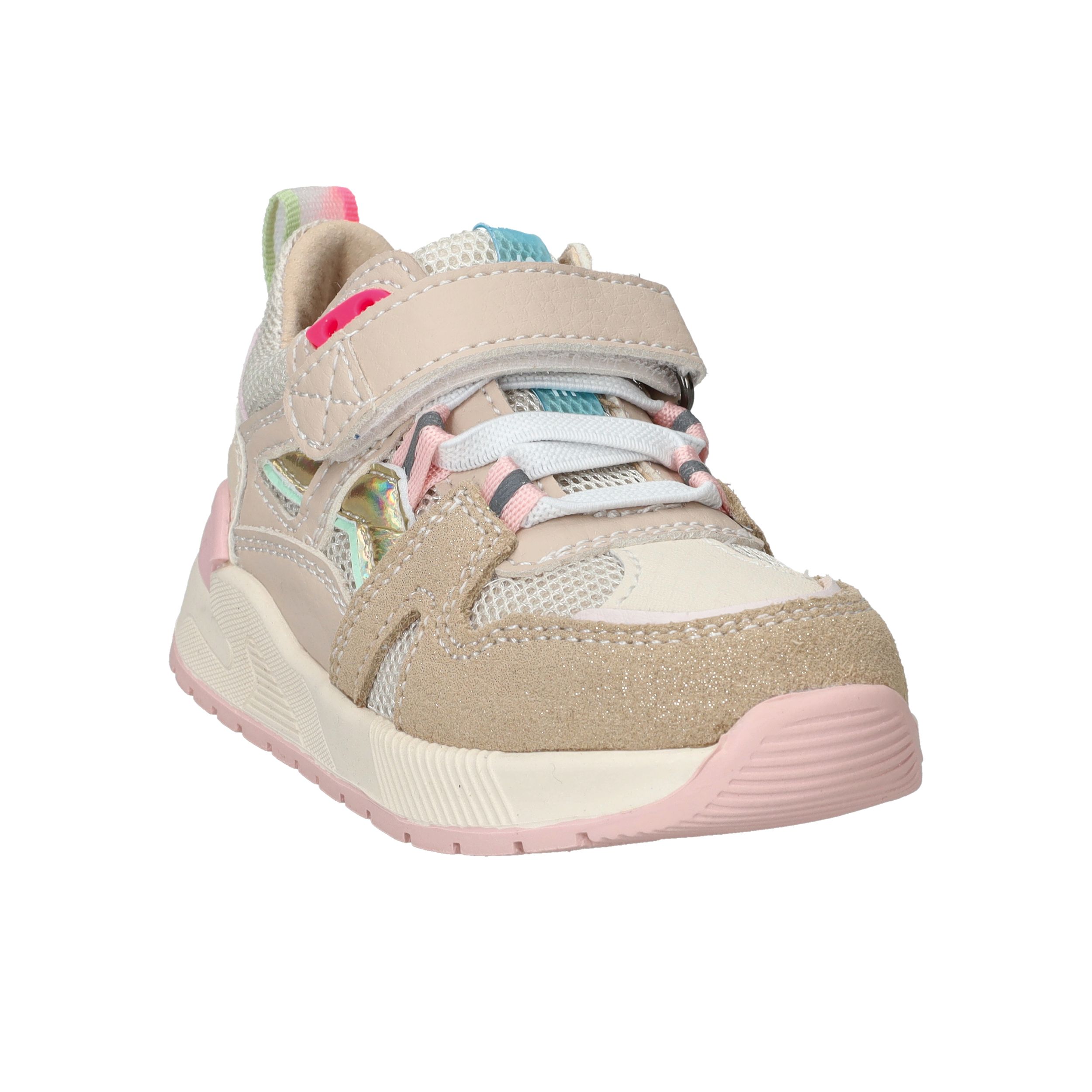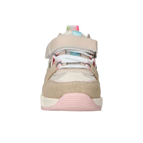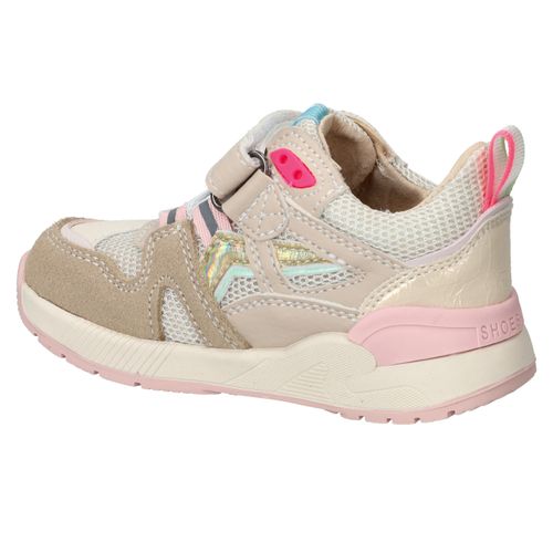 Vrolijke meidensneaker van Shoesme! De beige sneaker heeft veel details zoals roze accenten en gouden glitter. Je kindje kan deze sneaker makkelijk zelf aan doen door de elastische veter en klittenbandsluiting.