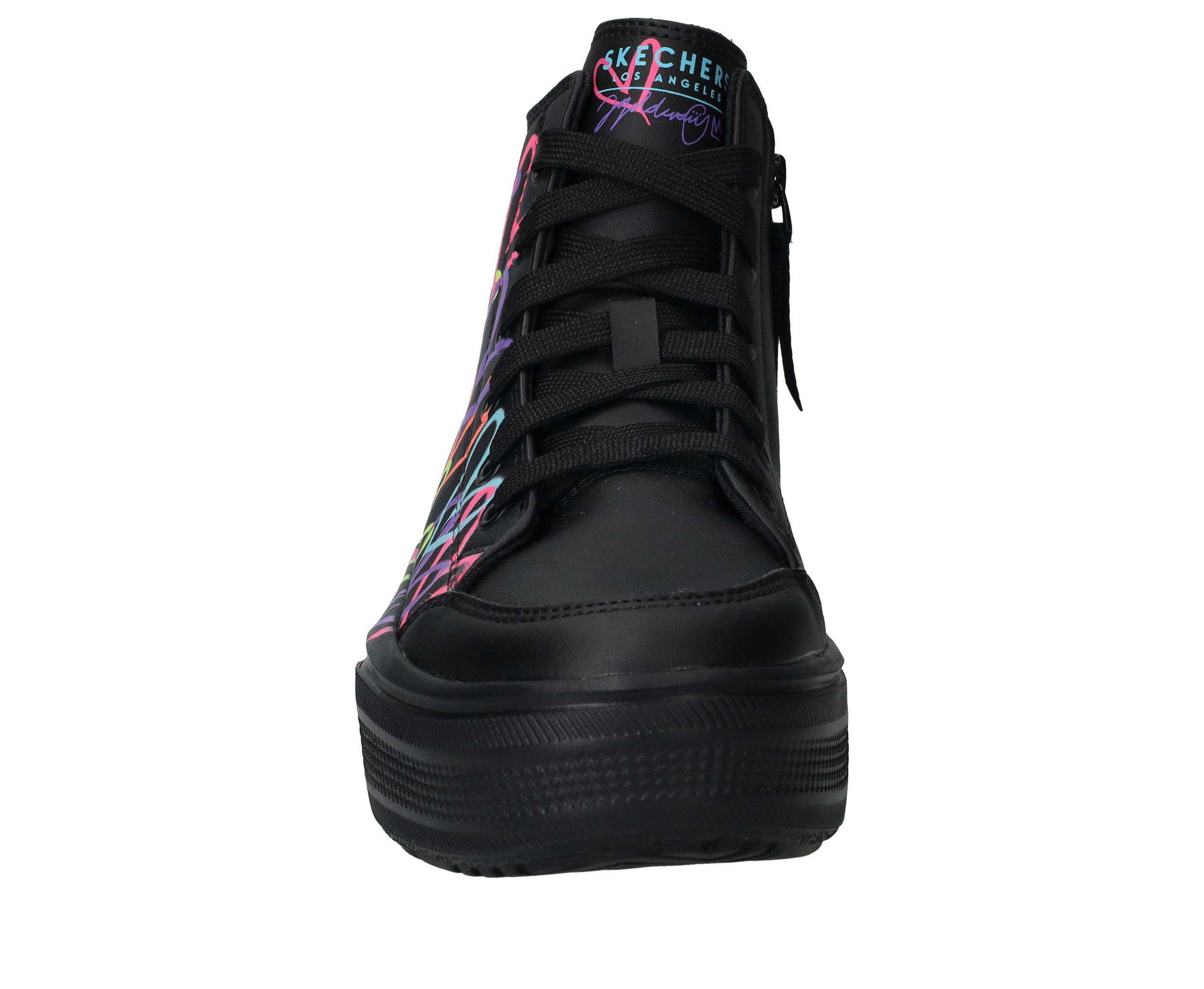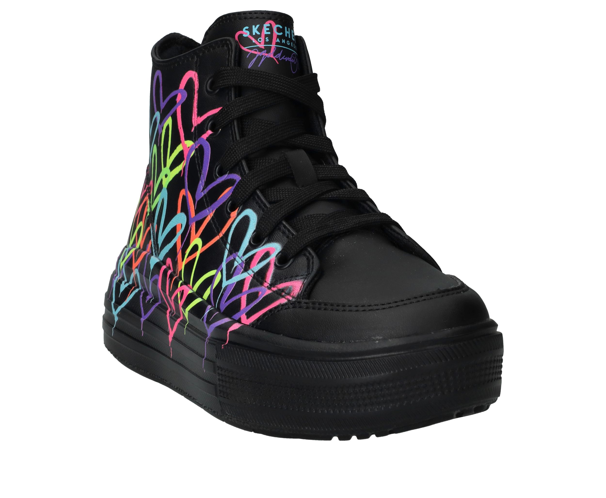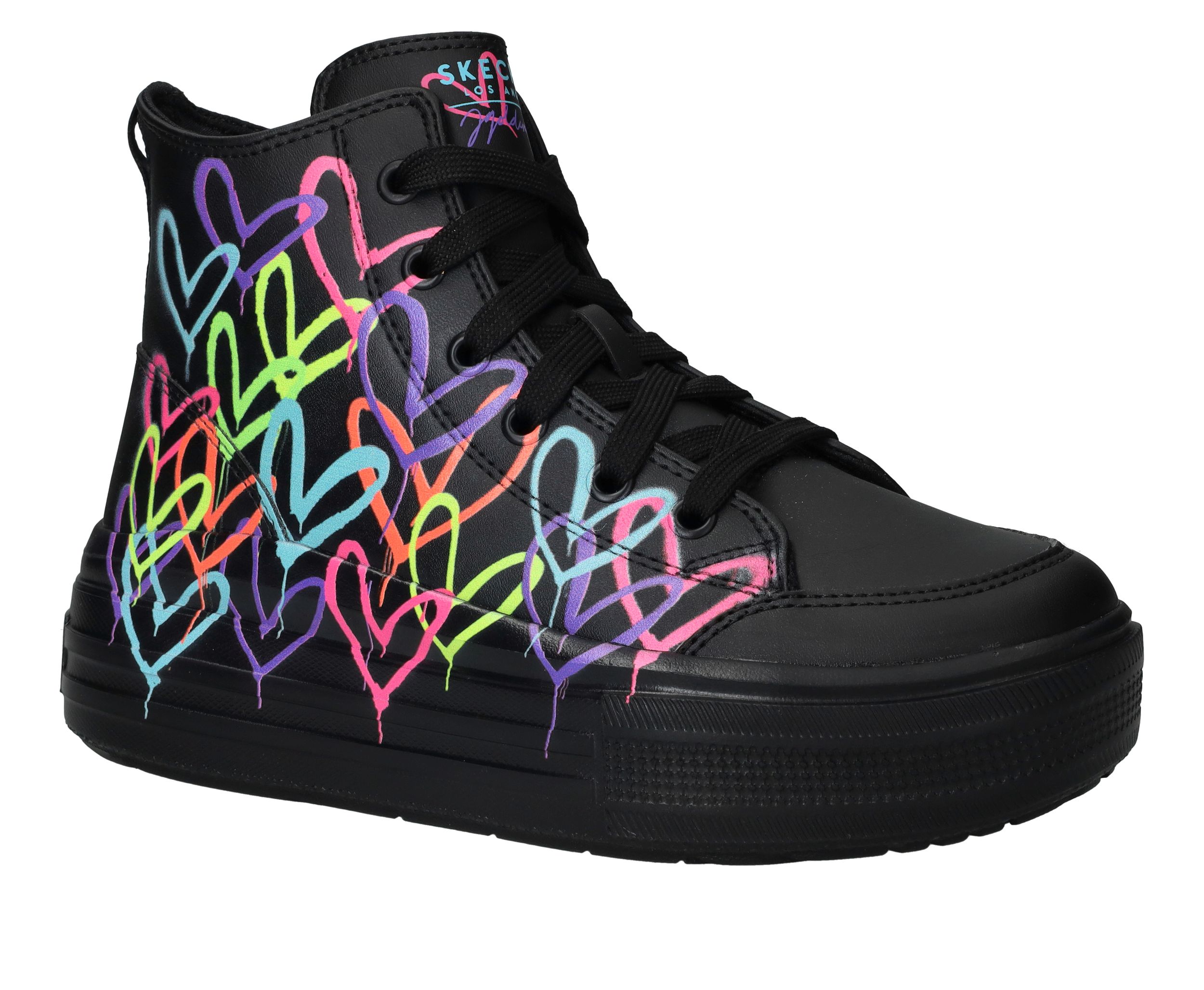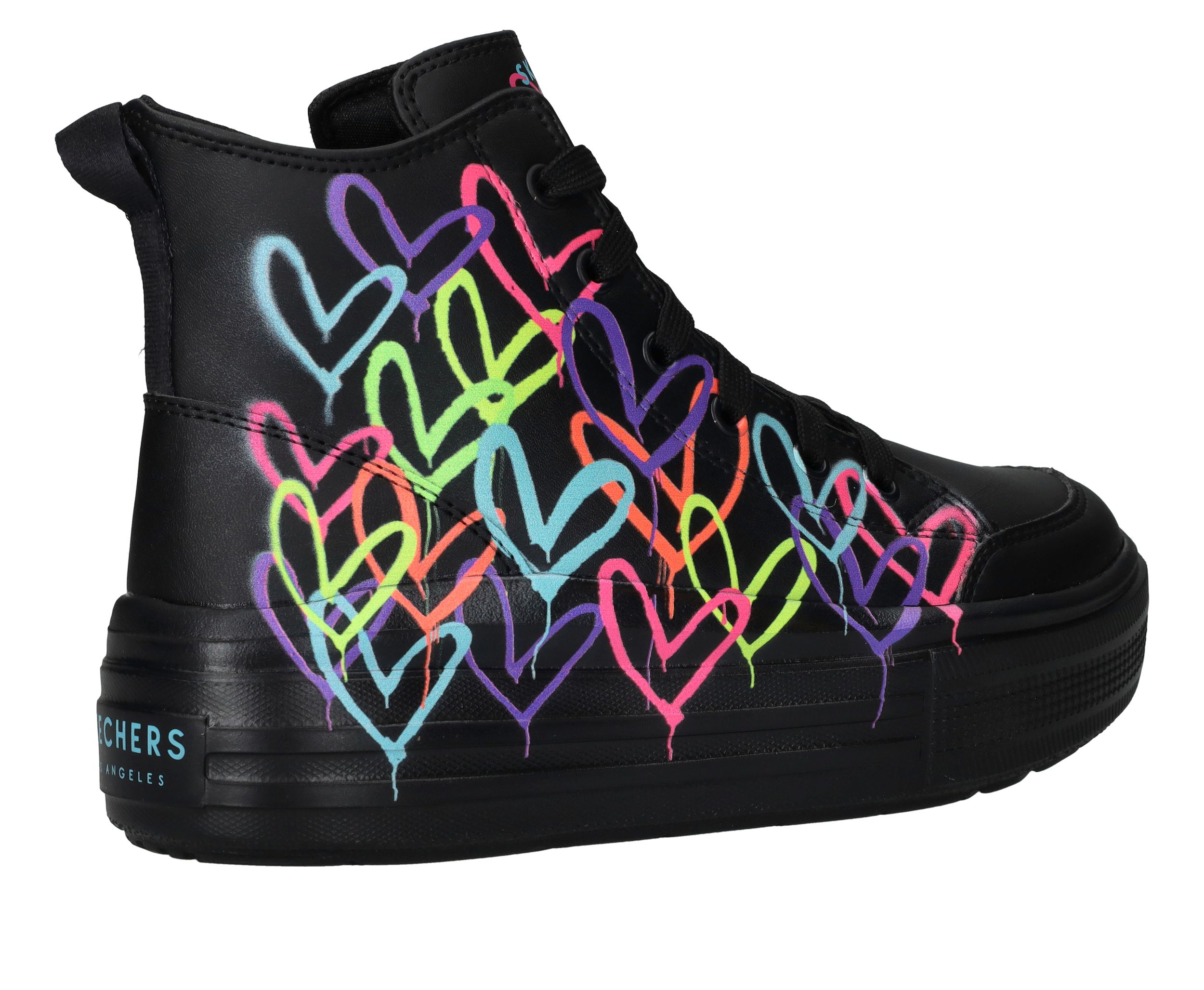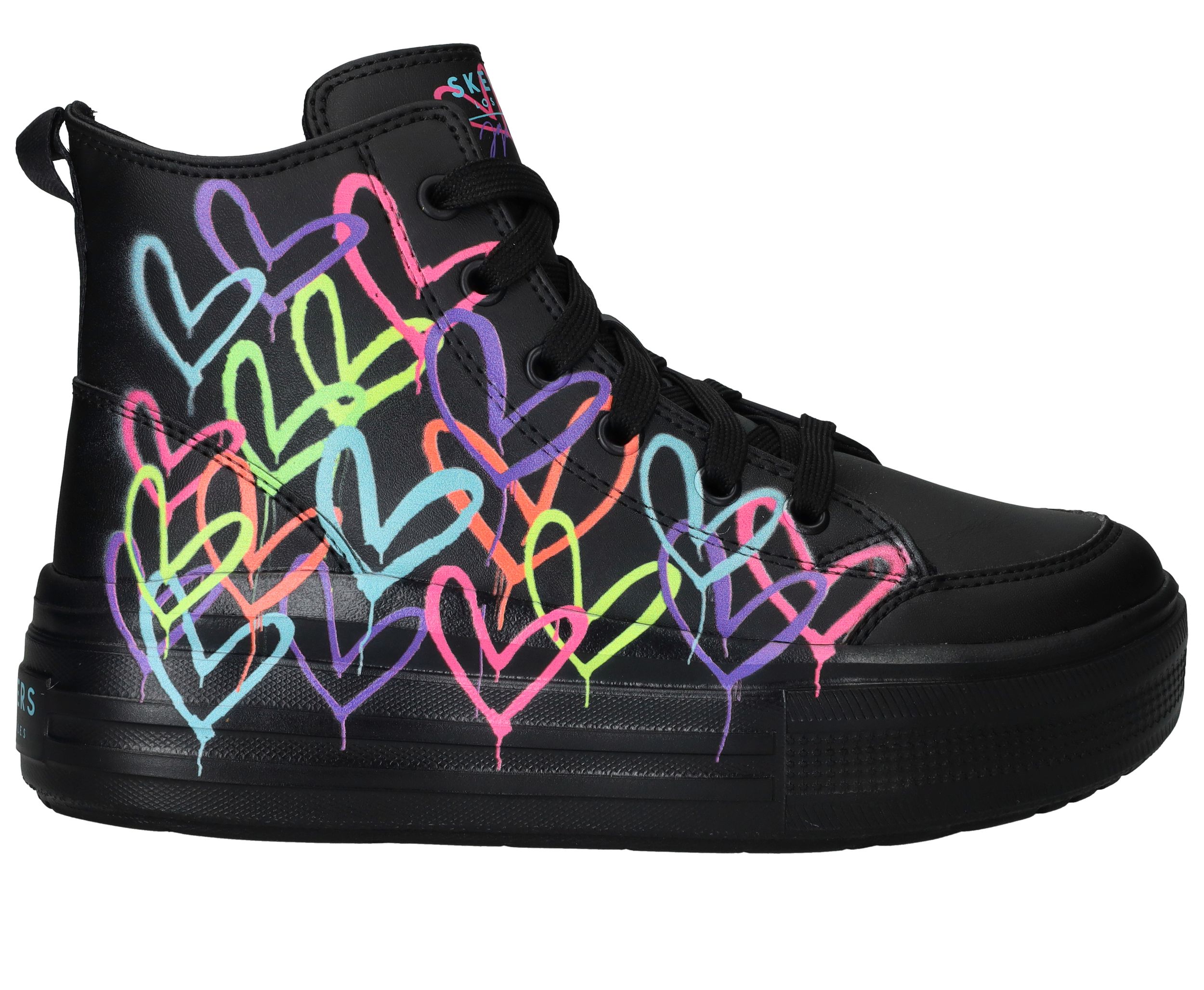 Ga voor deze flitsende zwarte Skechers Hyperlift veterboots met gave hartjes print van James Coldcrown! Extra stoer is de platformzool.