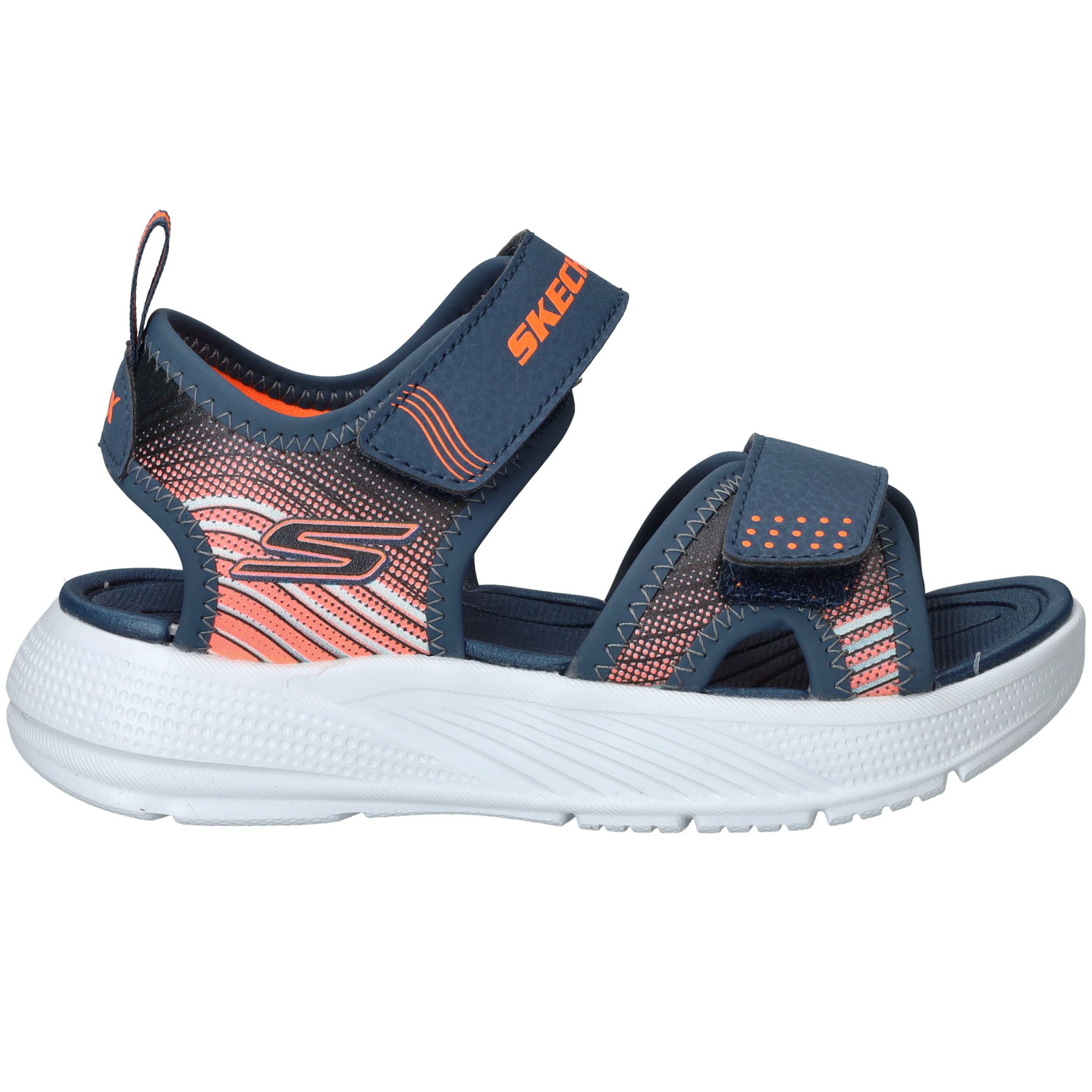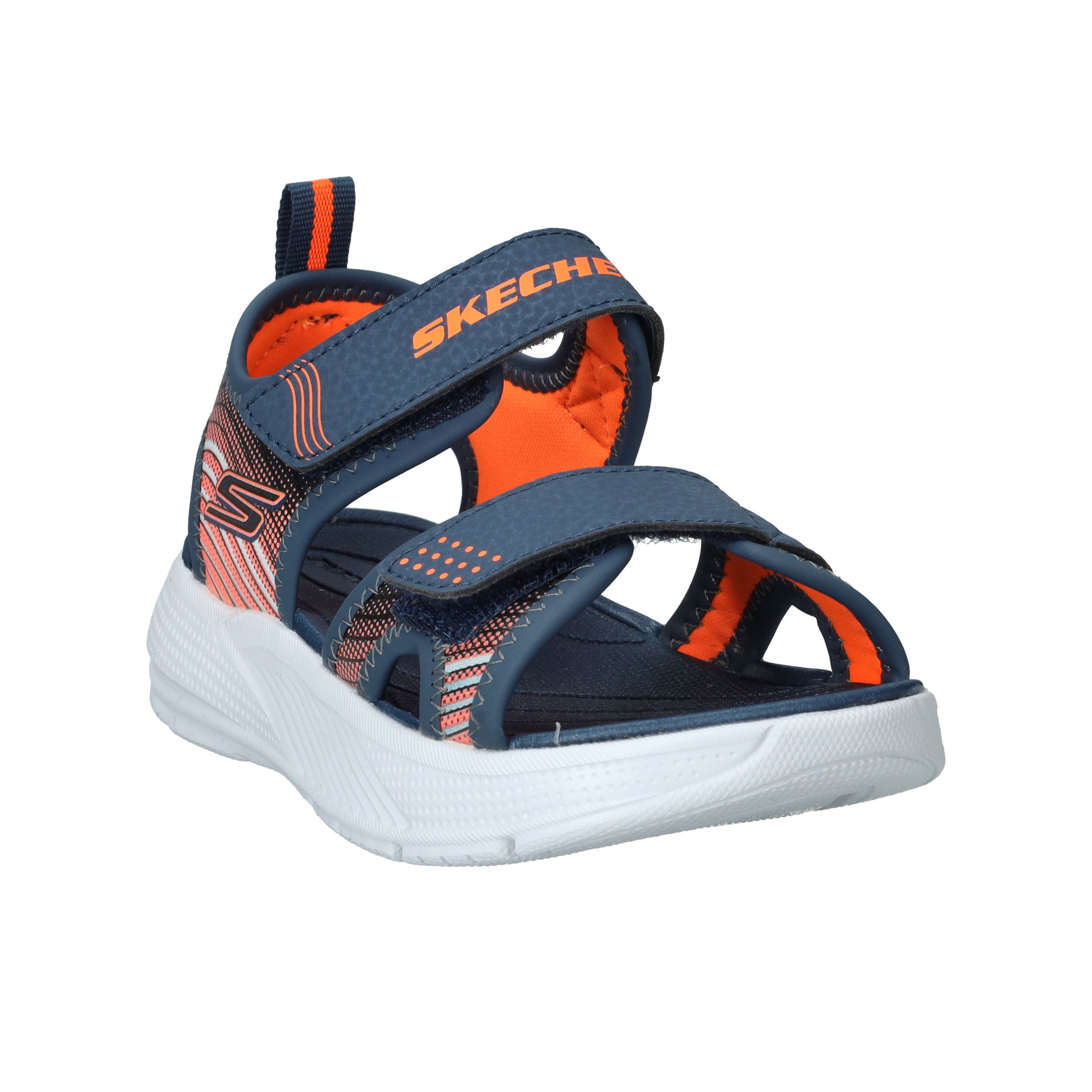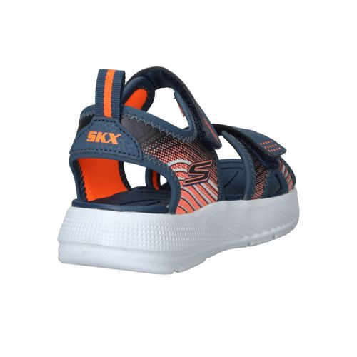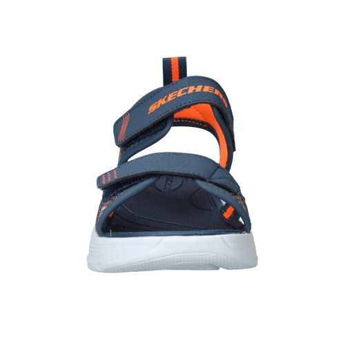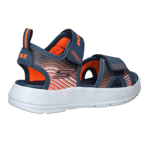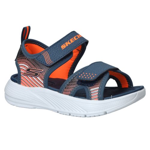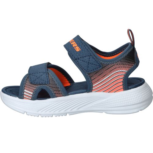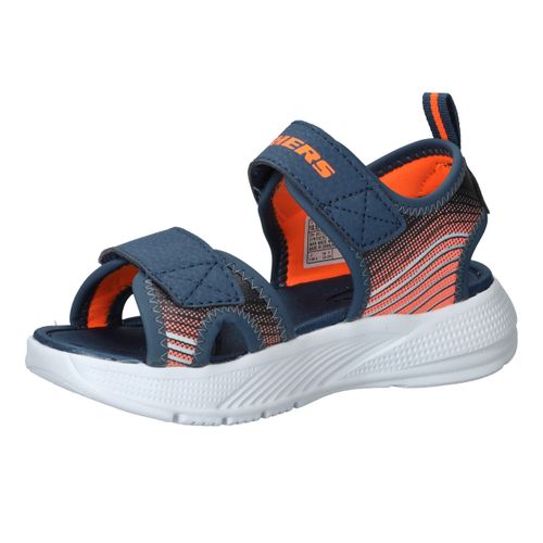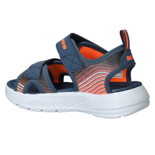 Skechers Microspec Splash sandaal voor jongens! De sandaal heeft een sportieve uitstraling en een mooie donkerblauwe en orjanje kleur