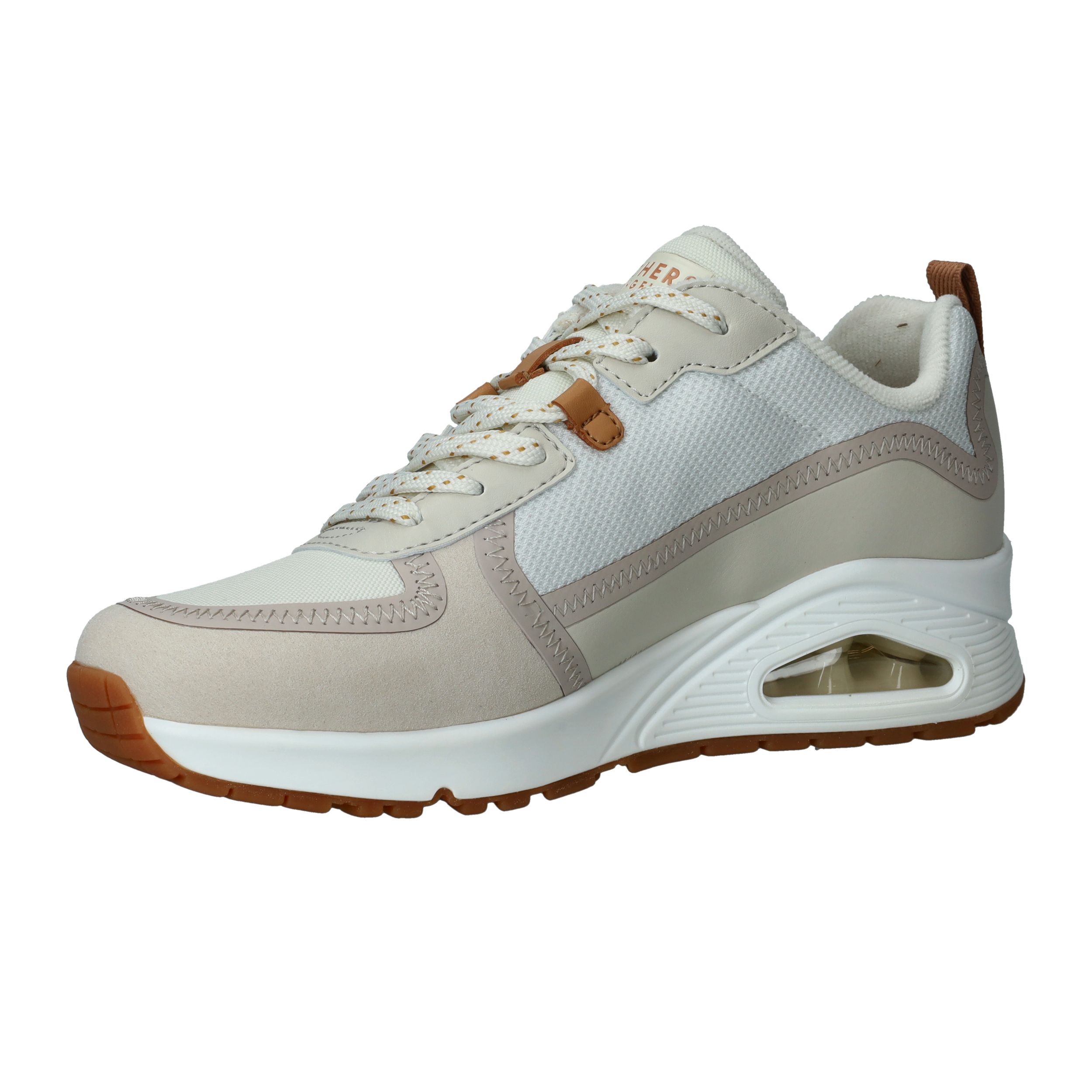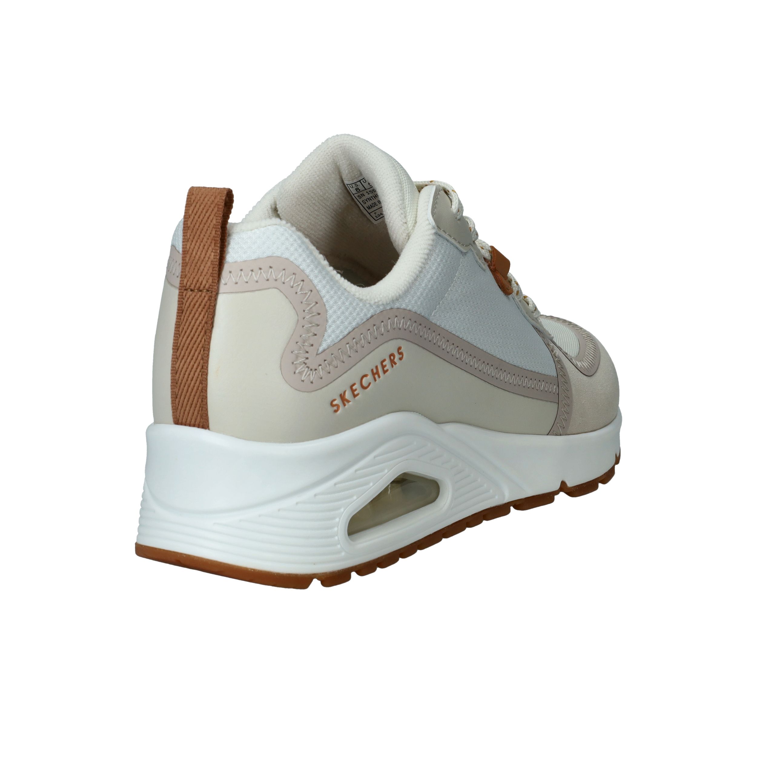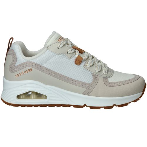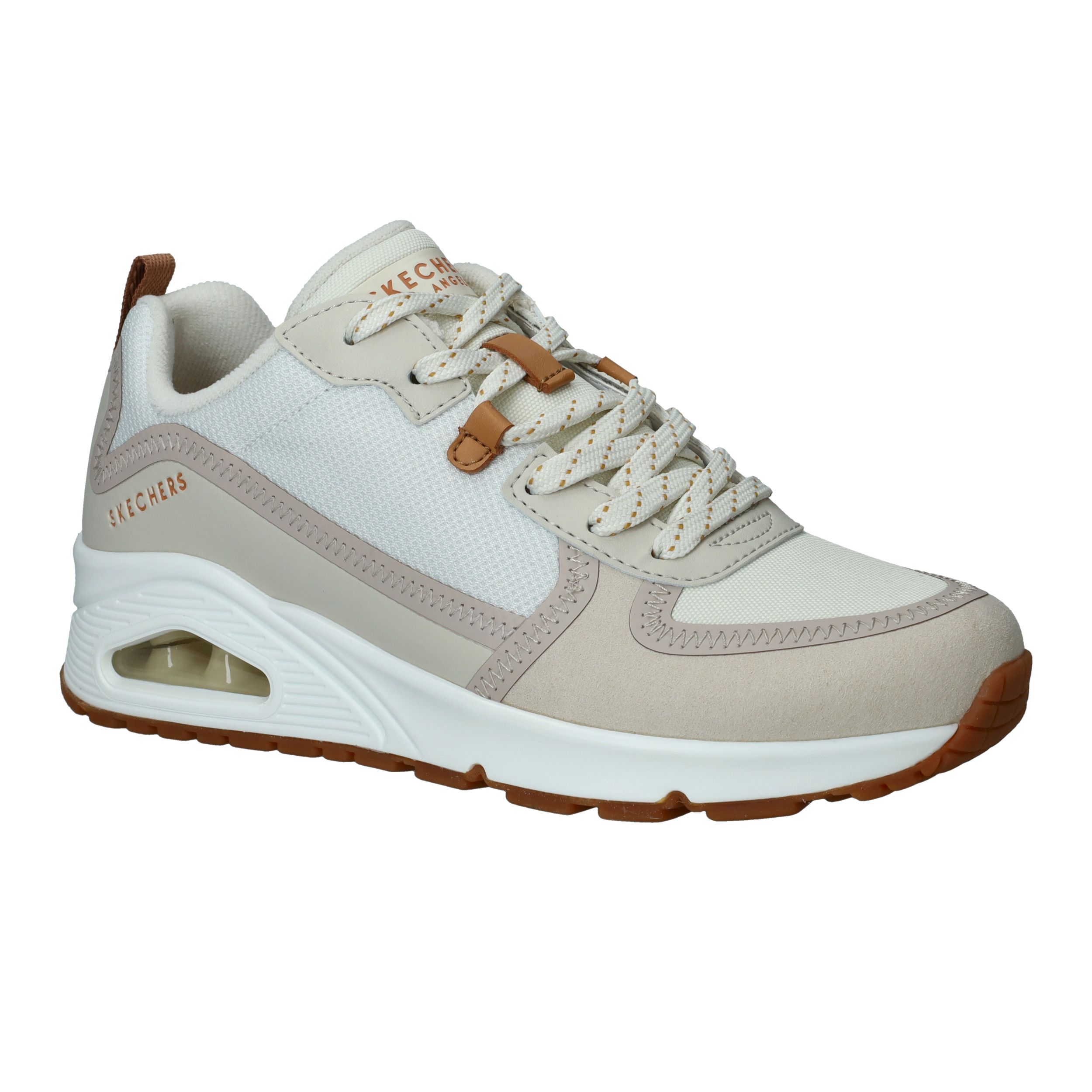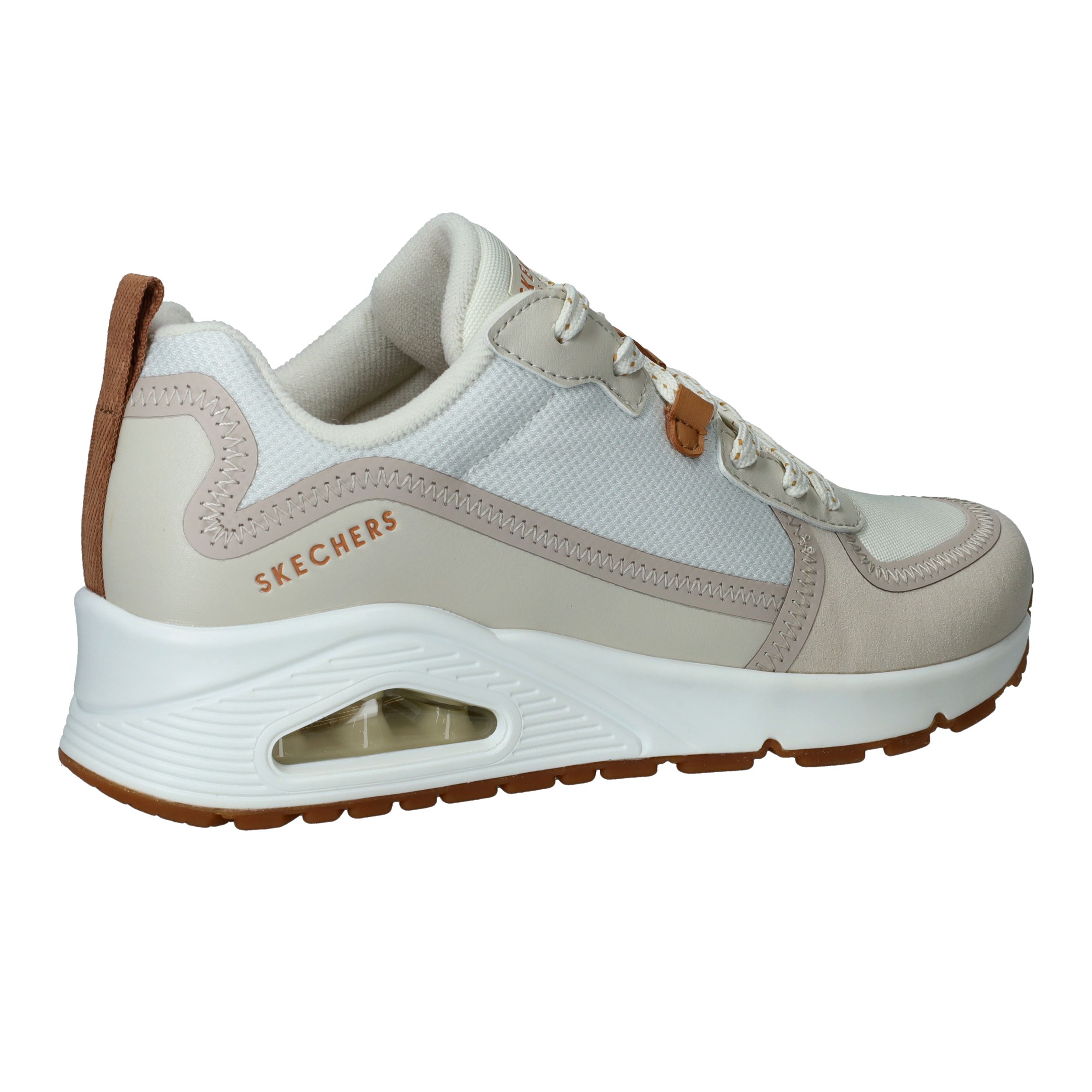 Ga voor deze sportieve Skechers Uno Layover sneaker voor dames! De sneaker heeft een warme beige kleur en cognac accenten.