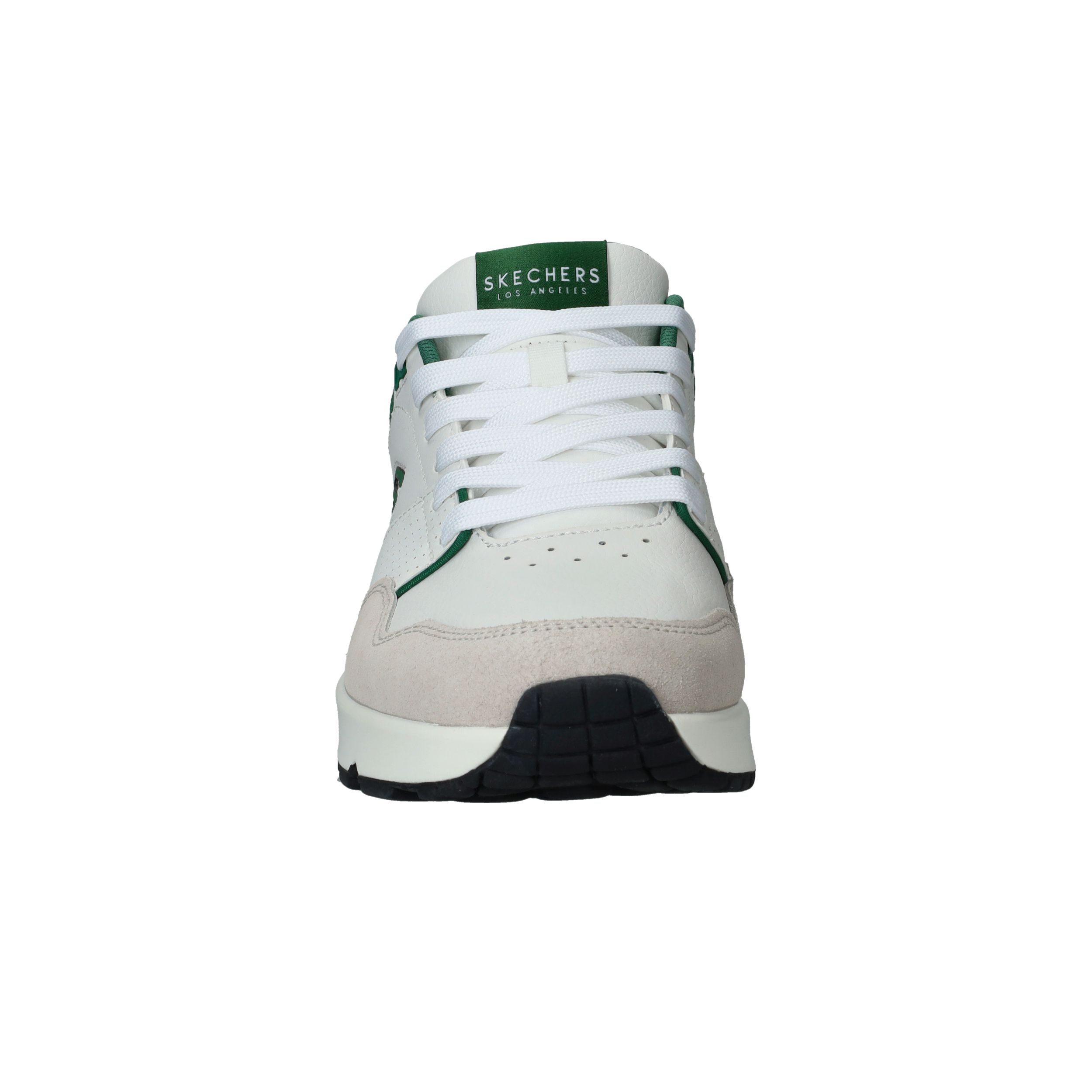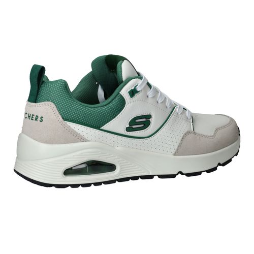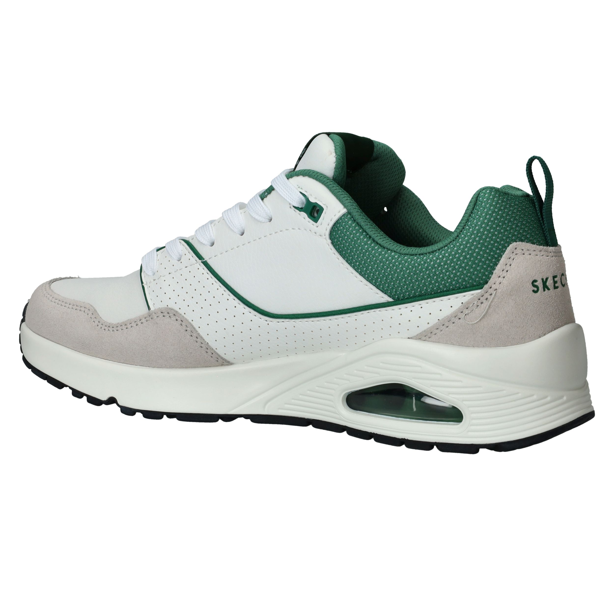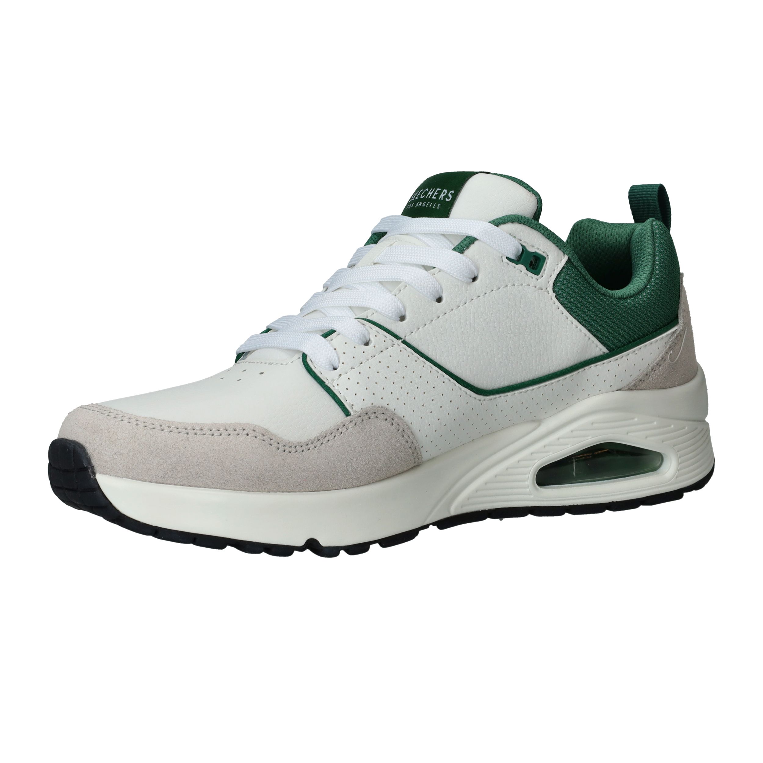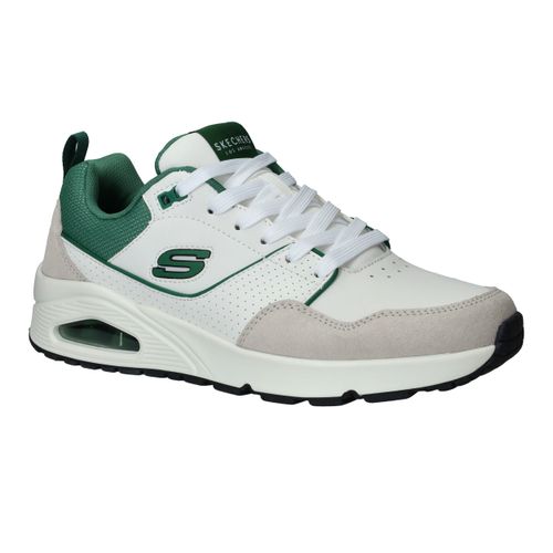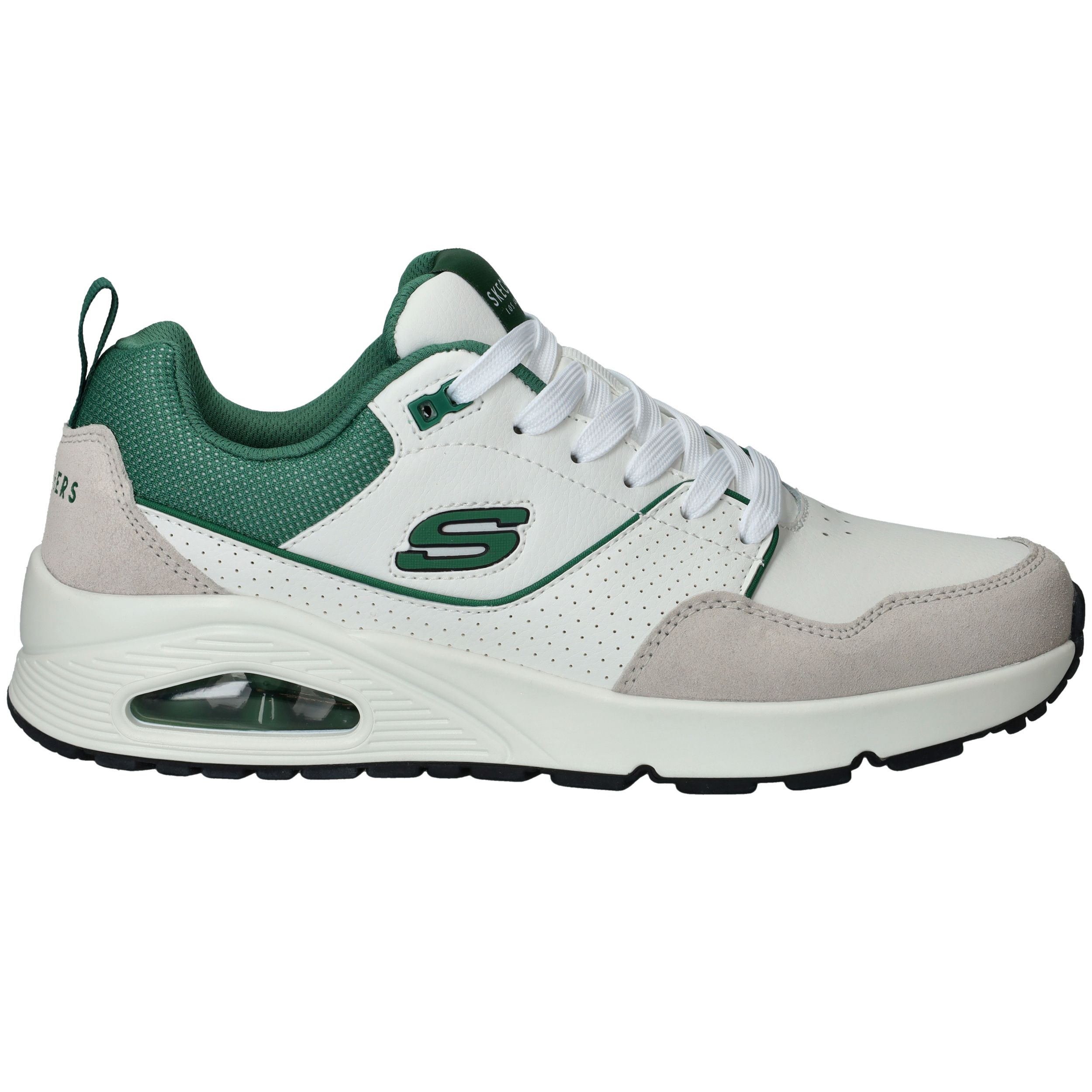 Deze sportieve Skechers Uno Retro One sneaker in het wit is gemaakt van een combinatie van leer en synthetisch materiaal. De sneaker heeft toffe groene details.