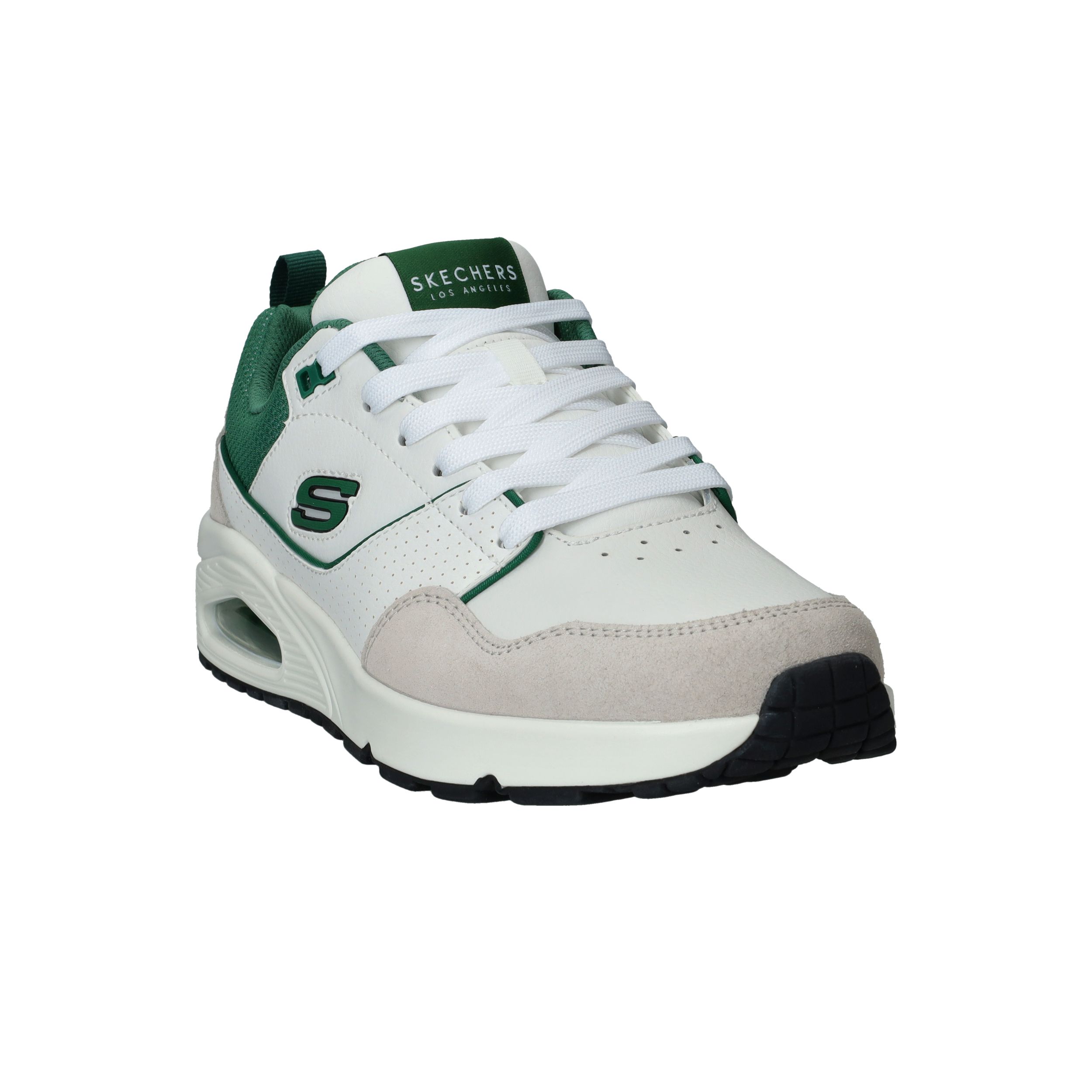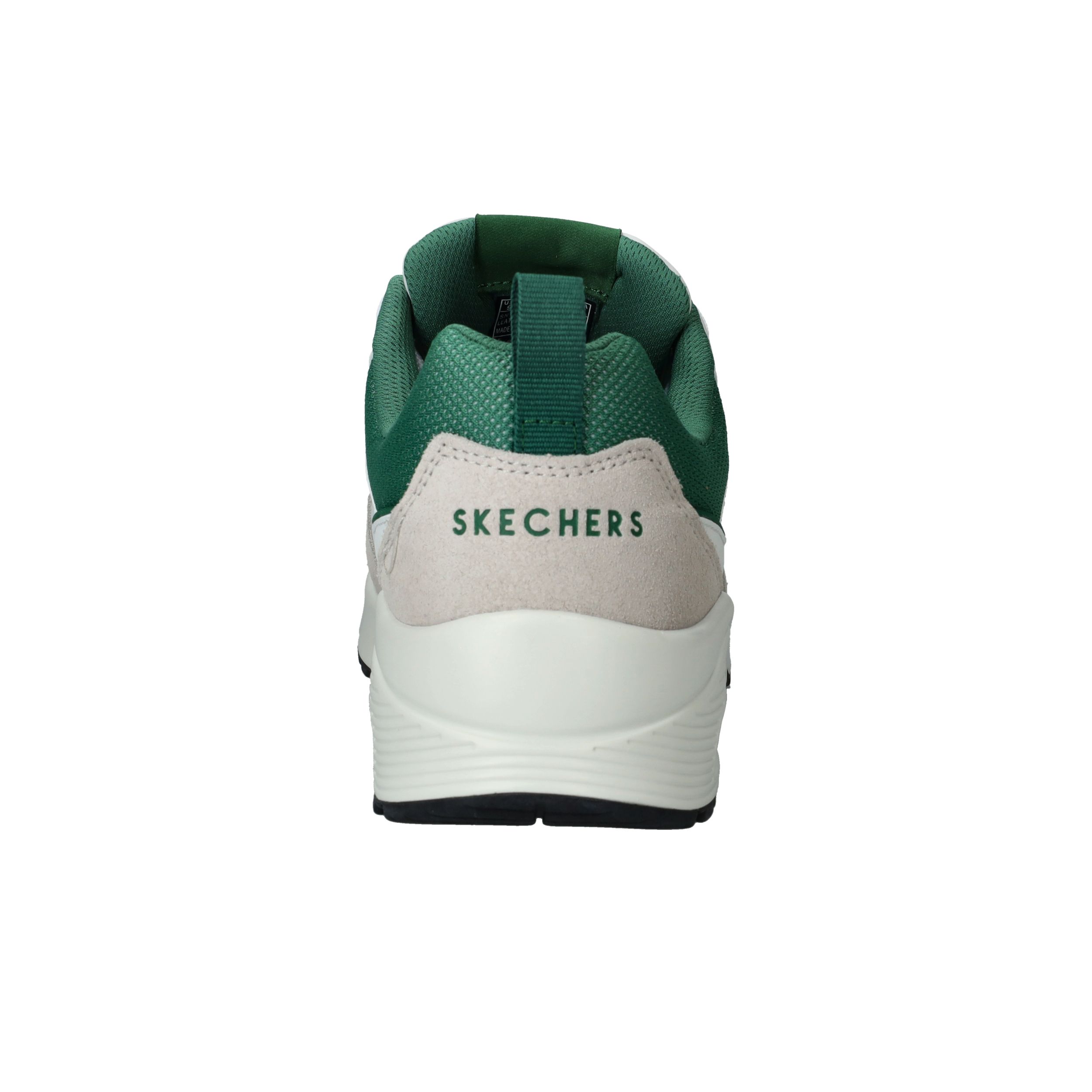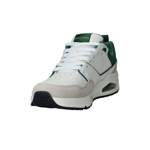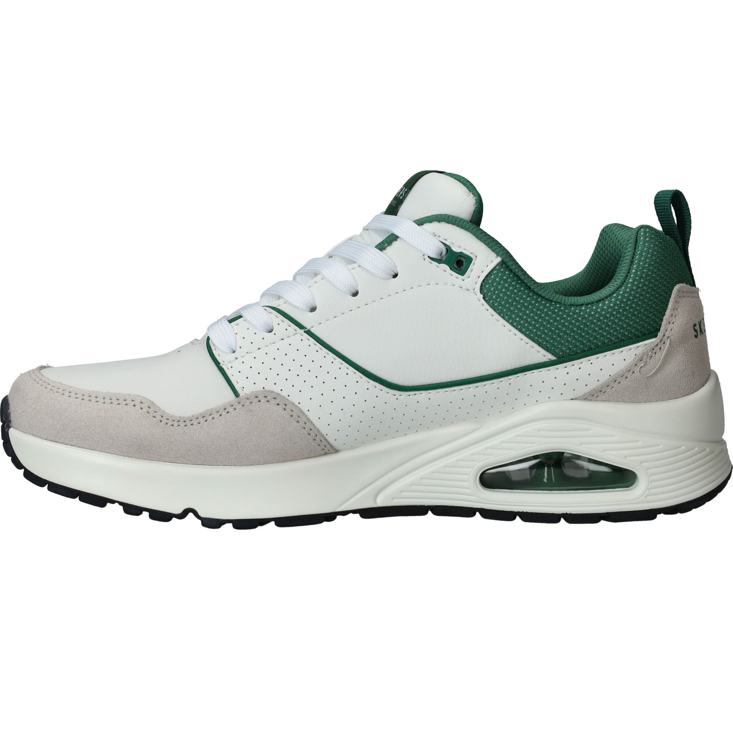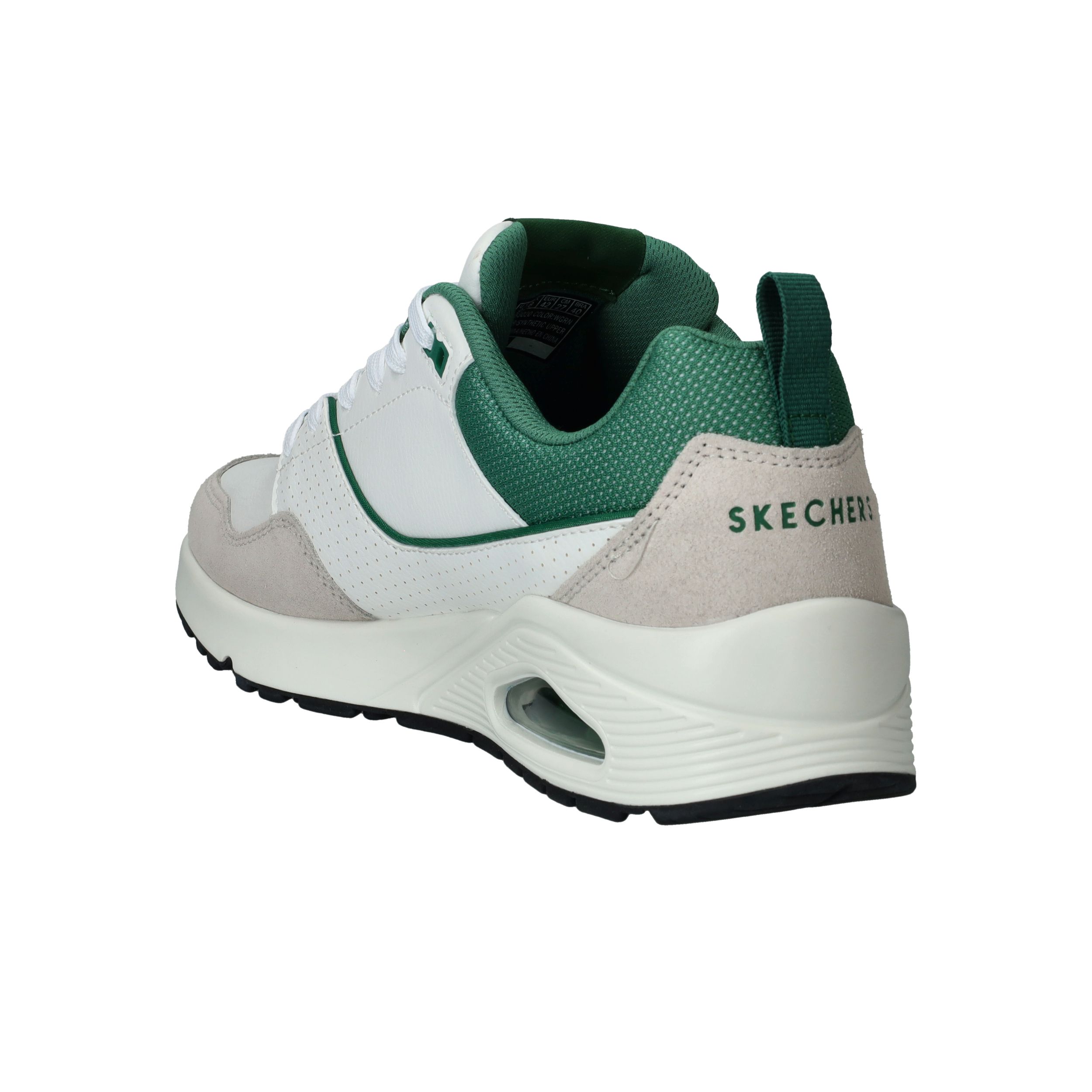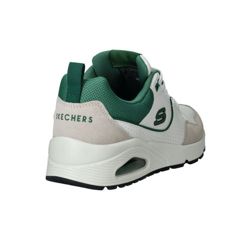 Deze sportieve Skechers Uno Retro One sneaker in het wit is gemaakt van een combinatie van leer en synthetisch materiaal. De sneaker heeft toffe groene details.