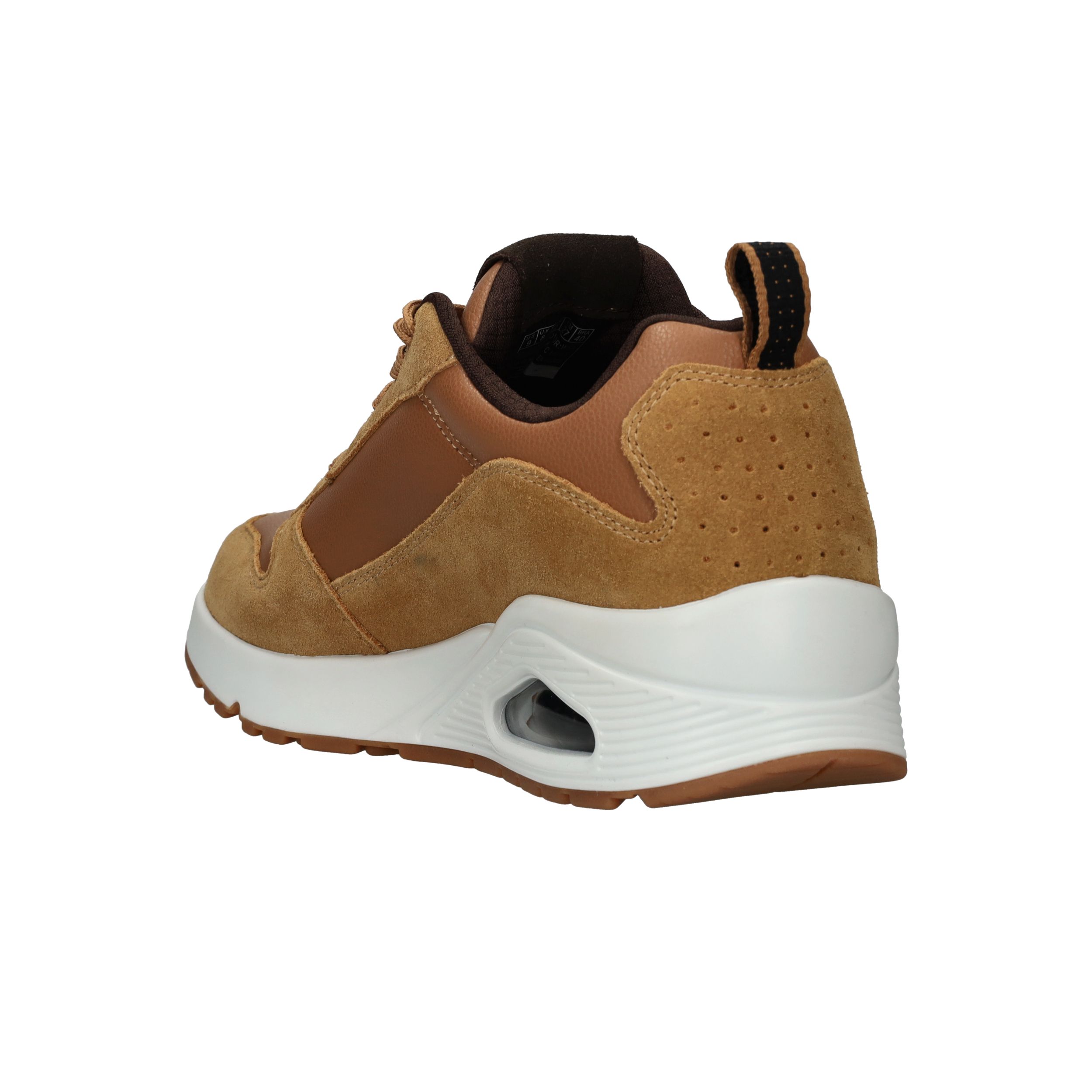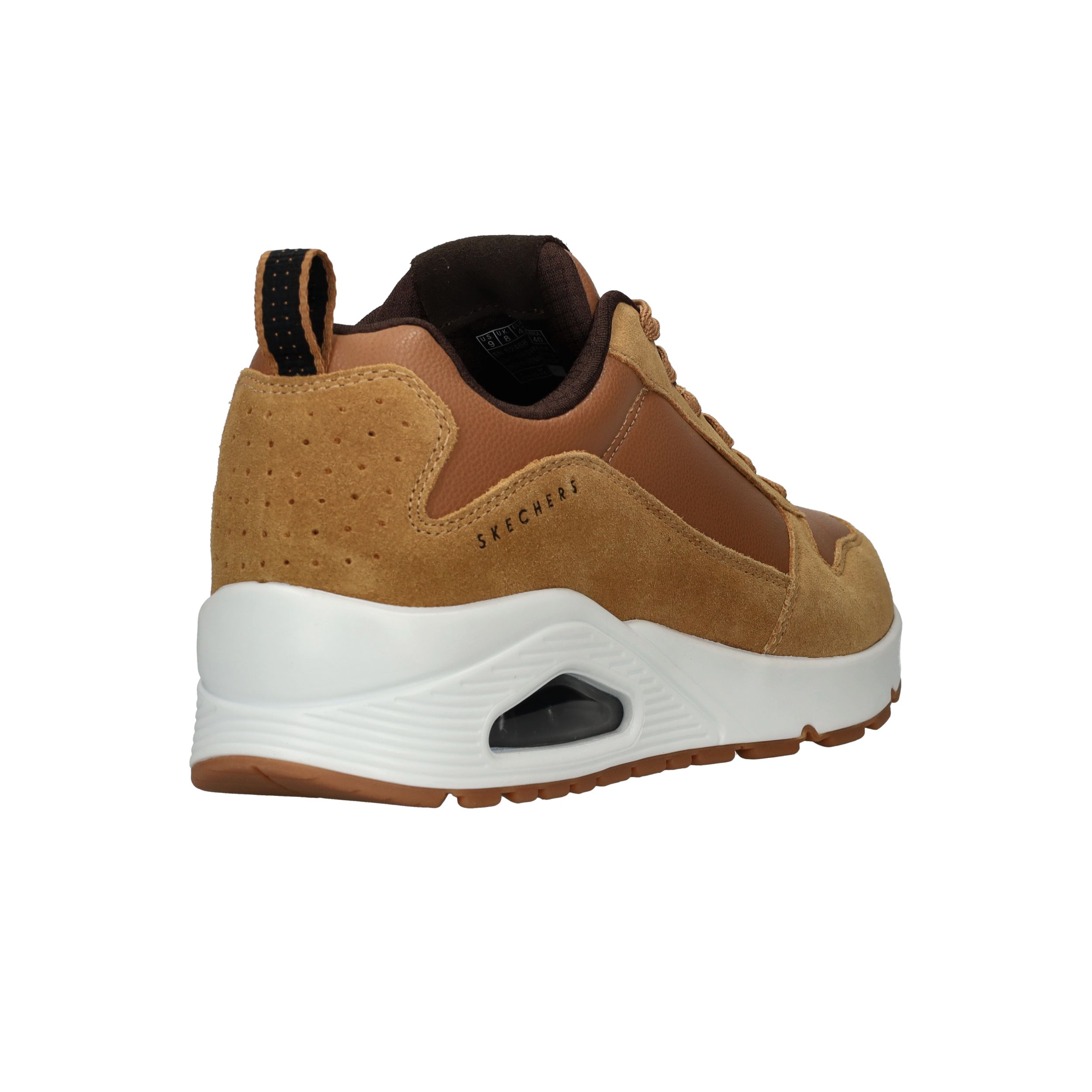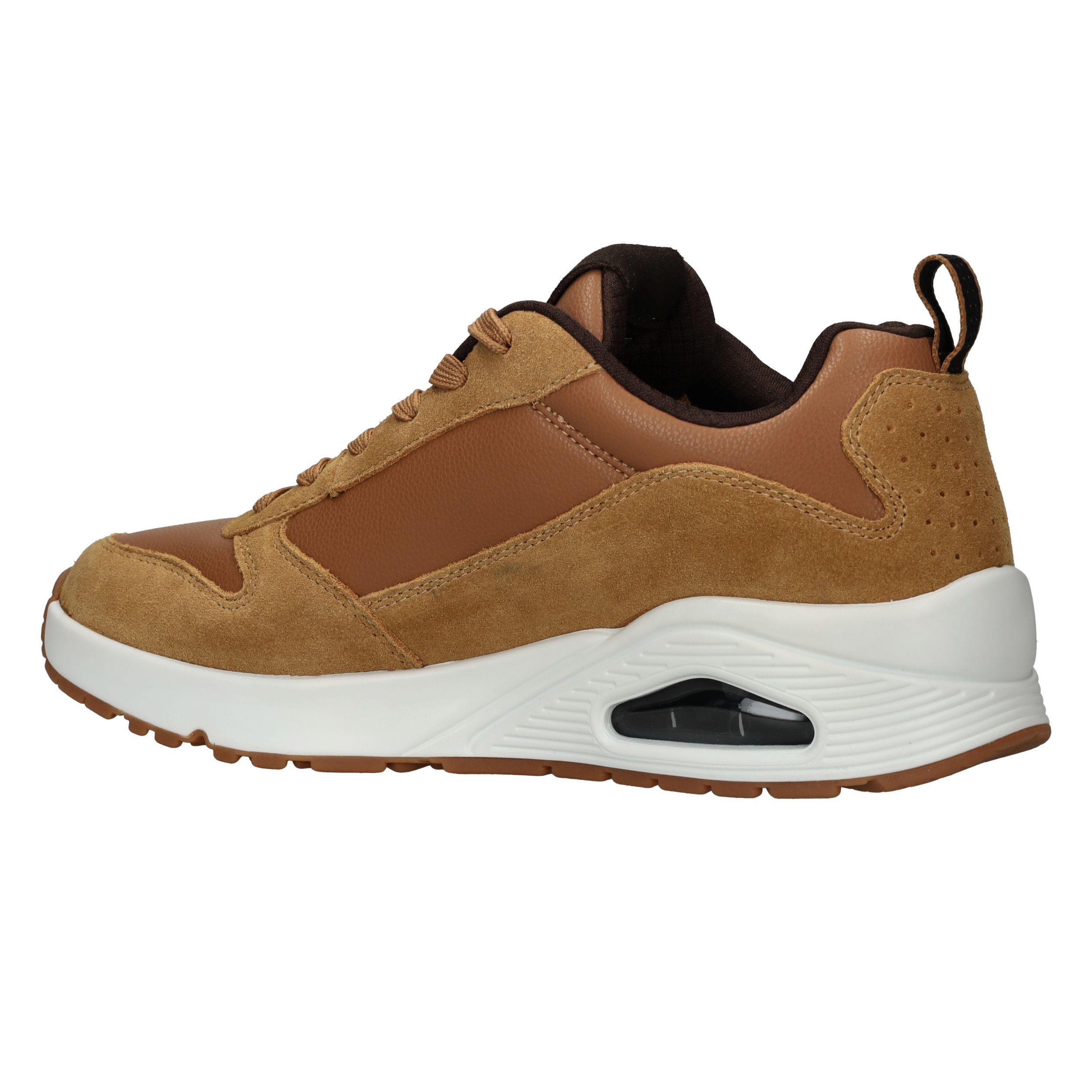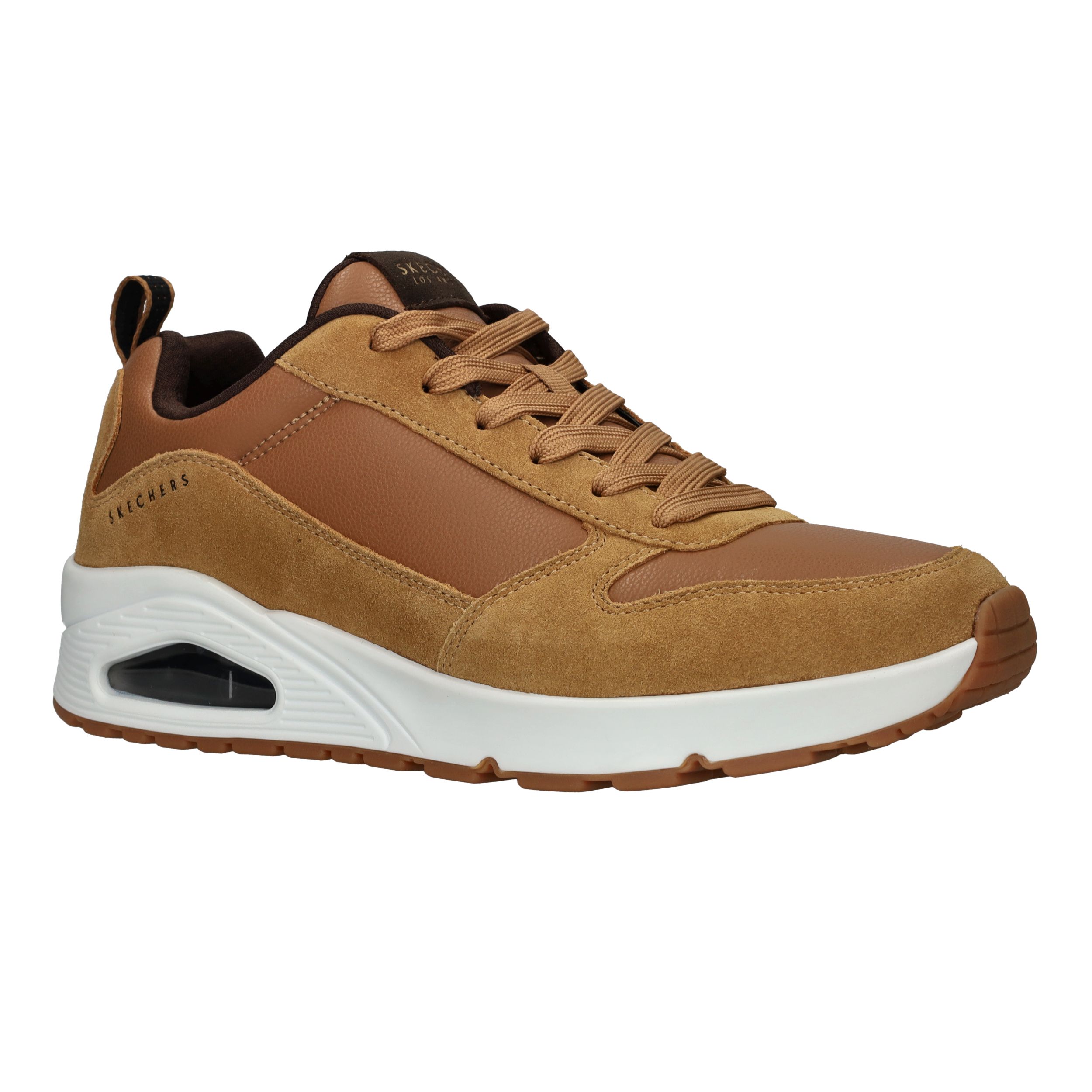 Draag deze Skechers Uno Stacre sneaker het hele jaar door! De herensneaker heeft een lichte cognac kleur en is gedeeltelijk gemaakt van leer.