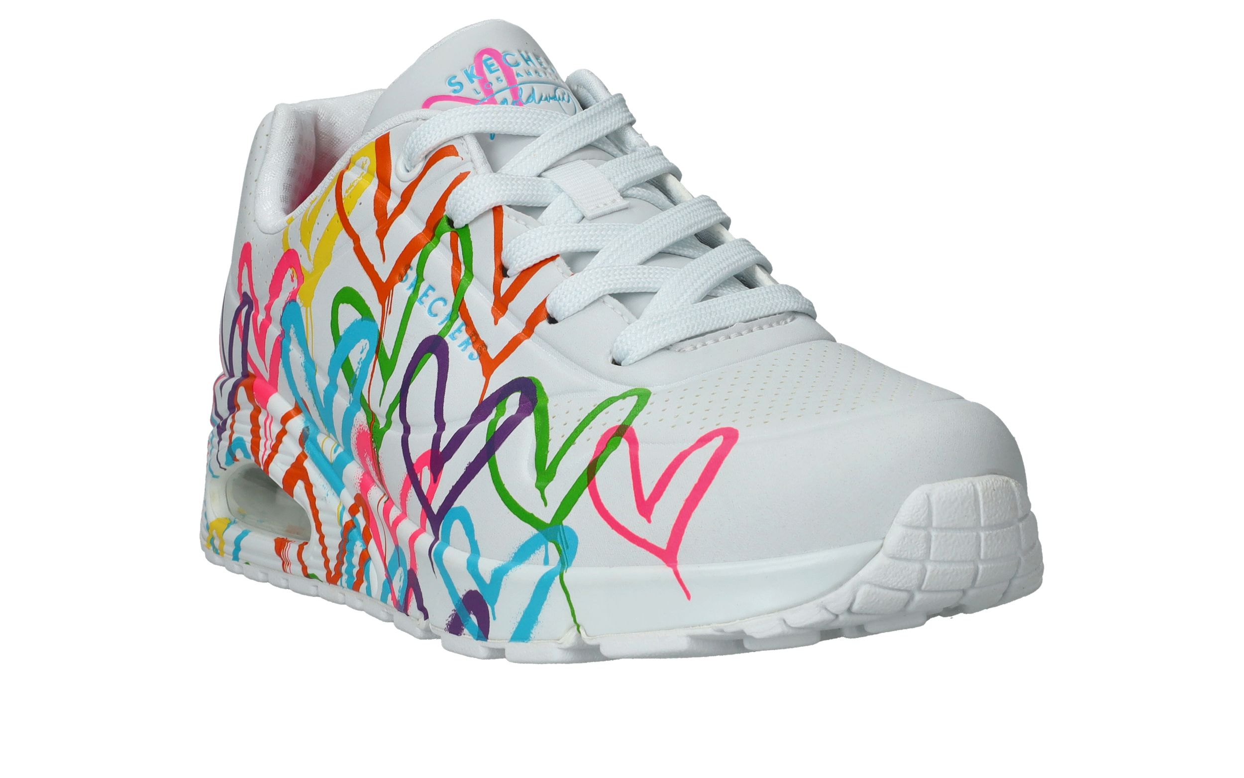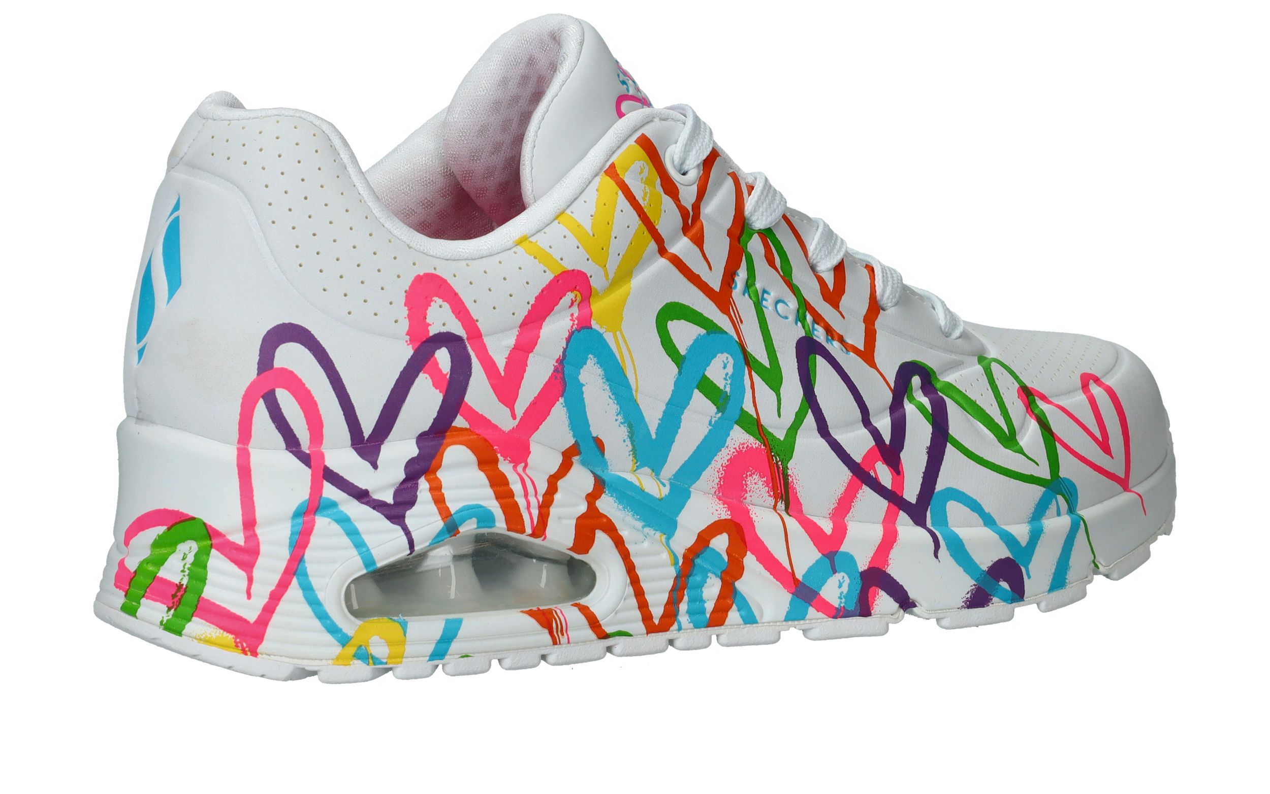 Deze Skechers X JGoldcrown Uno Highlight Love sneaker is echt een pareltje! De iconische Lovewall heart print van James Goldcrown maakt de sneaker helemaal af.