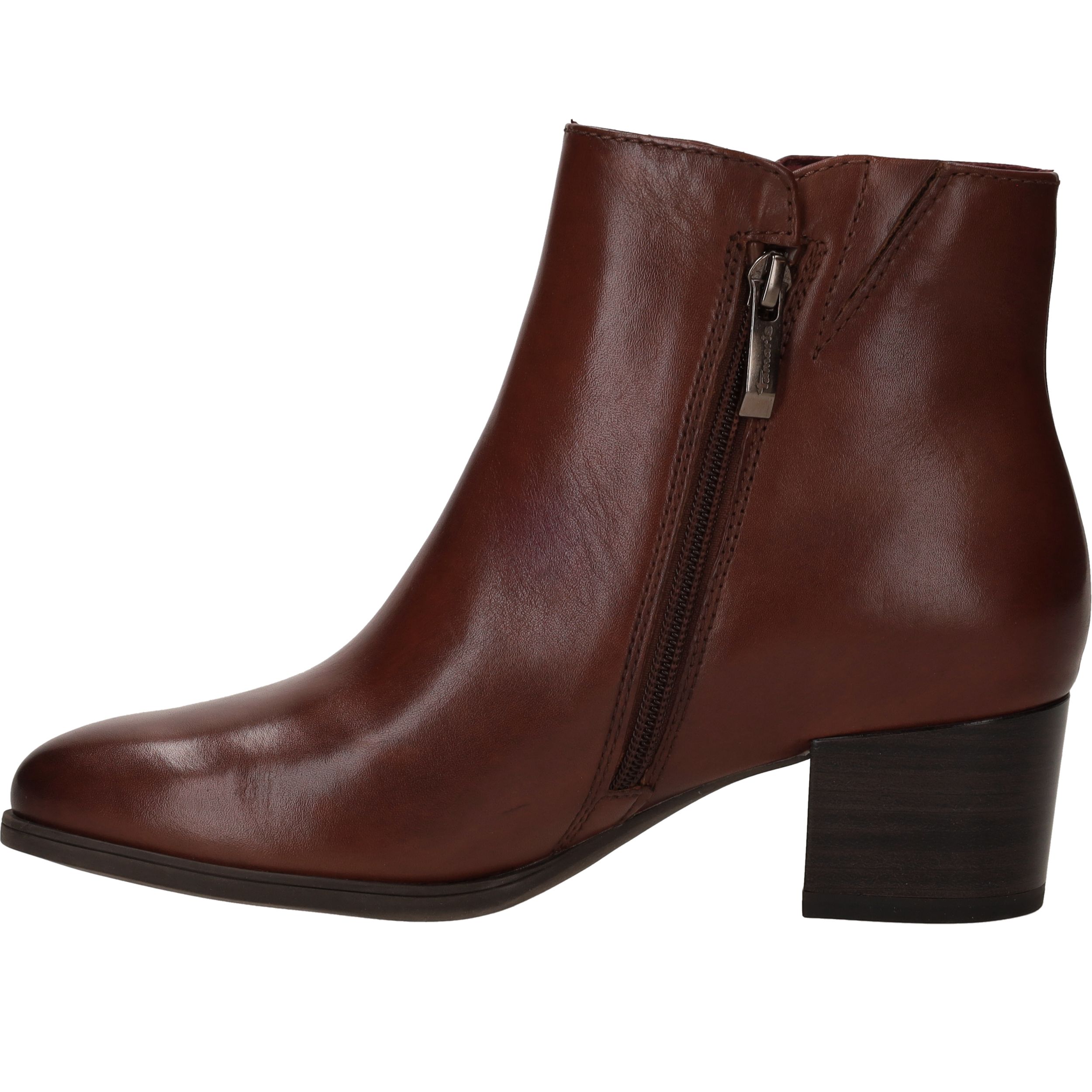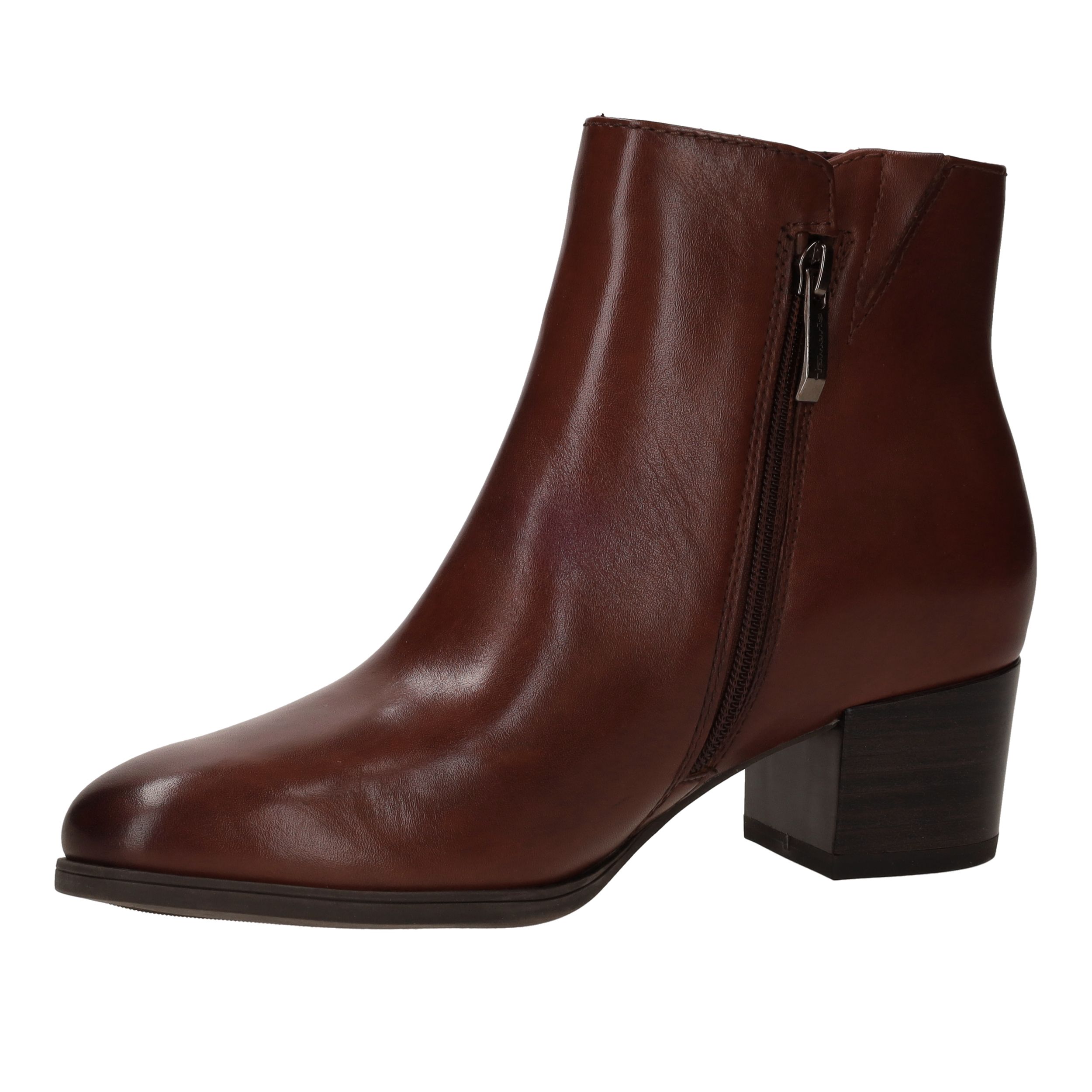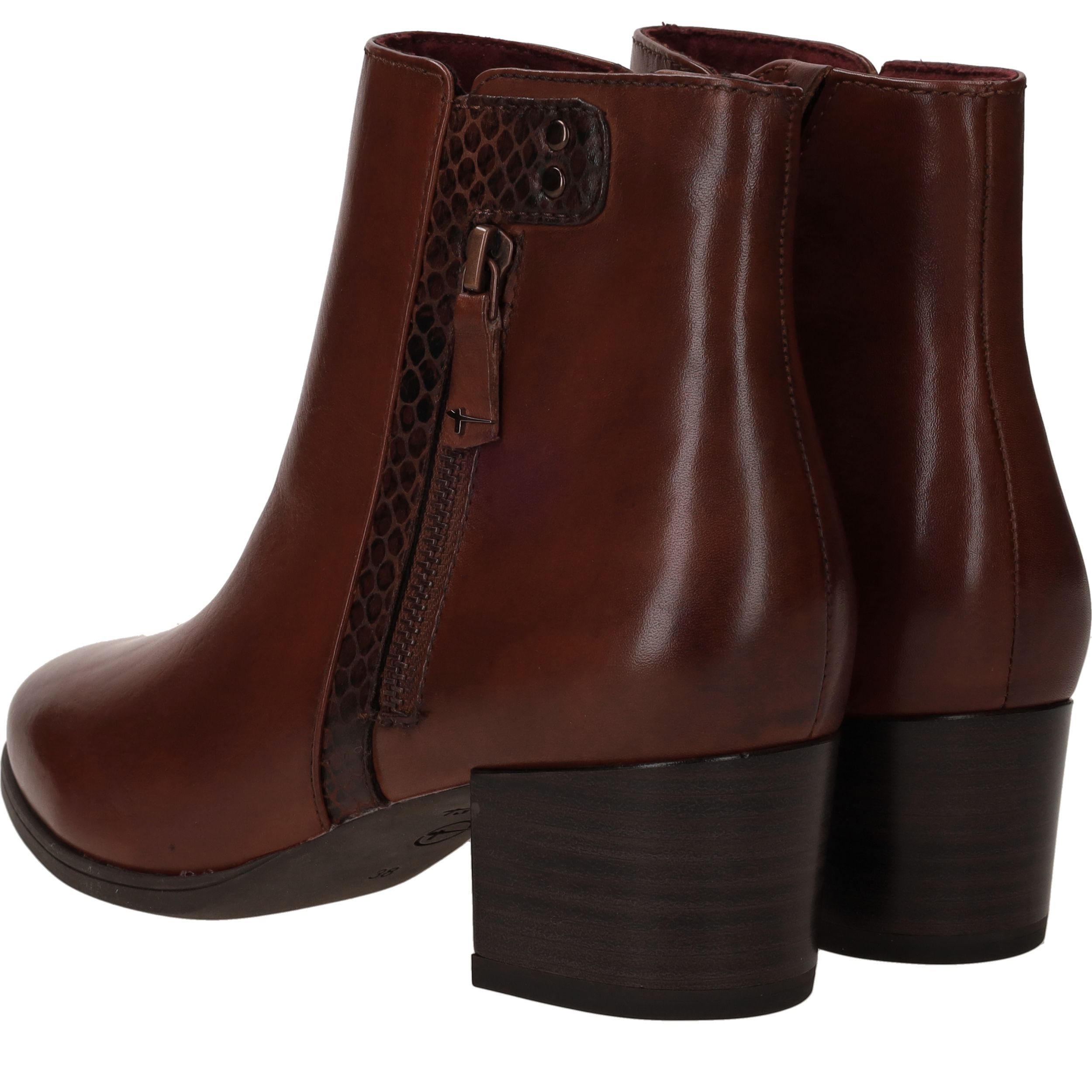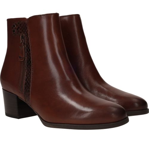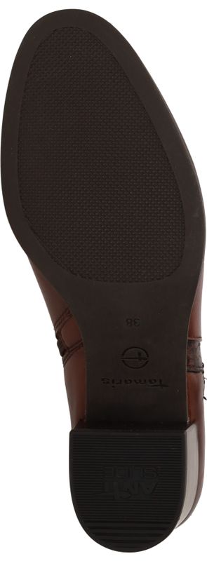 De Tamaris enkellaarsjes zijn een stijlvolle en comfortabele keuze voor dames die houden van elegantie met een vleugje luxe. Deze cognackleurige dames laarzen zijn uitgevoerd in hoogwaardig leer en hebben een subtiel reliëfdetail langs de rits dat zorgt voor een chique uitstraling. Dankzij de stabiele blokhak zijn ze ideaal voor dagelijks gebruik en geven ze je outfit een modieuze boost.